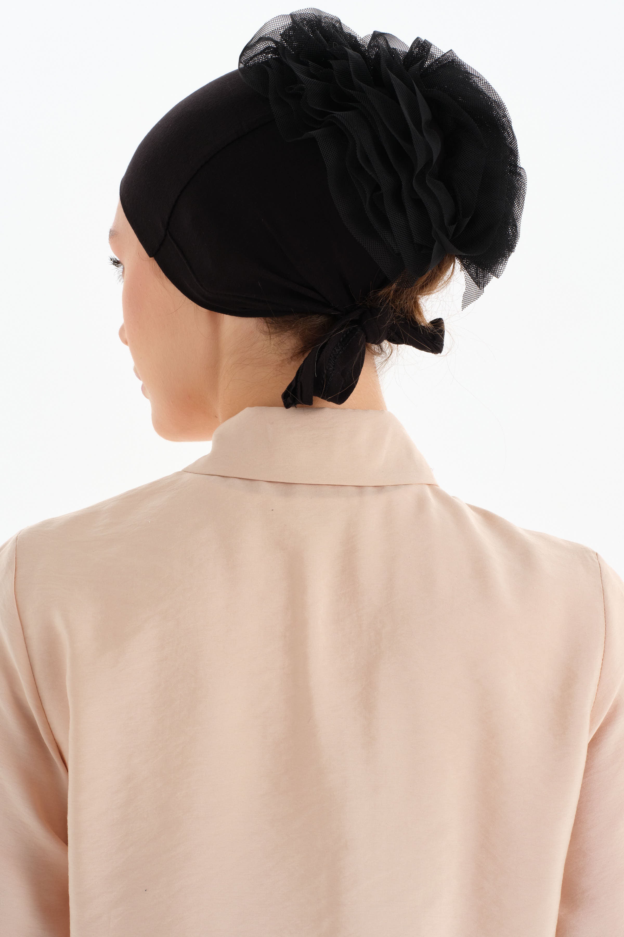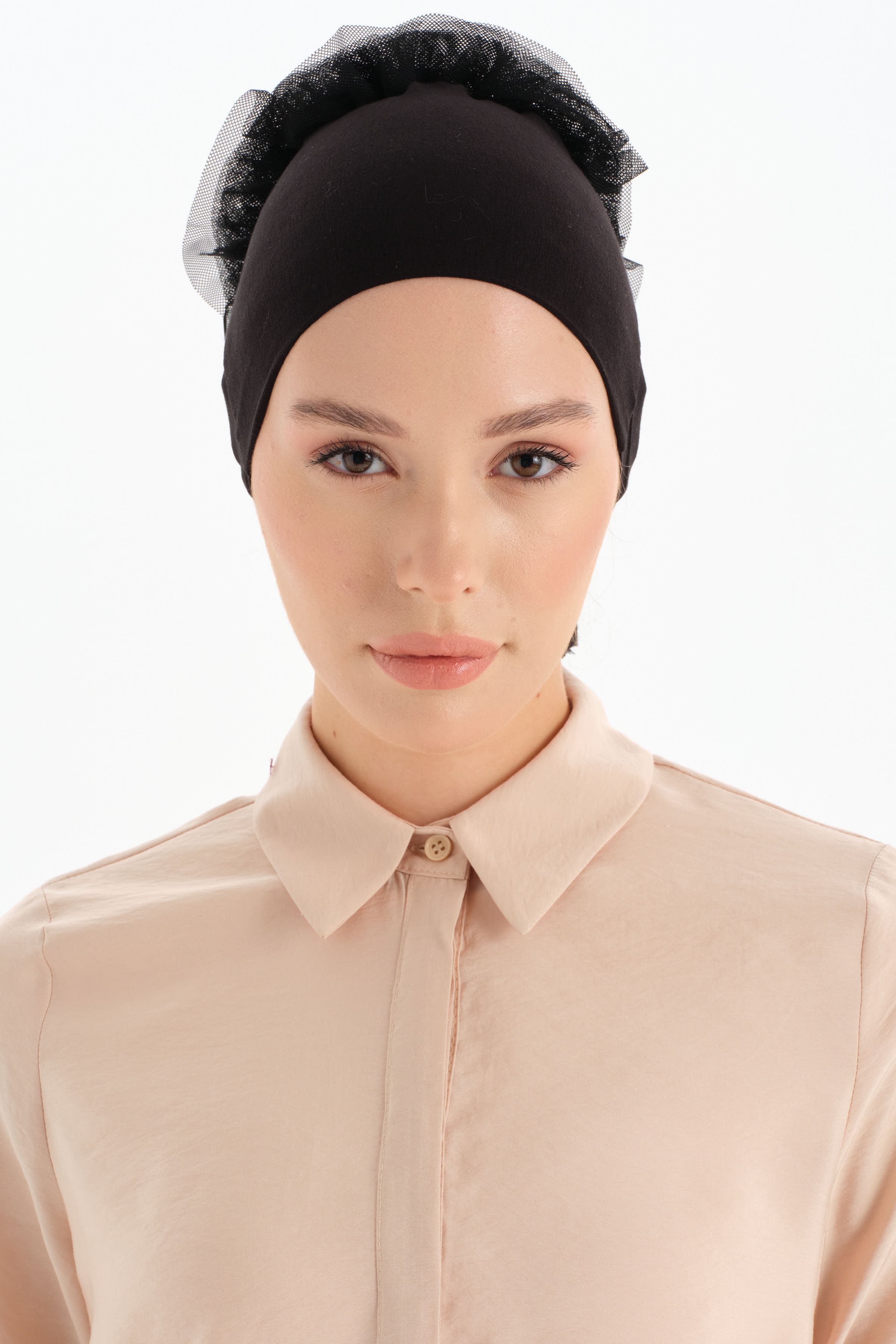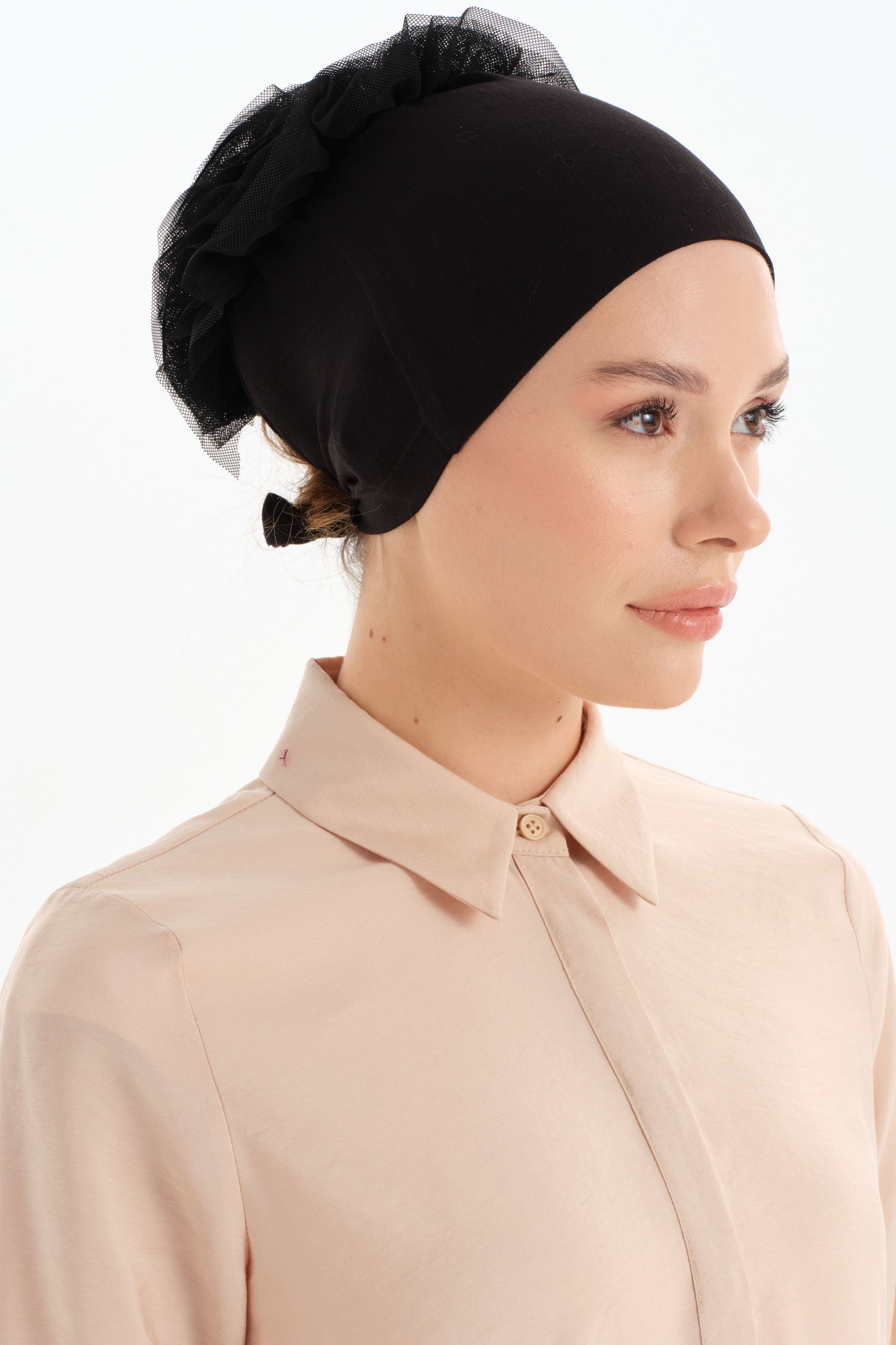 Standing out with its elegant and functional design, the lace bun cap combines aesthetics and ease of use. Its soft fabric gently grips hair for all-day comfort. The generous space in the bun area allows for easy, secure styling, and its non-slip design ensures safe use.