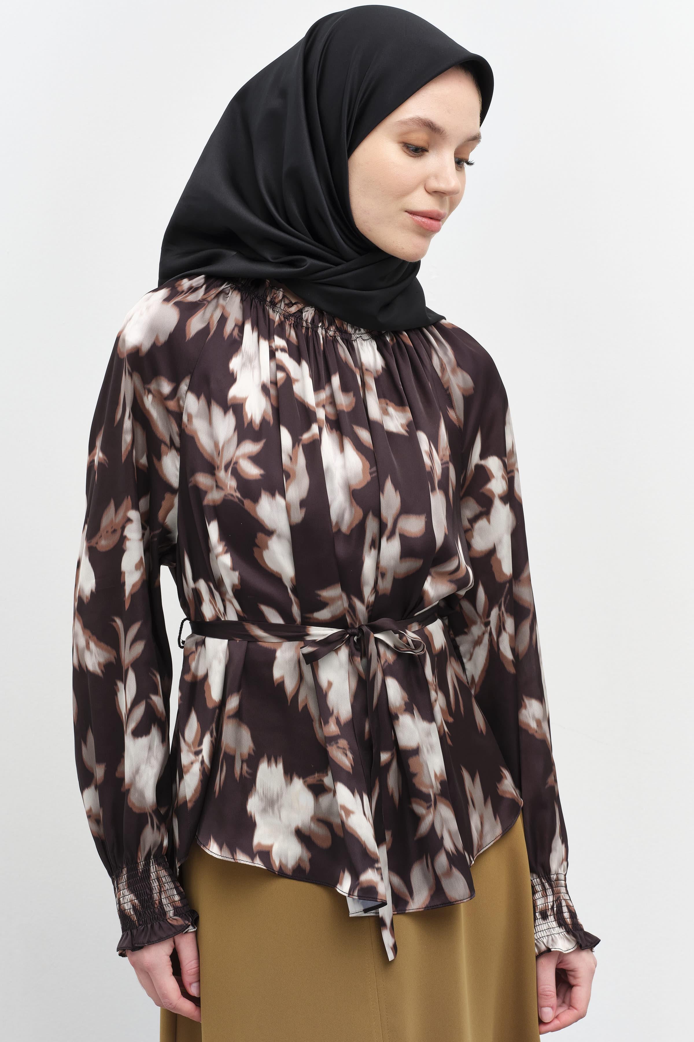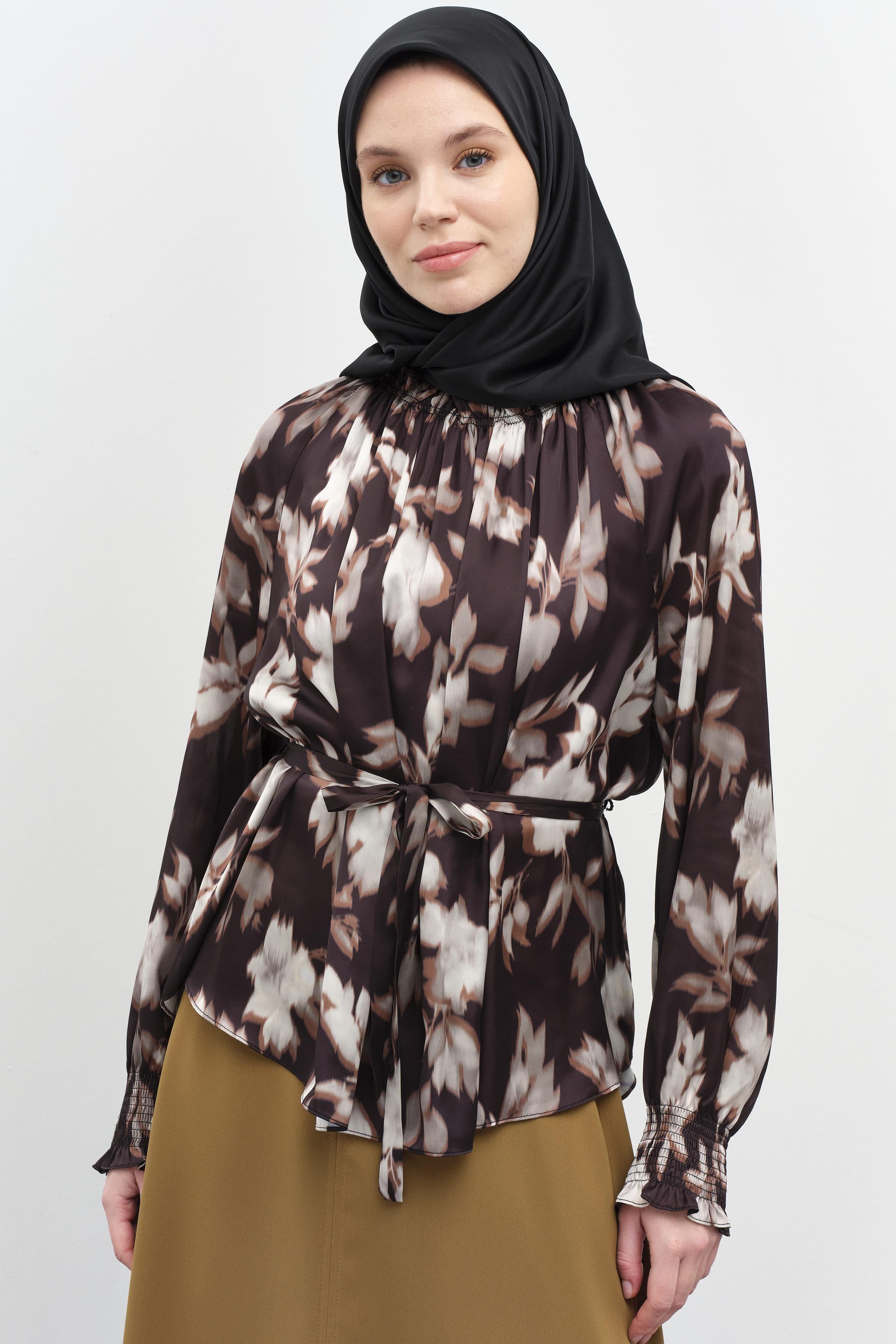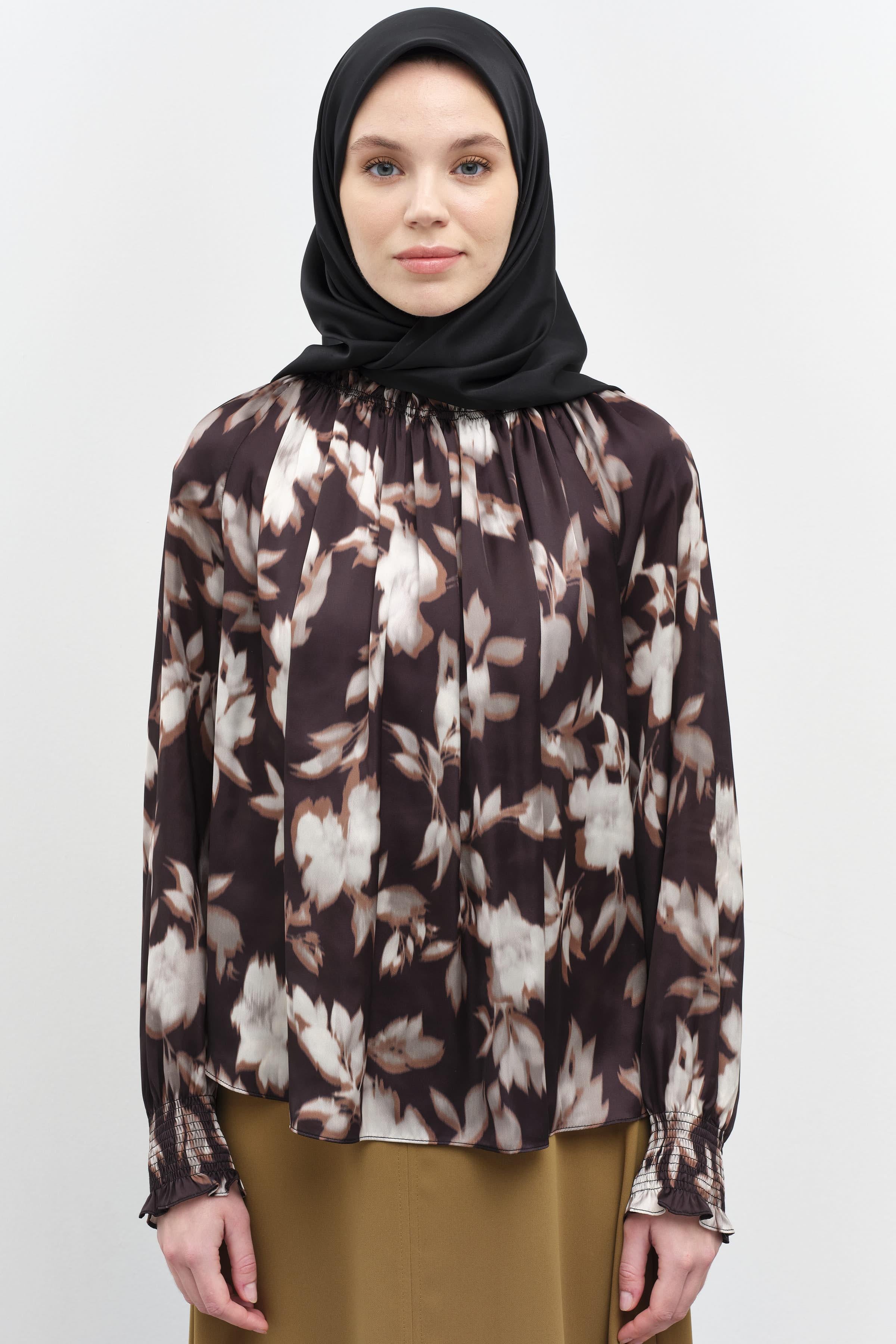 This patterned blouse, which gains an elegant form with its elasticated gather details, offers both style and comfort. Its lightweight fabric and modern cut add a touch of dynamism to your everyday outfits, while its comfortable design ensures all-day wear.