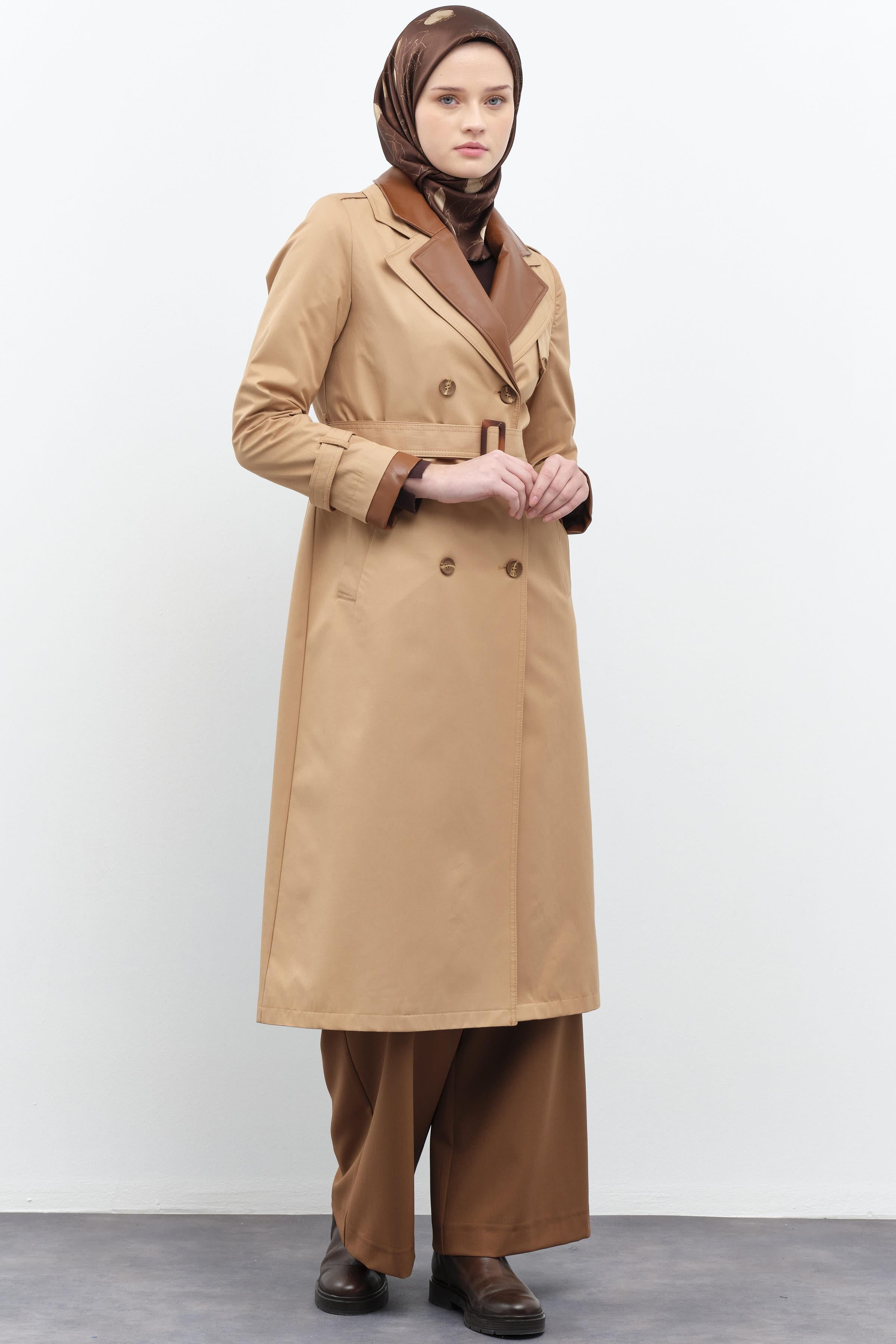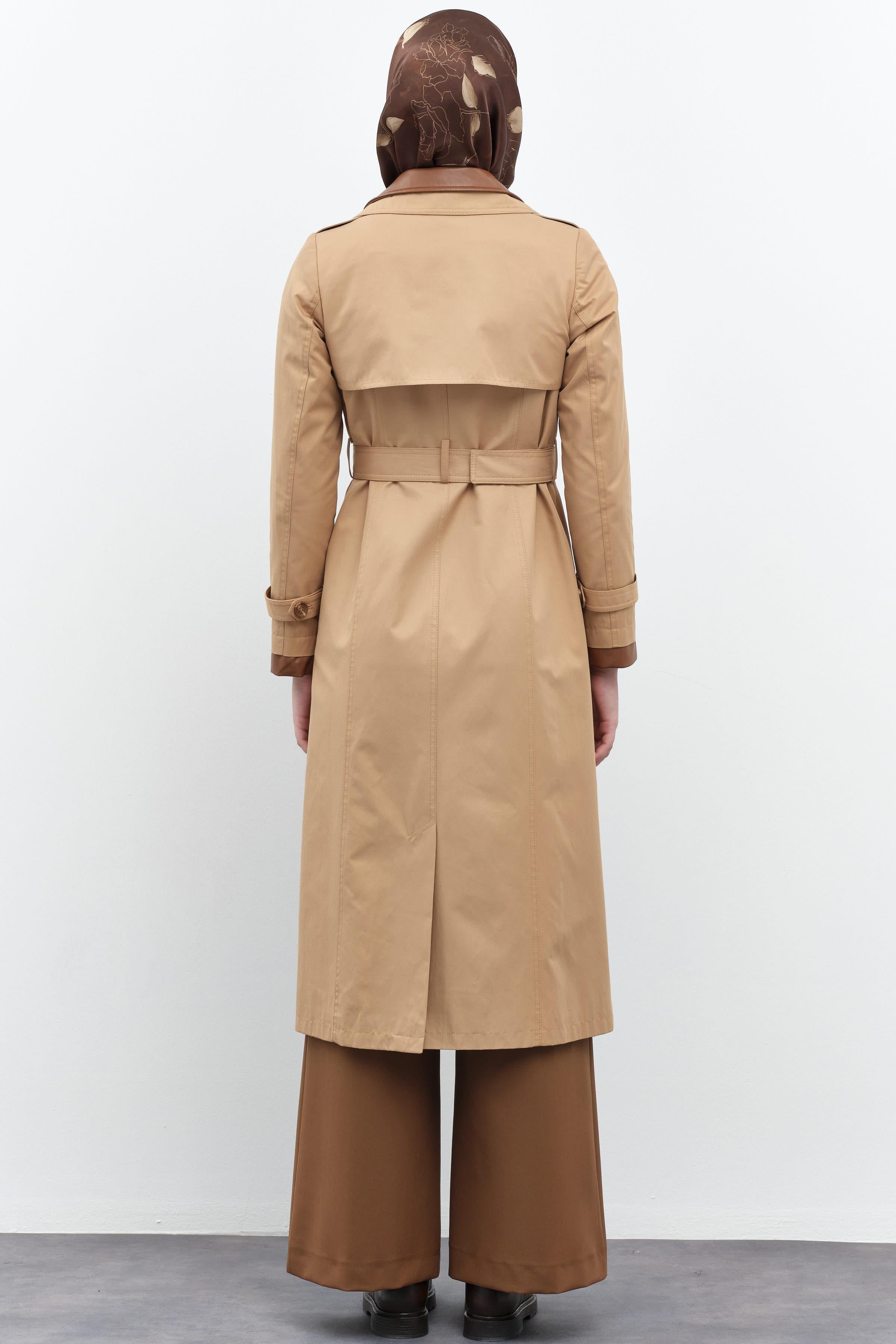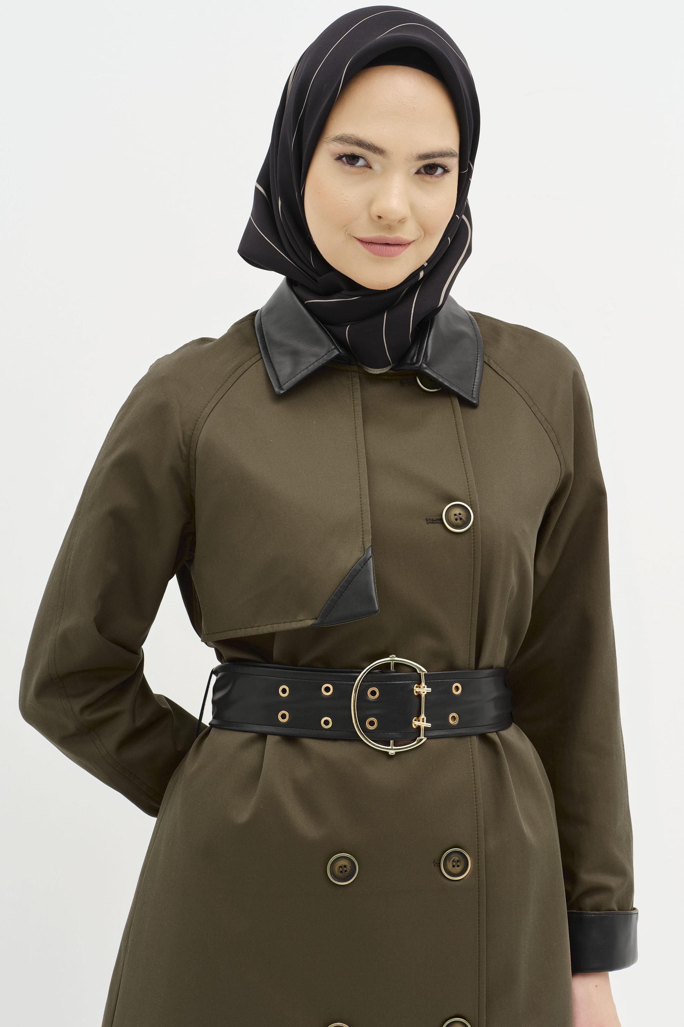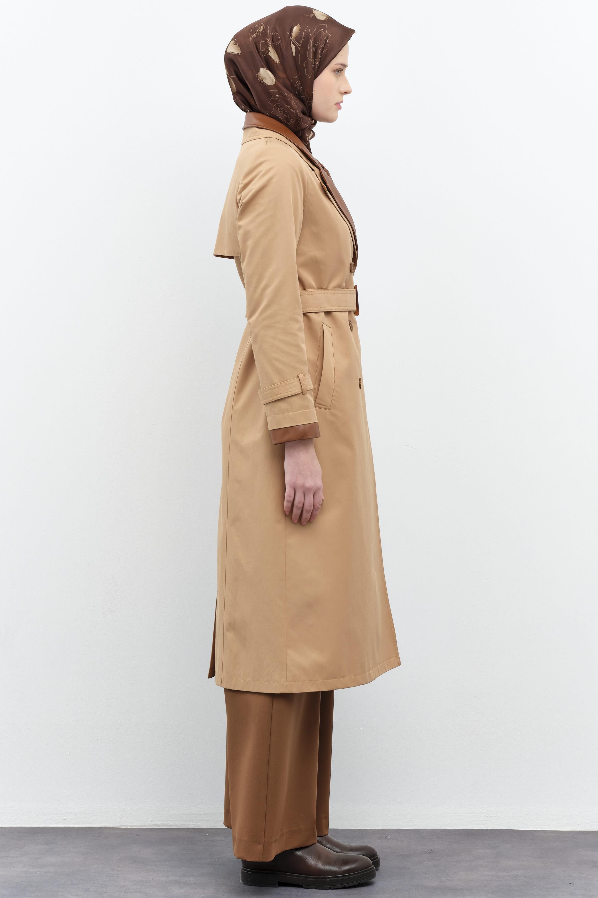 The Leather Trimmed Trench Coat with Eyelet Belt Detail is a model that adds modern and strong touches to the classic trench coat design. Leather trims stand out as stylish and eye-catching details added to specific areas of the trench coat, adding a sophisticated air to the design.