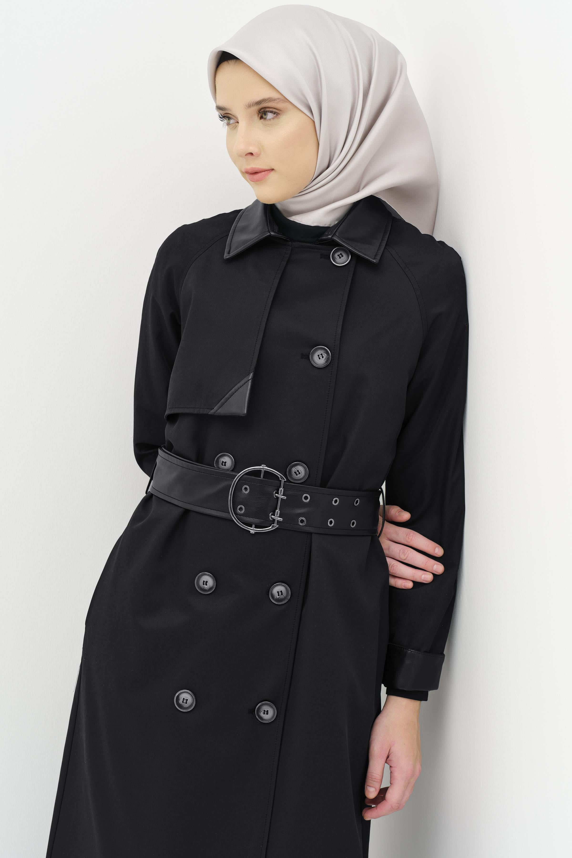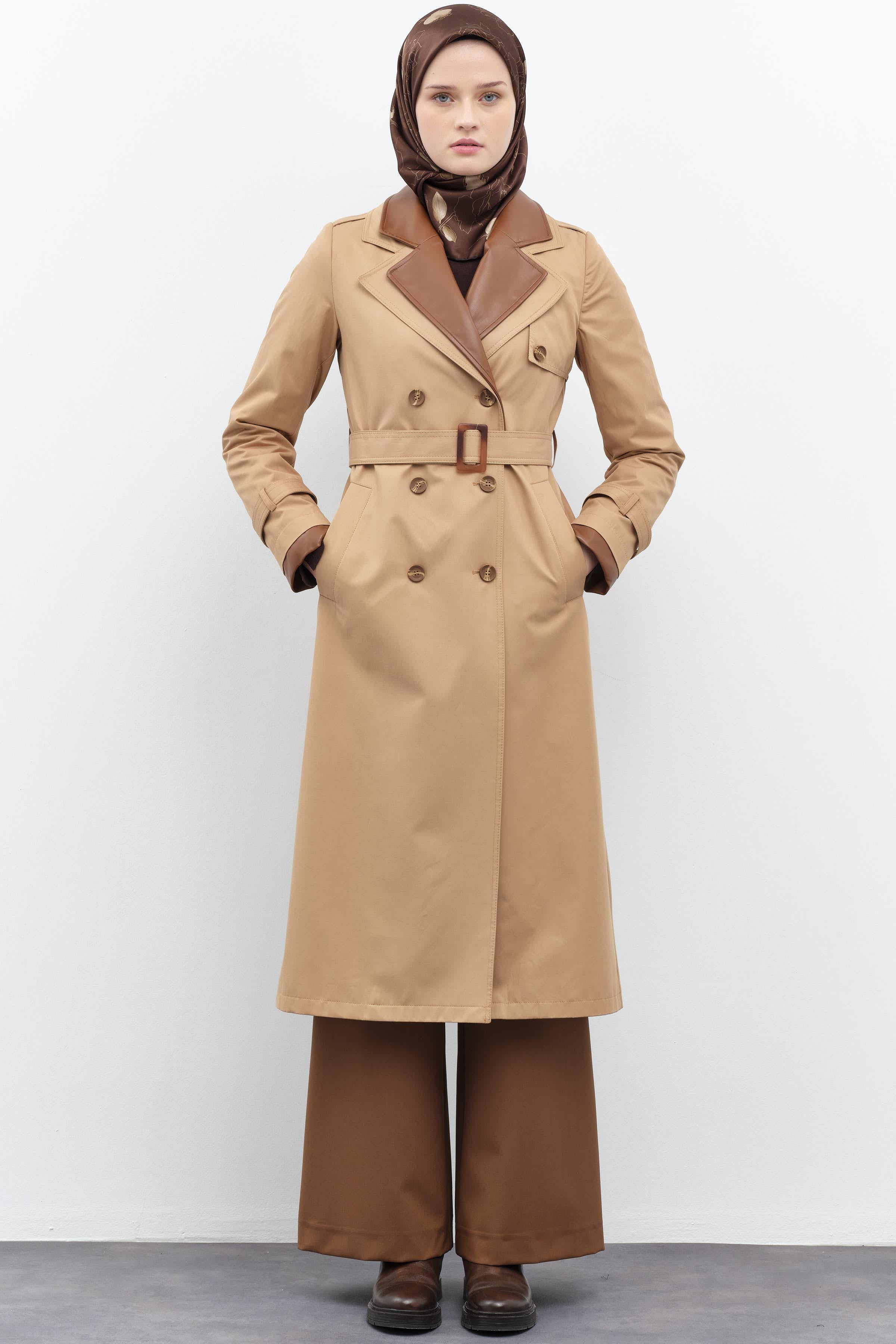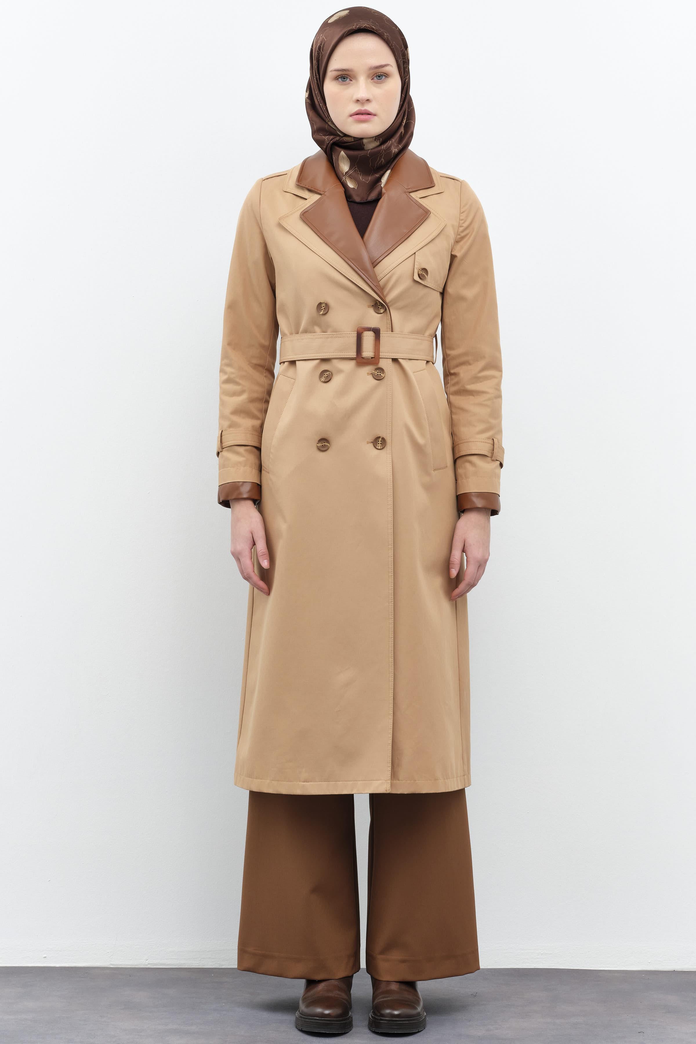 The Leather Trimmed Trench Coat with Eyelet Belt Detail is a model that adds modern and strong touches to the classic trench coat design. Leather trims stand out as stylish and eye-catching details added to specific areas of the trench coat, adding a sophisticated air to the design.