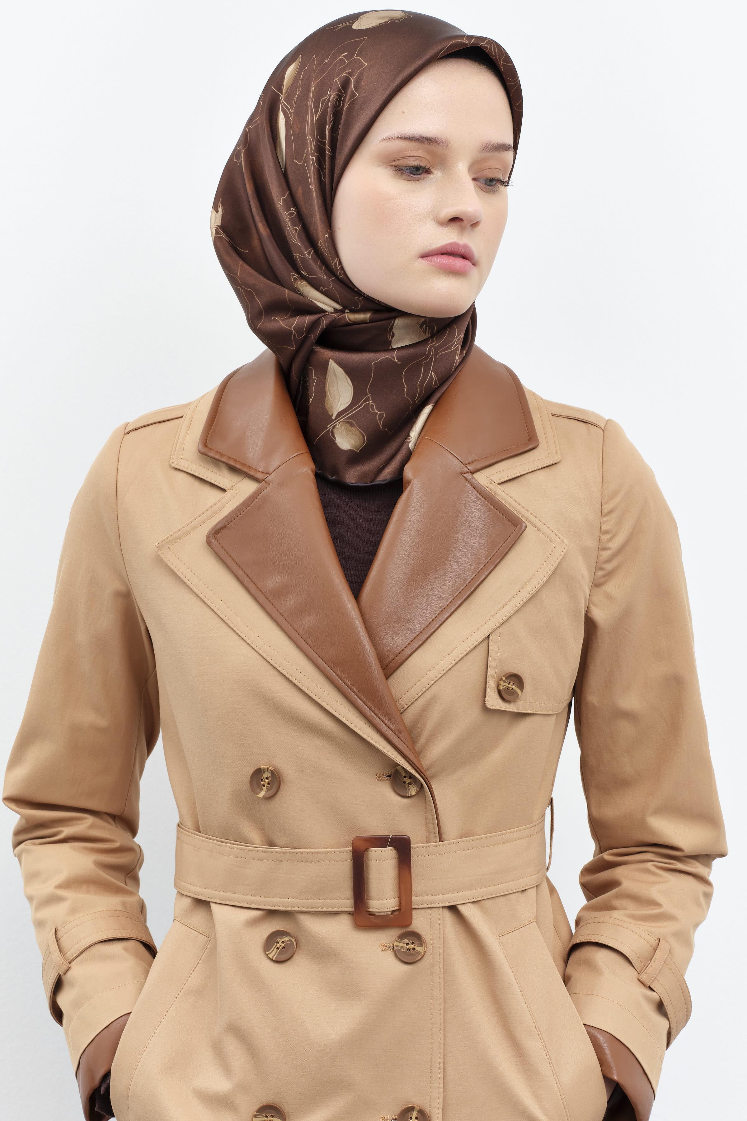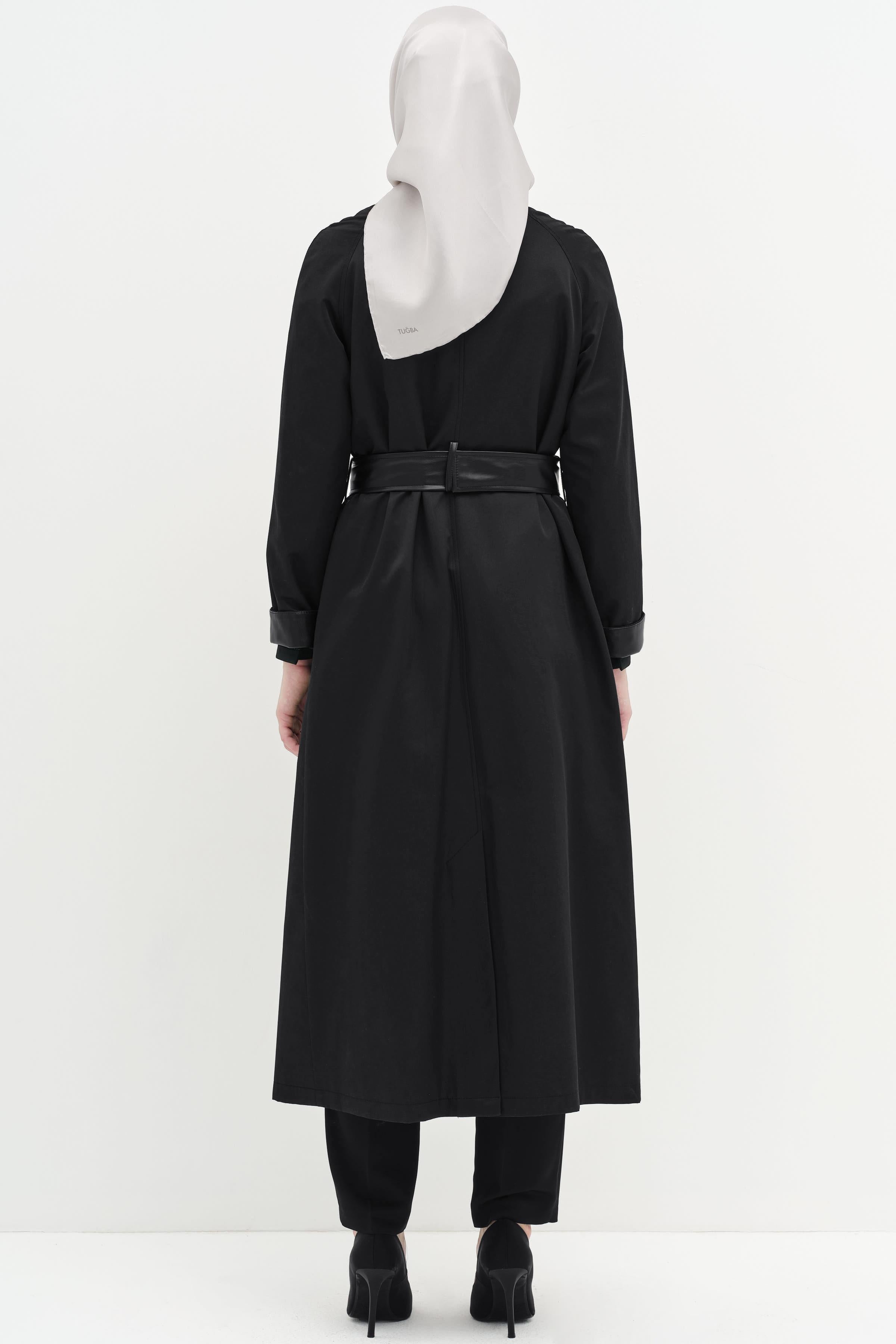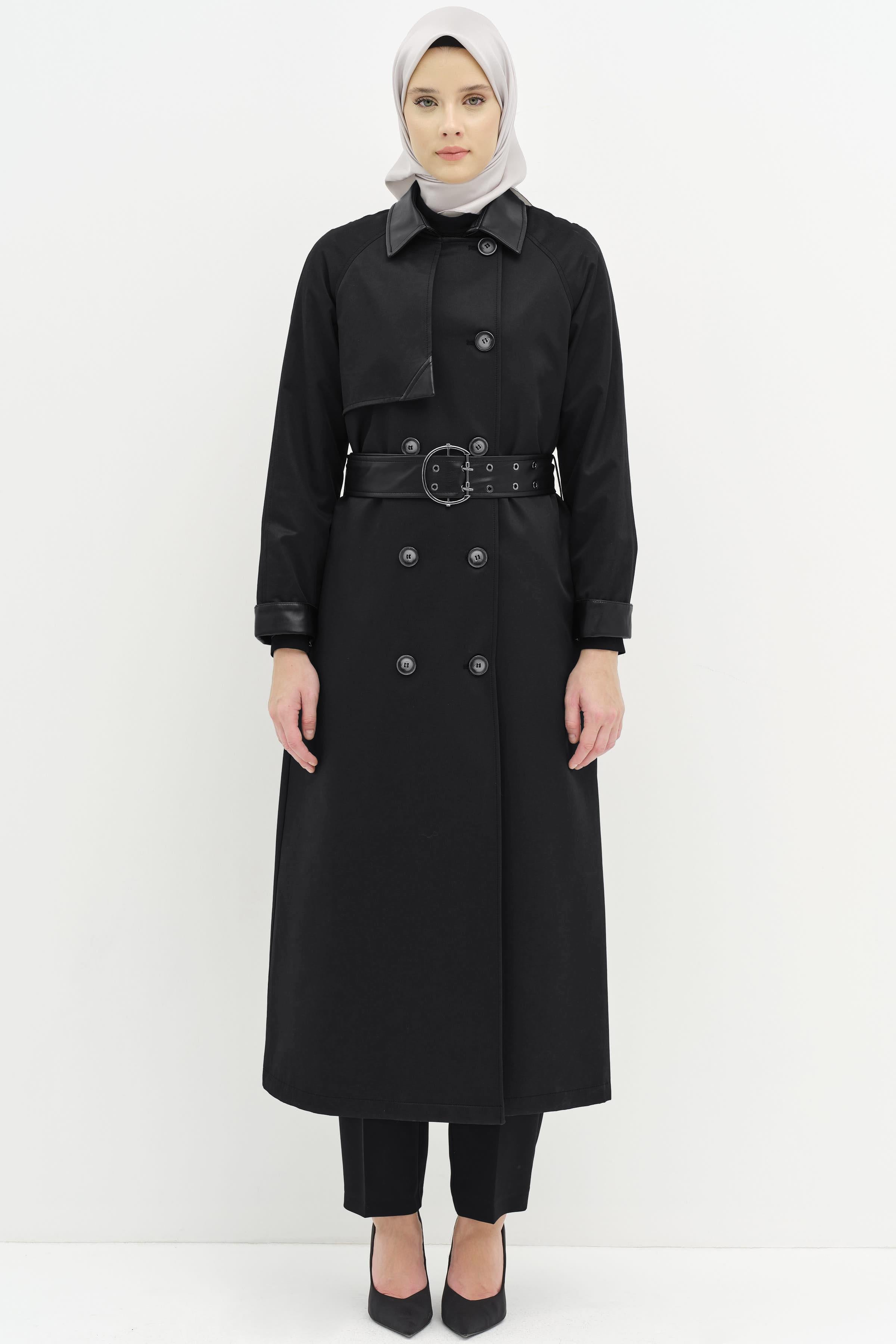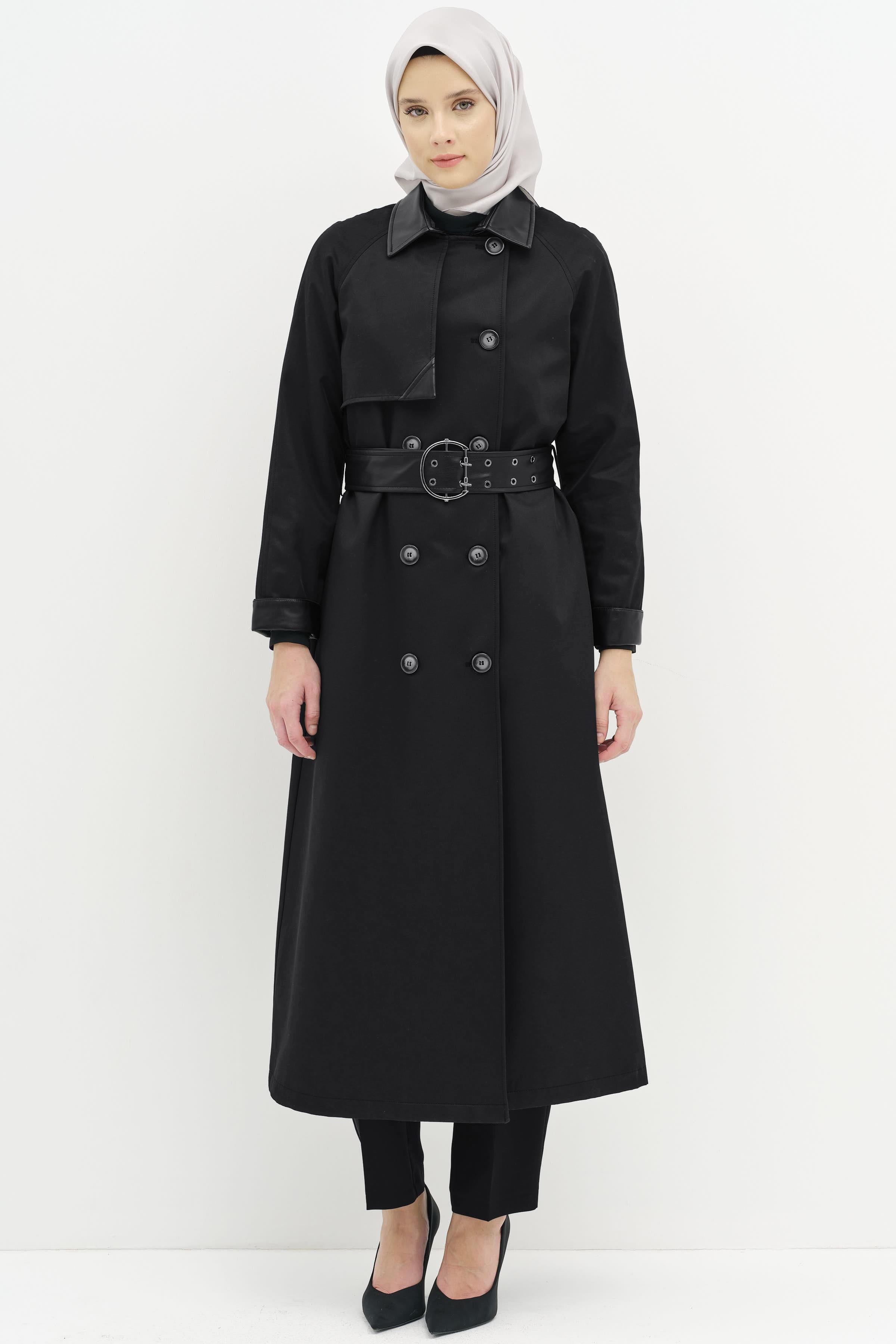 The Leather Trimmed Trench Coat with Eyelet Belt Detail is a model that adds modern and strong touches to the classic trench coat design. Leather trims stand out as stylish and eye-catching details added to specific areas of the trench coat, adding a sophisticated air to the design.