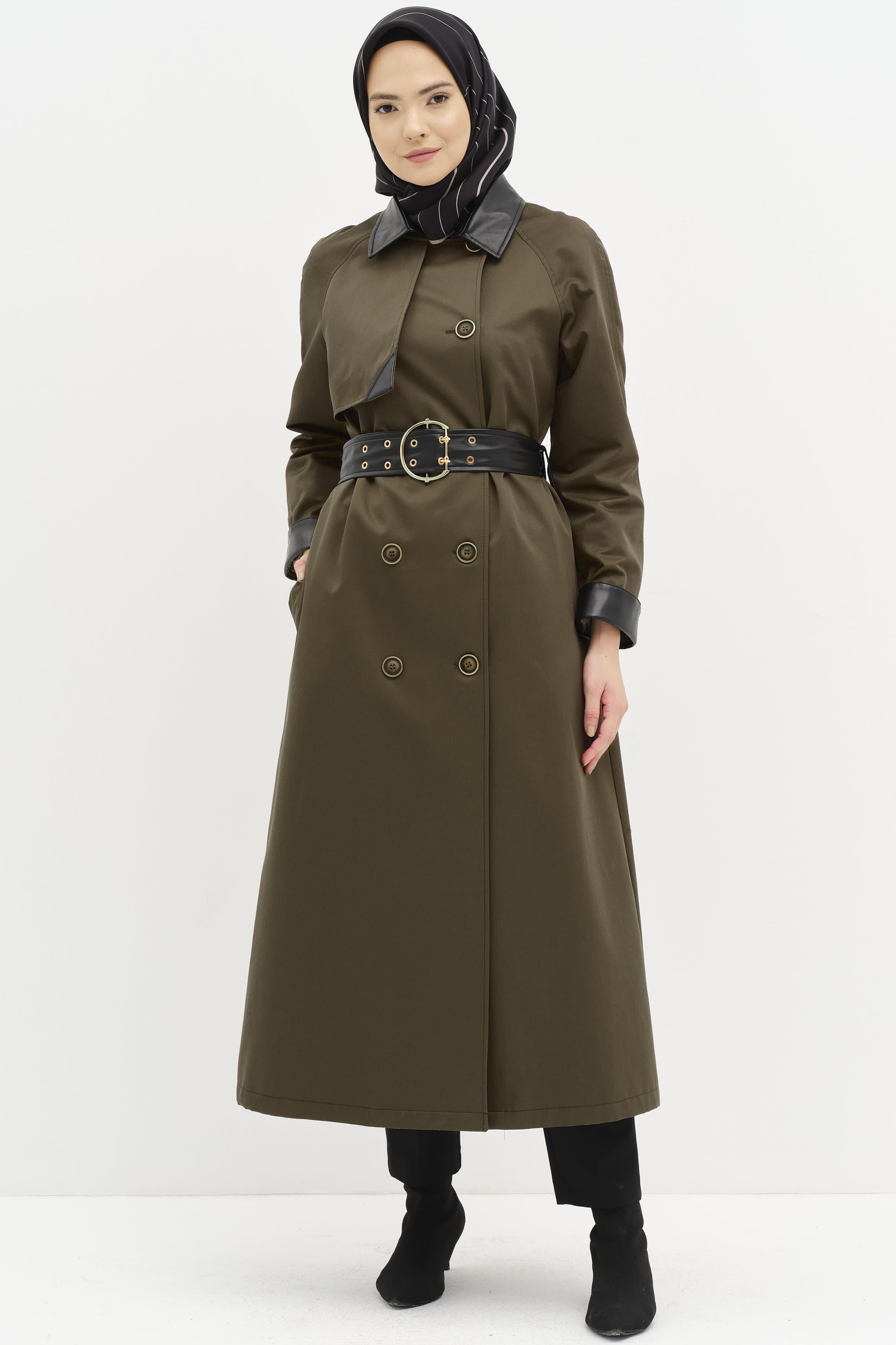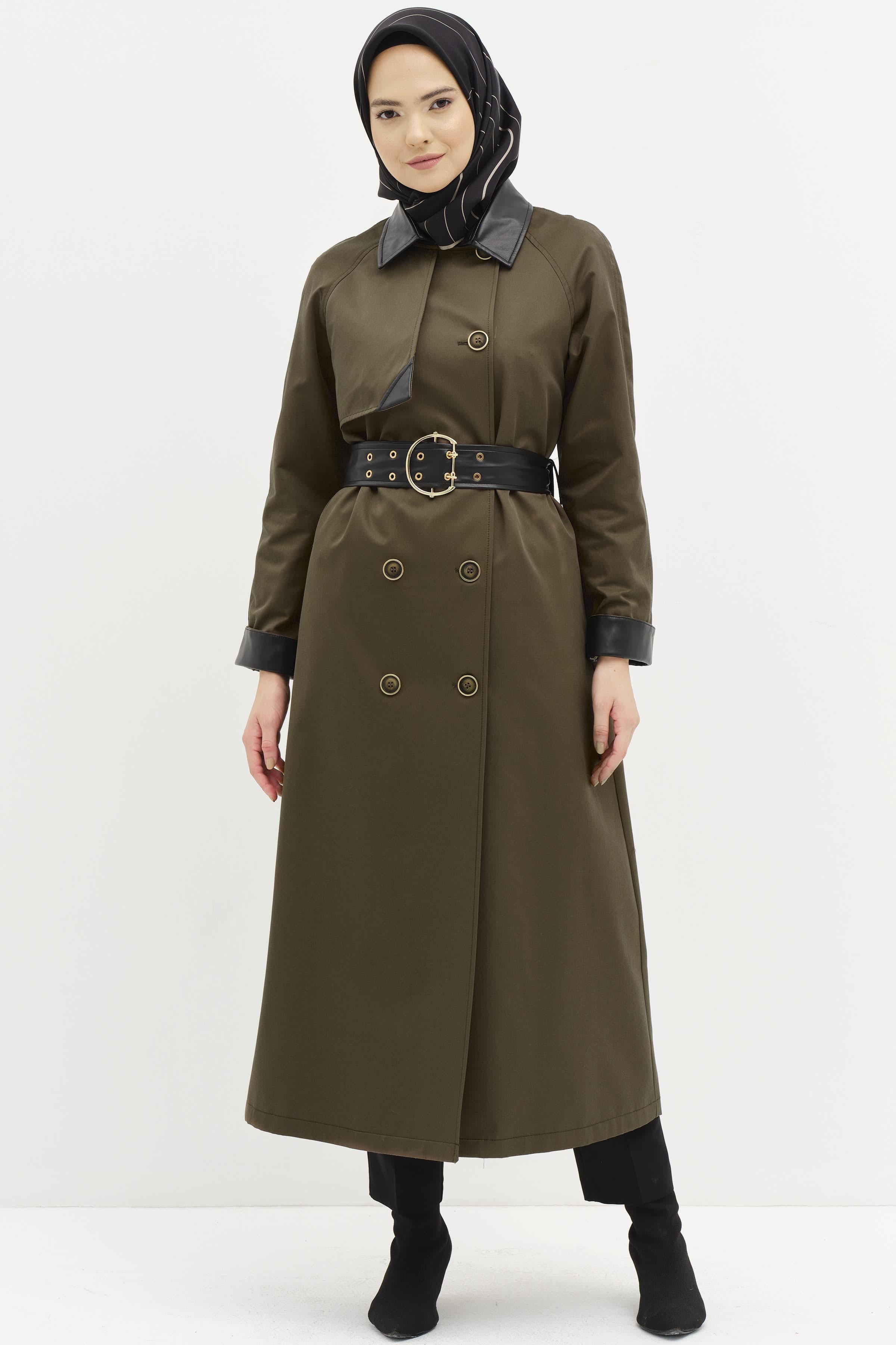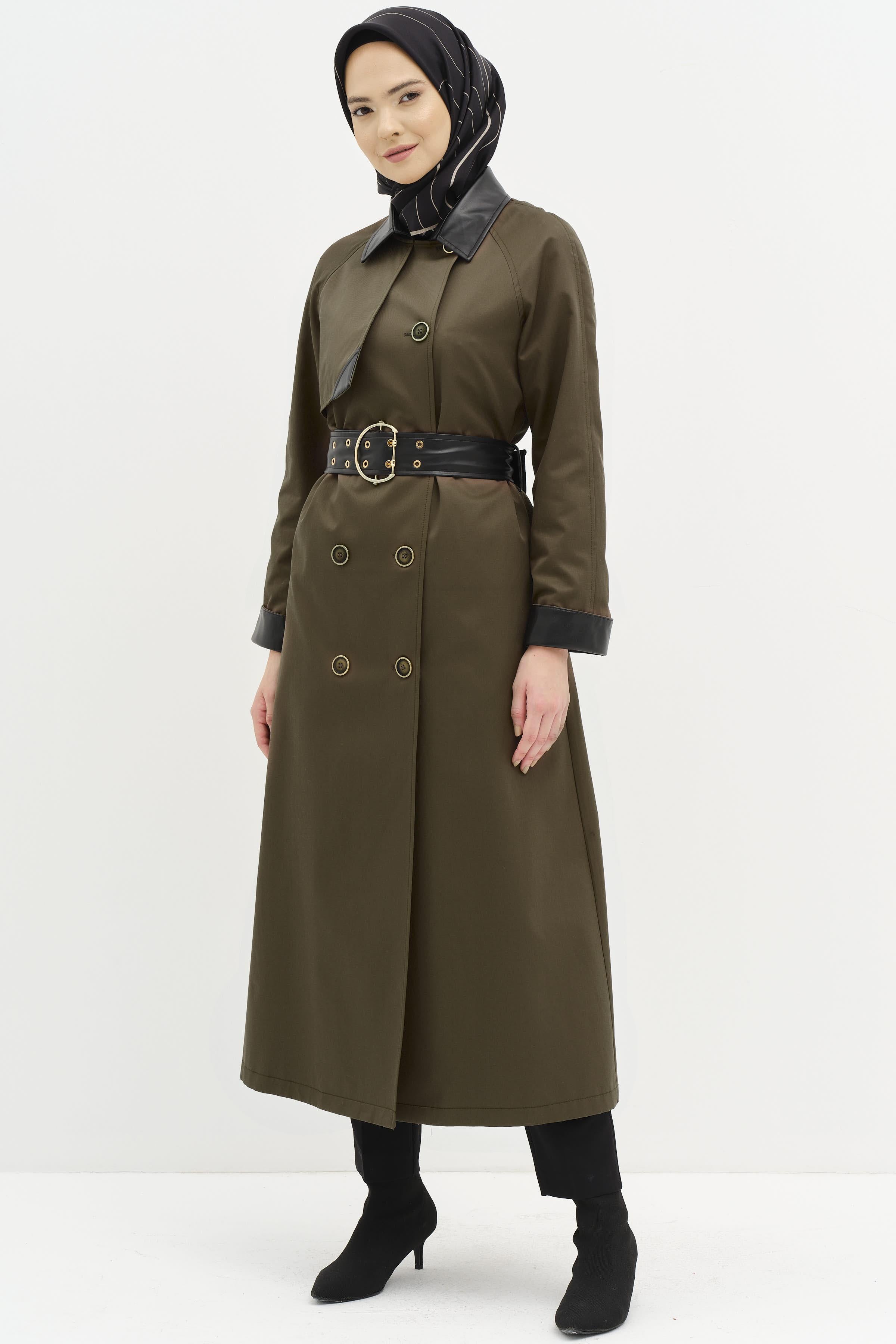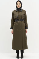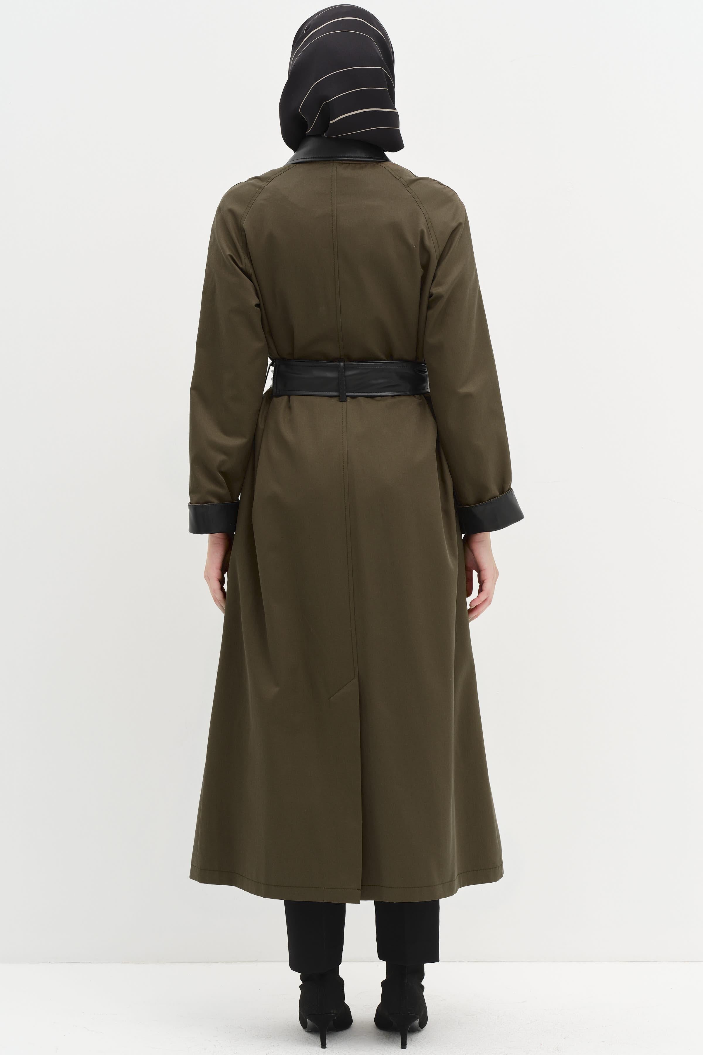 Leather Garnished Eyelet Belt Detailed Trench Coat - Khaki
