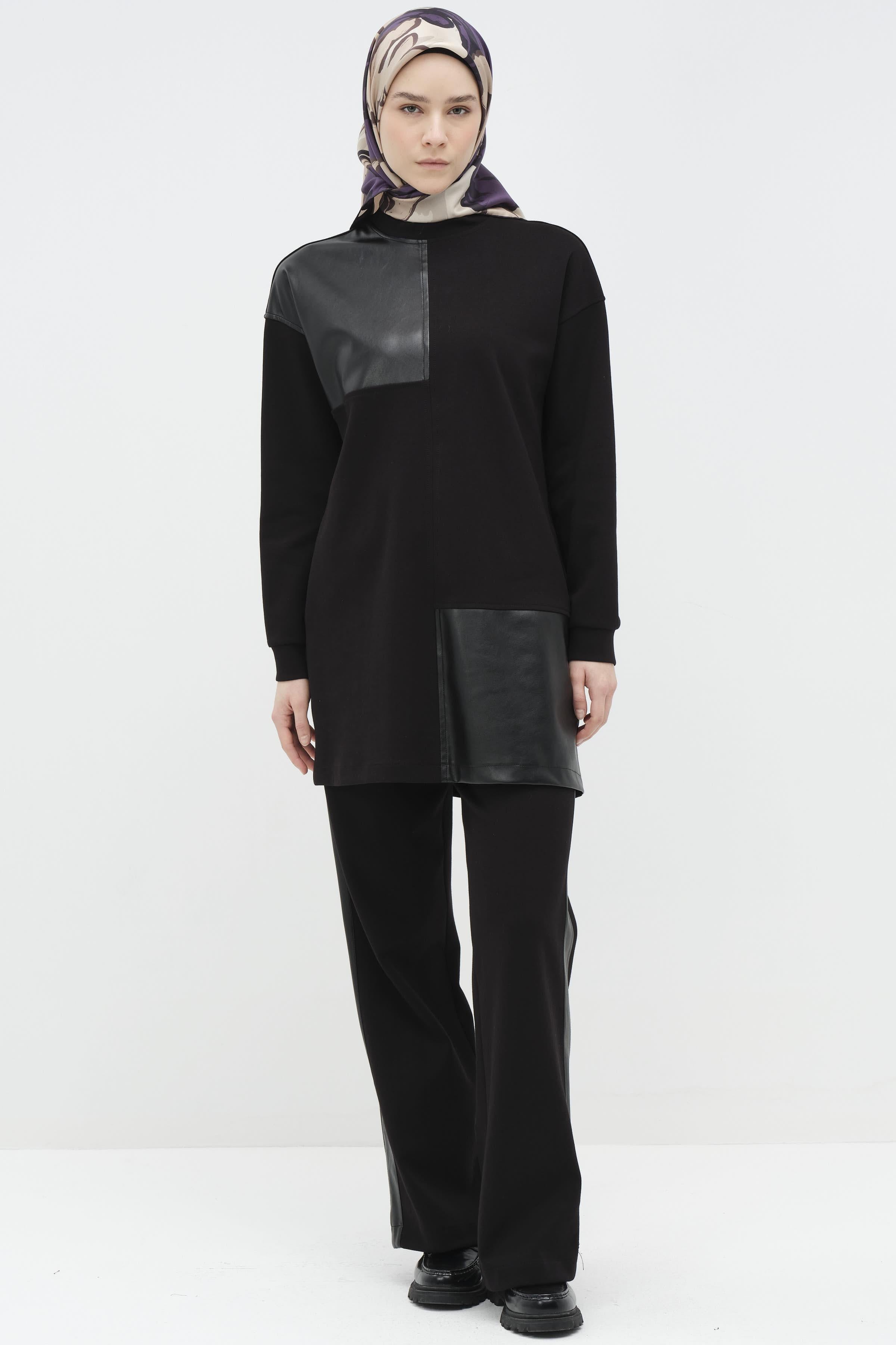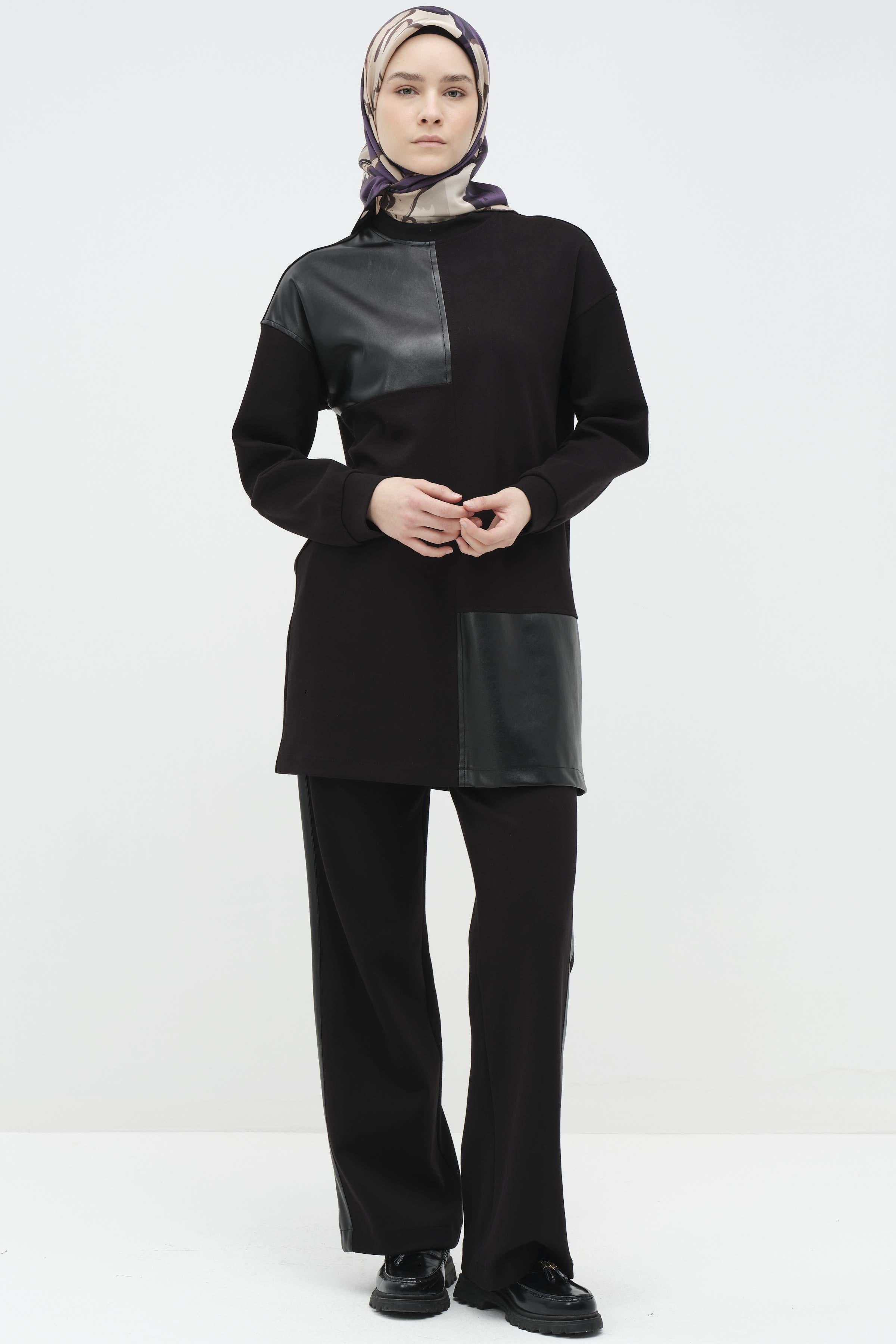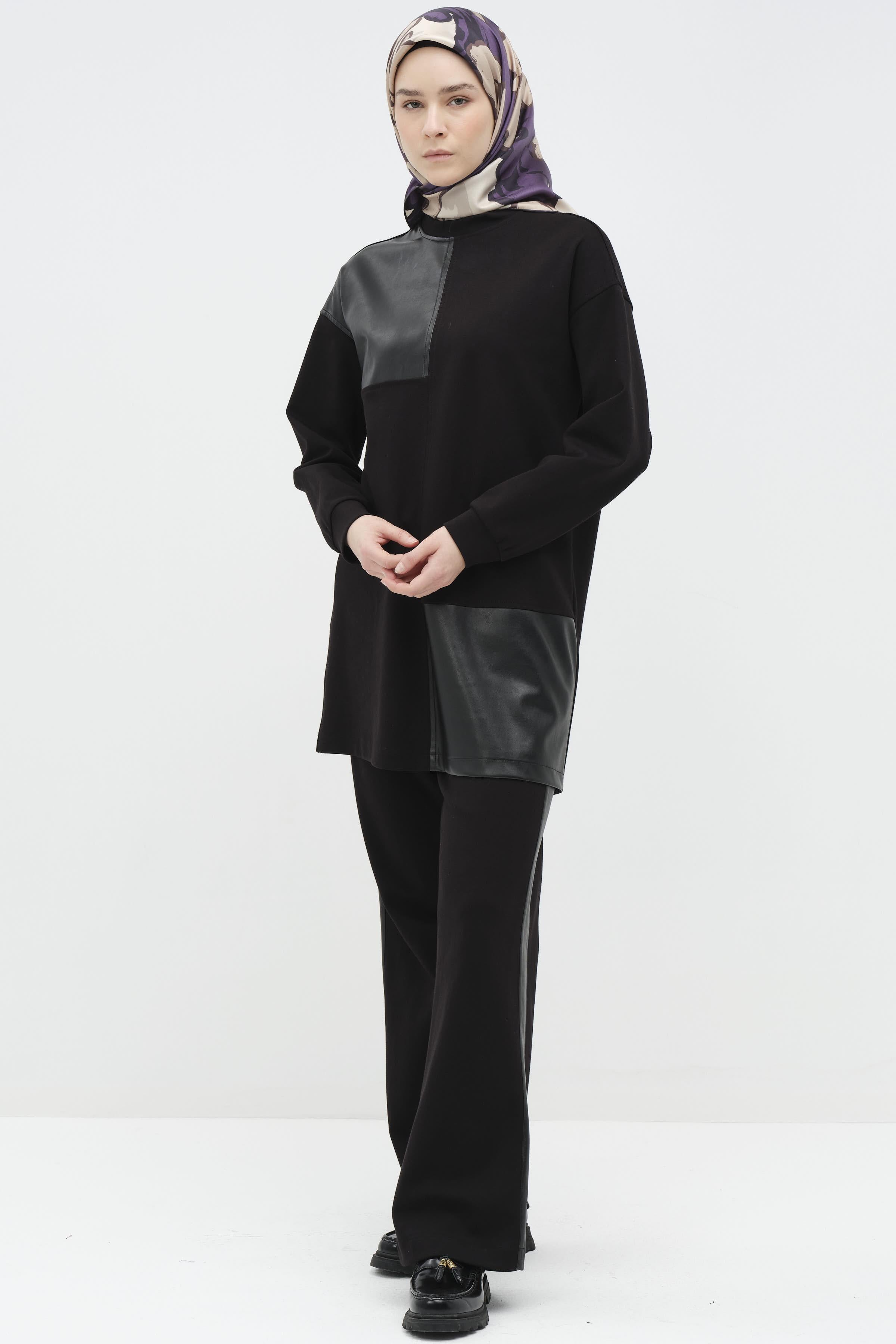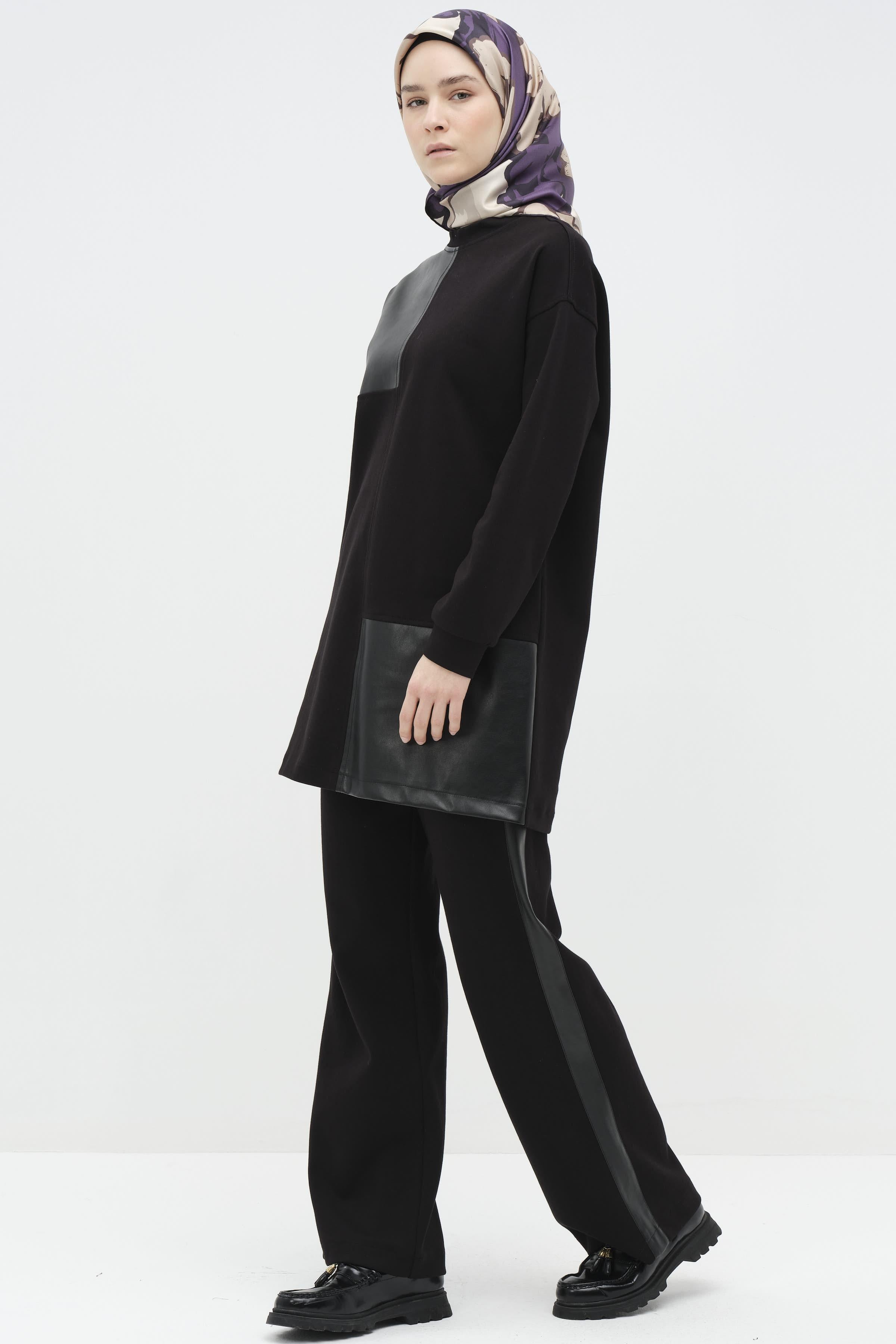 Leather Garnished Tunic Trouser Knitted Set - Black