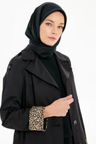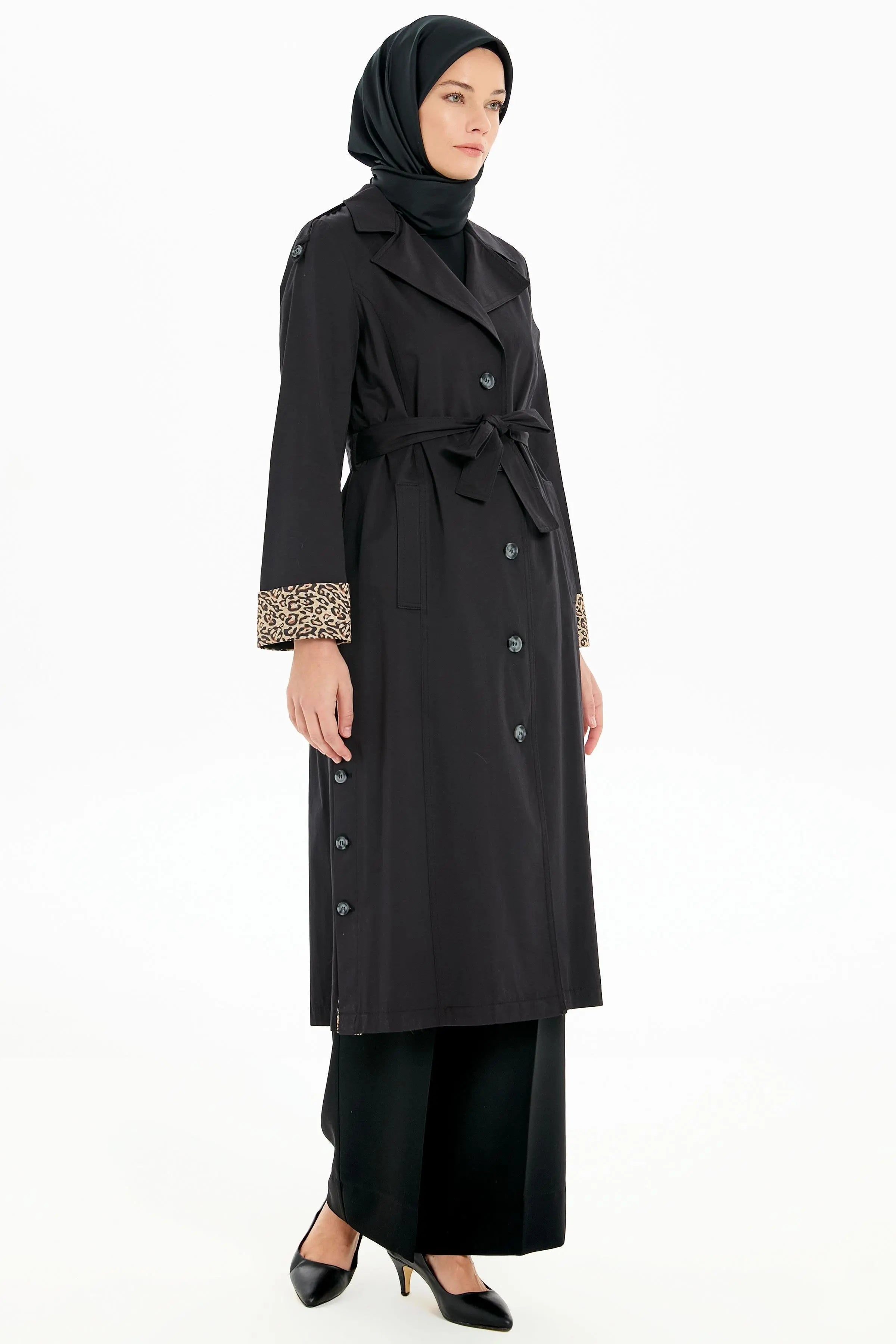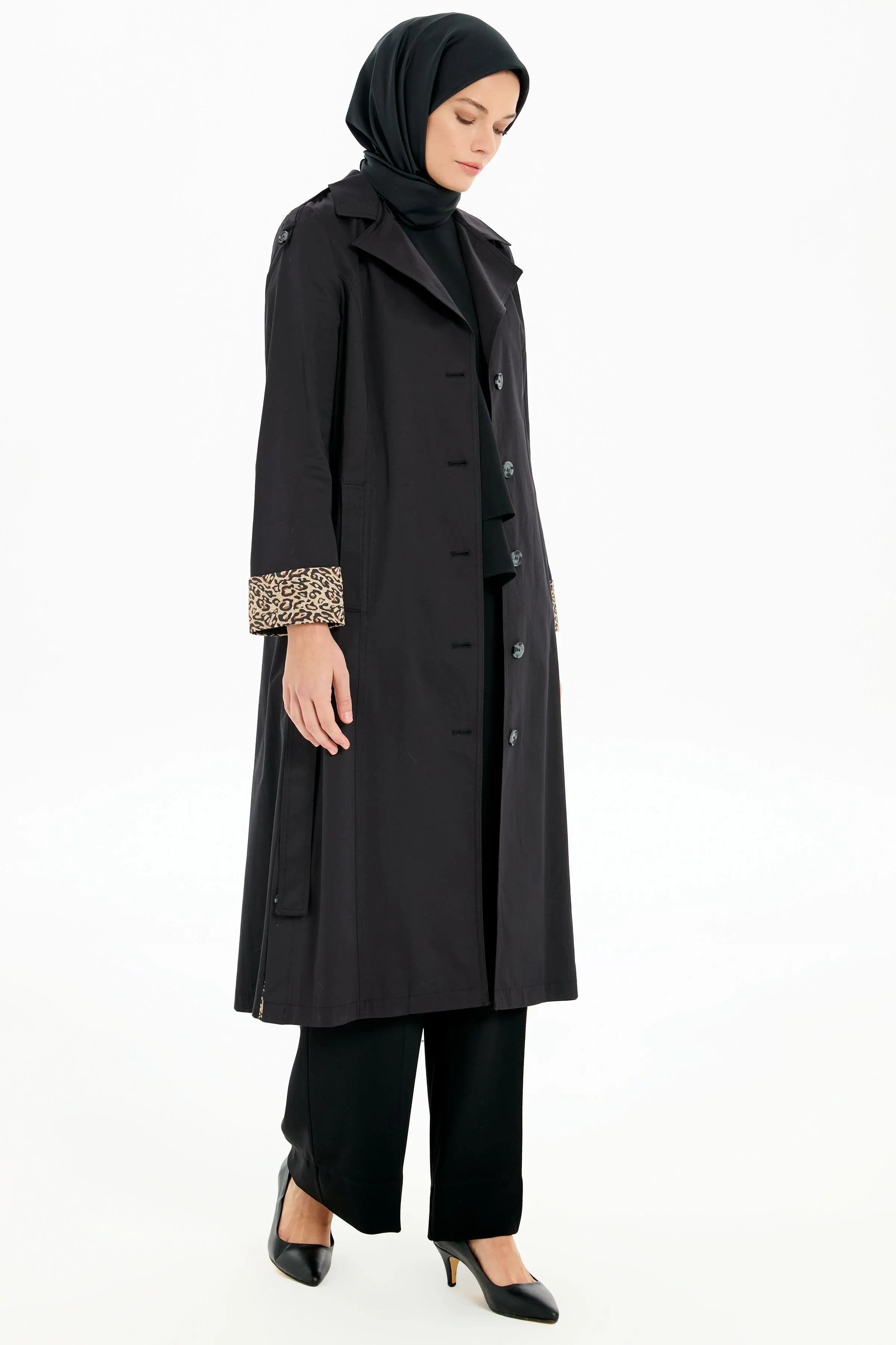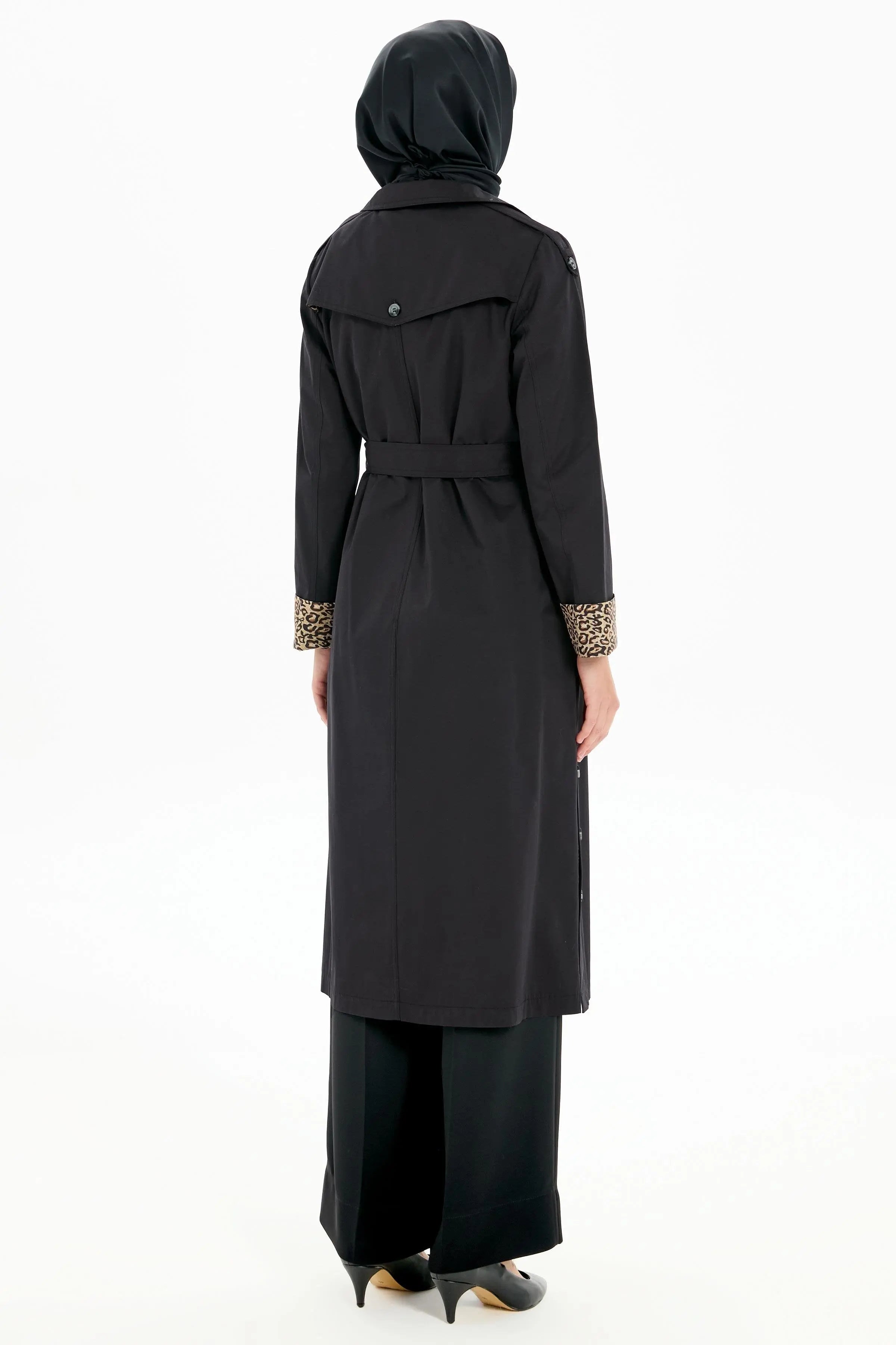 Leopard Garnished Slit Detailed Trench Coat - Black