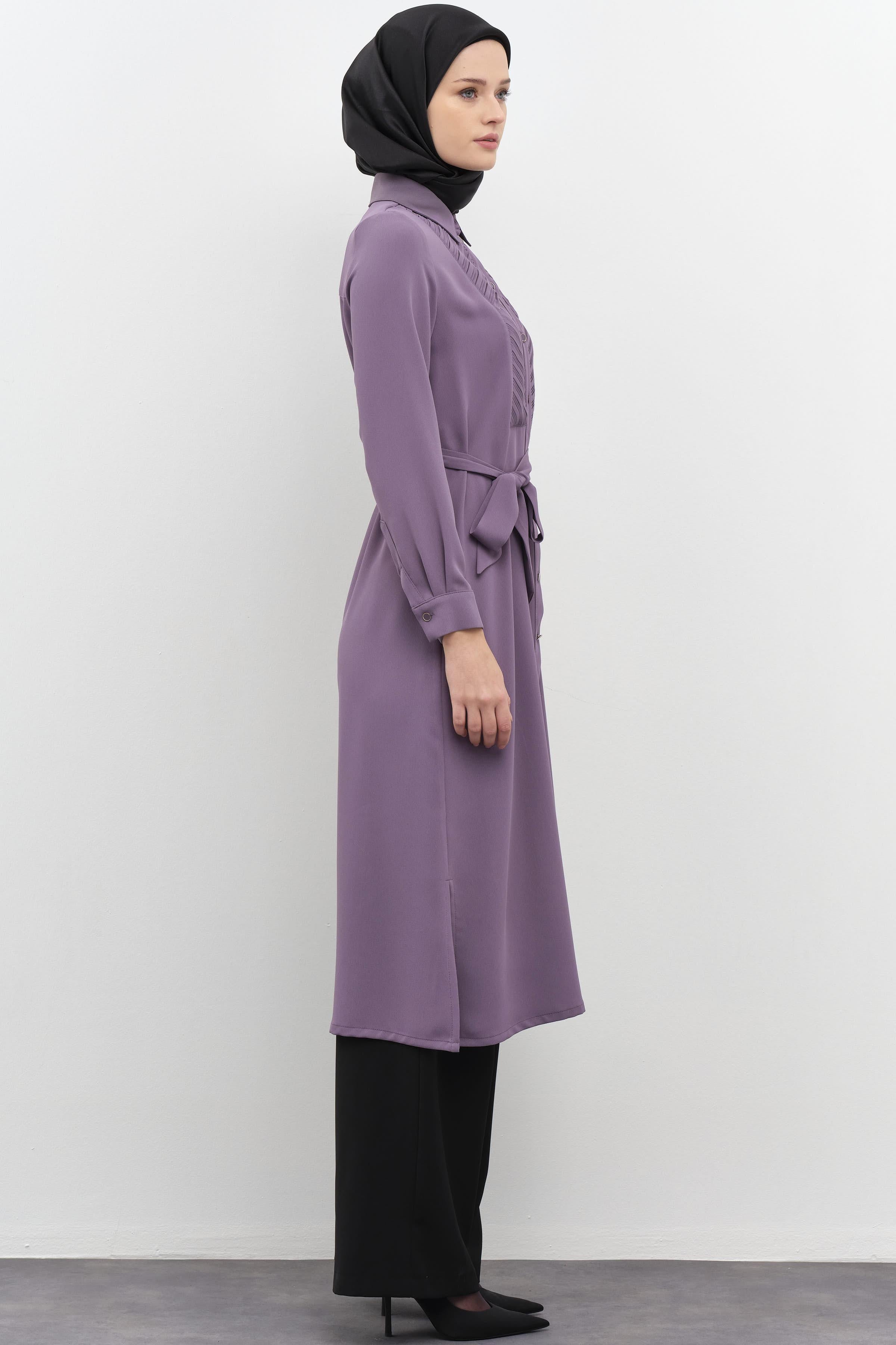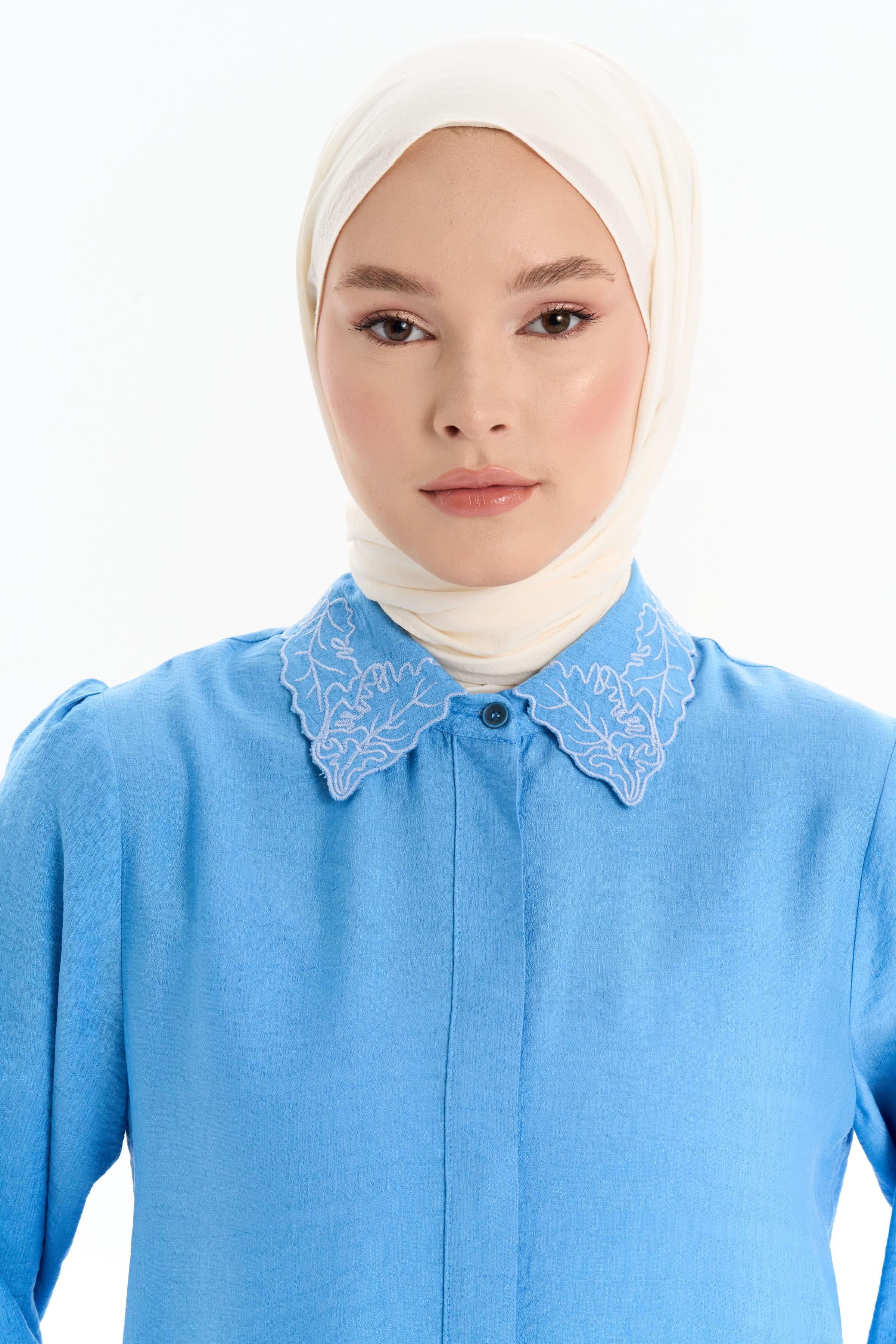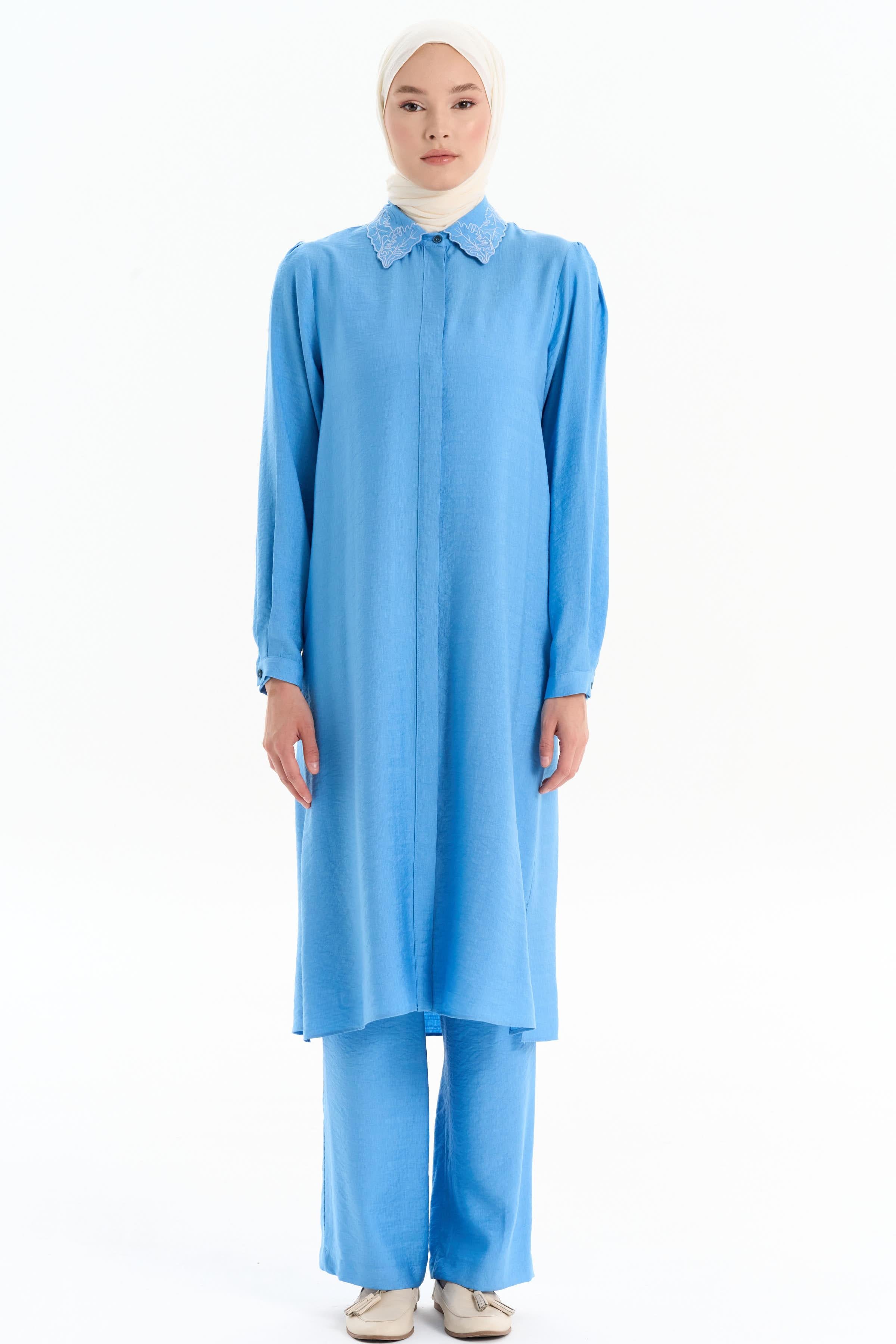 The Embroidered Collar Tunic and Pants Set offers a stylish combination that stands out with its elegant details. The embroidered collar adds a sophisticated touch to the tunic, creating a striking style.