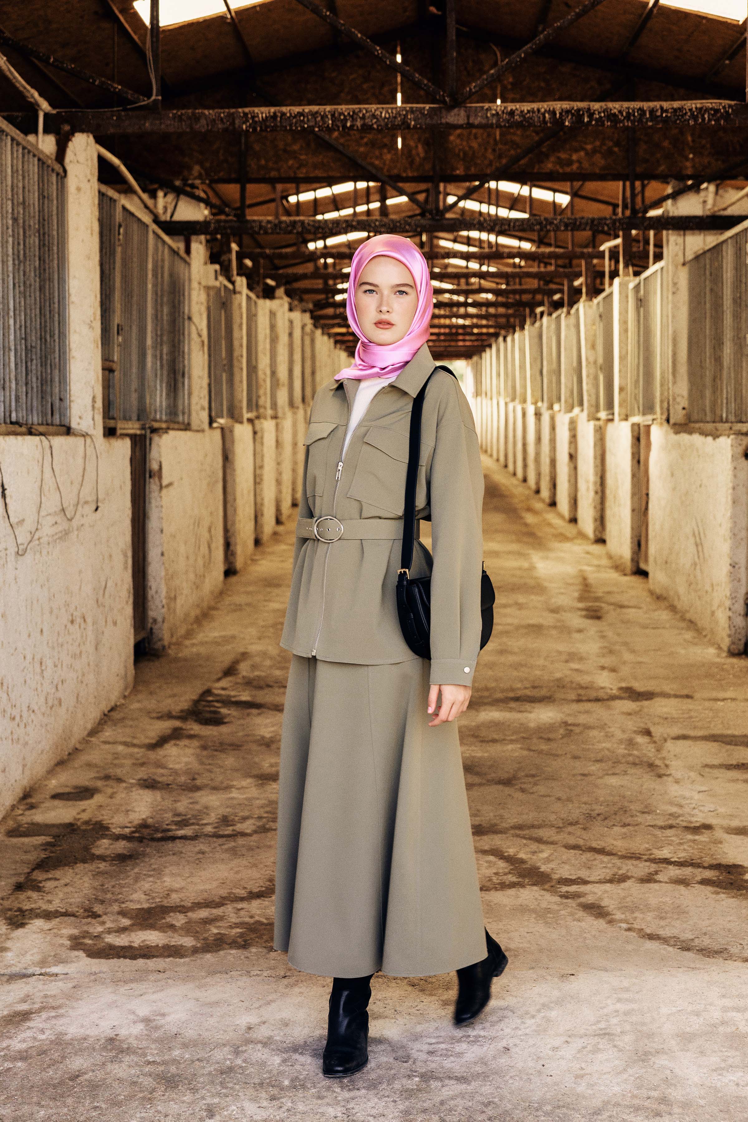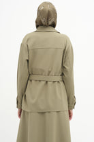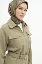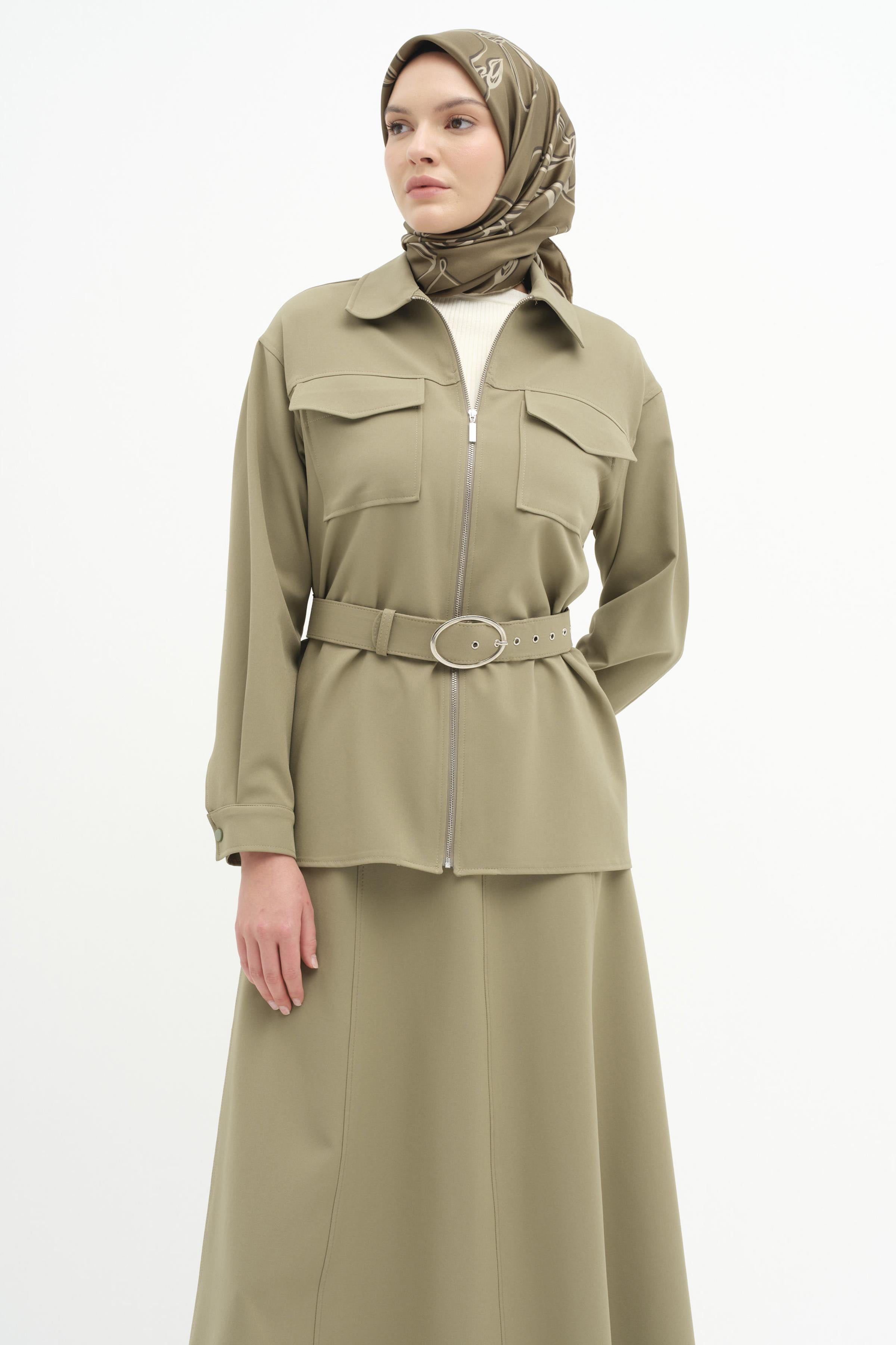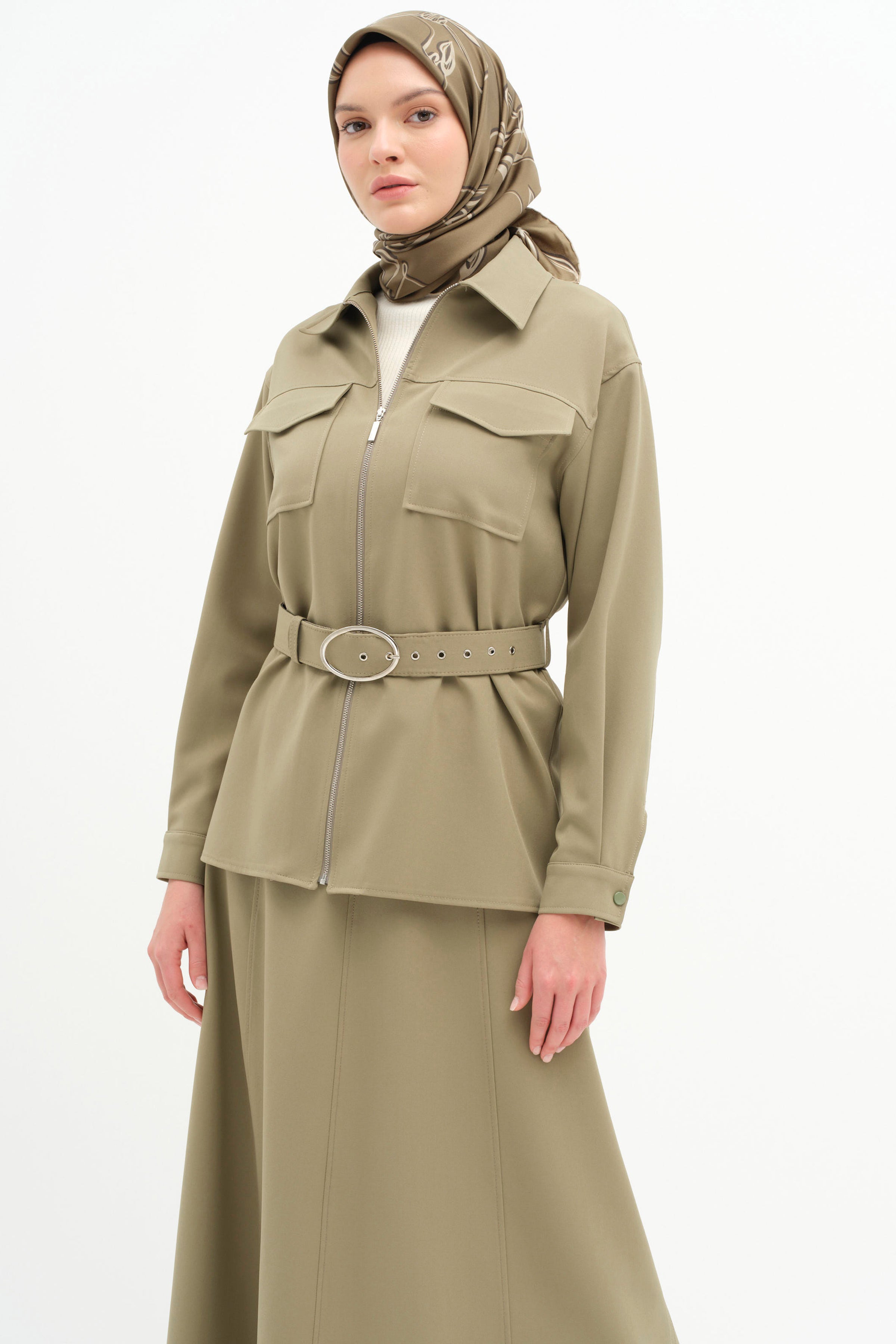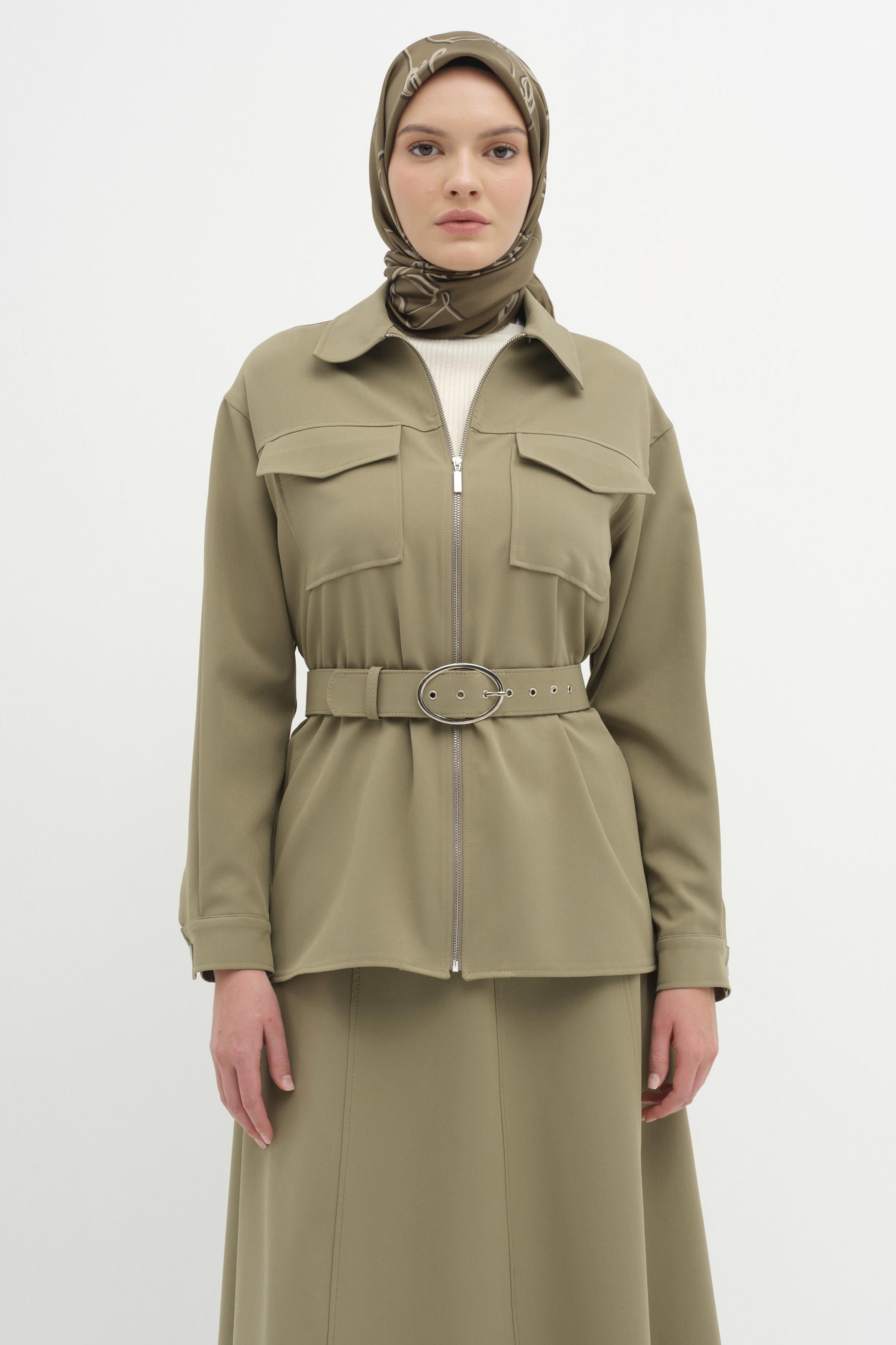 This belted jacket with zip closure offers a modern and stylish design. The zip closure provides practical use, while the belt detail accentuates your waist, creating an elegant silhouette.