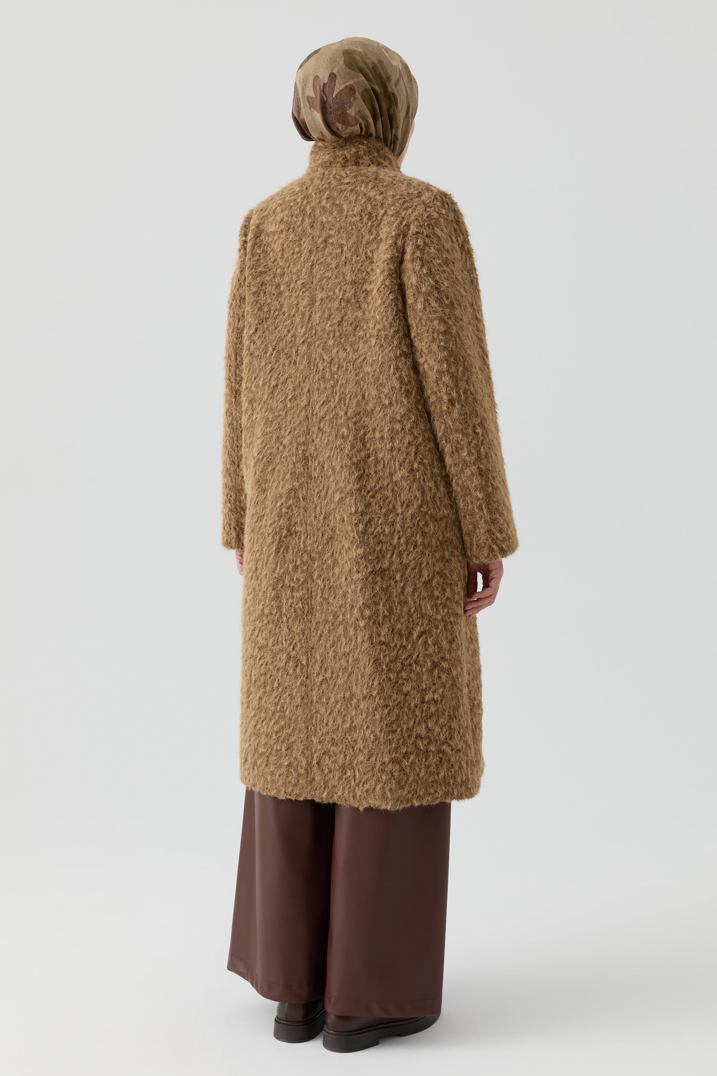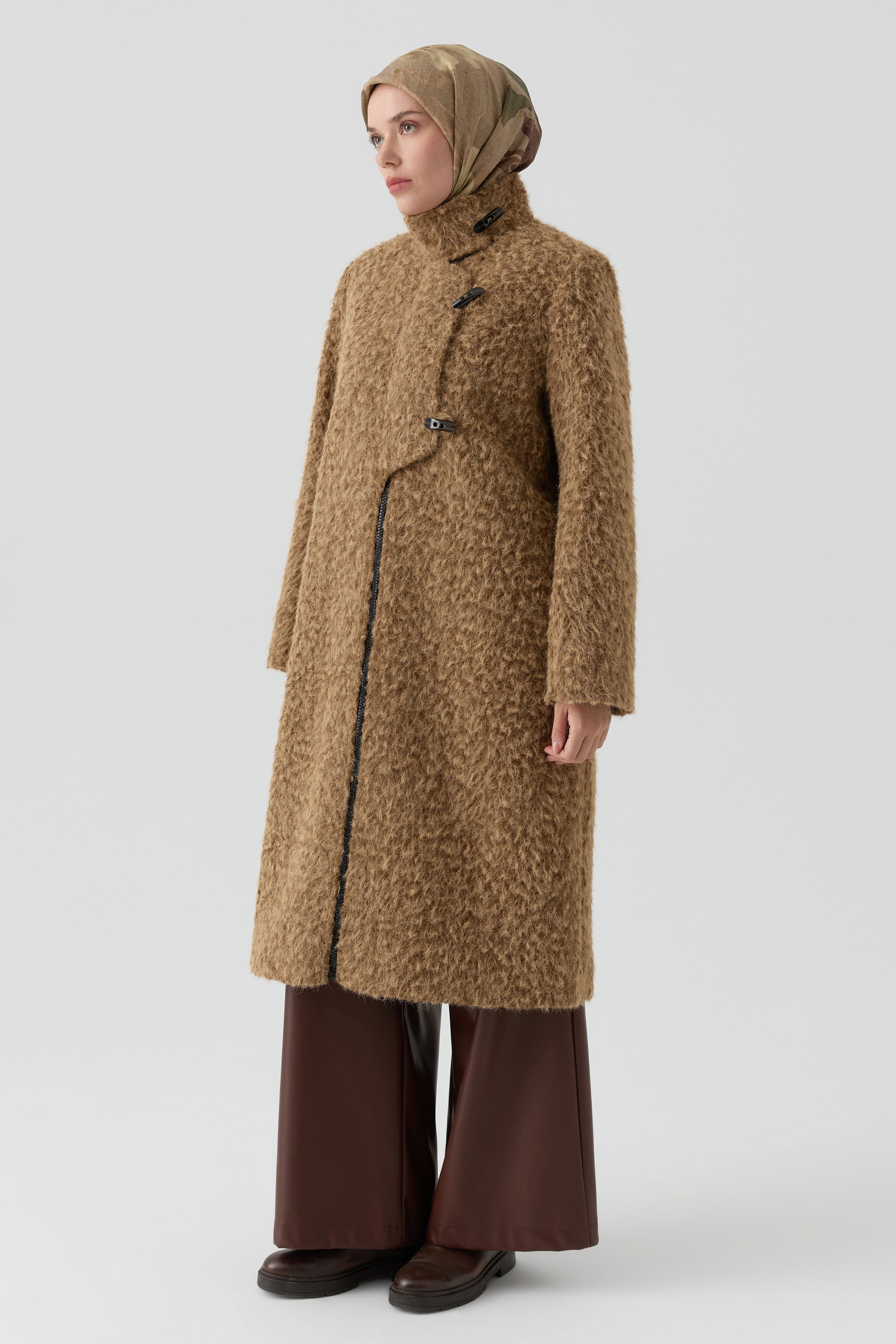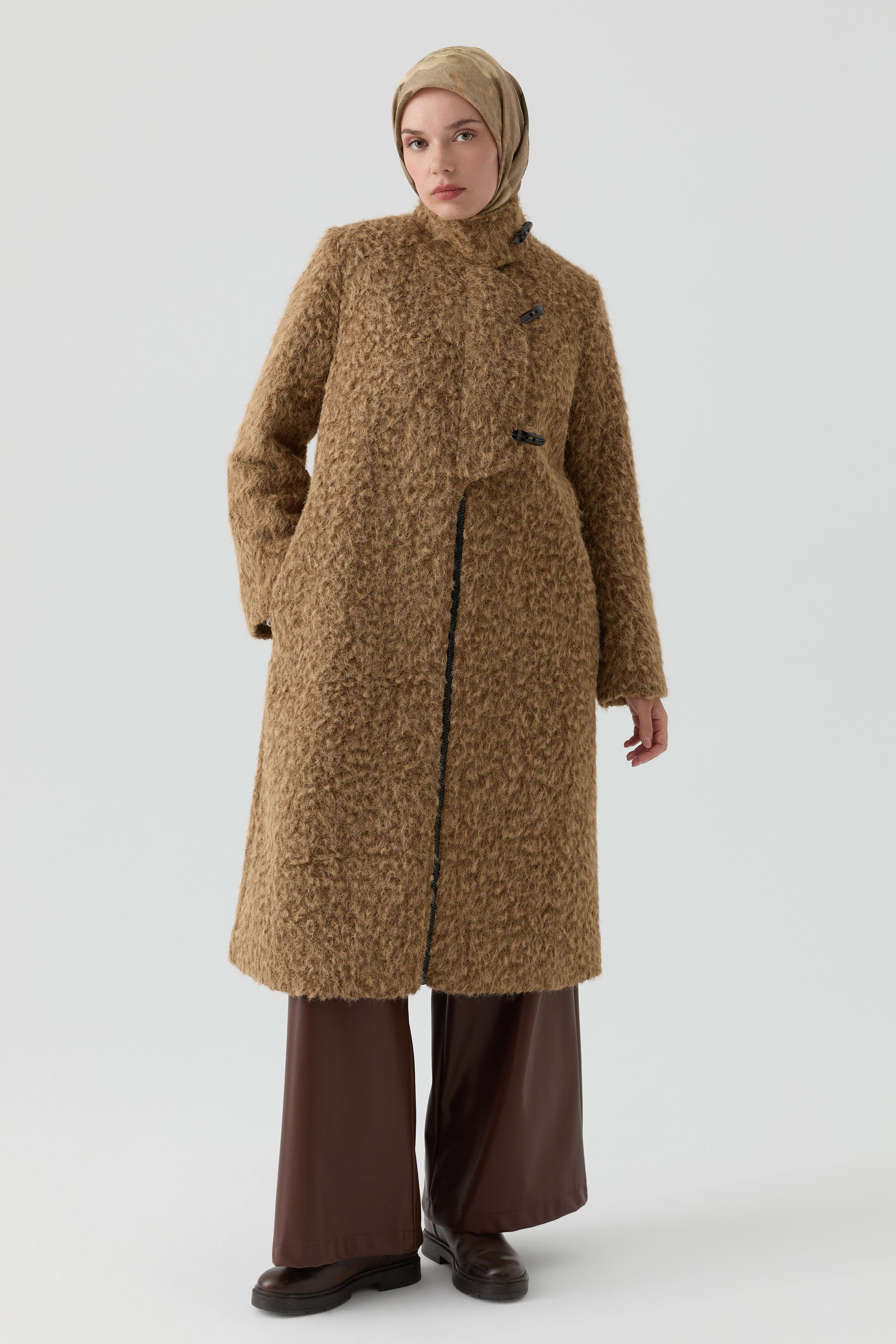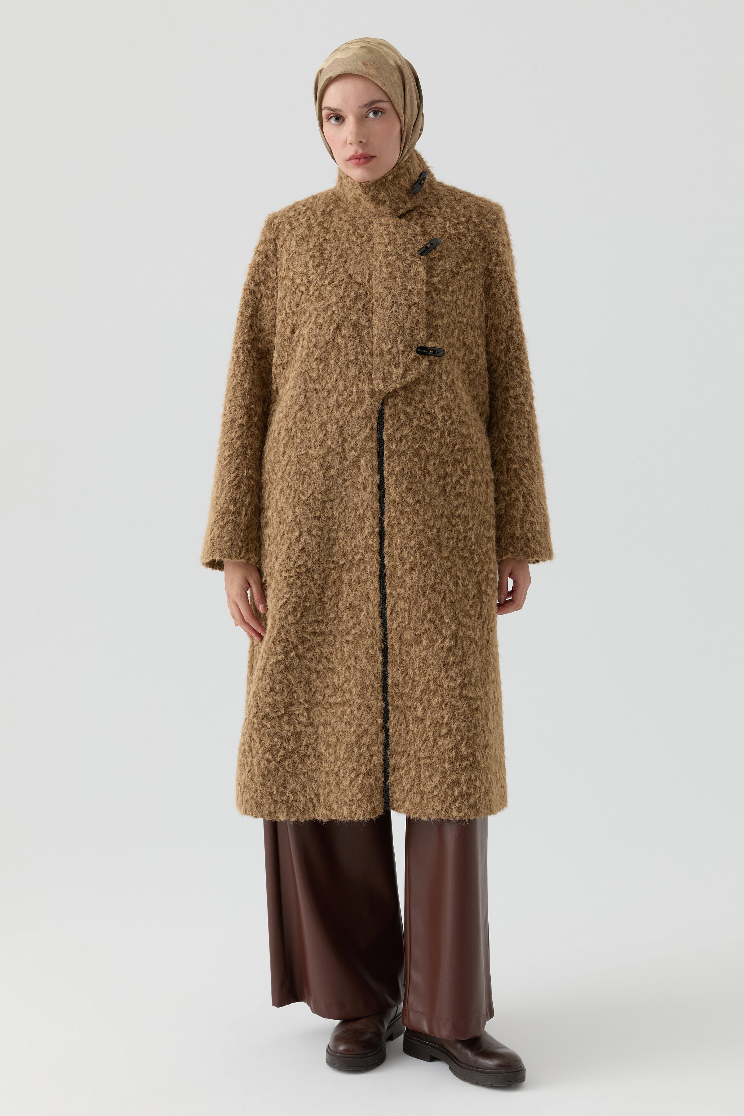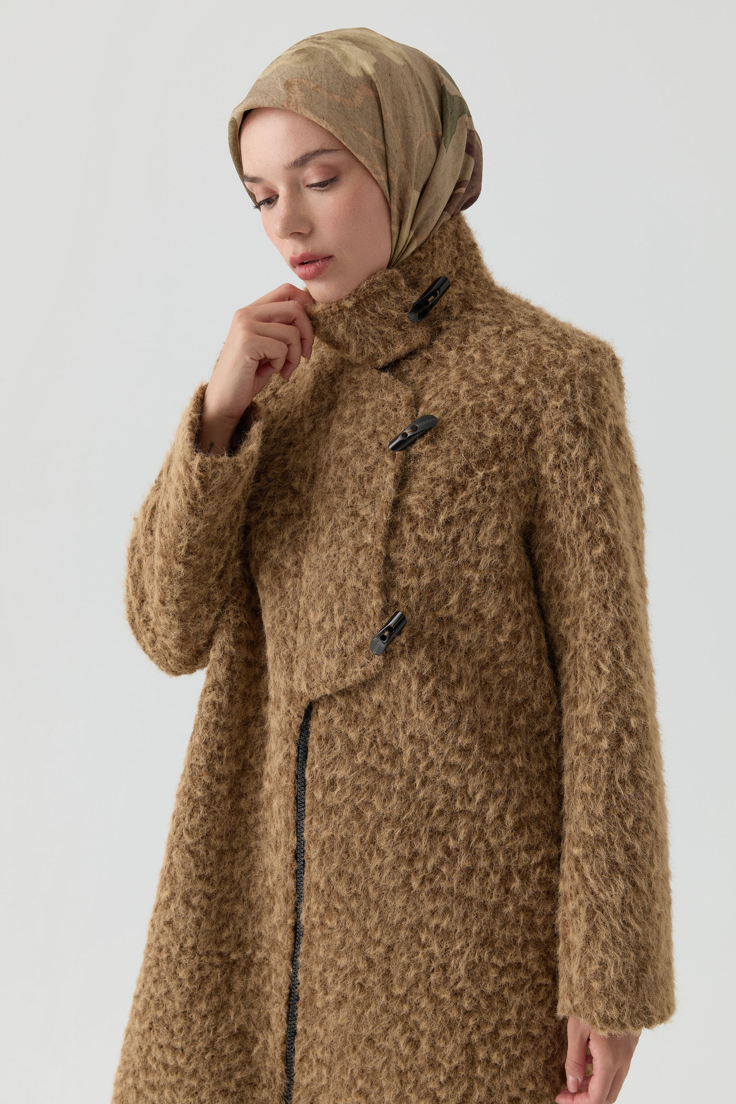 Combining classic shepherd's buttons with a modern stand-up collar, it offers timeless elegance. Its warm structure, comfortable cut, and sophisticated lines will make it an essential part of your winter style.