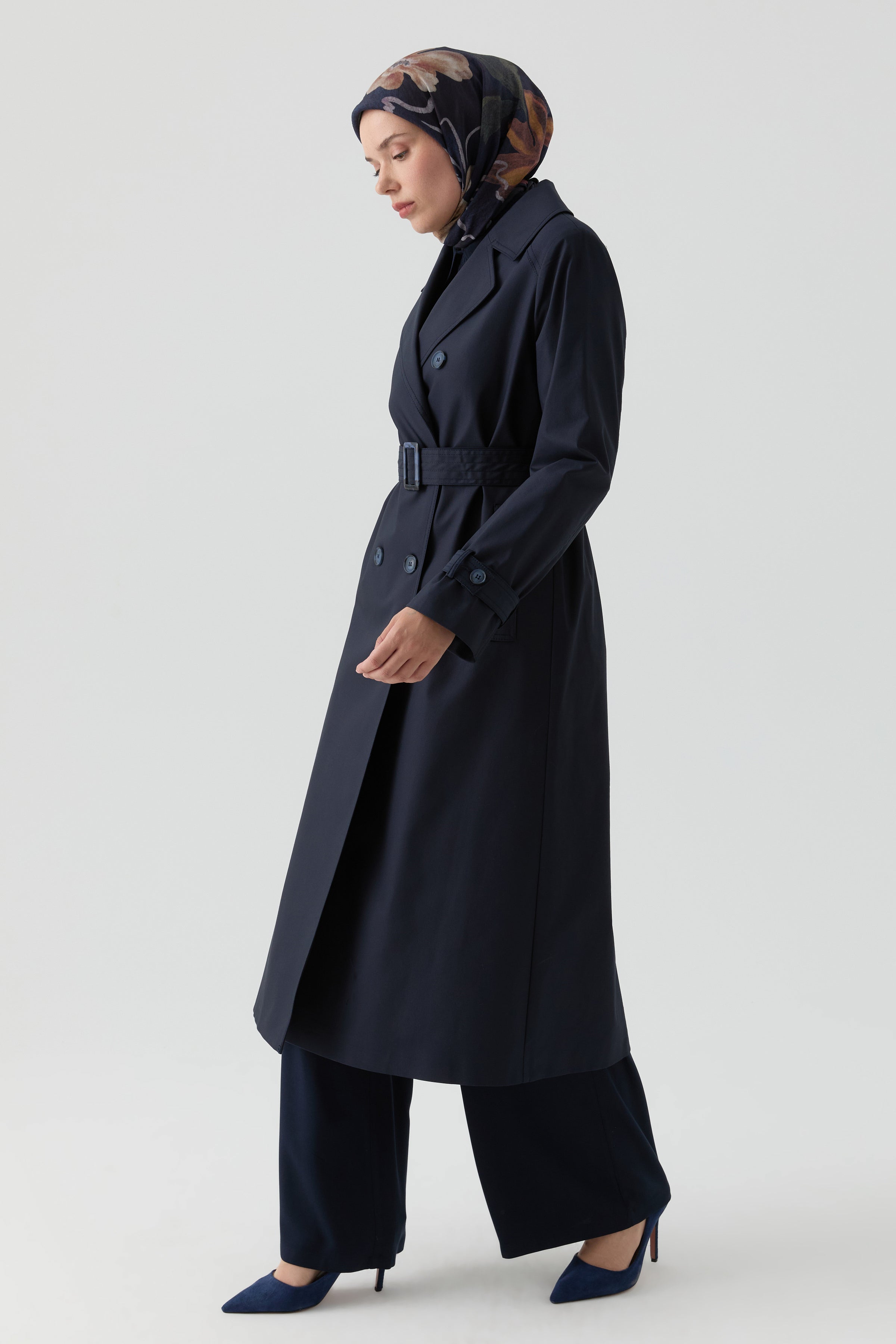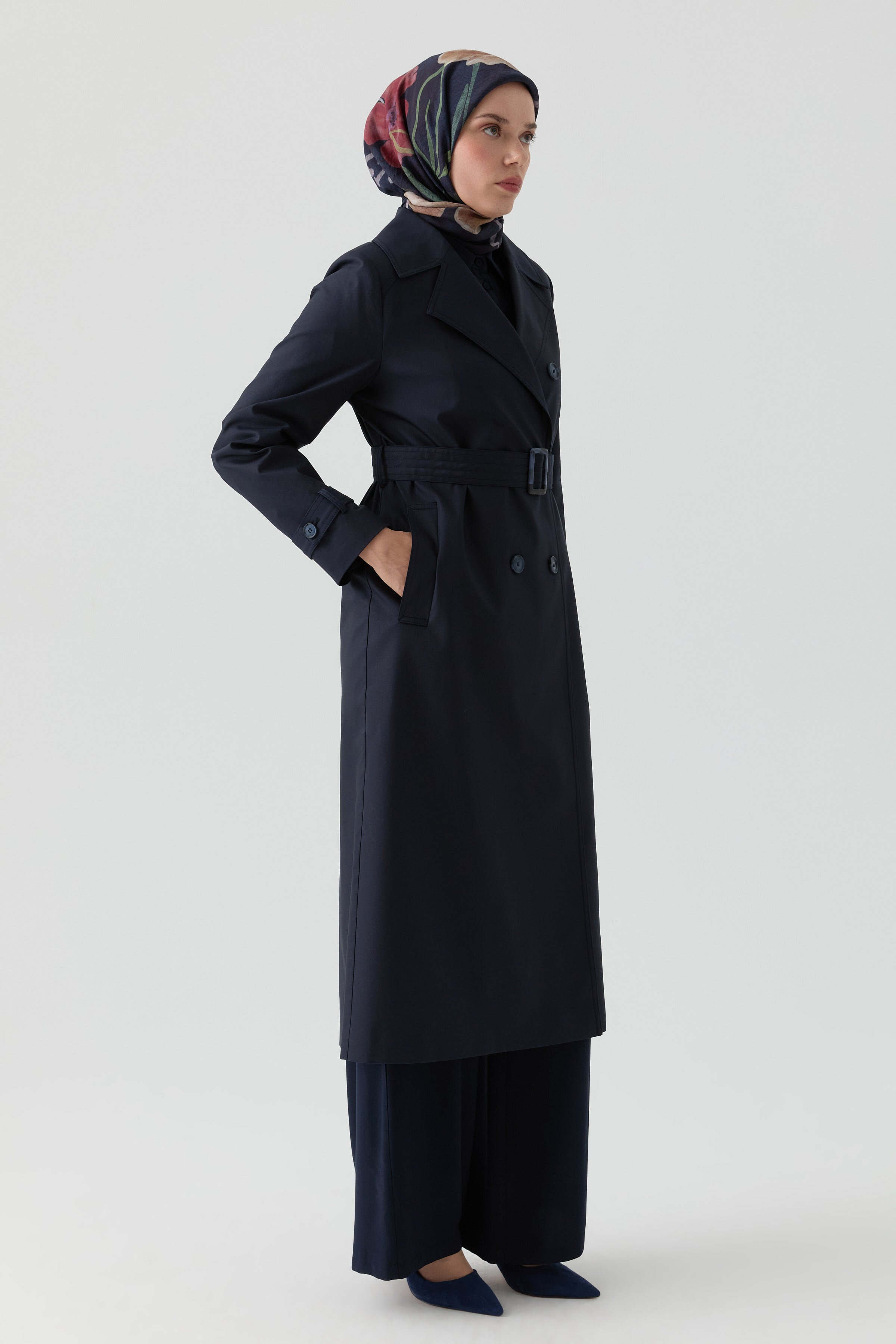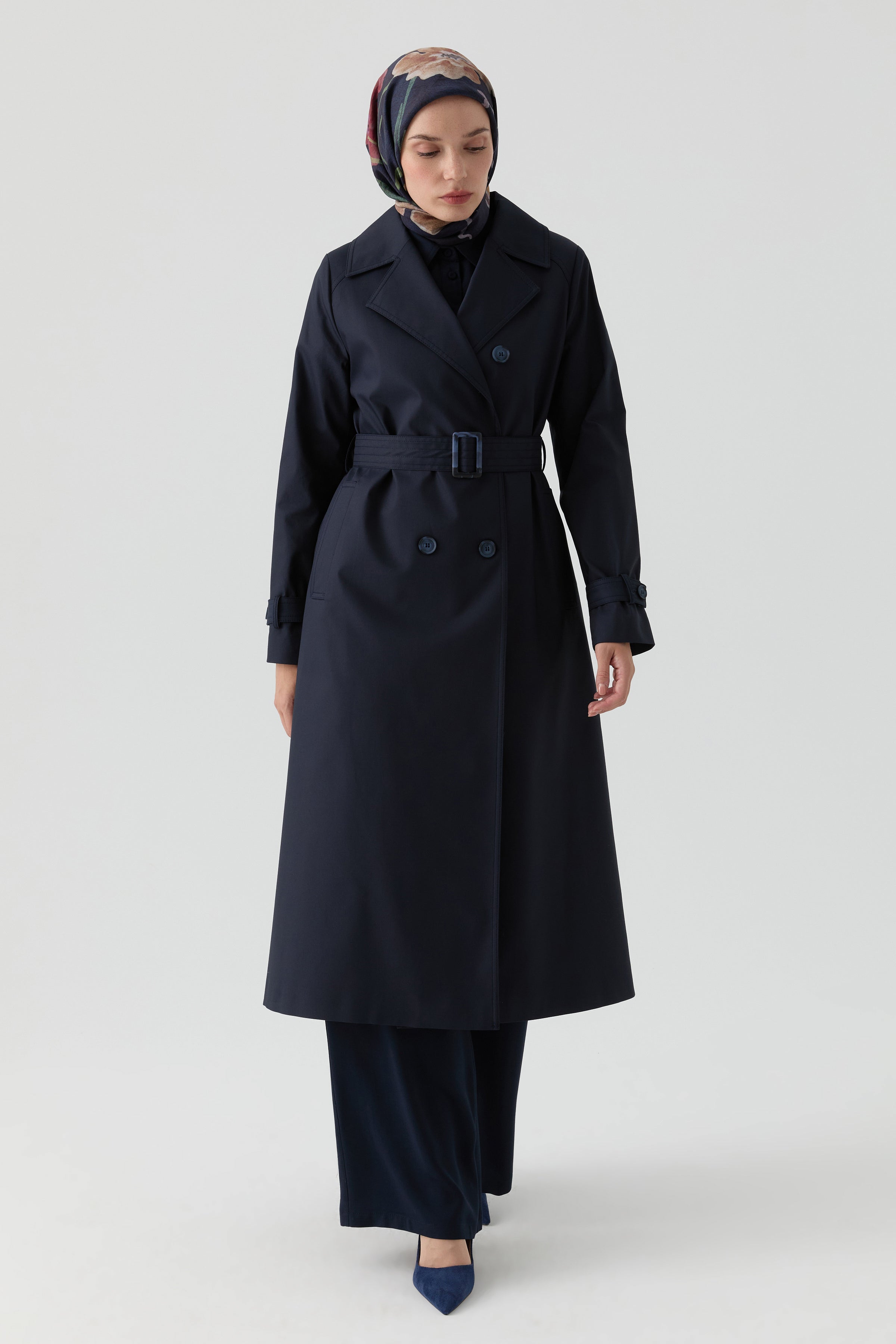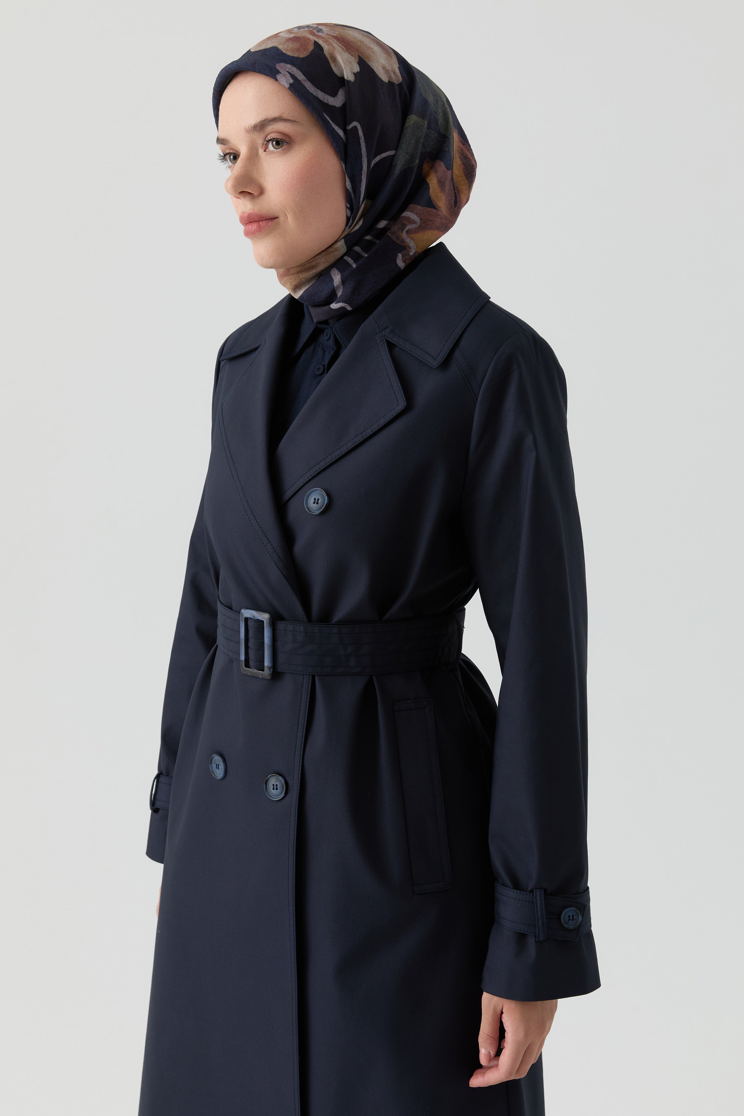 Double-Breasted Trench Coat with Windbreaker Detail - Navy Blue