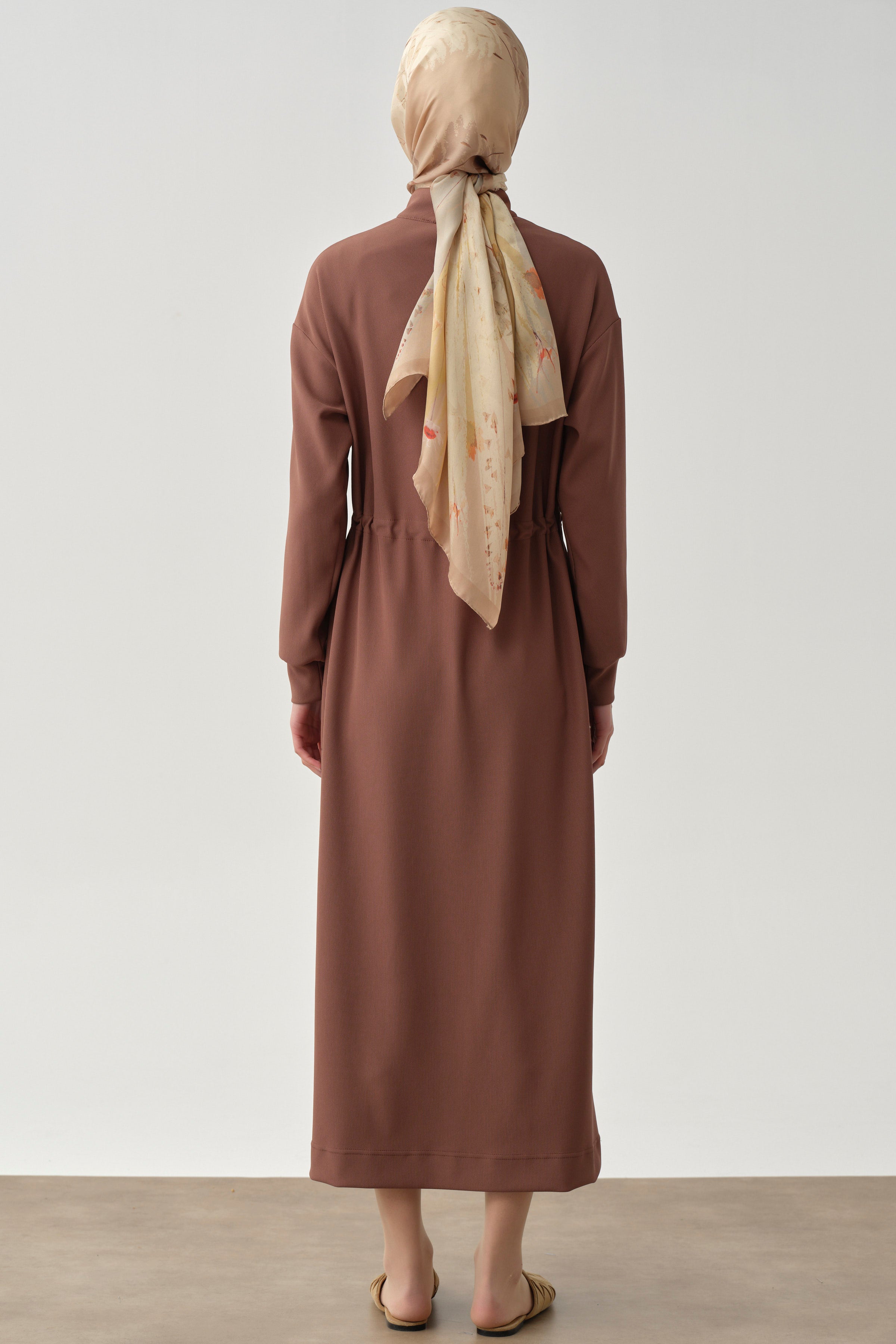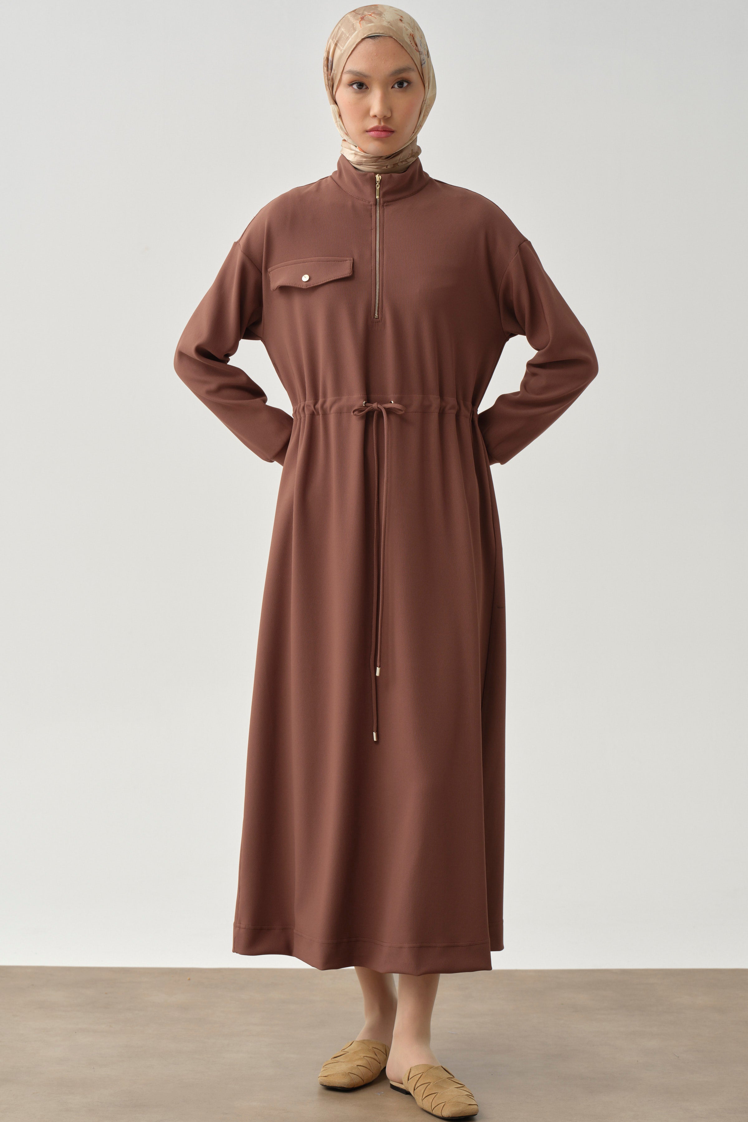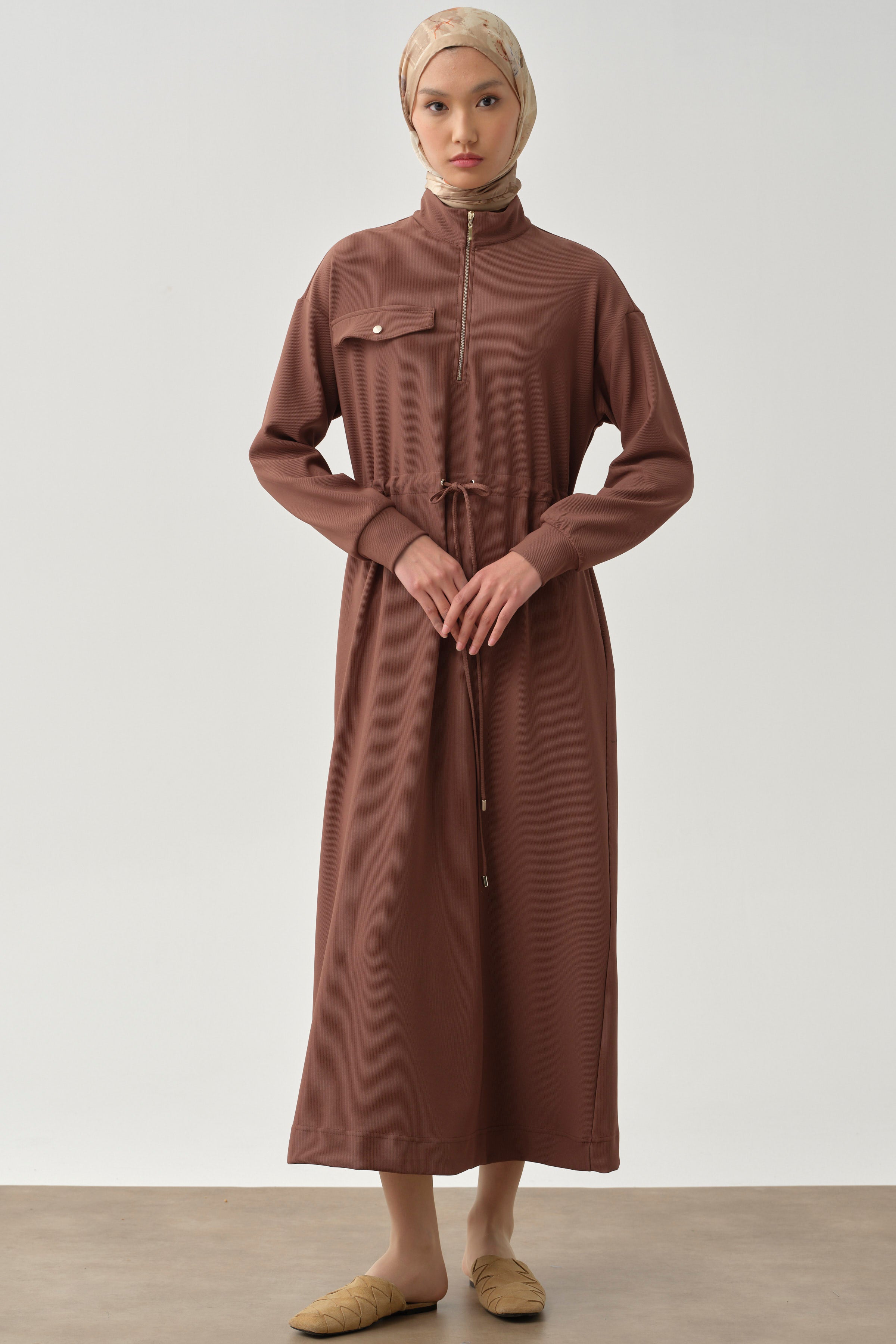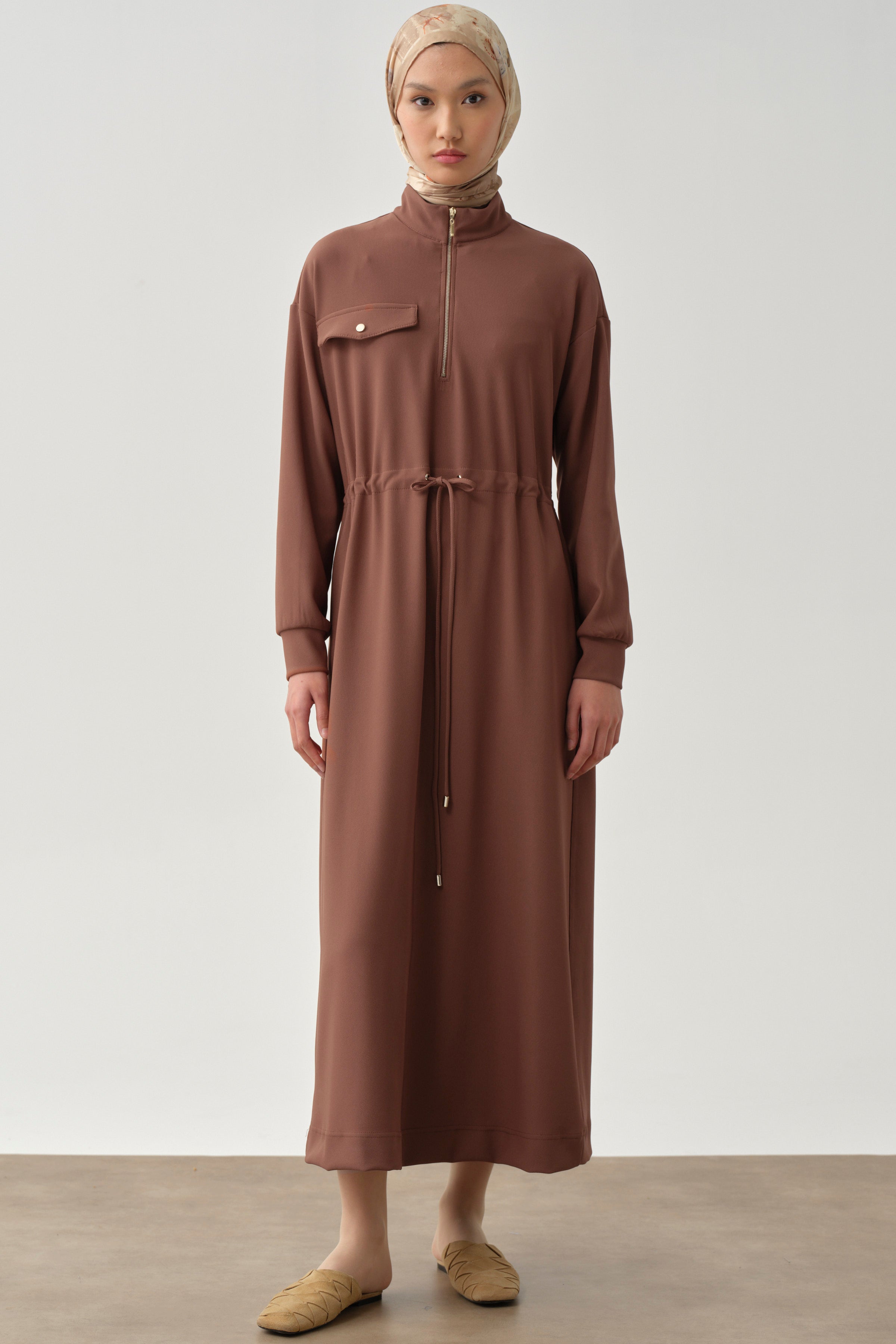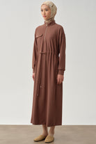 The drawstring detail at the waist gives the dress an elegant silhouette while ensuring comfortable wear. The knitted fabric hugs the body, creating a modern look and offering freedom of movement.