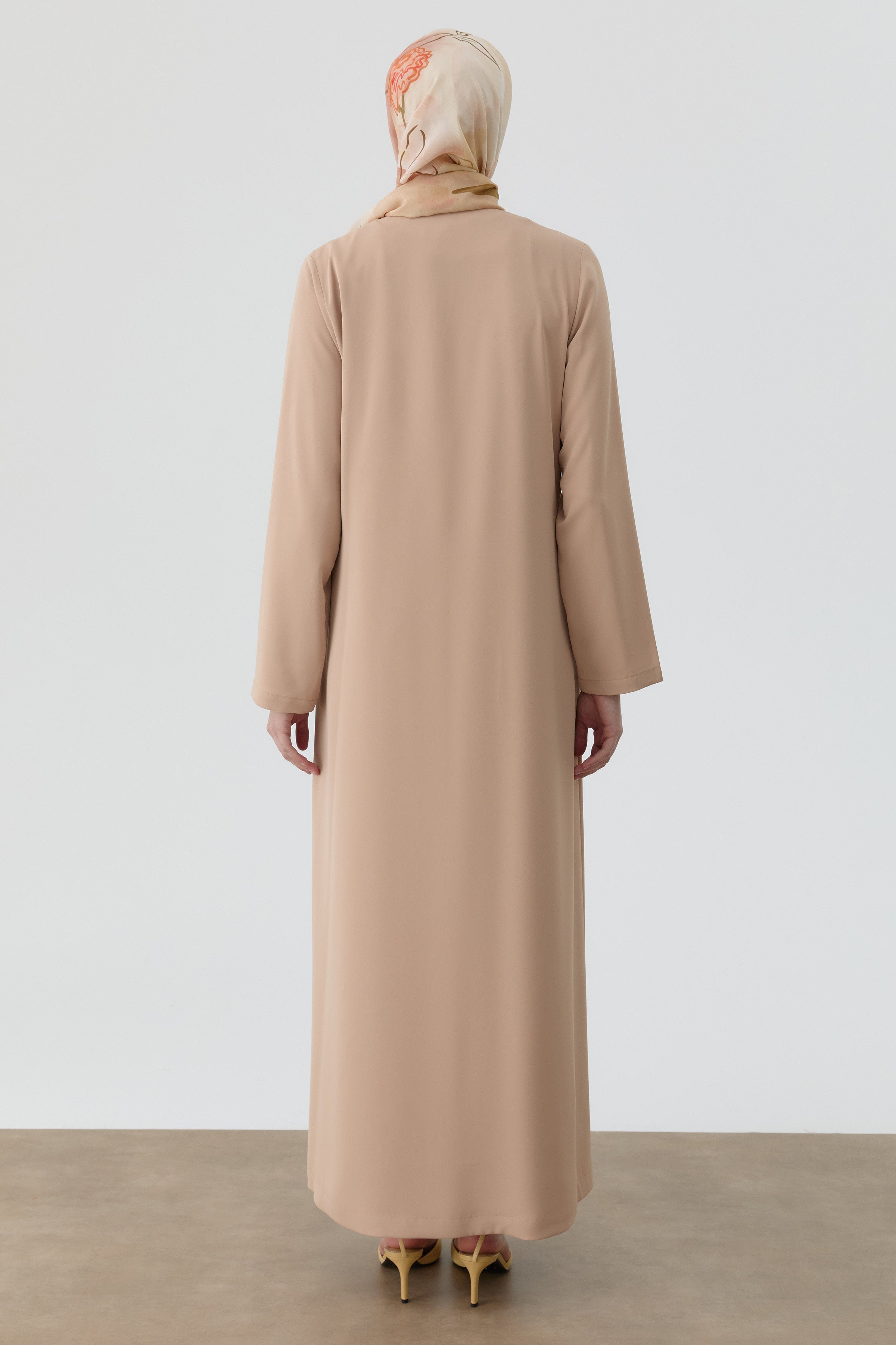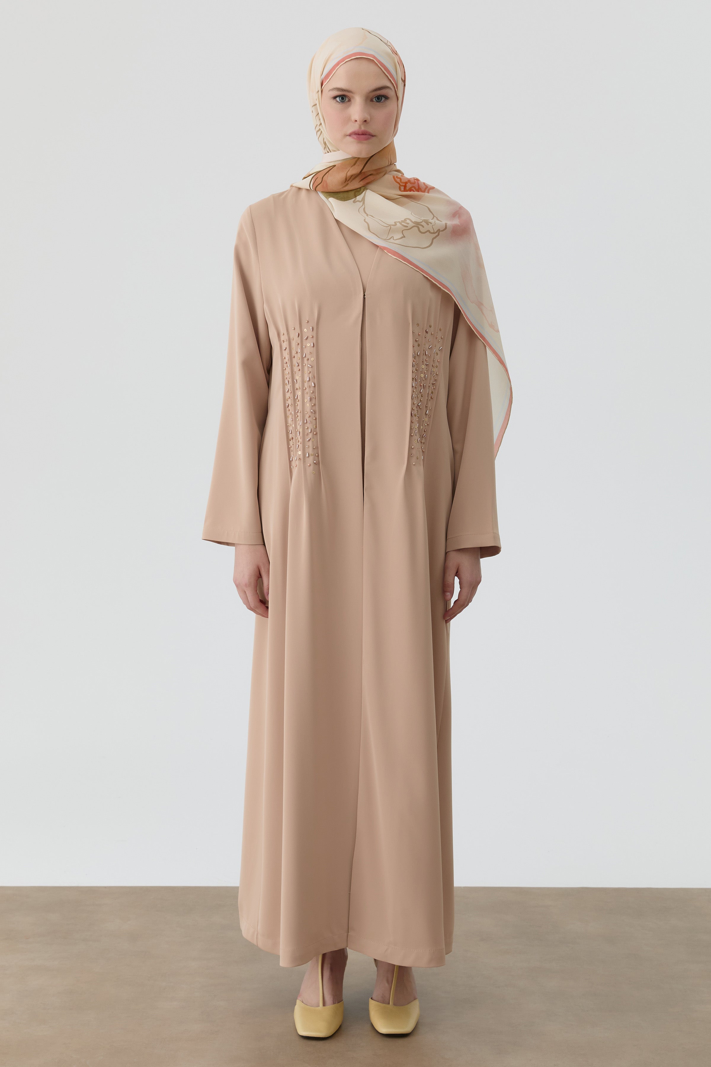 This abaya, which completes the elegance with subtle touches of ribbed embroidery on the waist, gently hugs the silhouette thanks to its flowing structure.