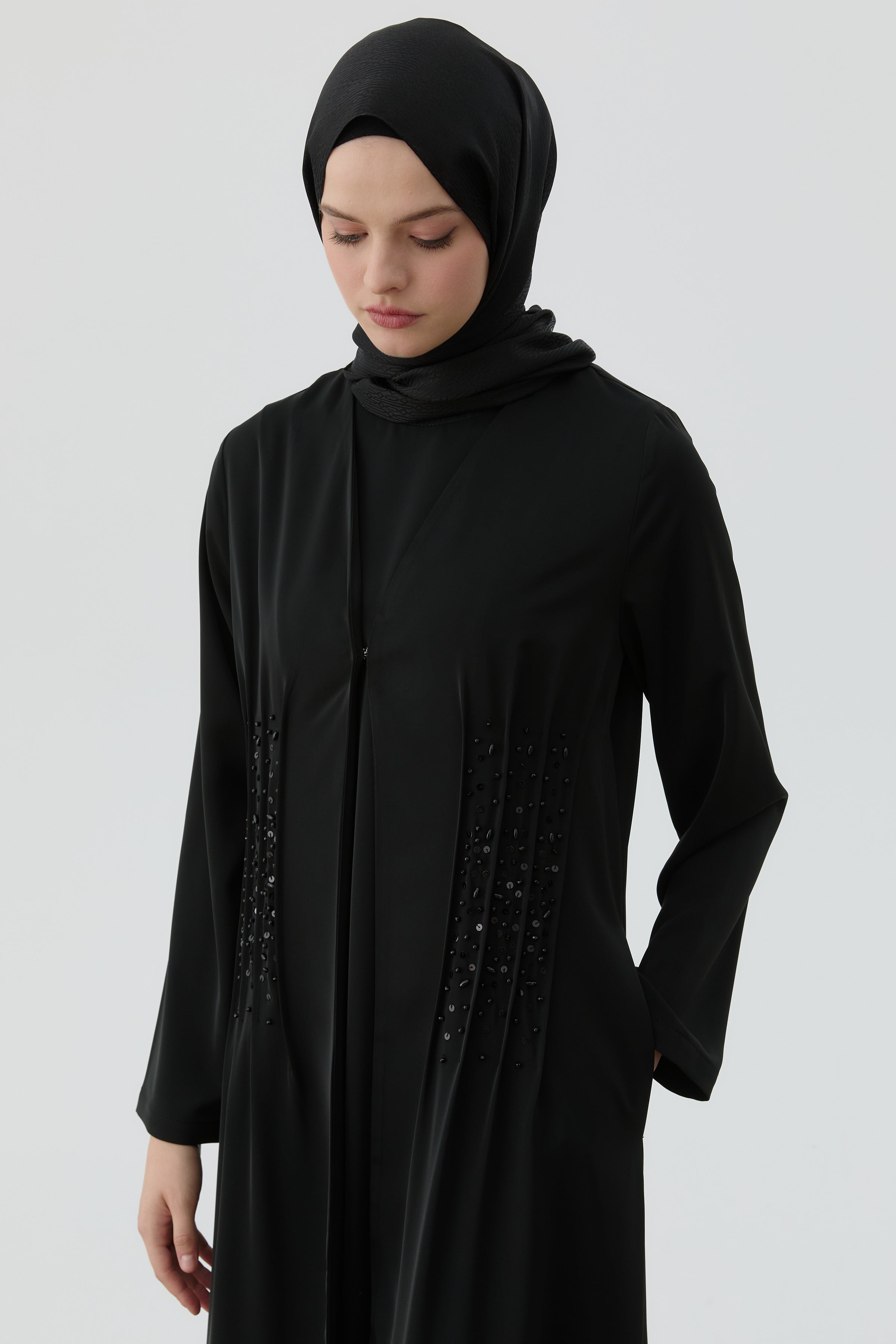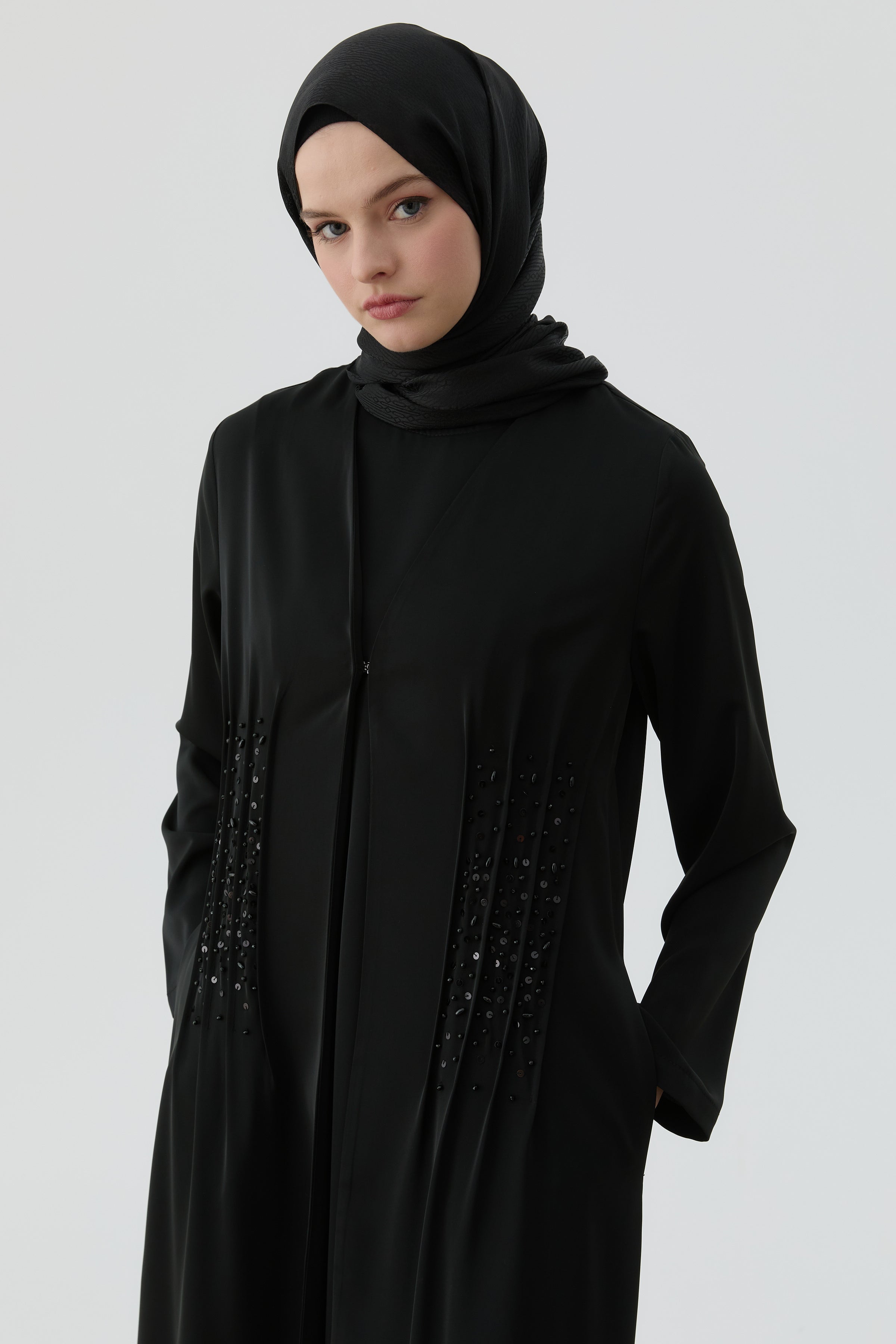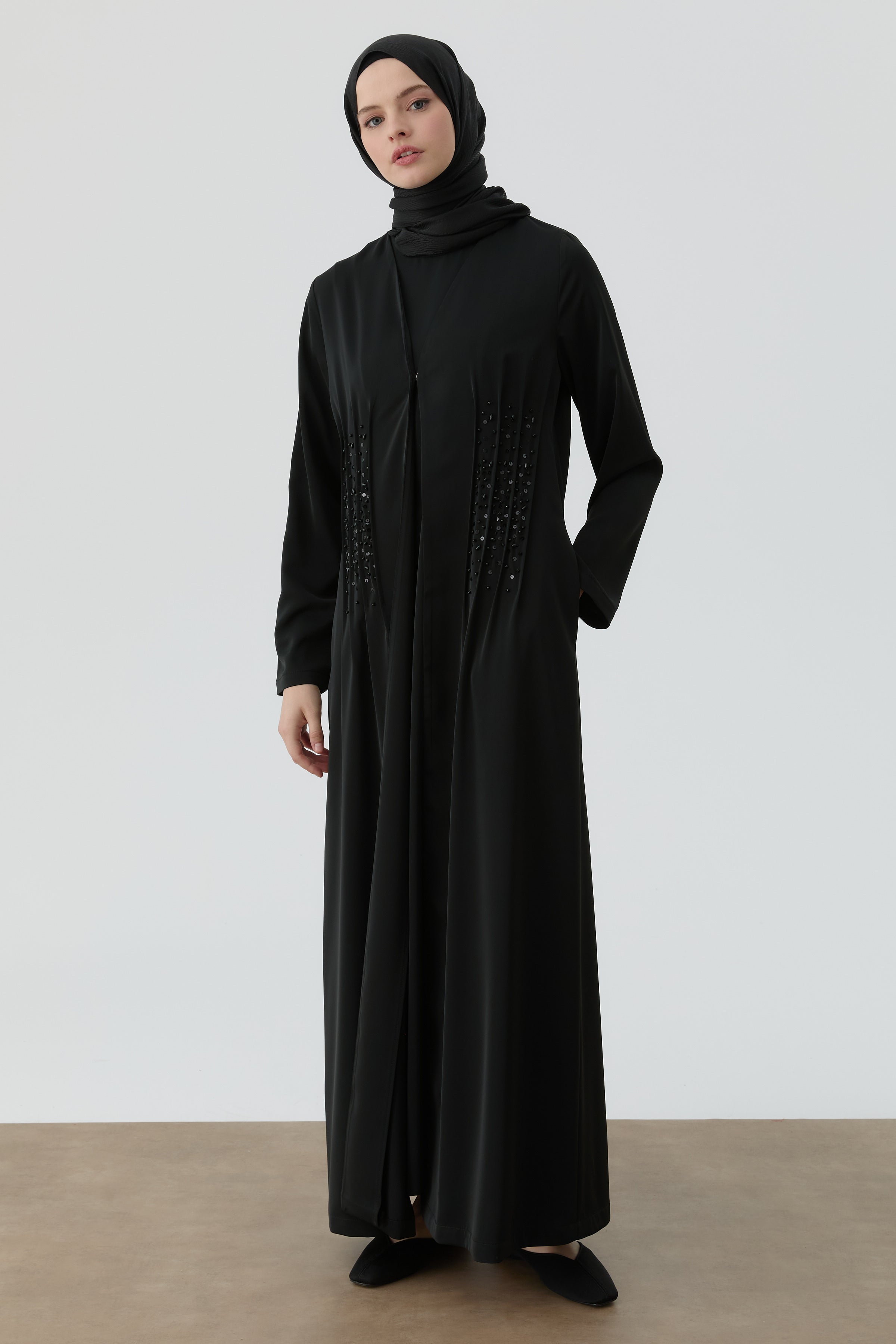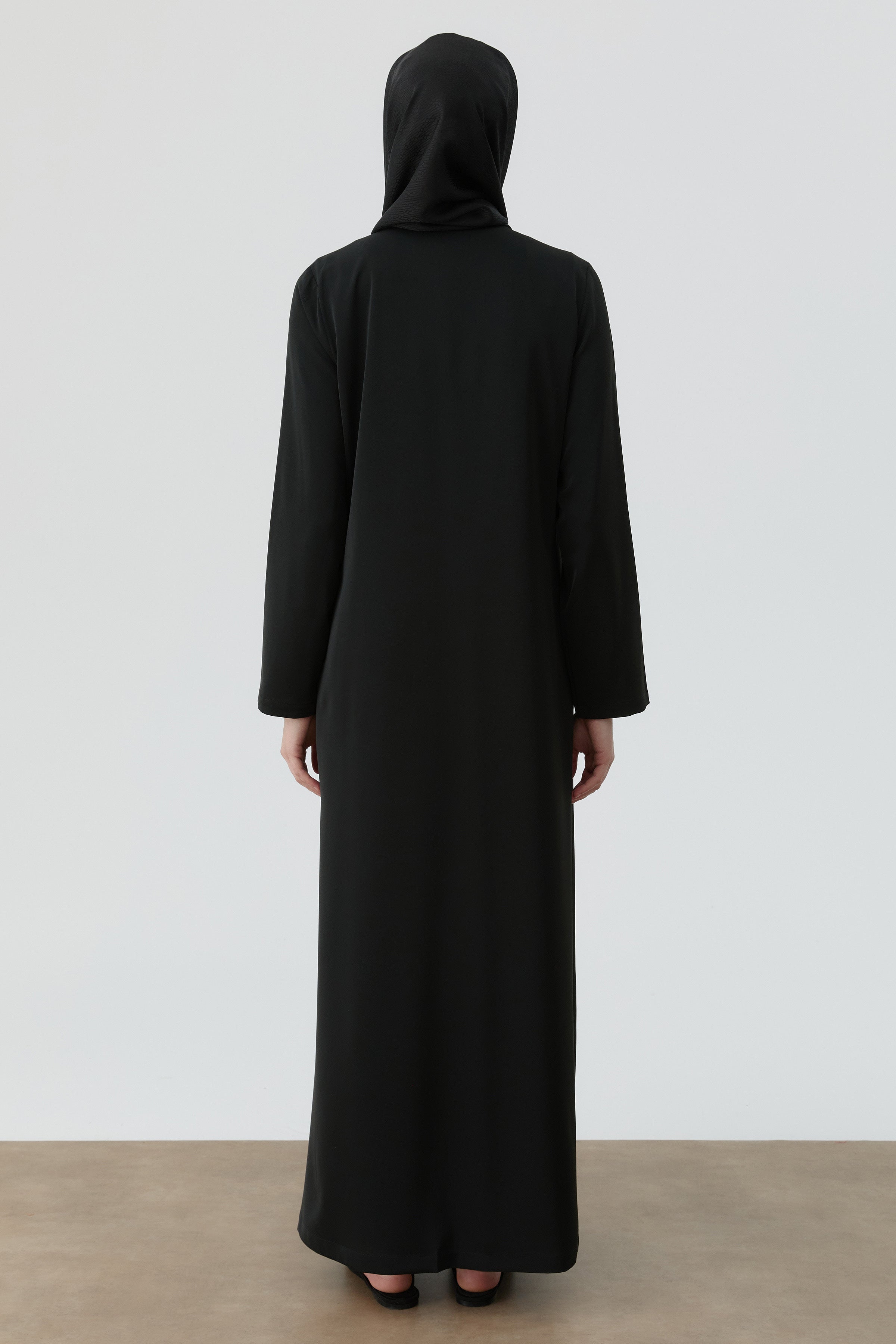 This abaya, which completes the elegance with subtle touches of ribbed embroidery on the waist, gently hugs the silhouette thanks to its flowing structure.