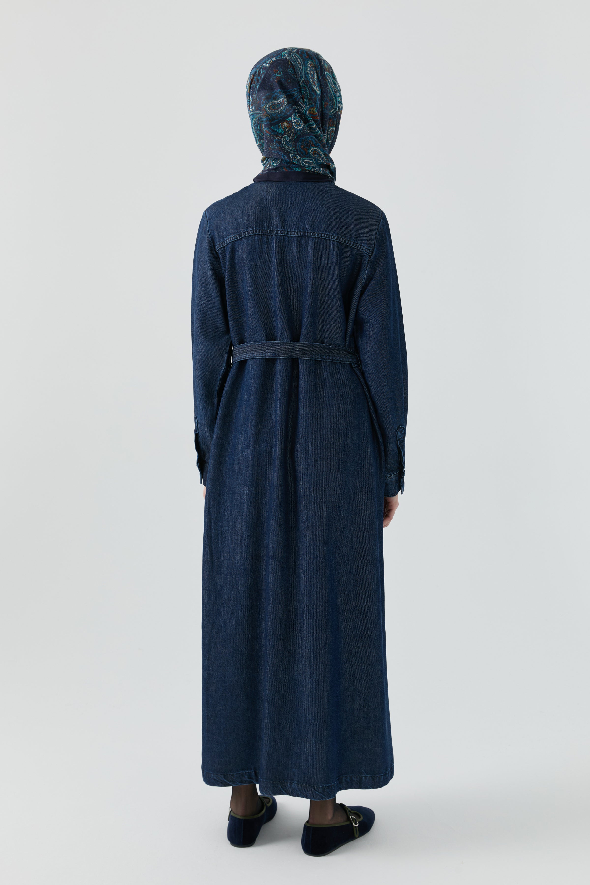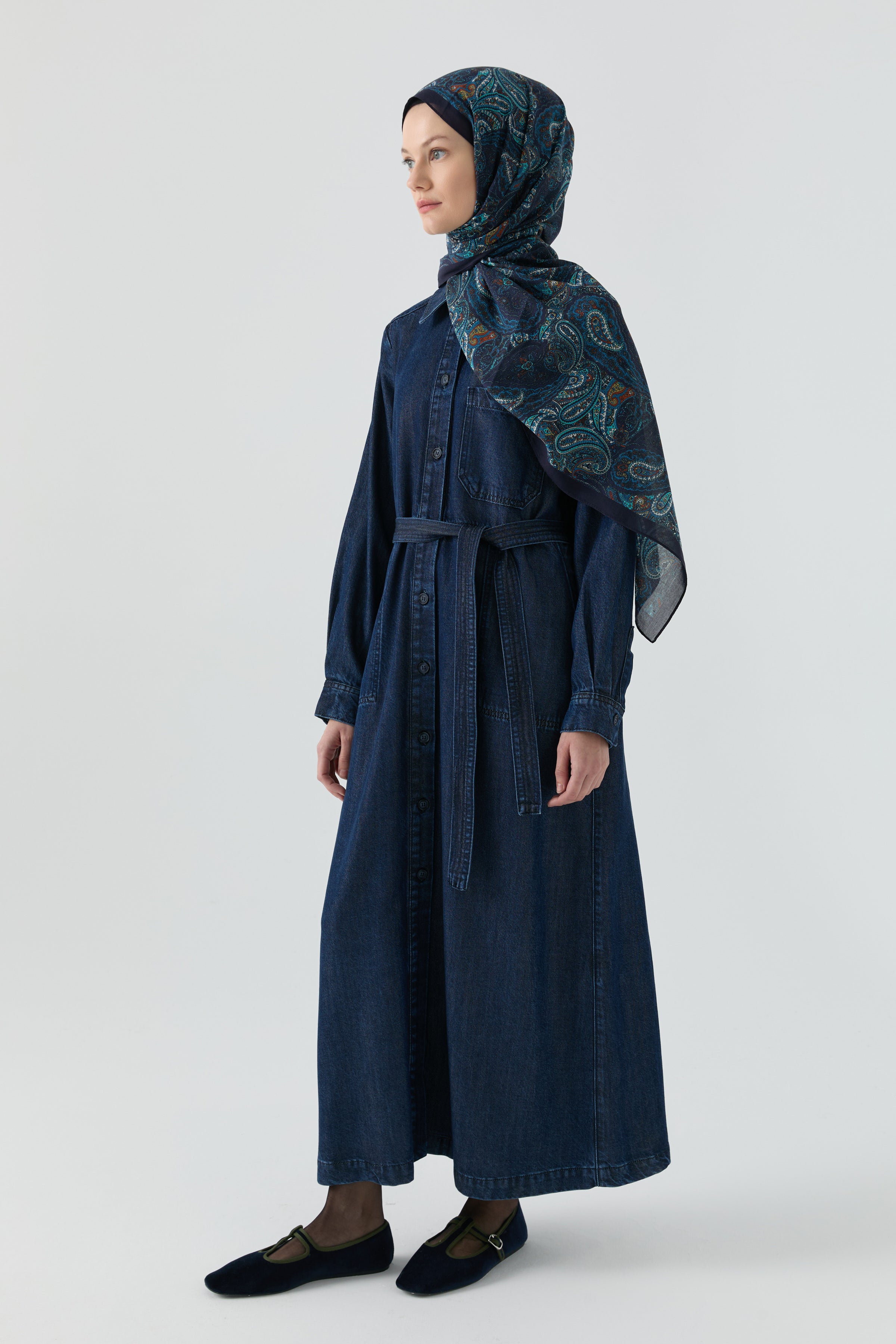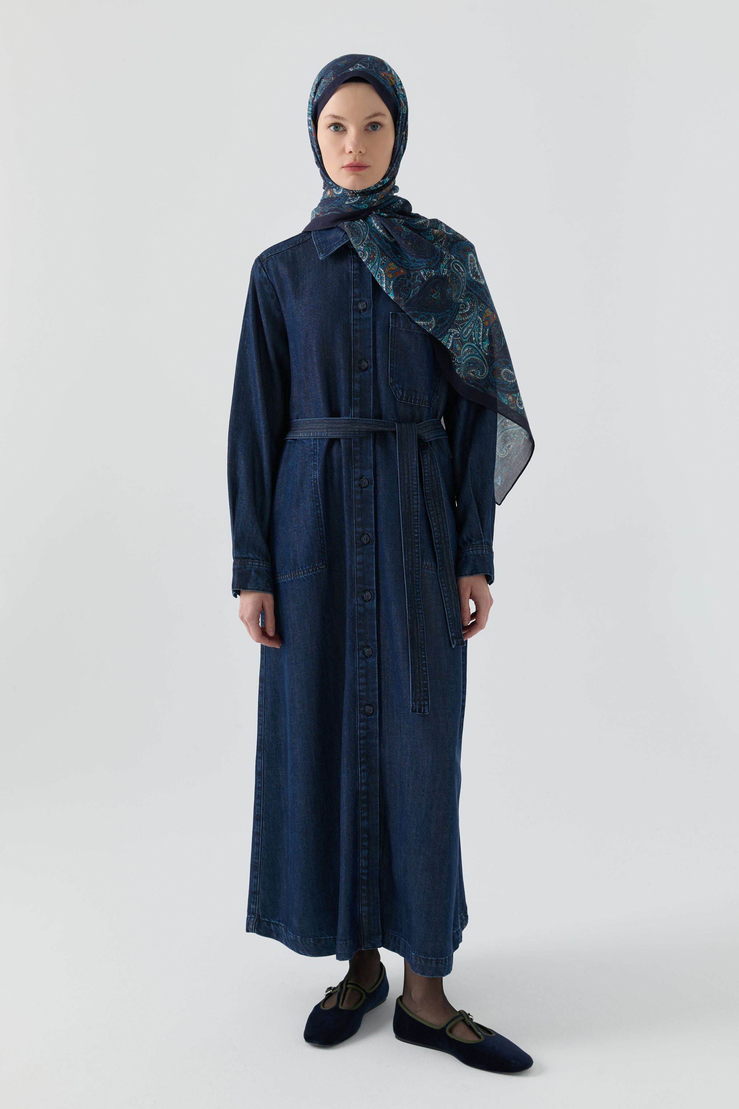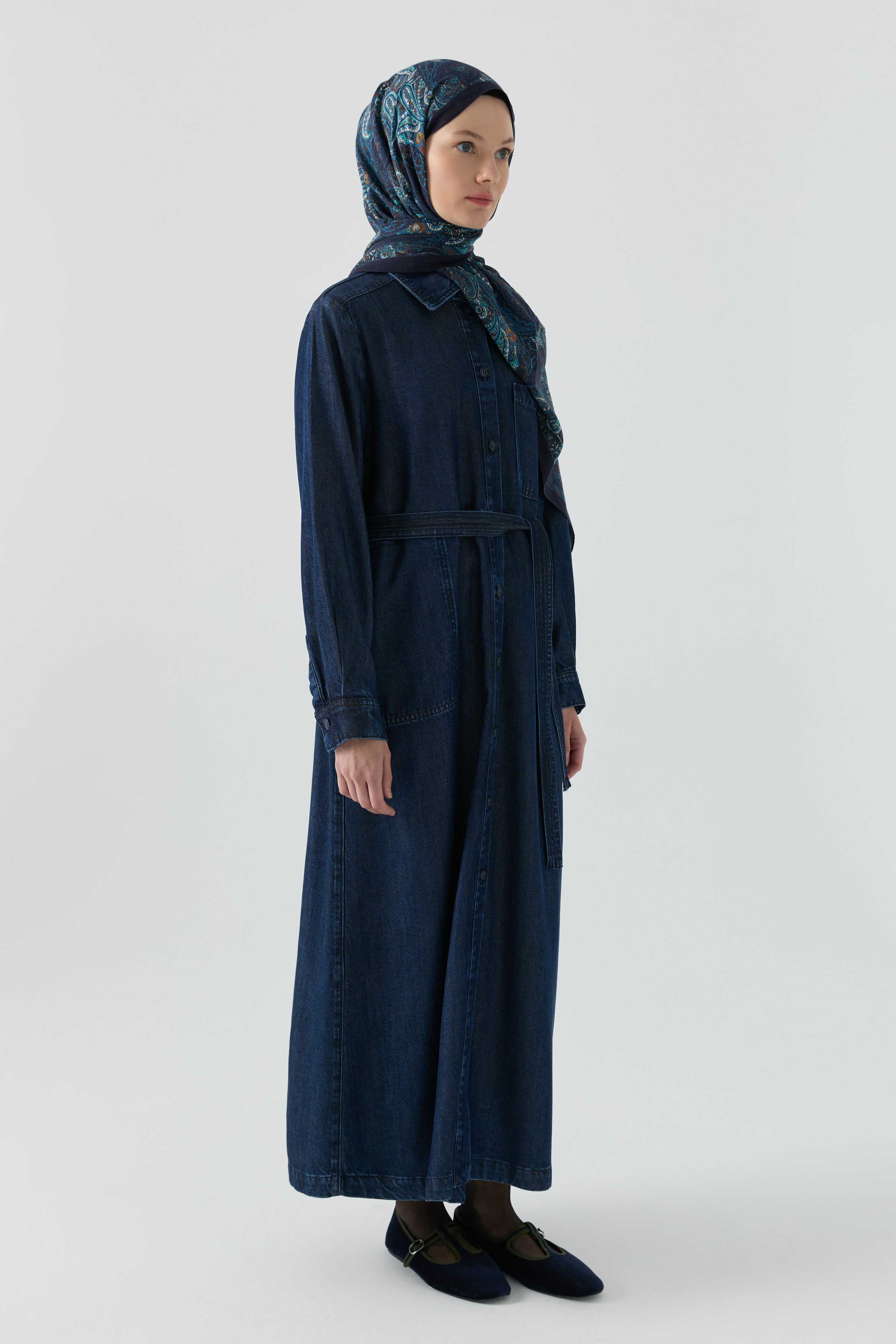 This abaya, which bears the natural texture of denim fabric, offers freedom of movement with its comfortable cut.