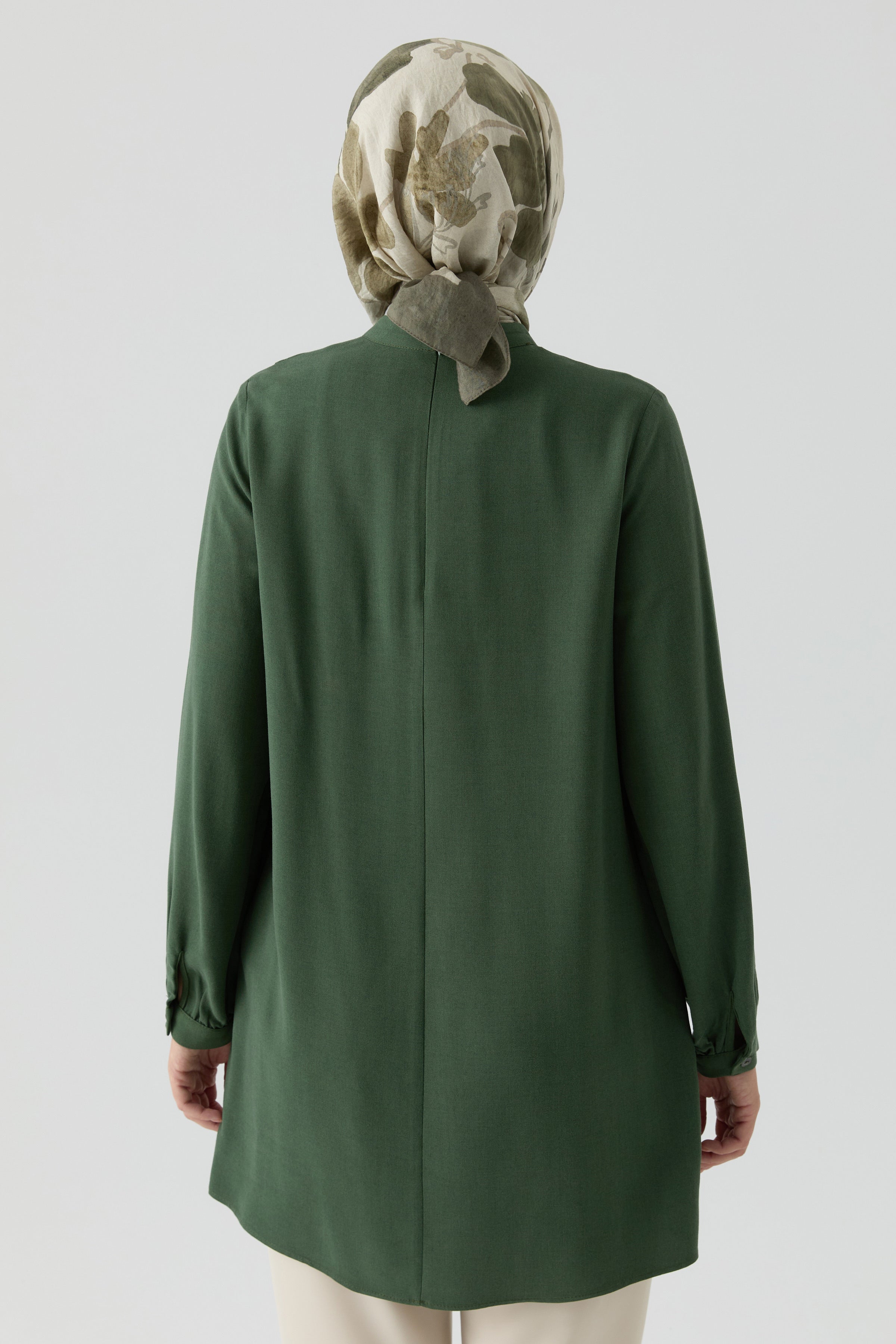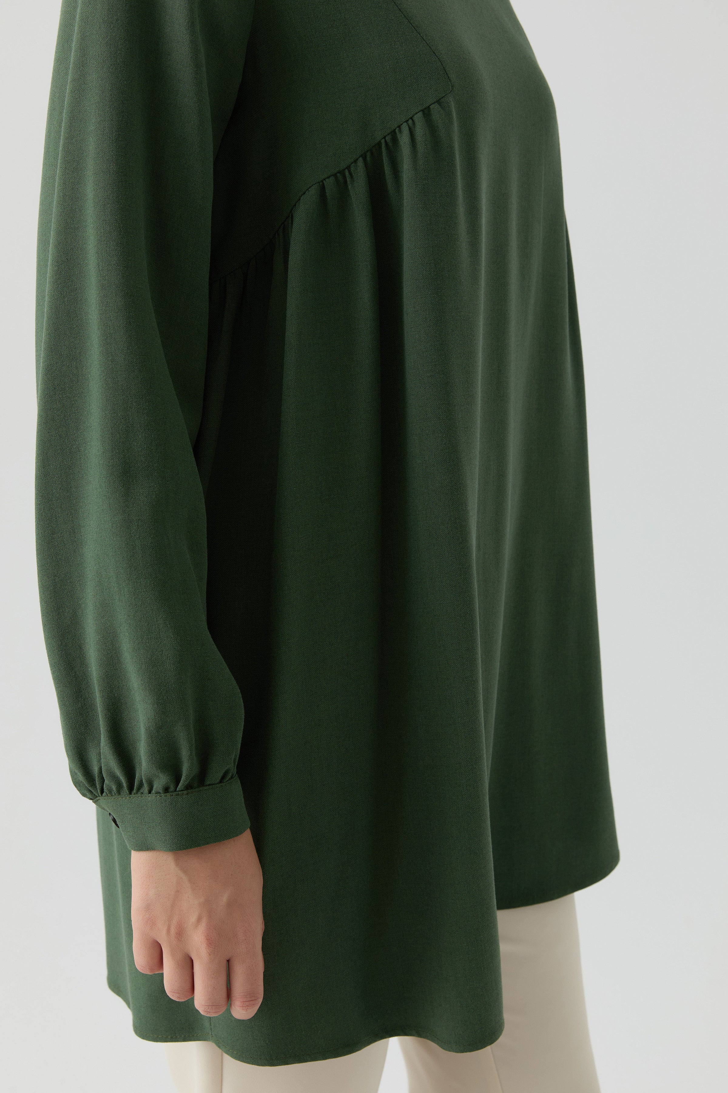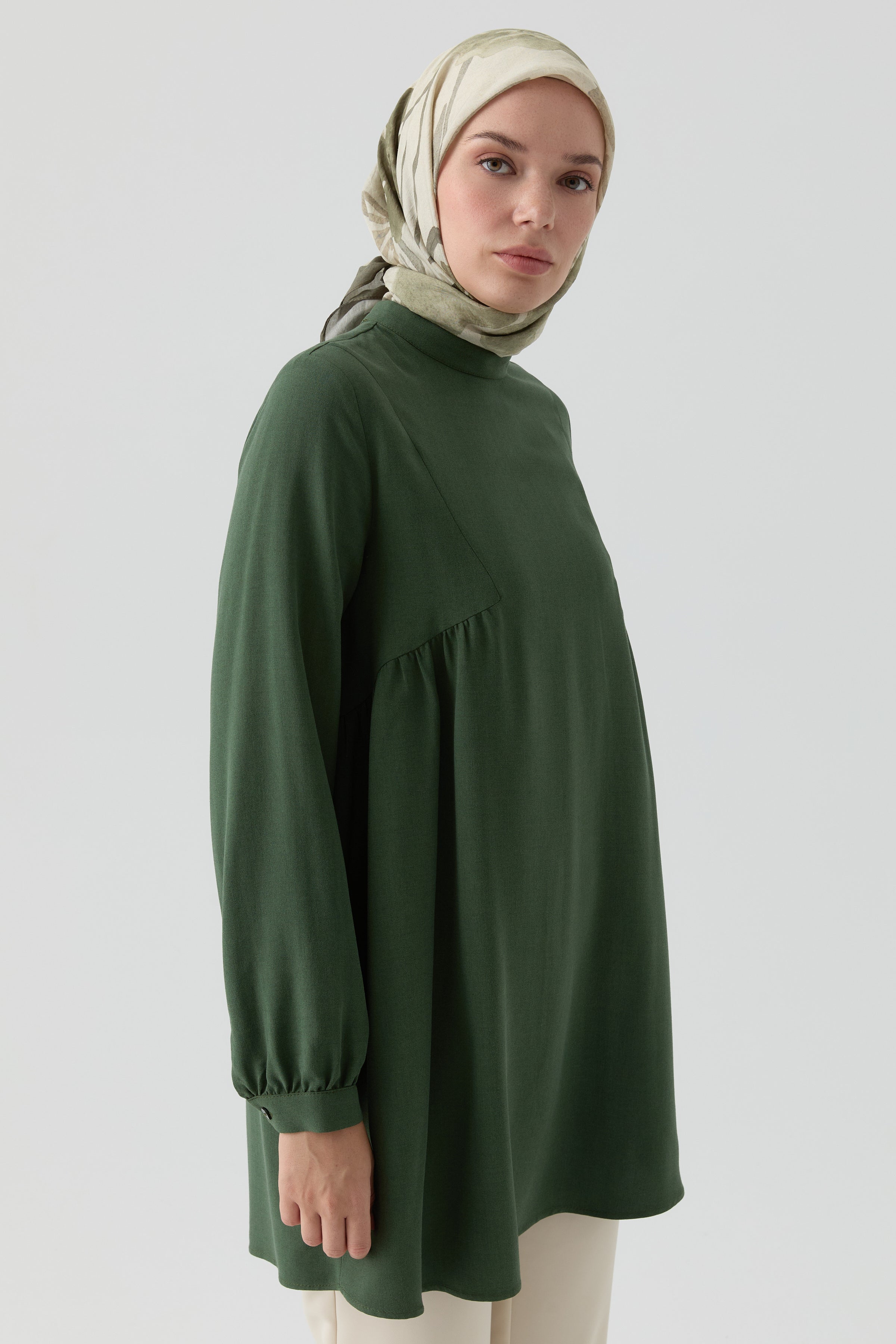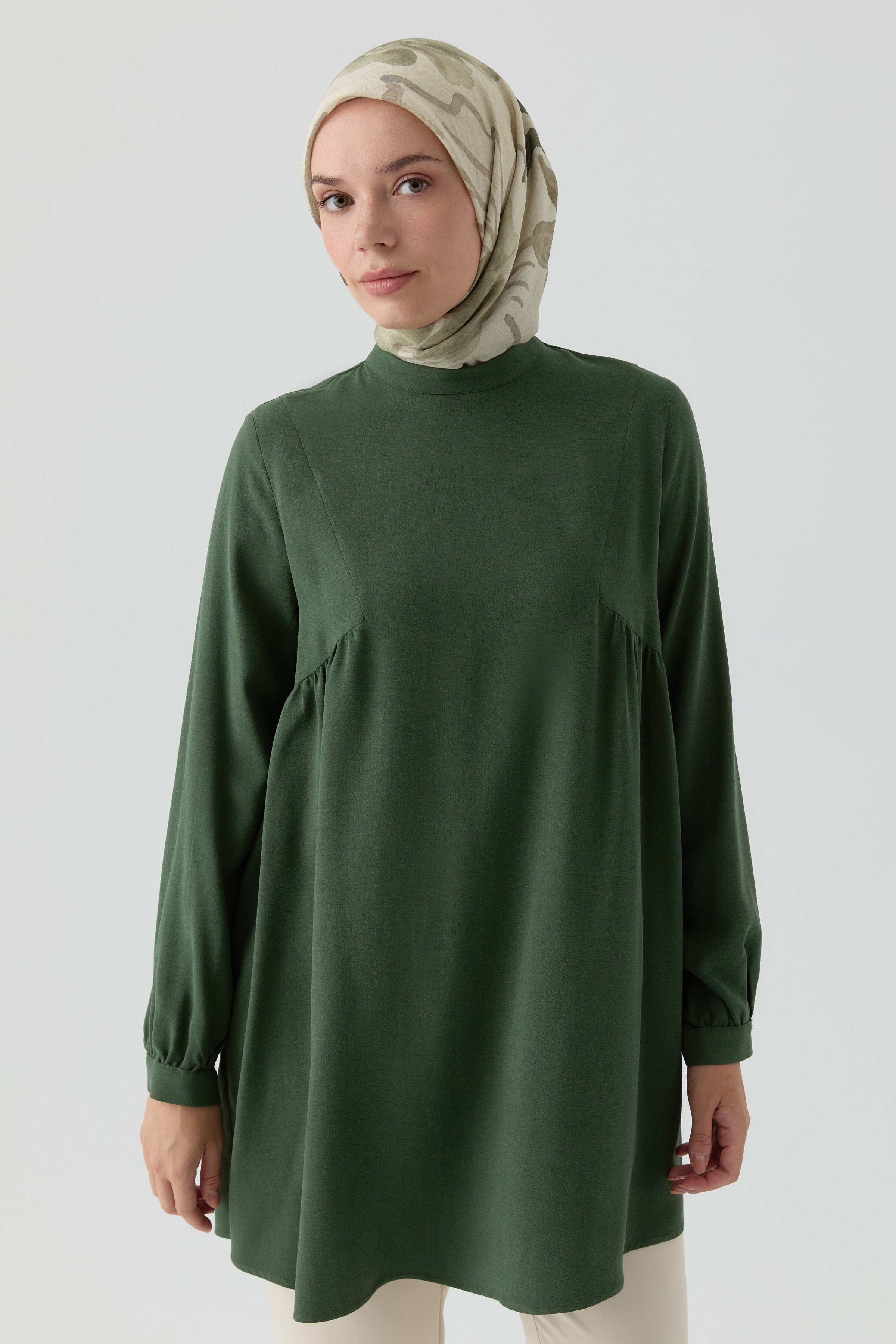 This tunic, highlighted by its drawstring waist, offers a modern and chic silhouette. Its relaxed fit ensures all-day comfort, while its elegant design lends itself to a wide range of uses, from everyday outfits to special occasions.