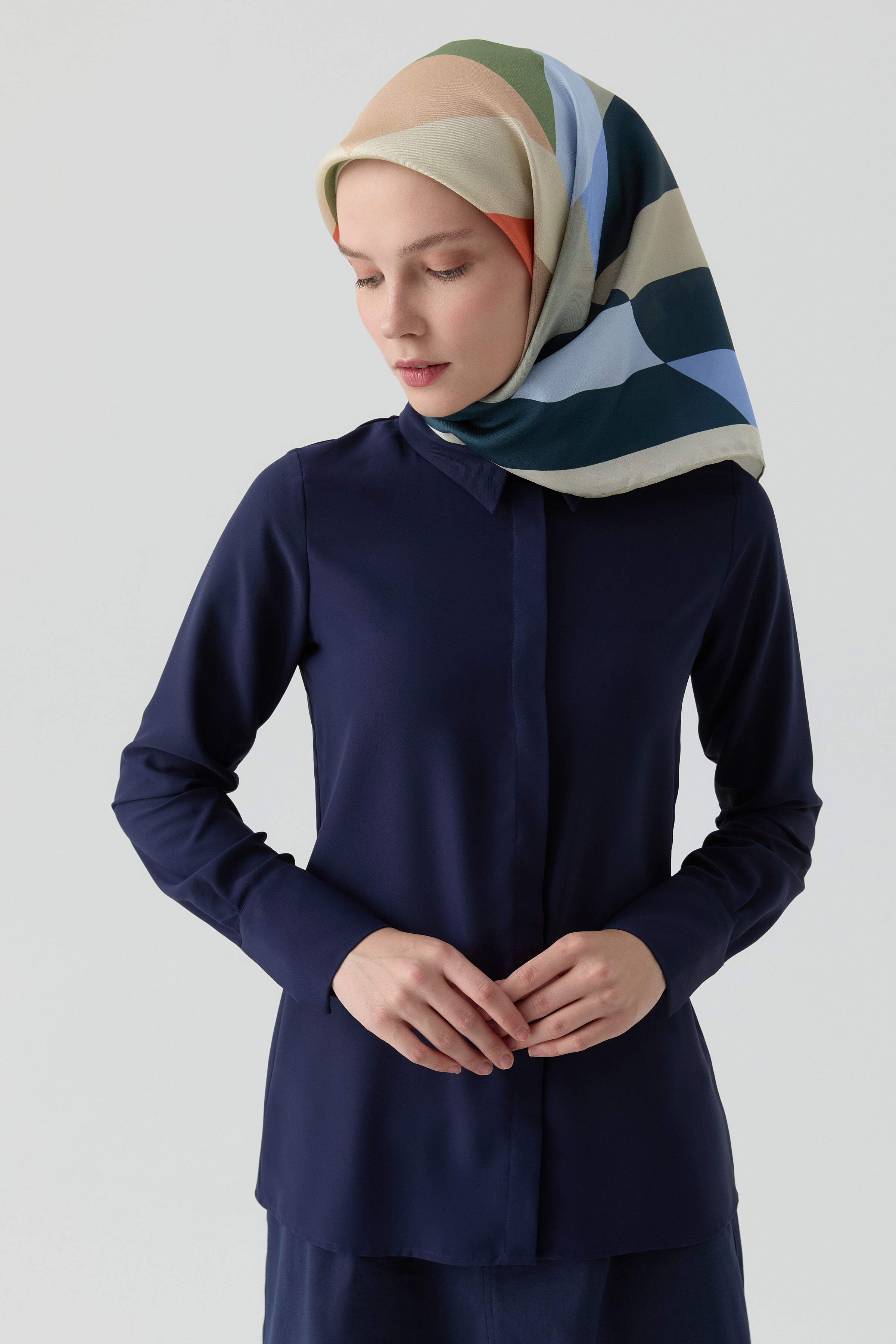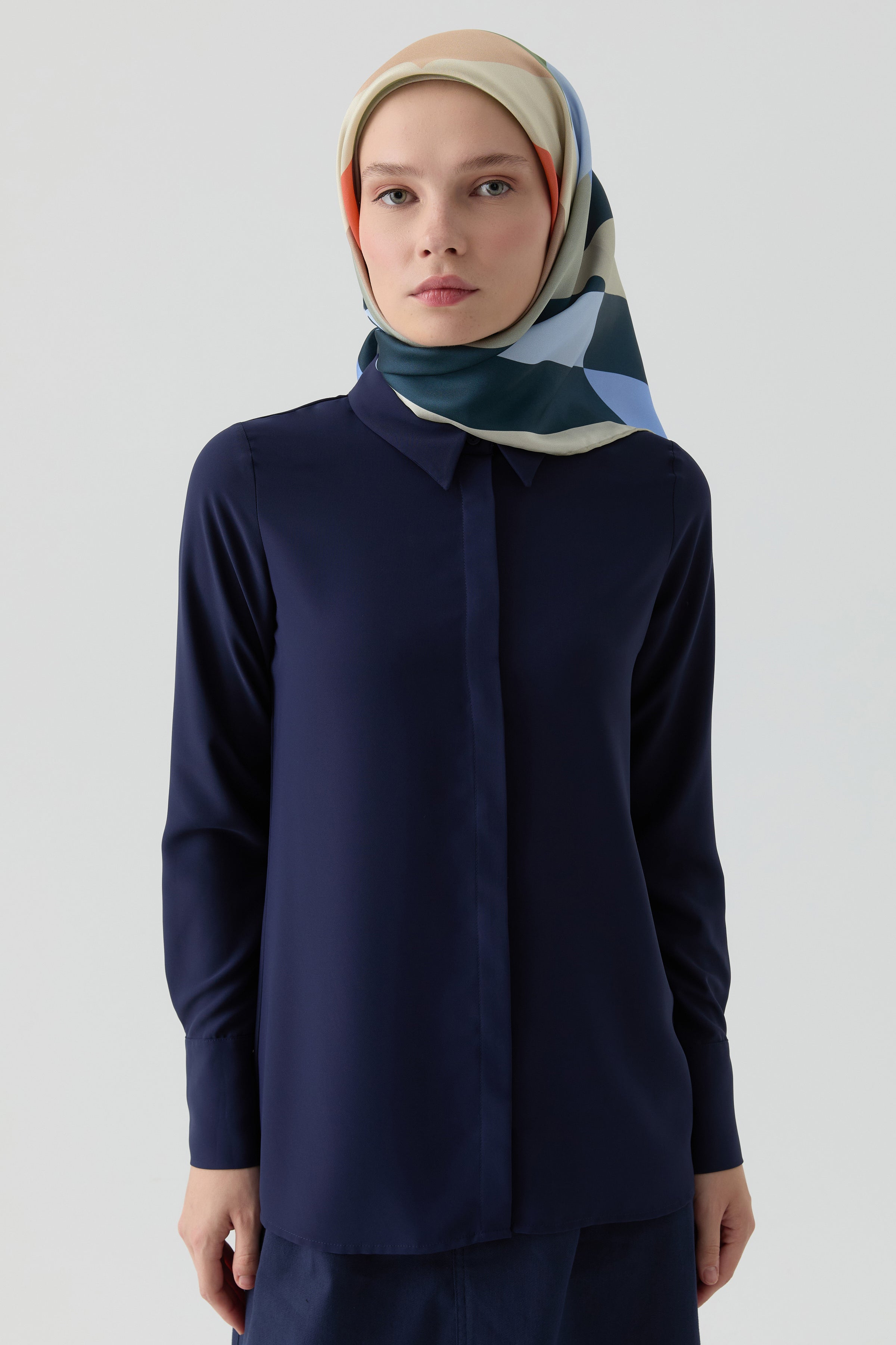 This basic, concealed-placket shirt complements any style with its simple design and elegance. Its modern cut elegantly highlights the figure's curves and is ideal for everyday wear with its comfort.