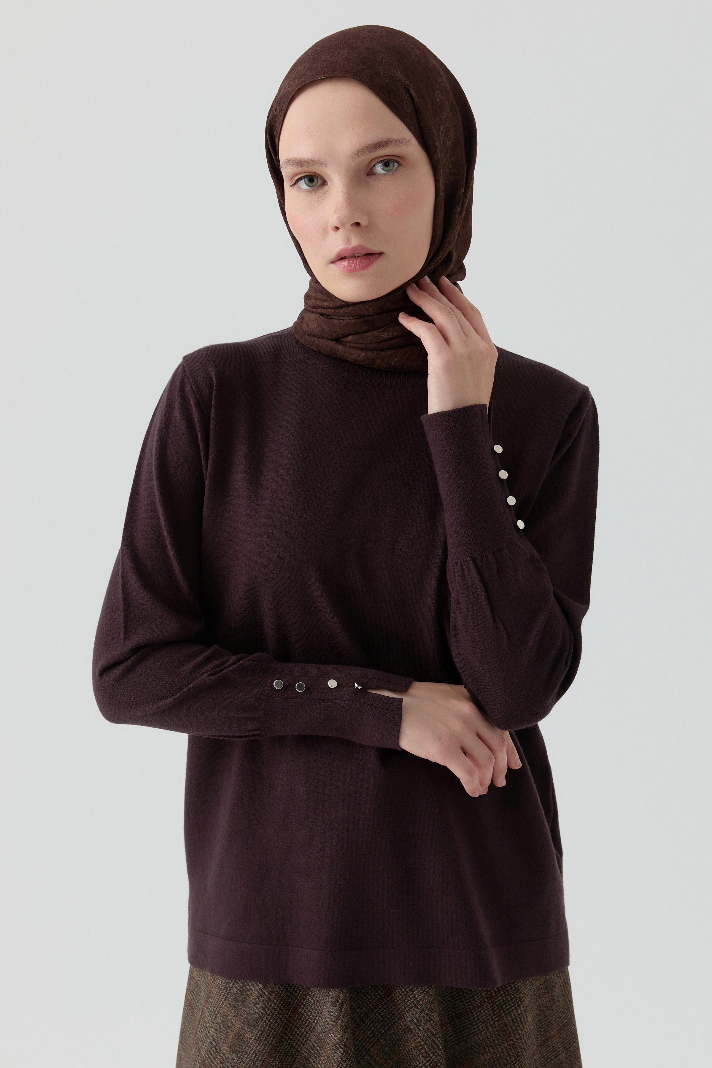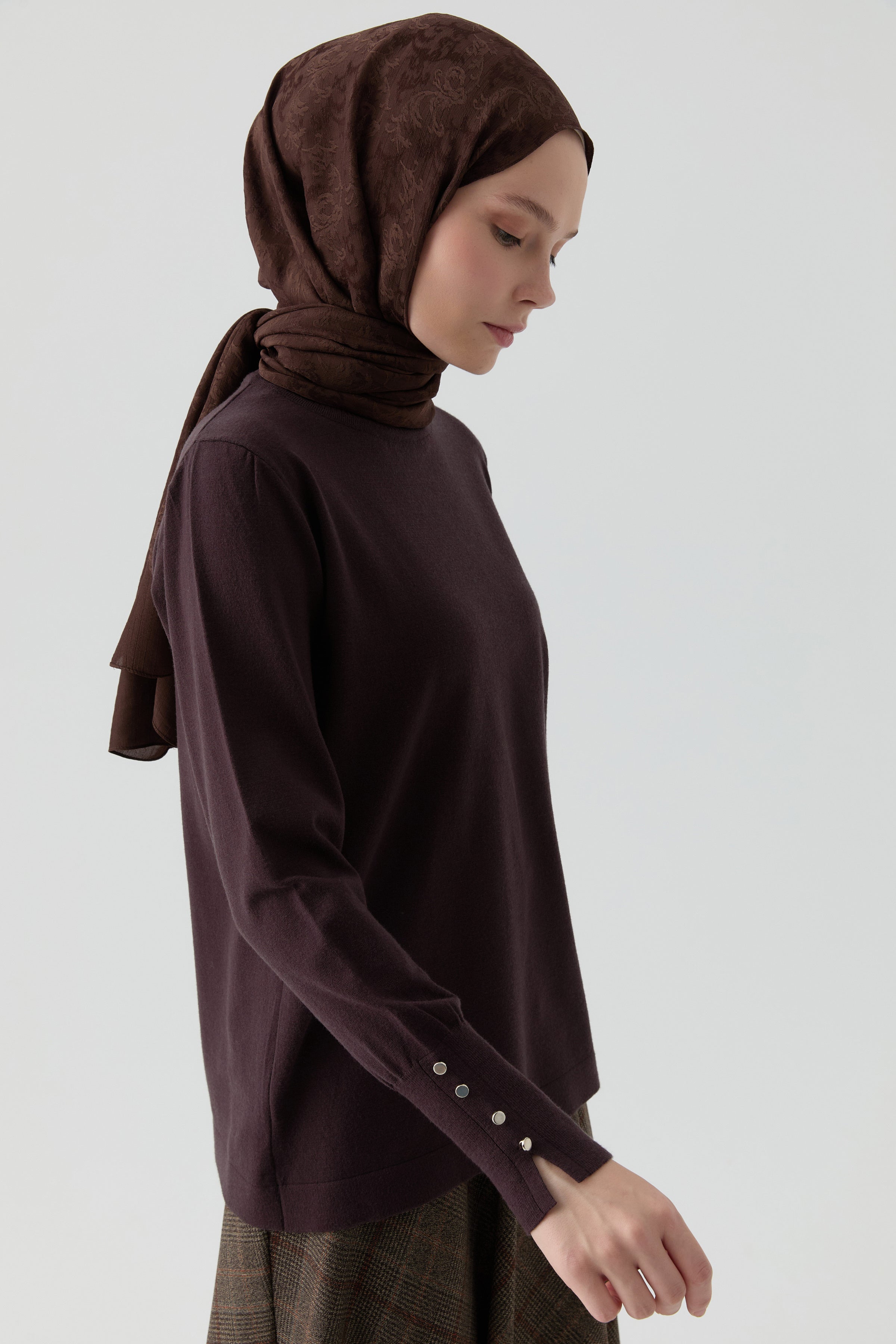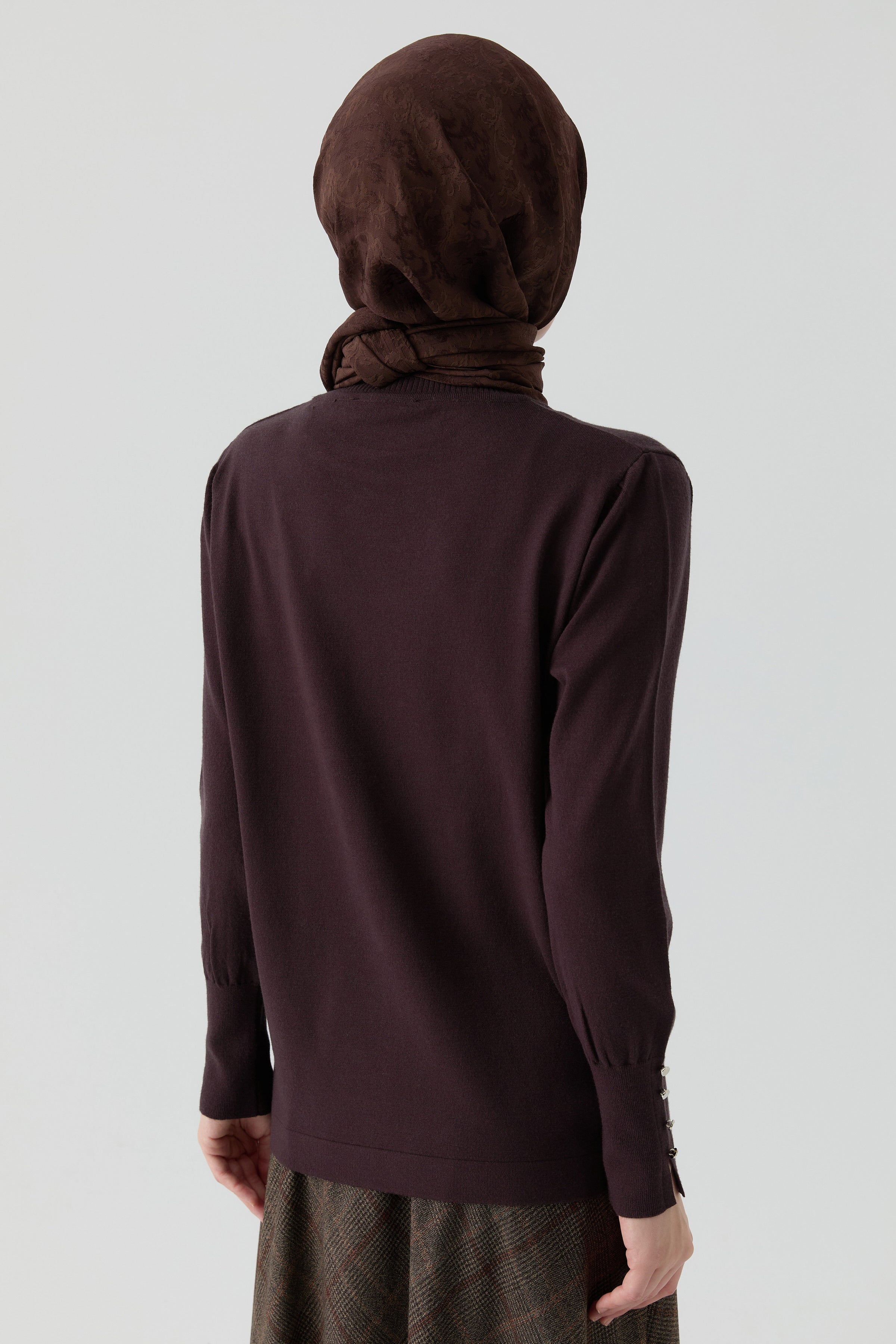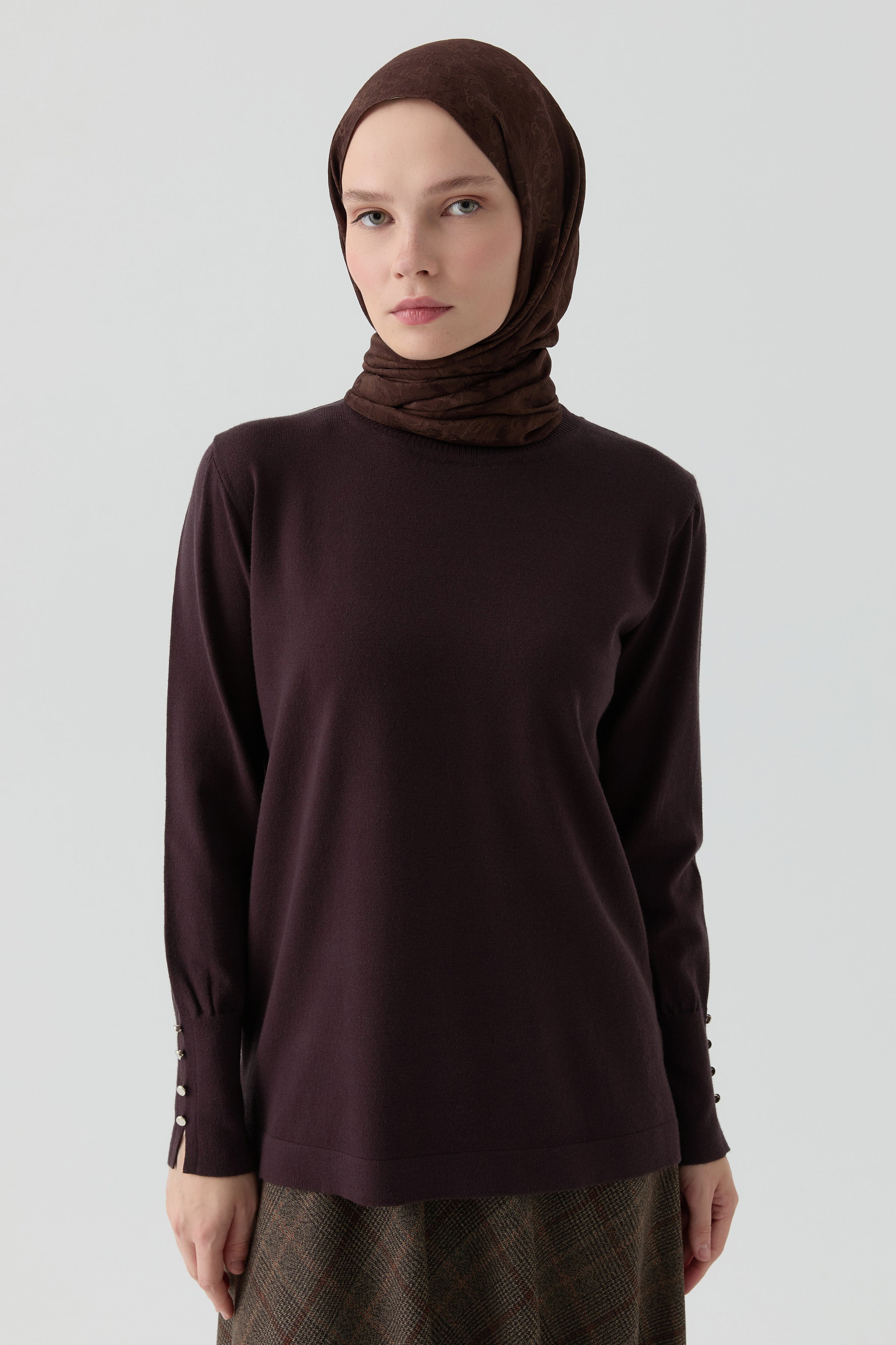 Sleeve Button Detailed Crew Neck Sweater - Brown