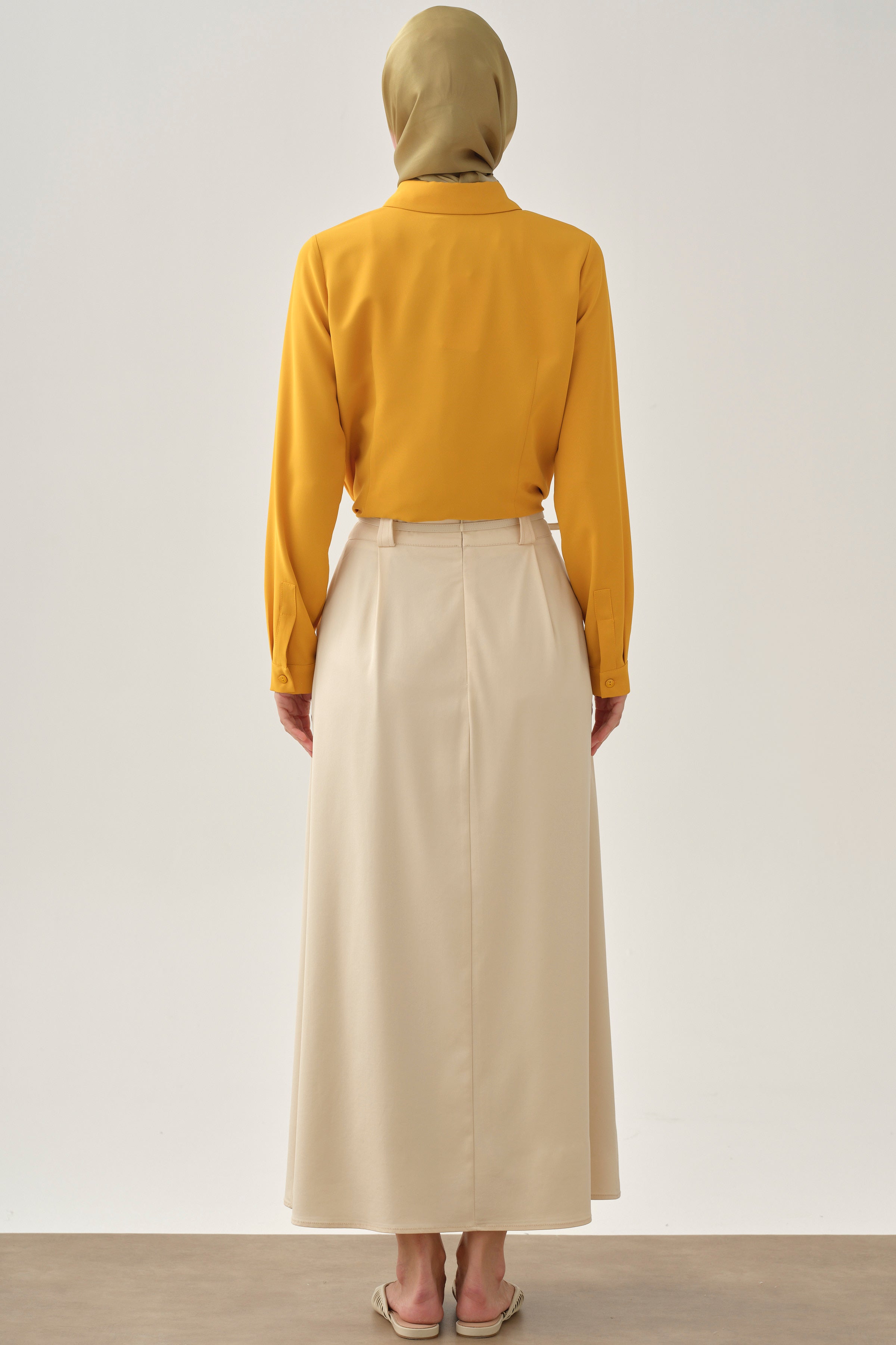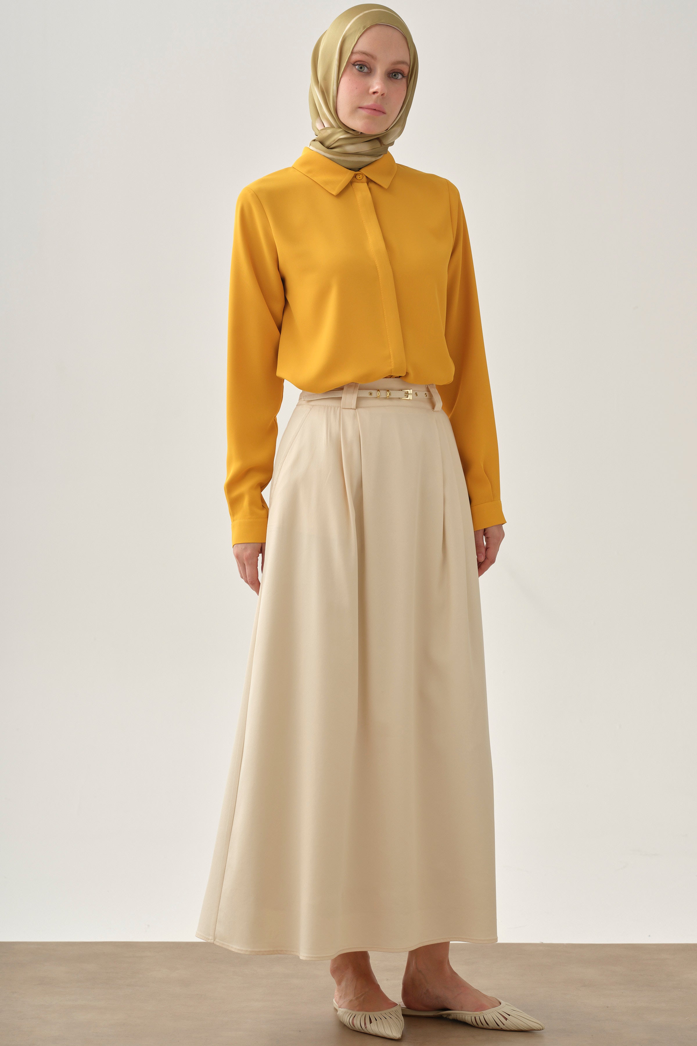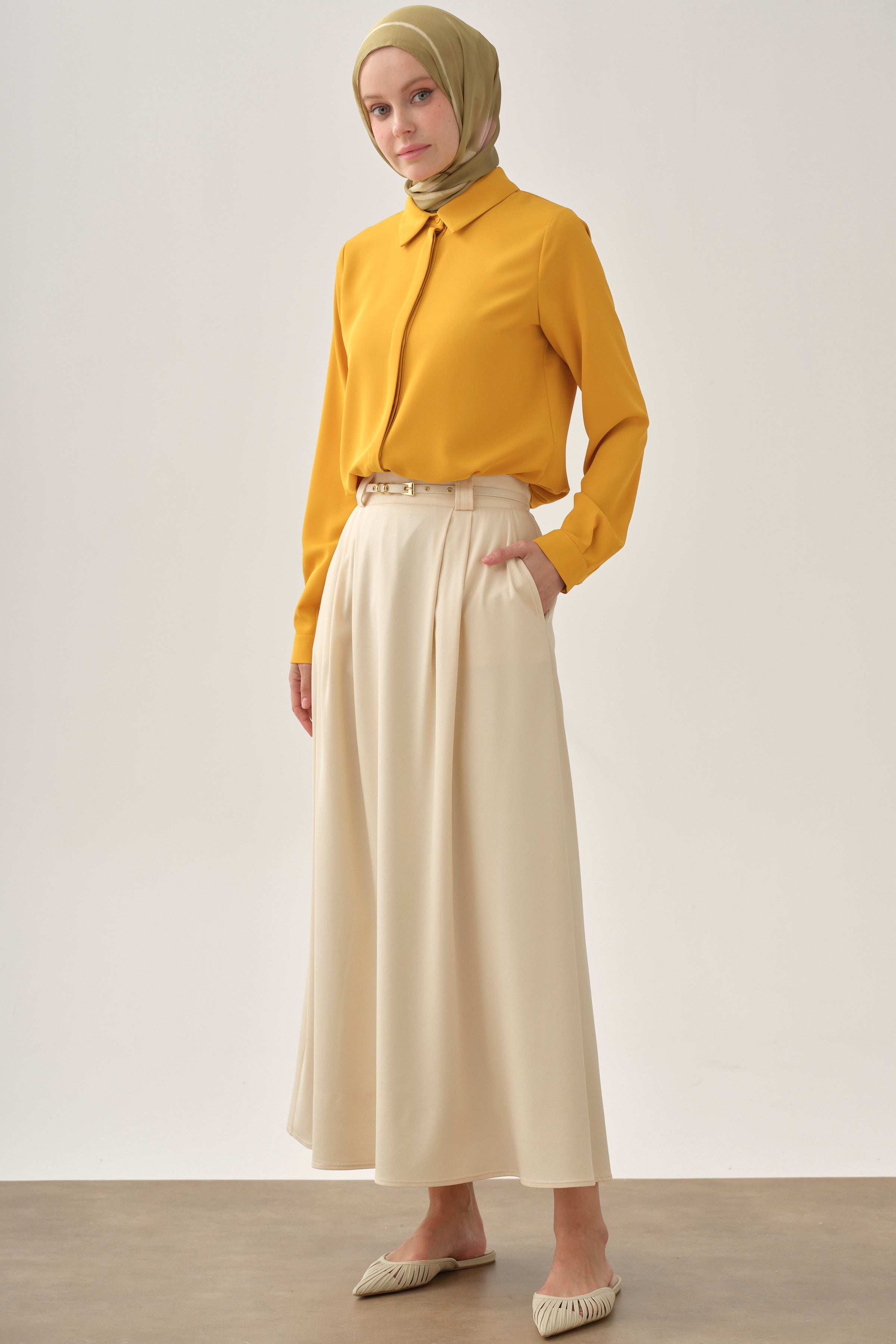 This skirt, which gains movement with its elegant pleat details, offers a feminine stance with its thin belt. It provides comfort all day long with its lightweight structure. It fits both classic and modern combinations.