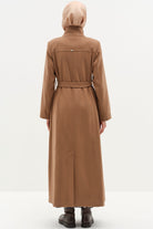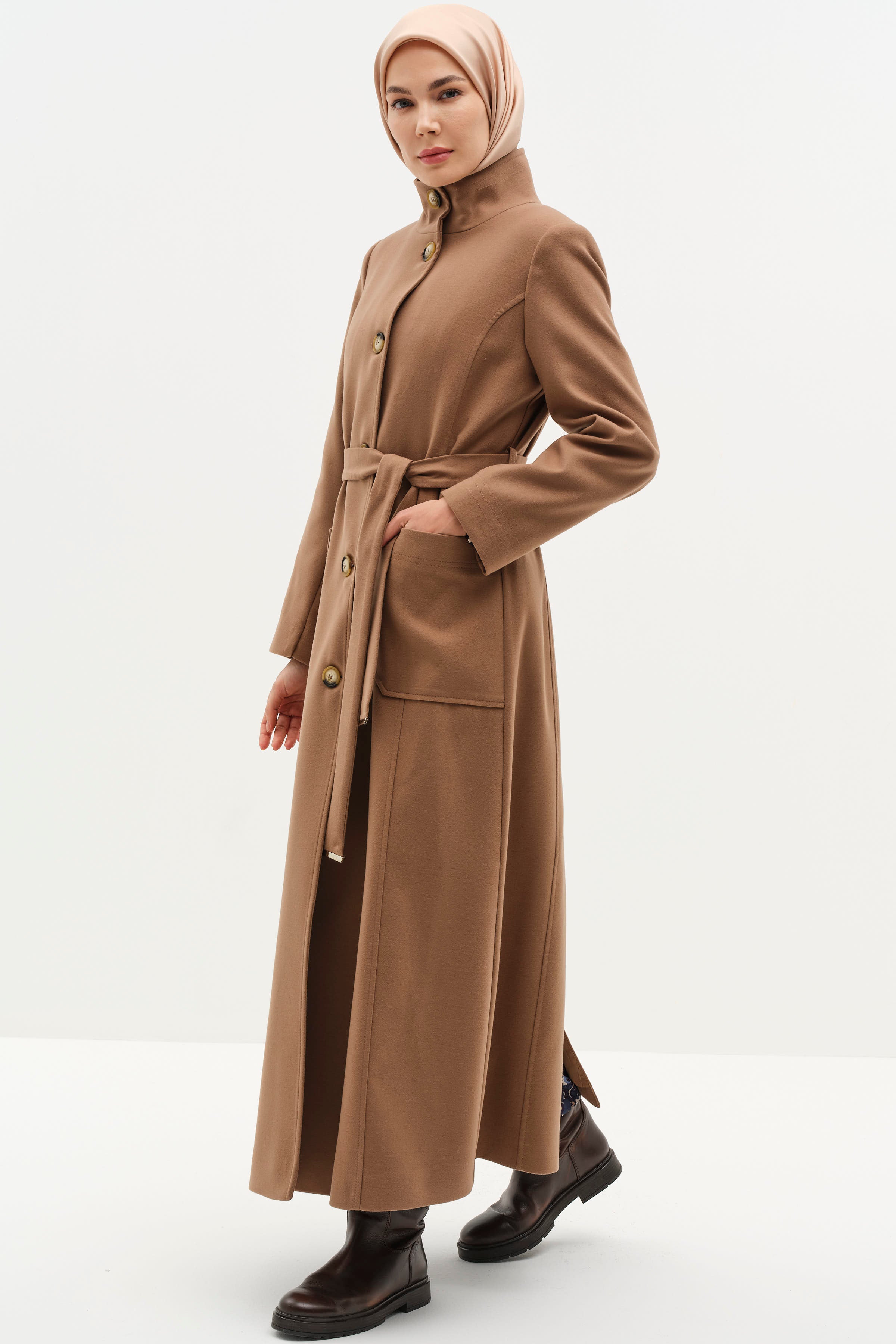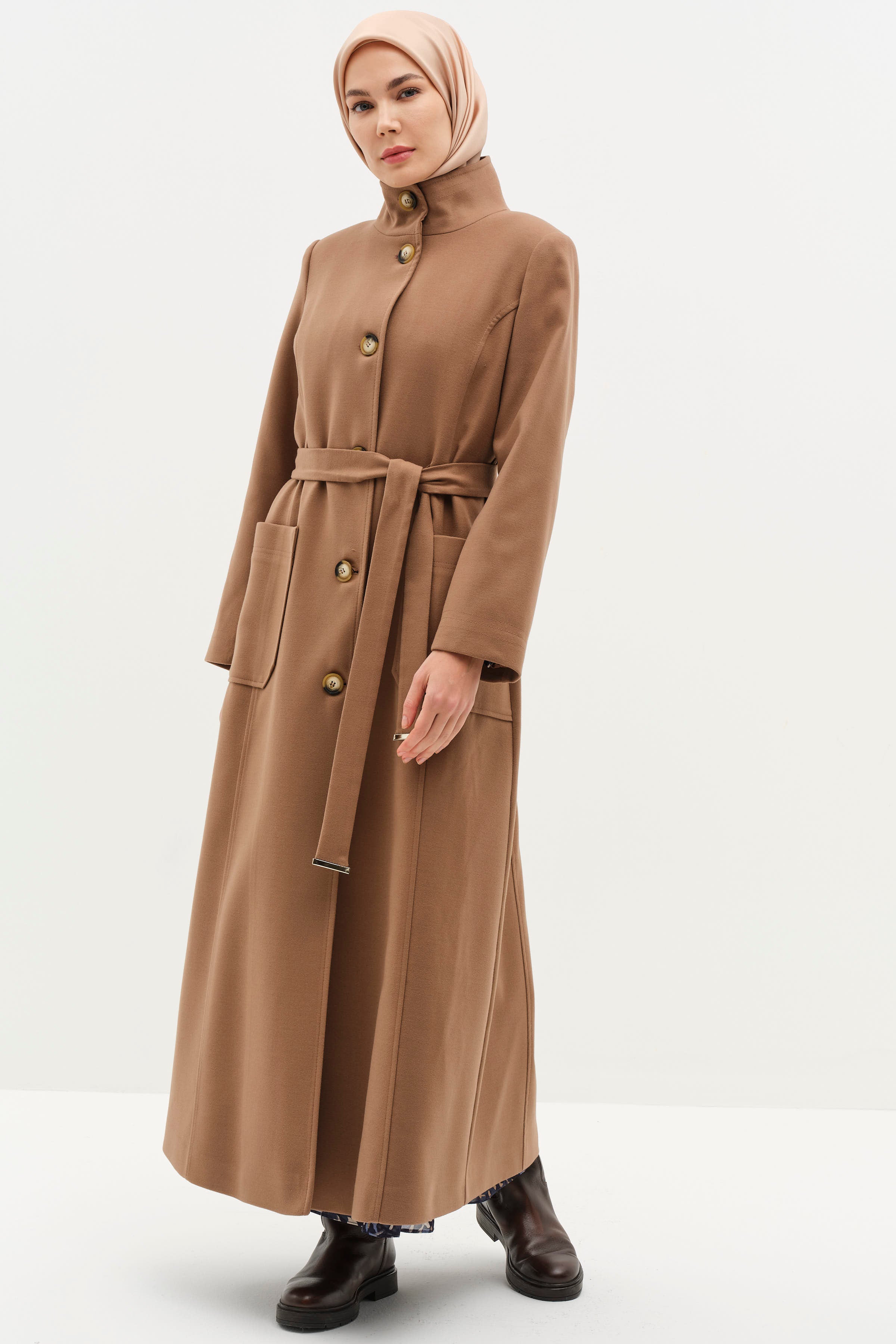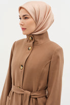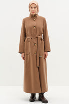 Stand Collar Waist Belted Coat - Camel