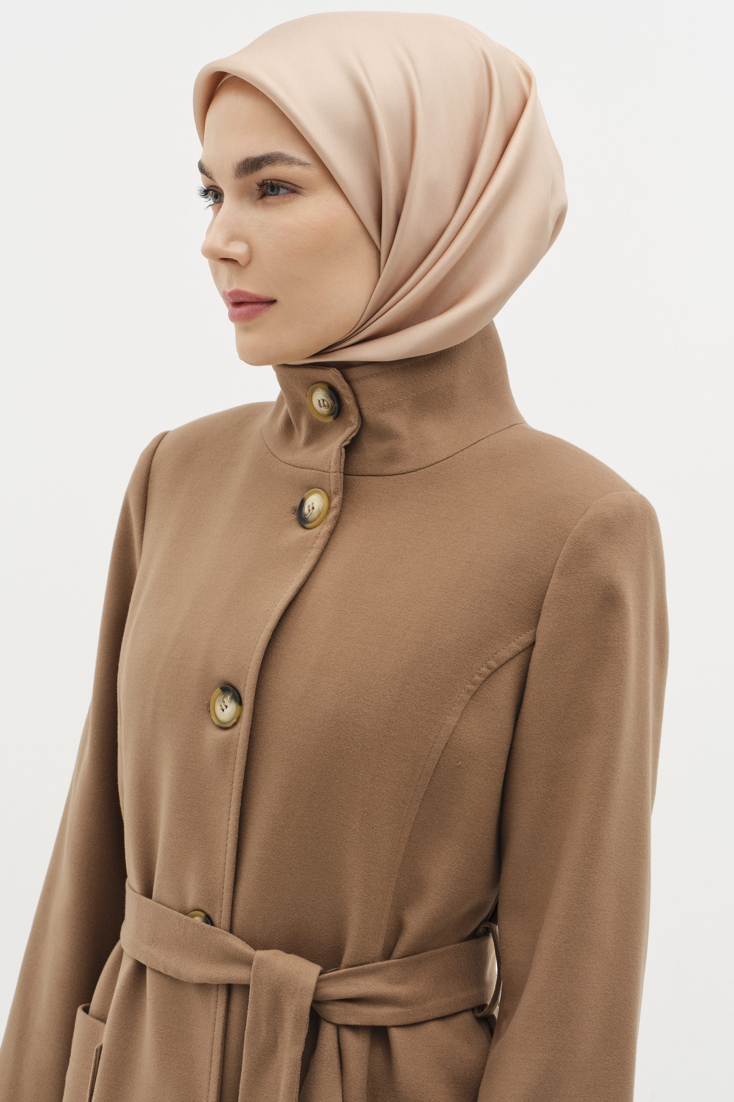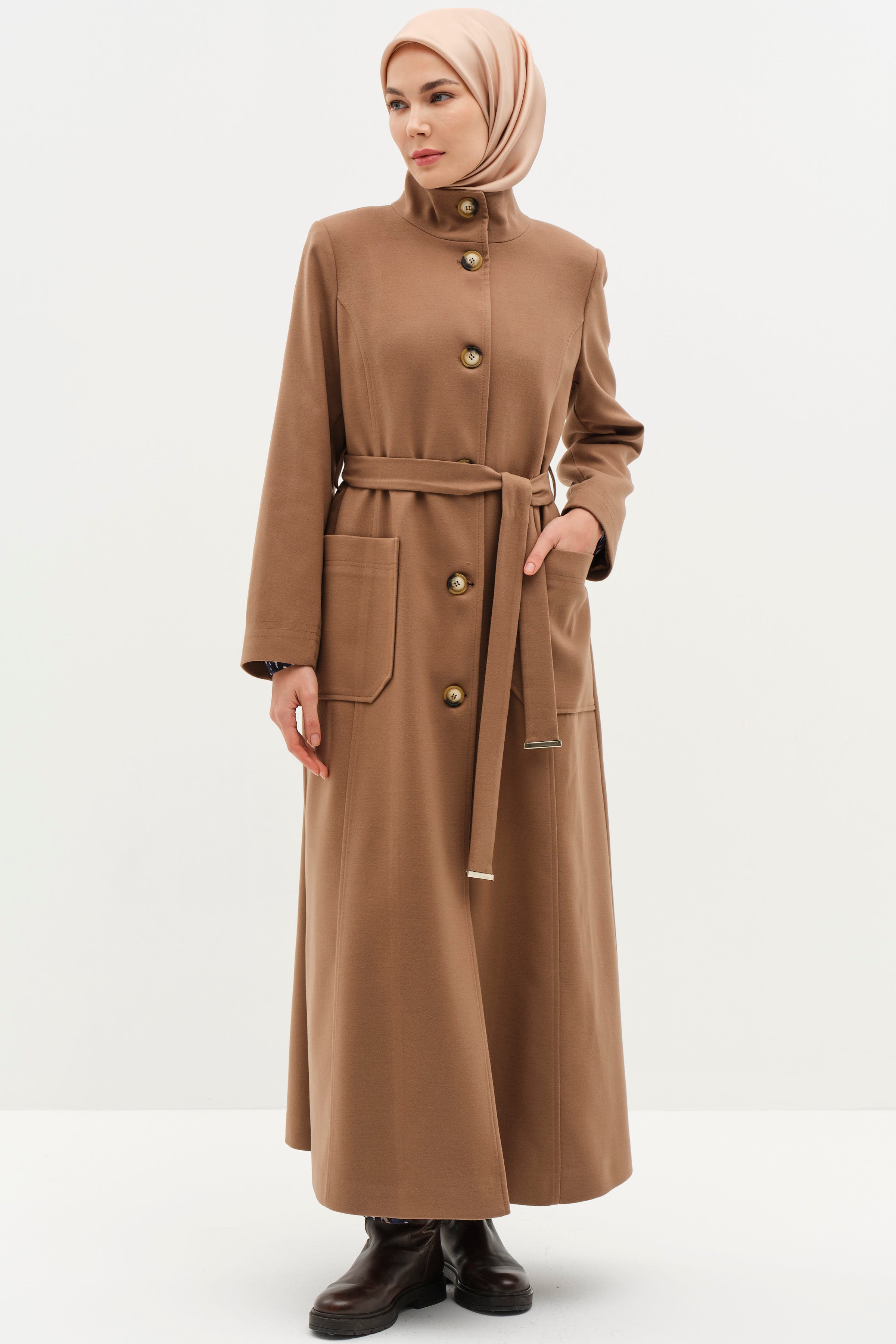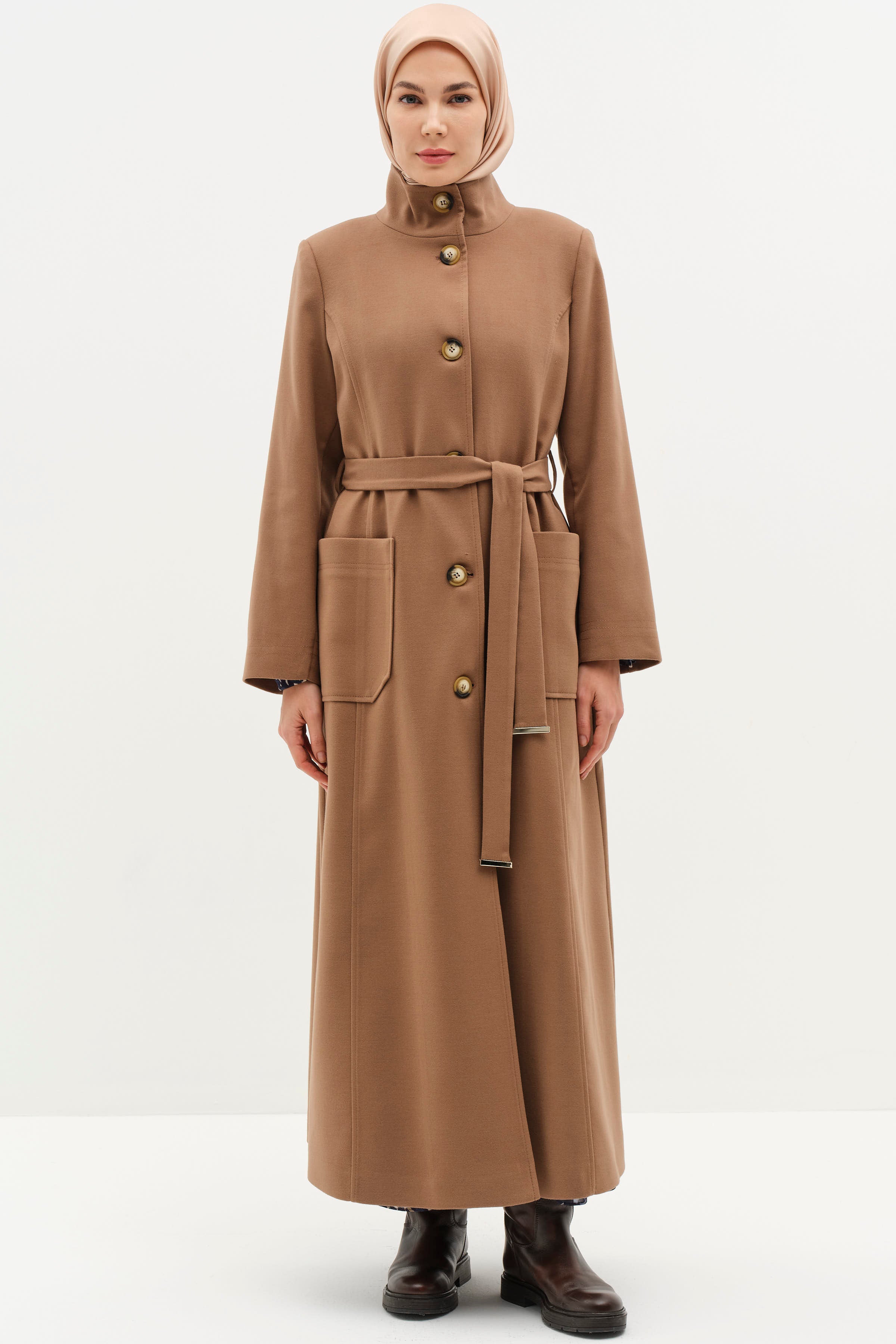 Featuring a high collar and belted waist, this coat offers an elegant silhouette, combining style and functionality. The belted design accentuates your figure, while the high collar adds a modern and sophisticated touch.