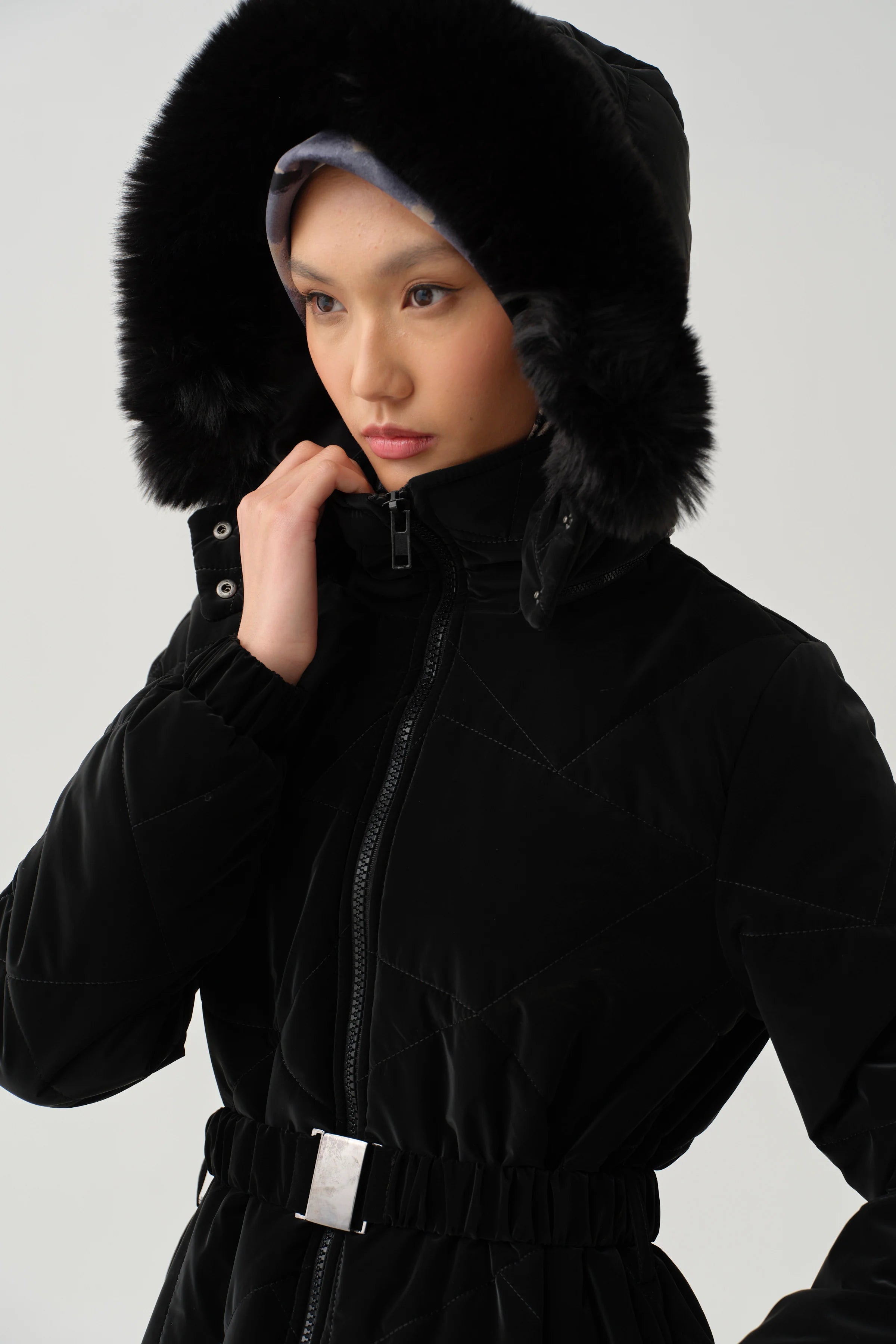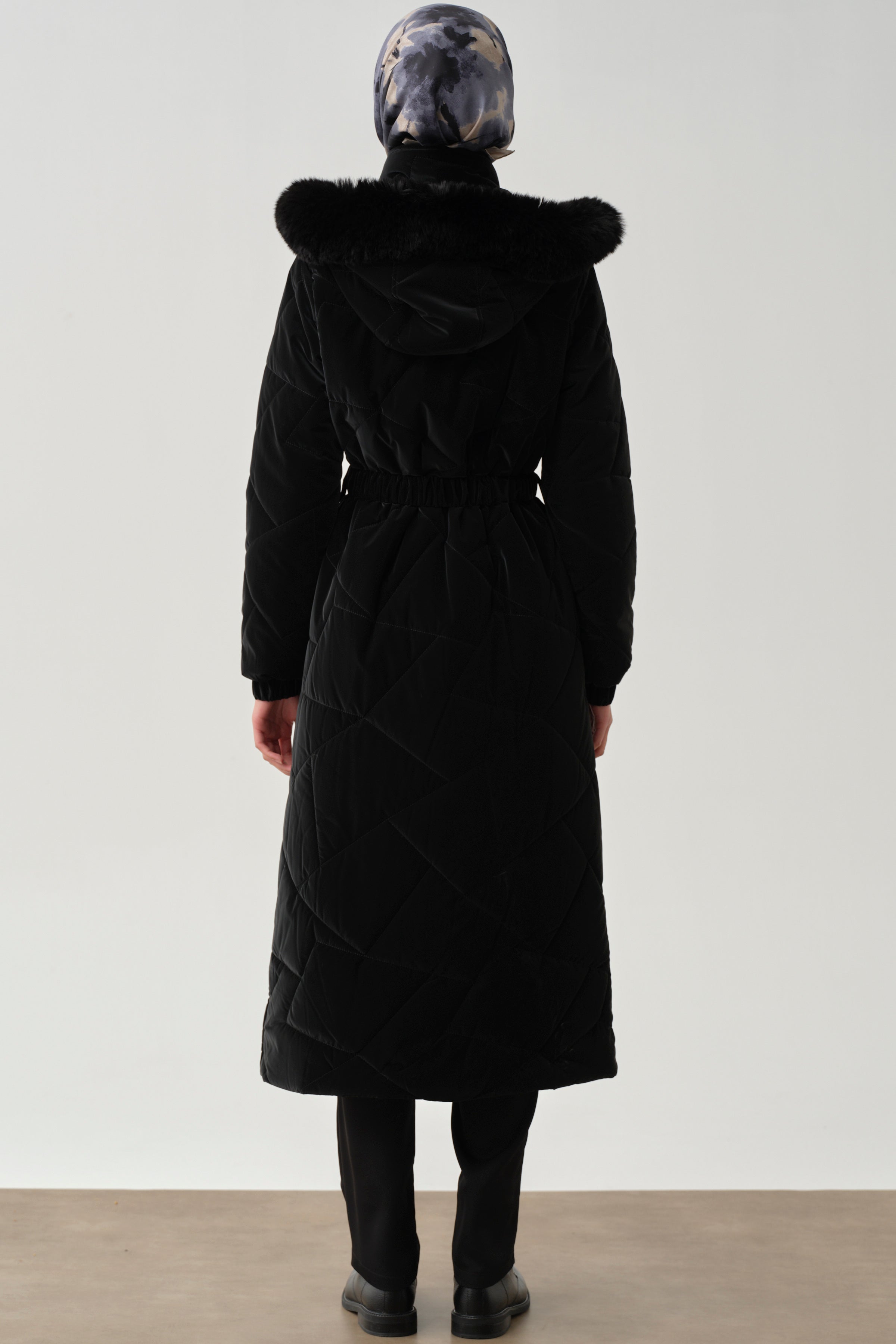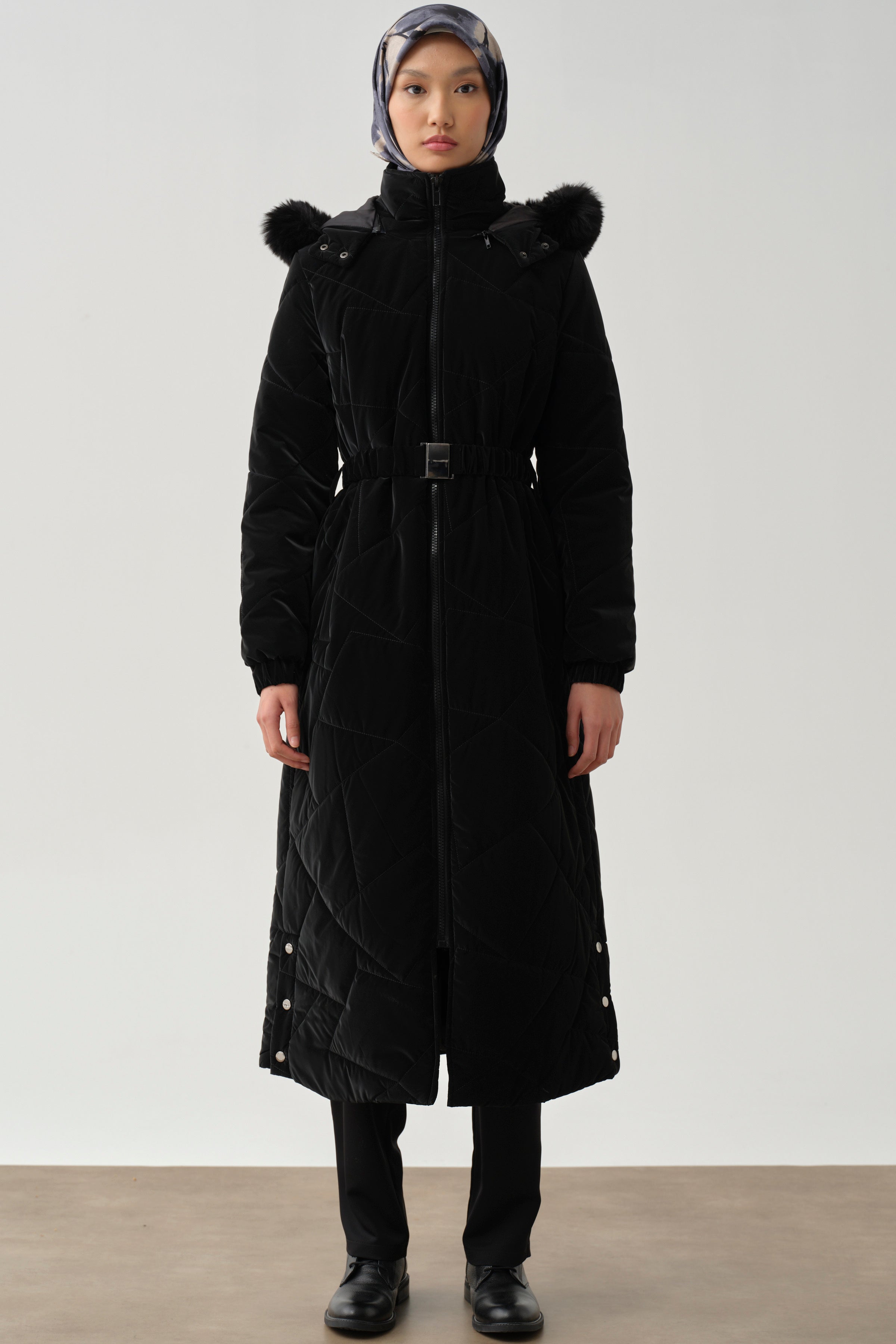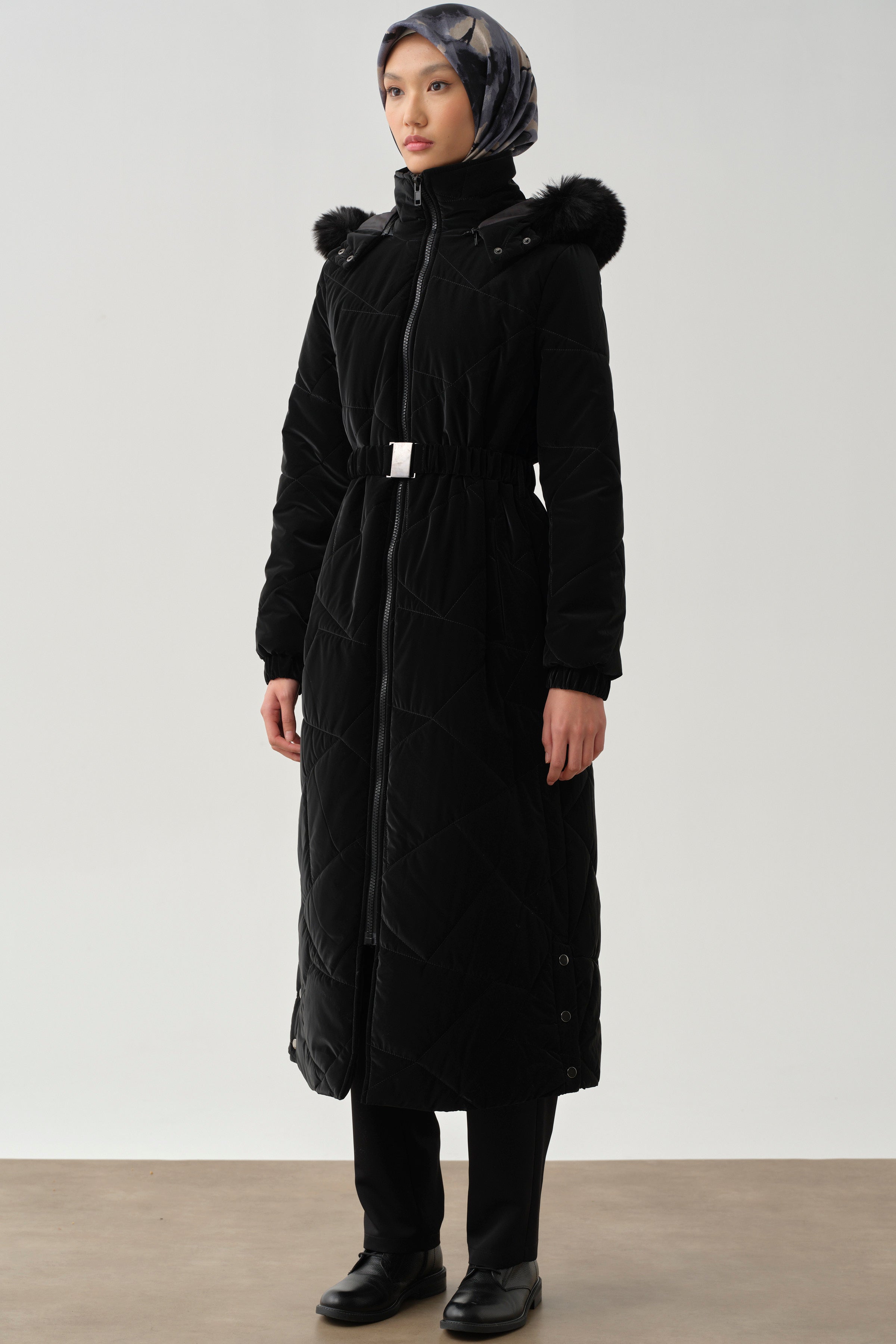 This quilted coat, with its slit details and enhanced functionality with its hood, offers a modern and stylish look. Its lightweight construction and warm texture make it both comfortable and stylish on cold days.