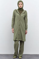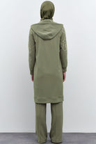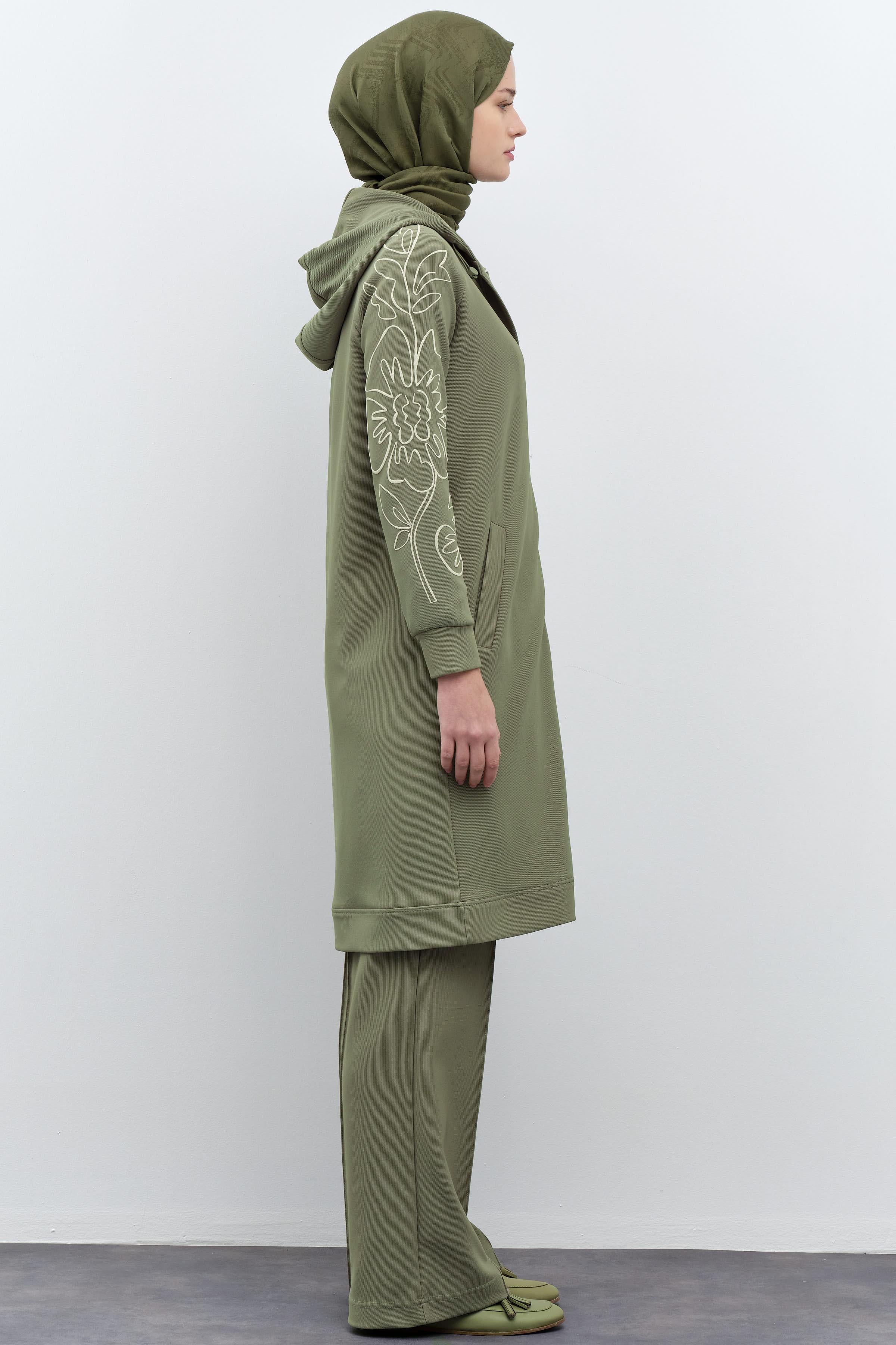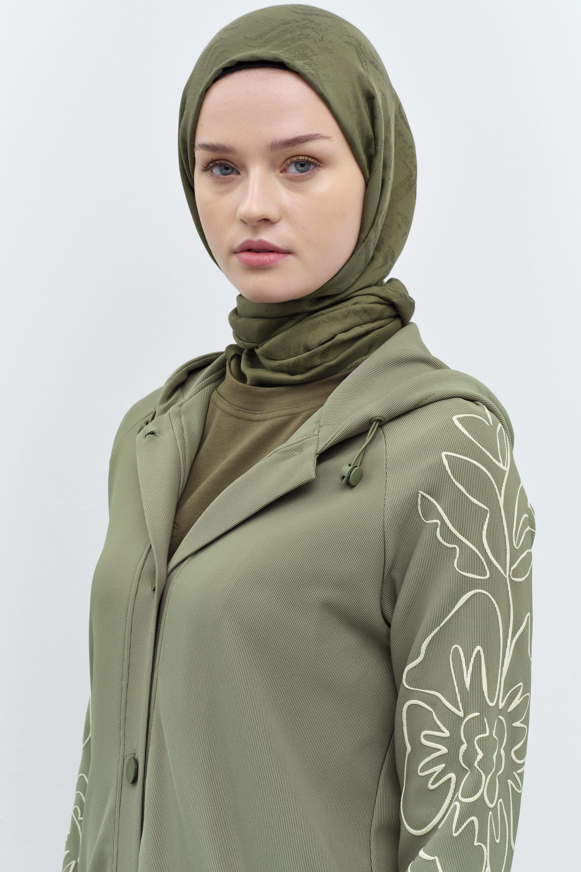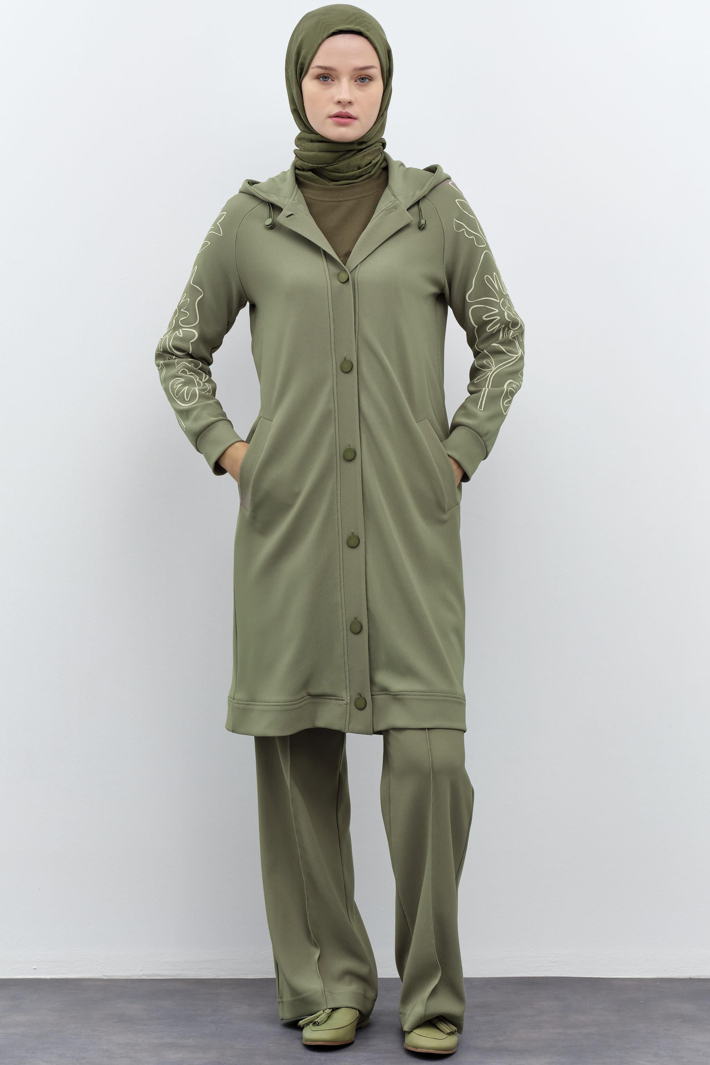The knitted coat with printed sleeves complements its simple design with eye-catching sleeve prints. Its lightweight and comfortable knit texture offers everyday elegance, while the pattern details add a modern touch.