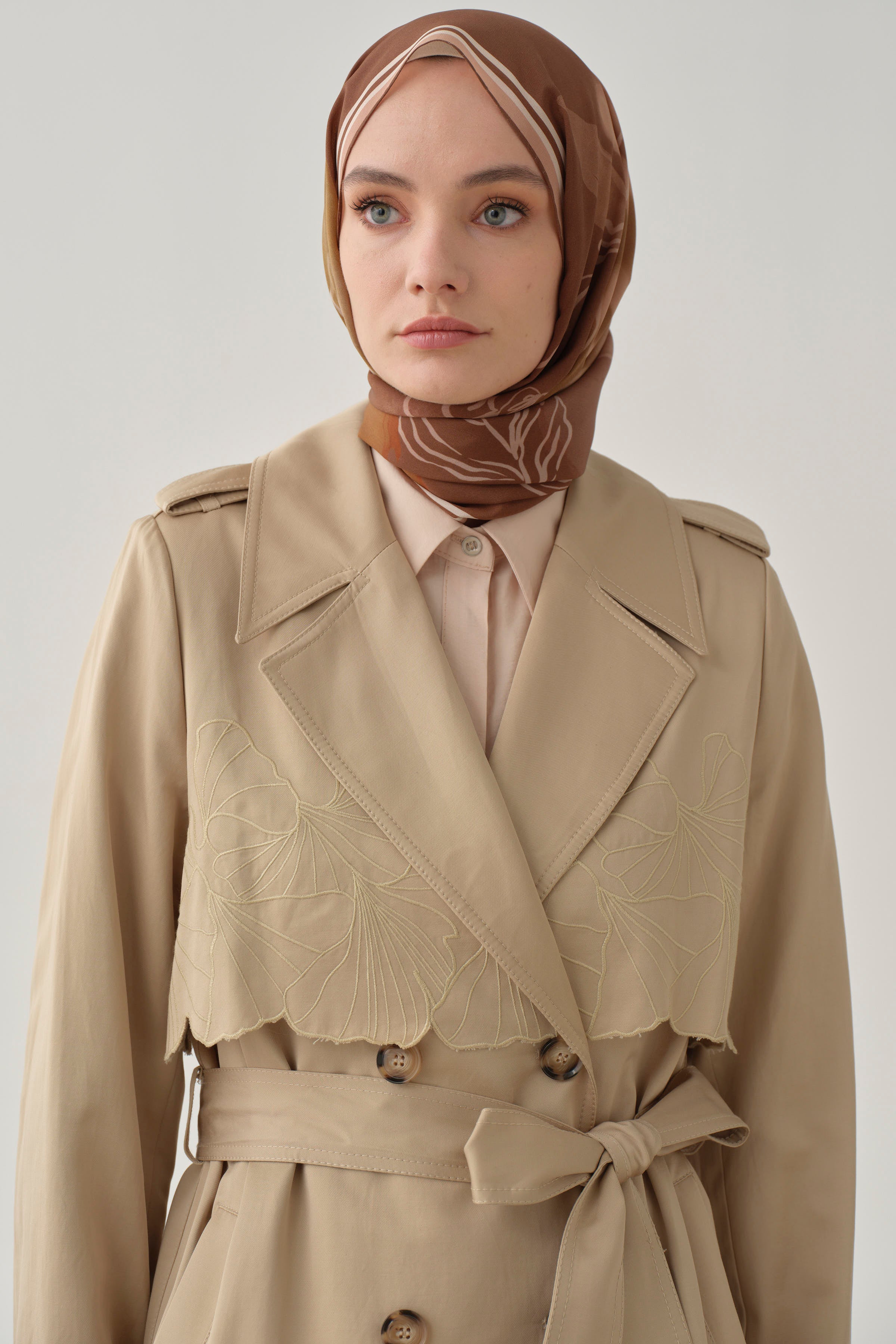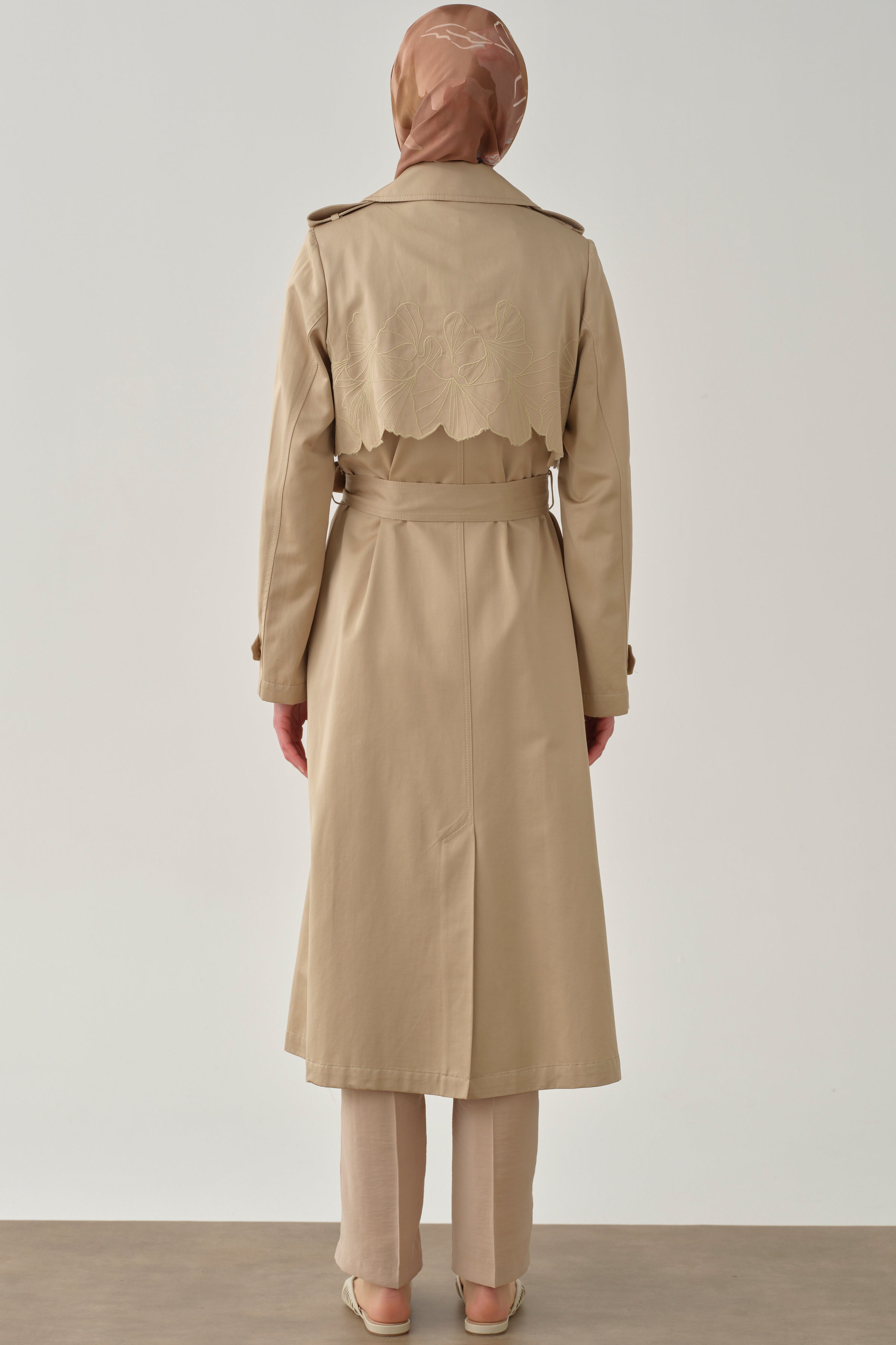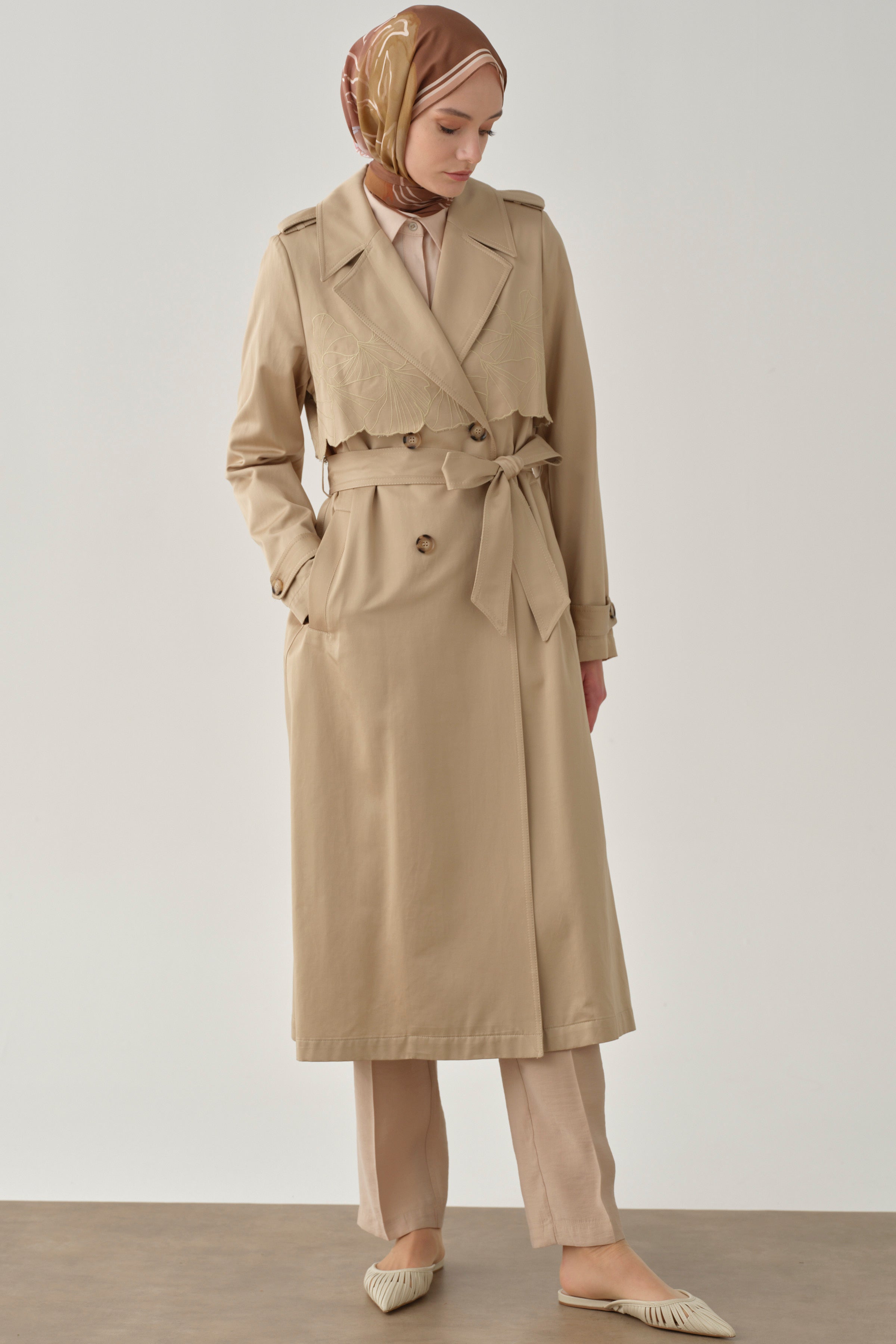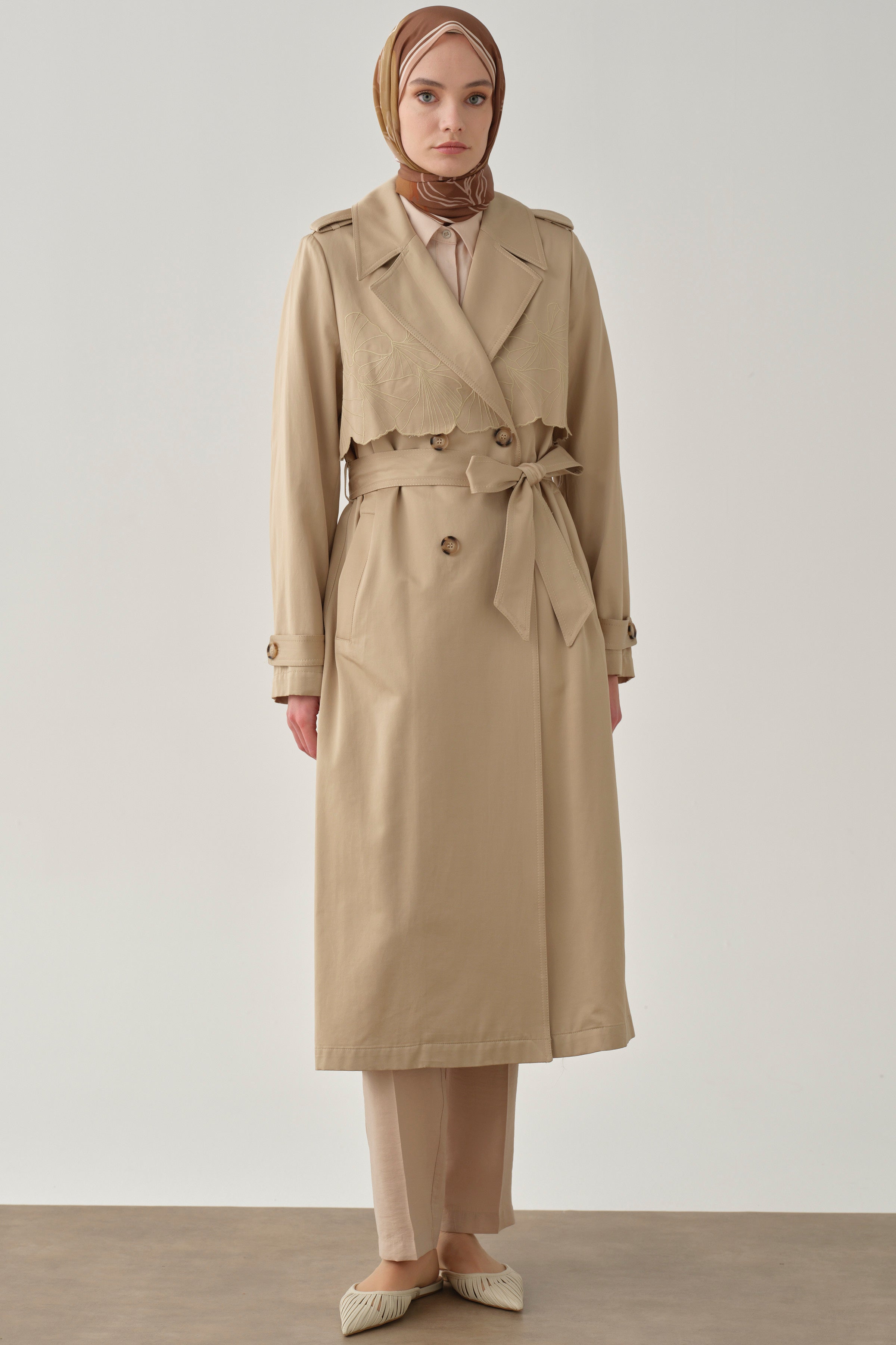 Featuring elegant embroidery and a stylish windbreaker detail, this trench coat blends classic design with modern touches. Its lightweight and flowing structure ensures comfortable wear, while the embroidery details add a sophisticated touch.