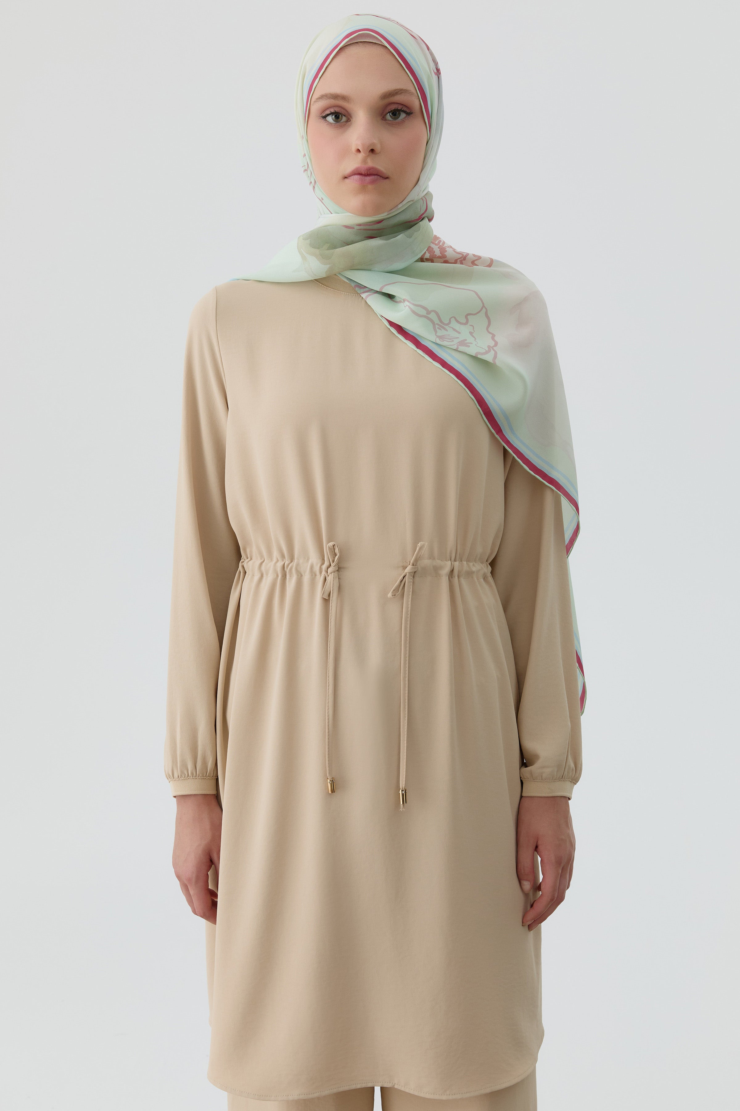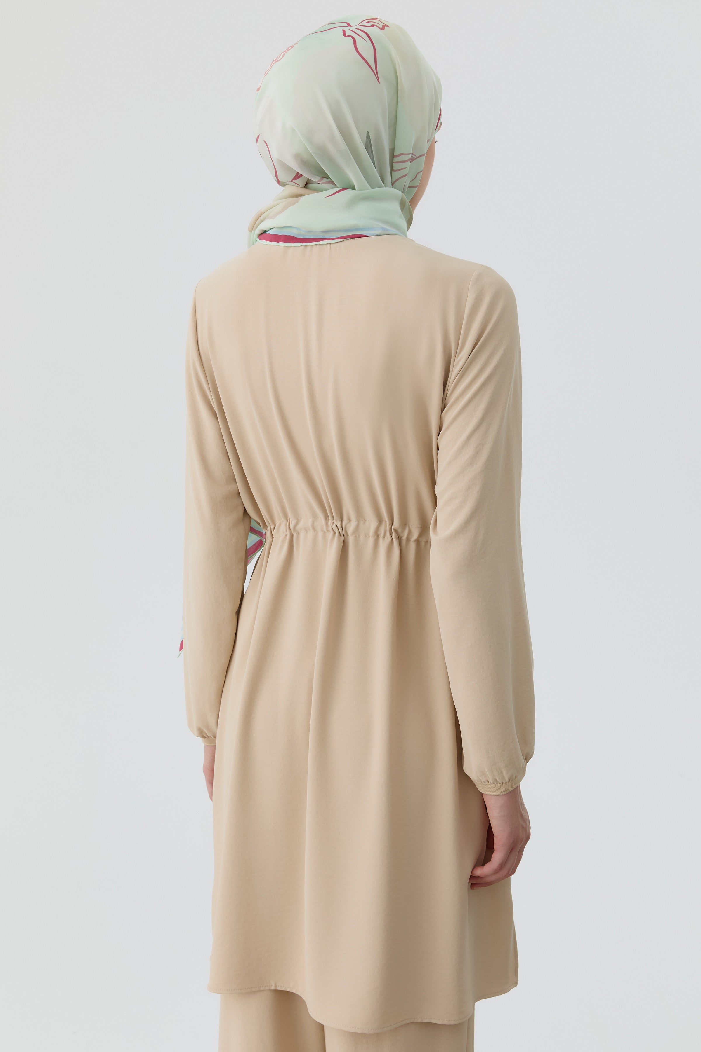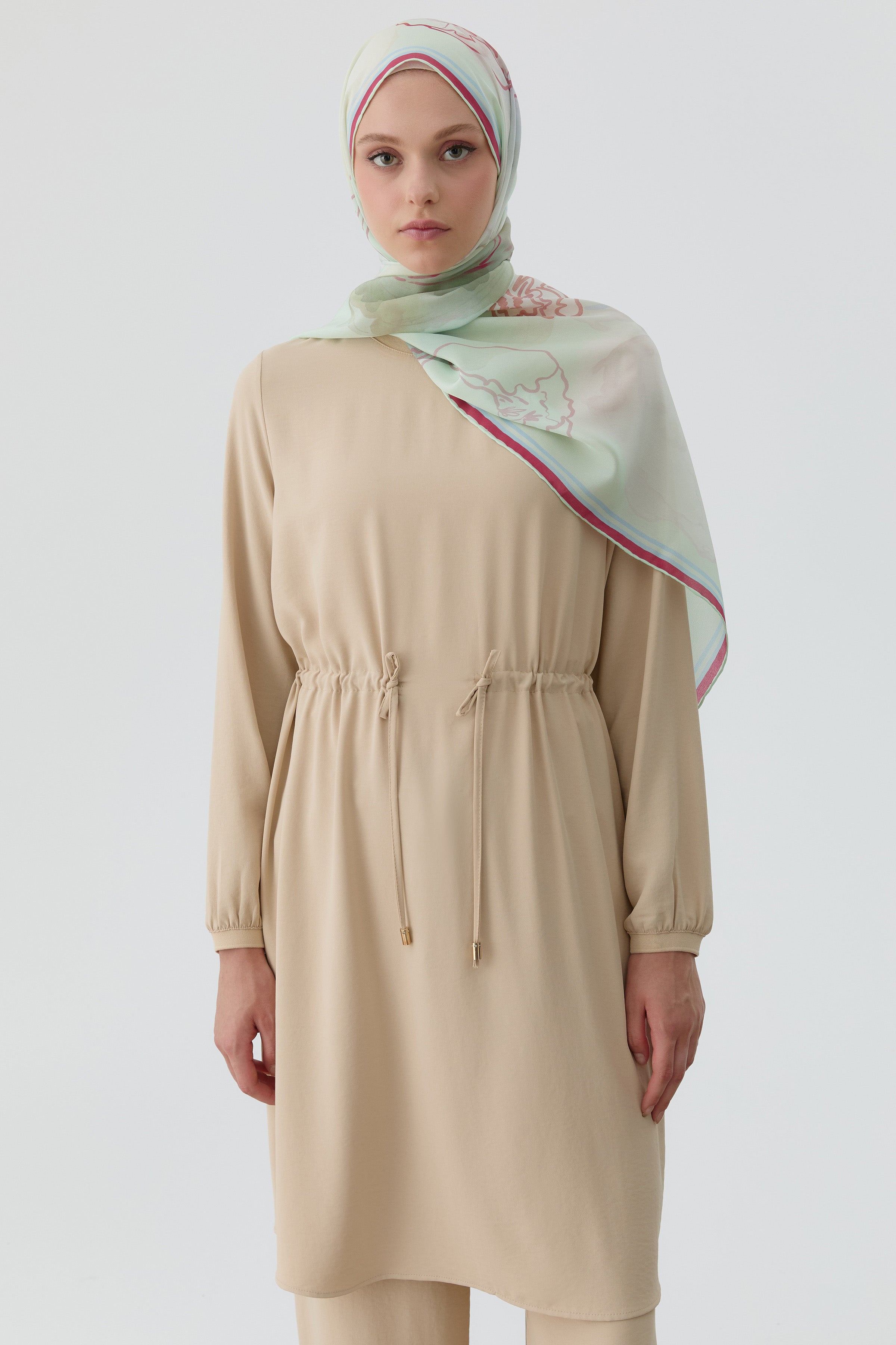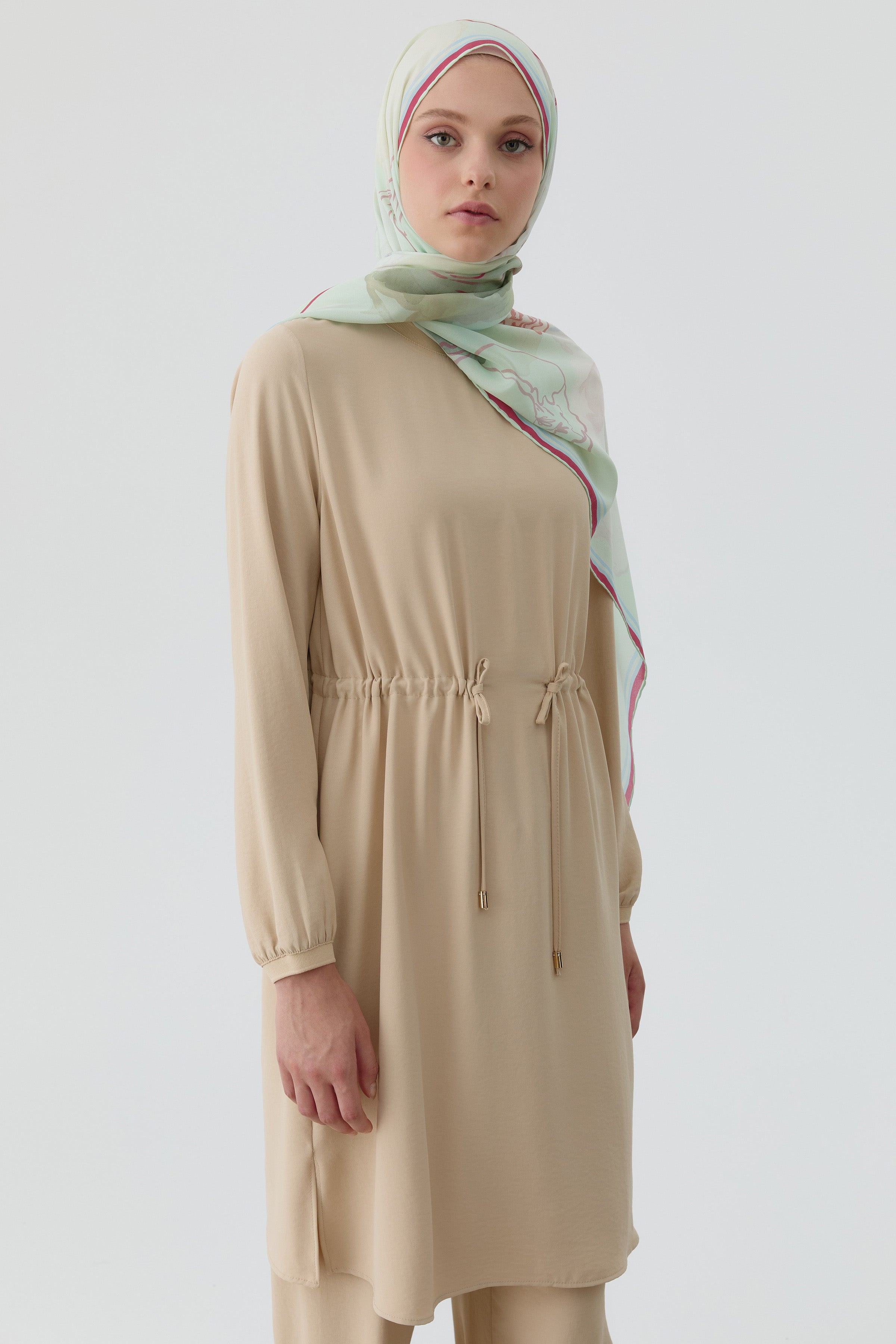 This tunic provides comfort in daily use with its soft fabric and rib details, and offers an adjustable shape according to the body with the lace detail at the waist.