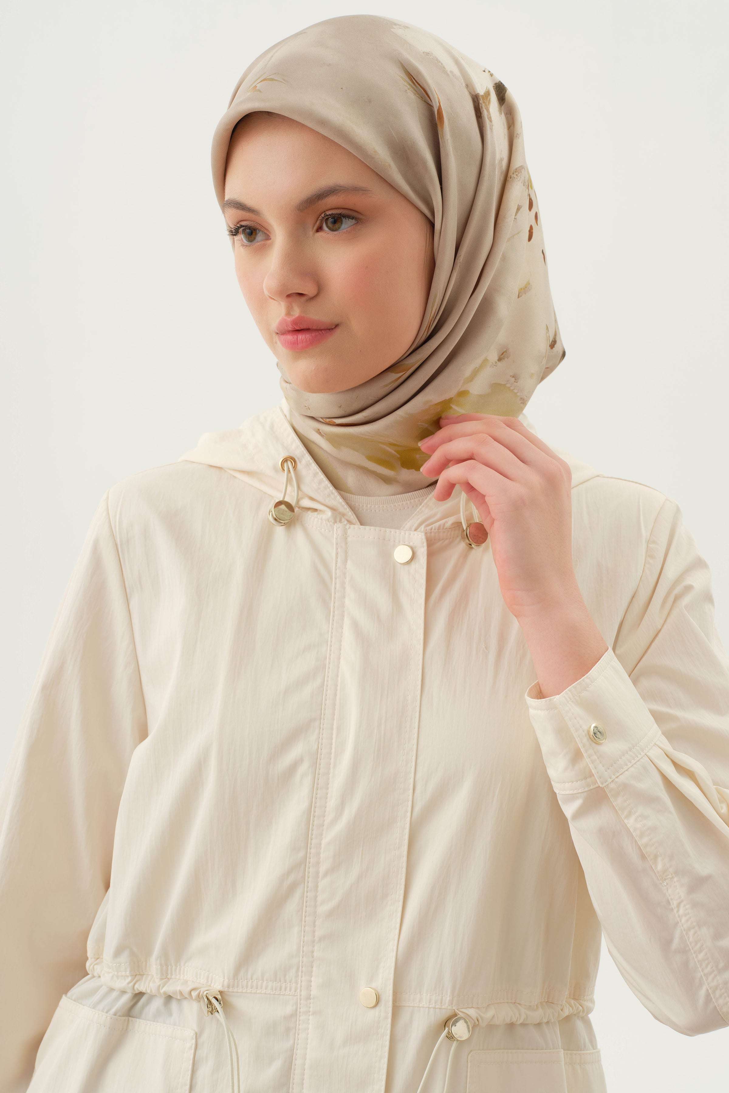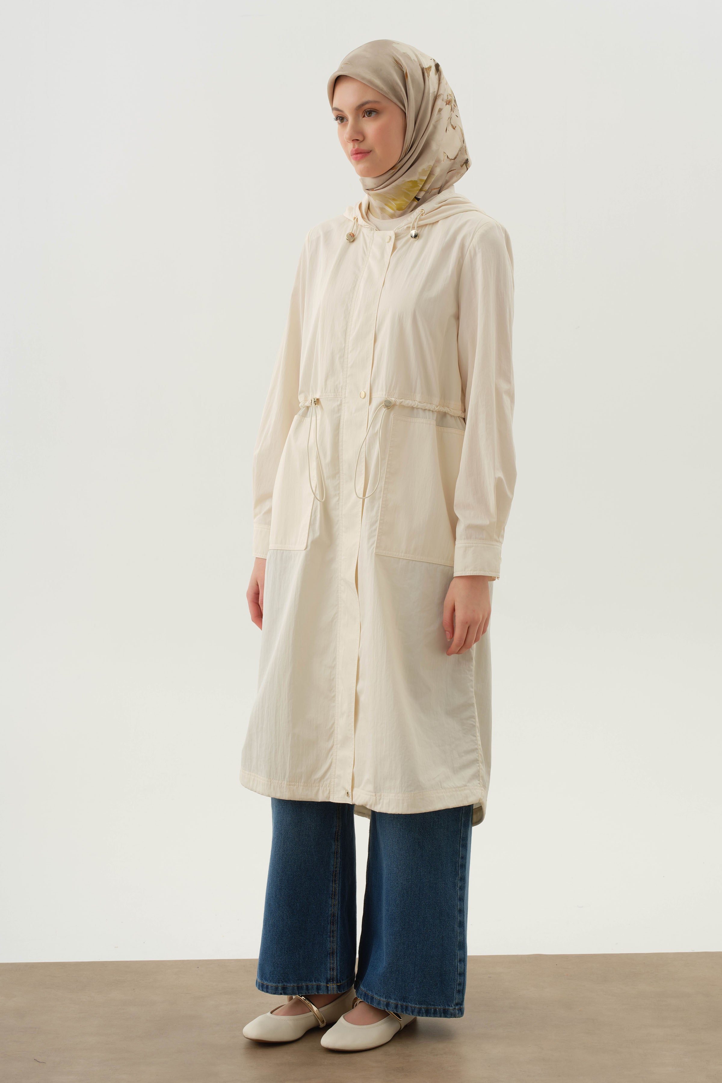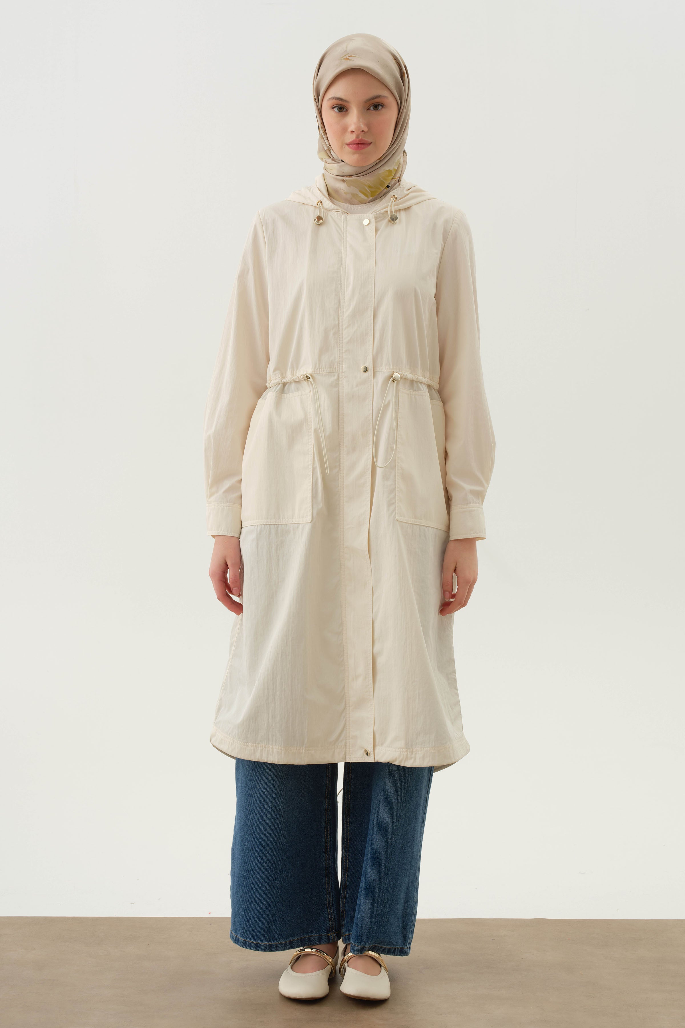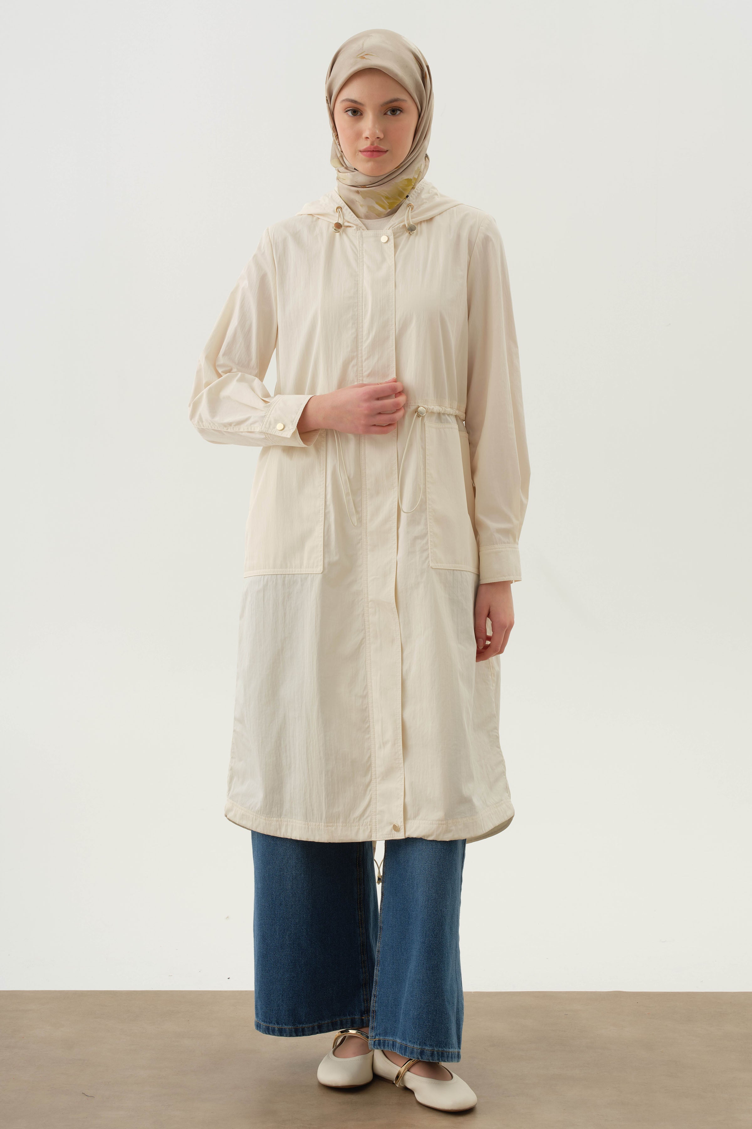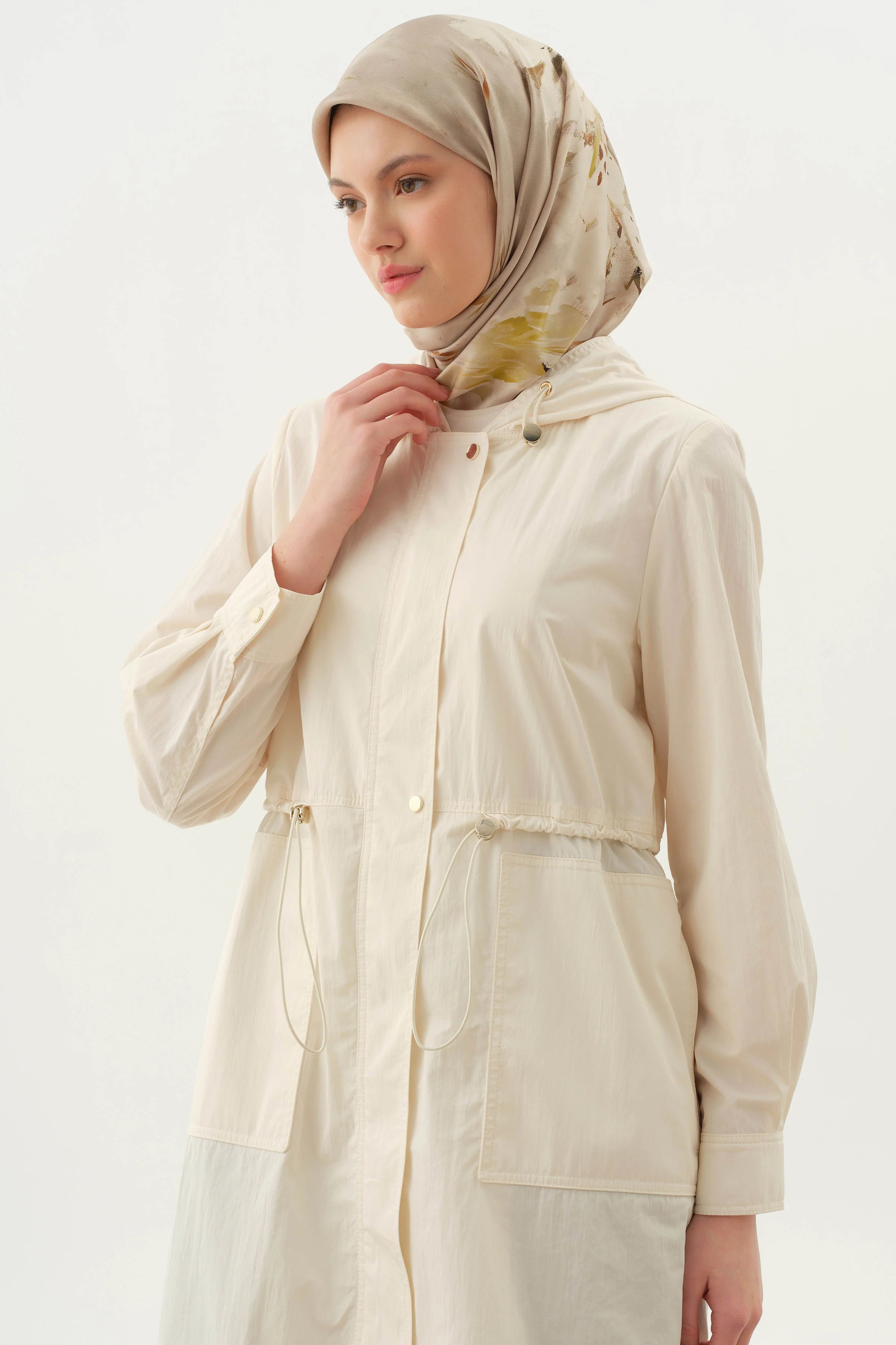 Hooded Elastic Detailed Coat - Ecru