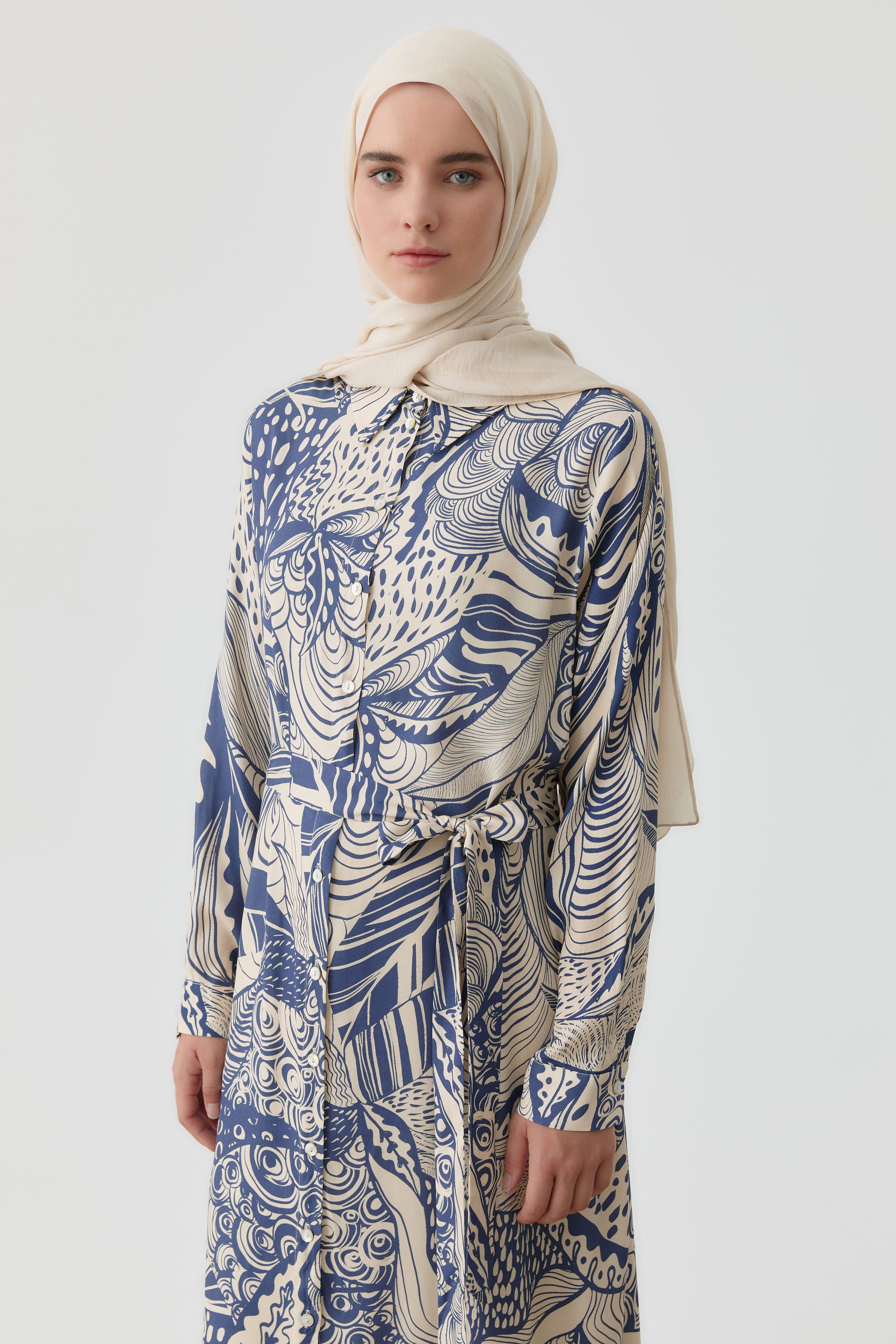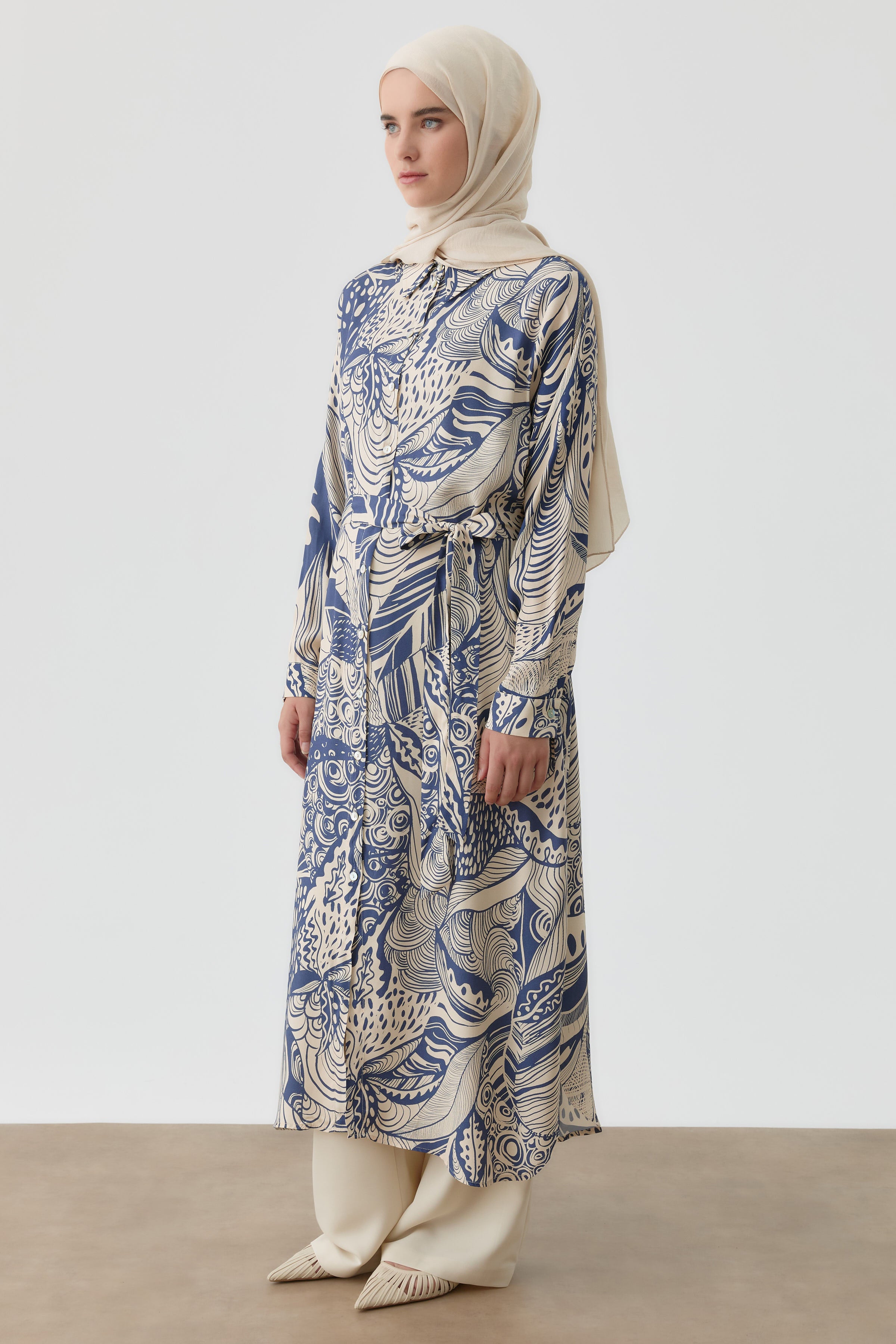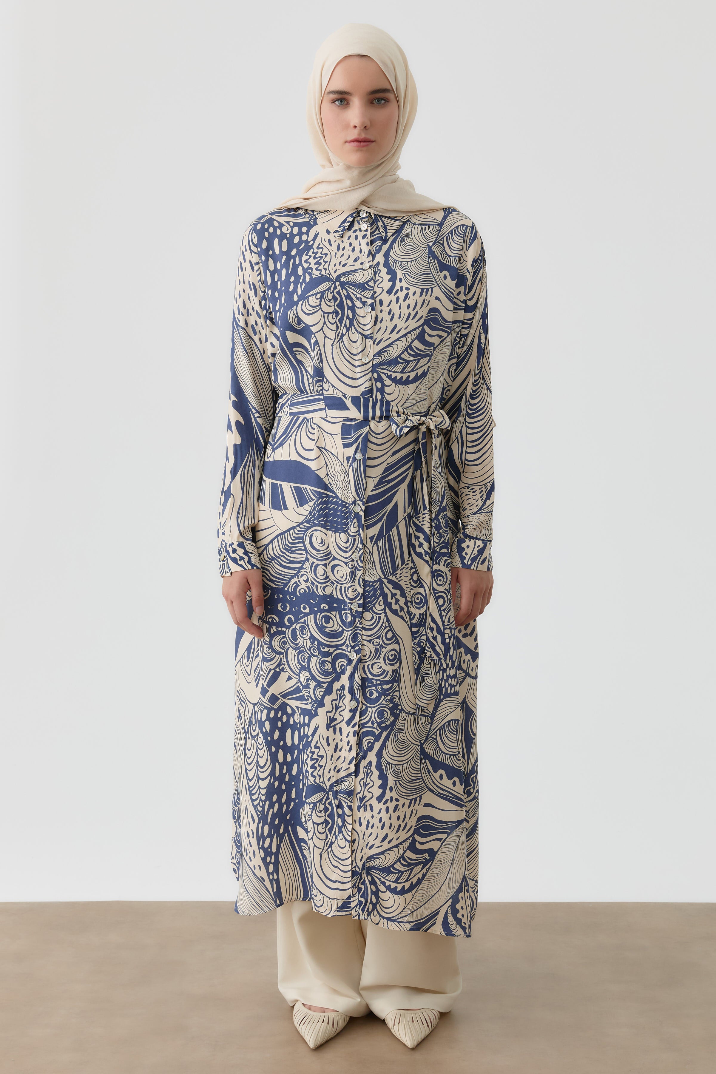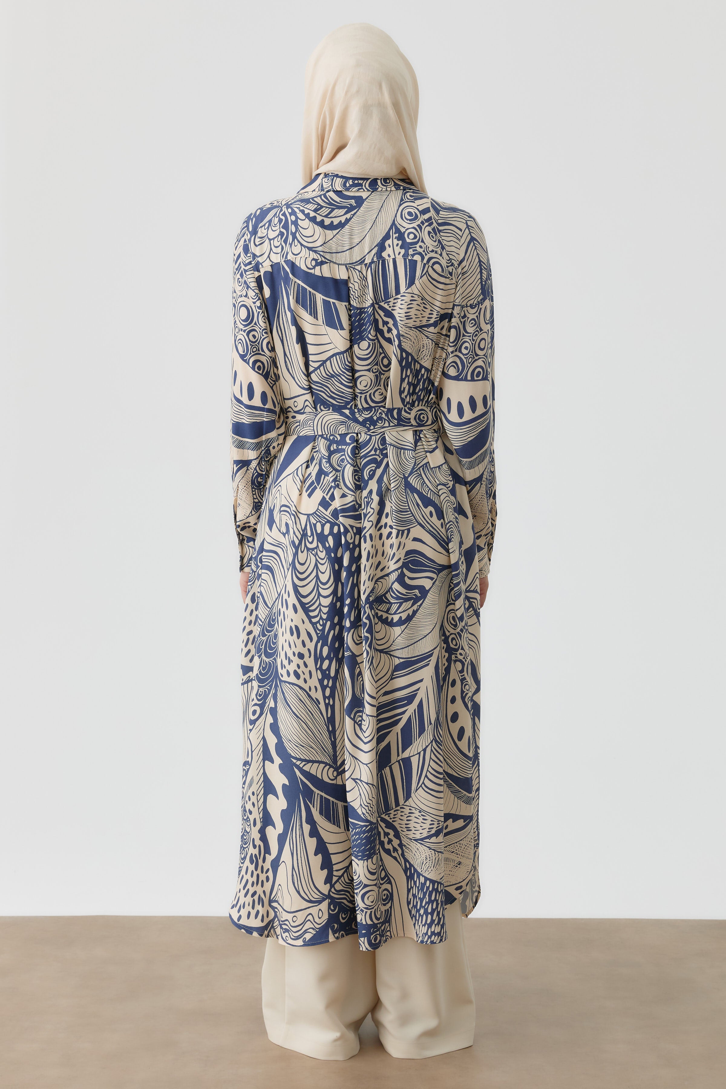 This long tunic, with its elegant patterns and belt detail at the waist, offers a feminine silhouette, combining elegance and comfort. It's an ideal choice for everyday or special outfits.