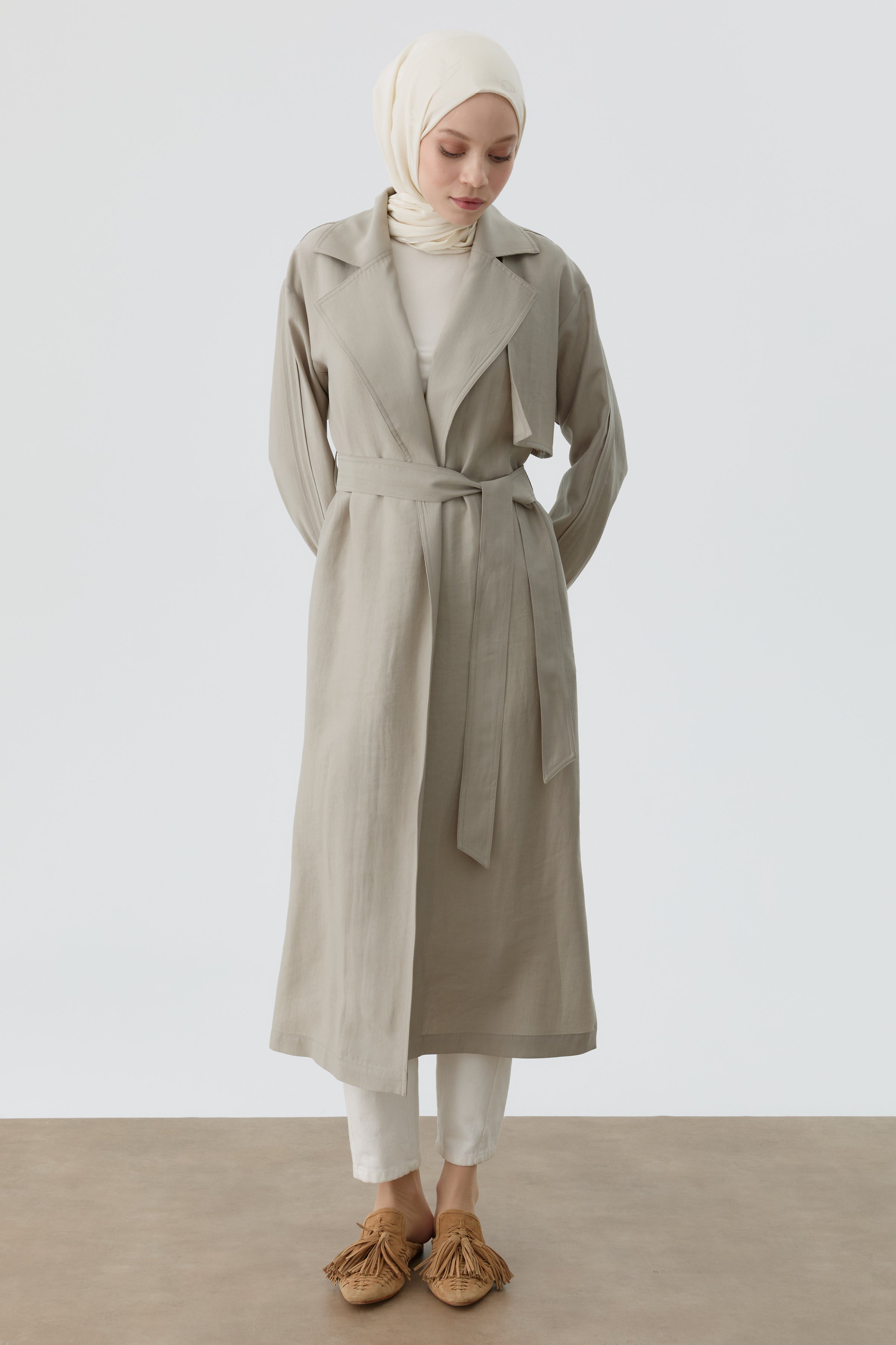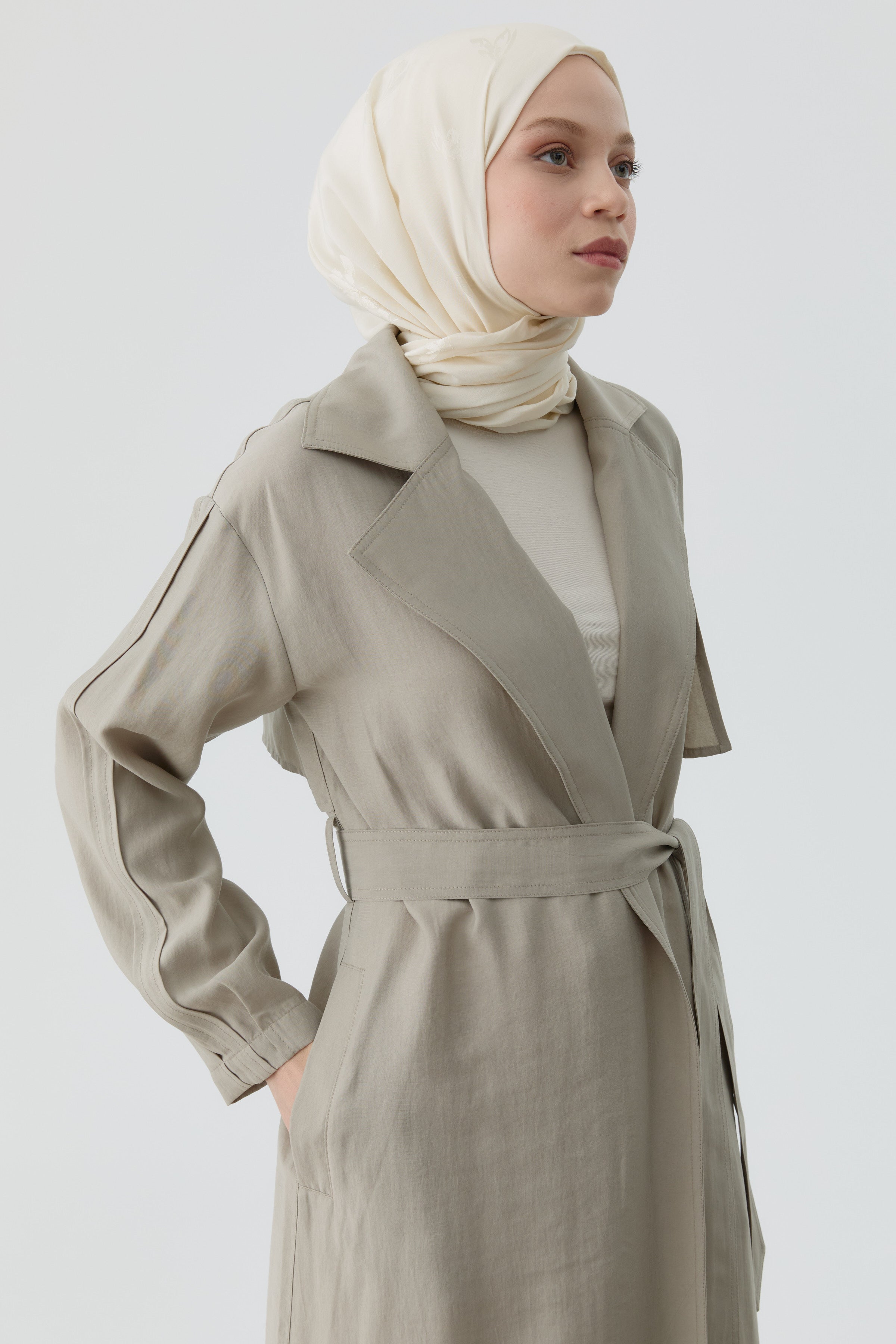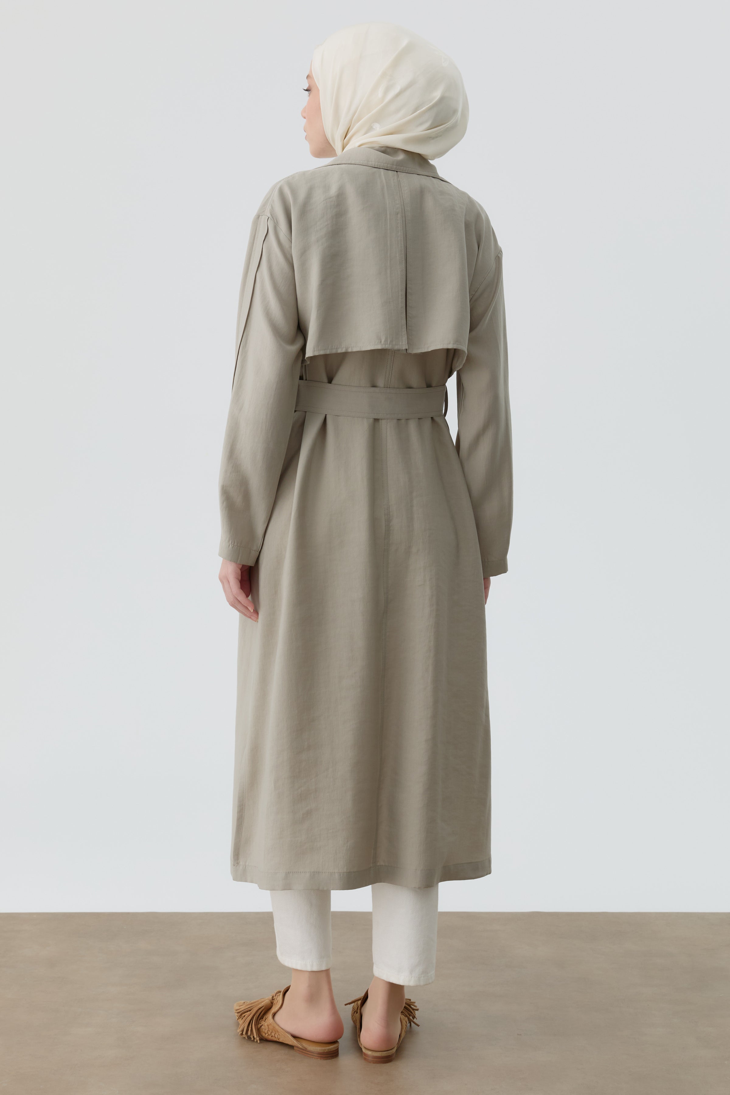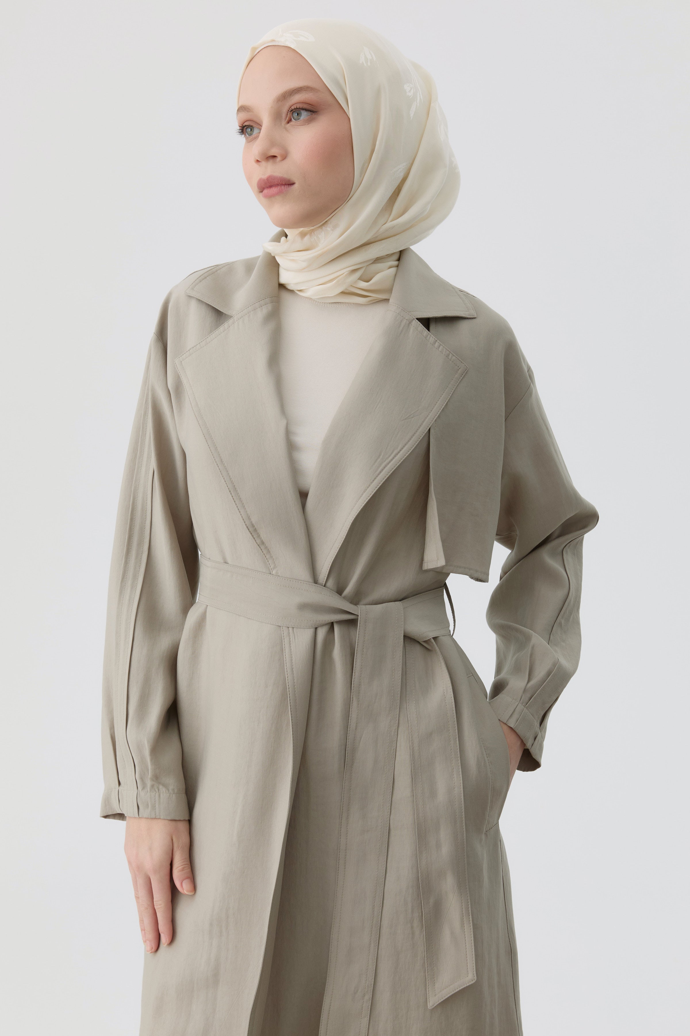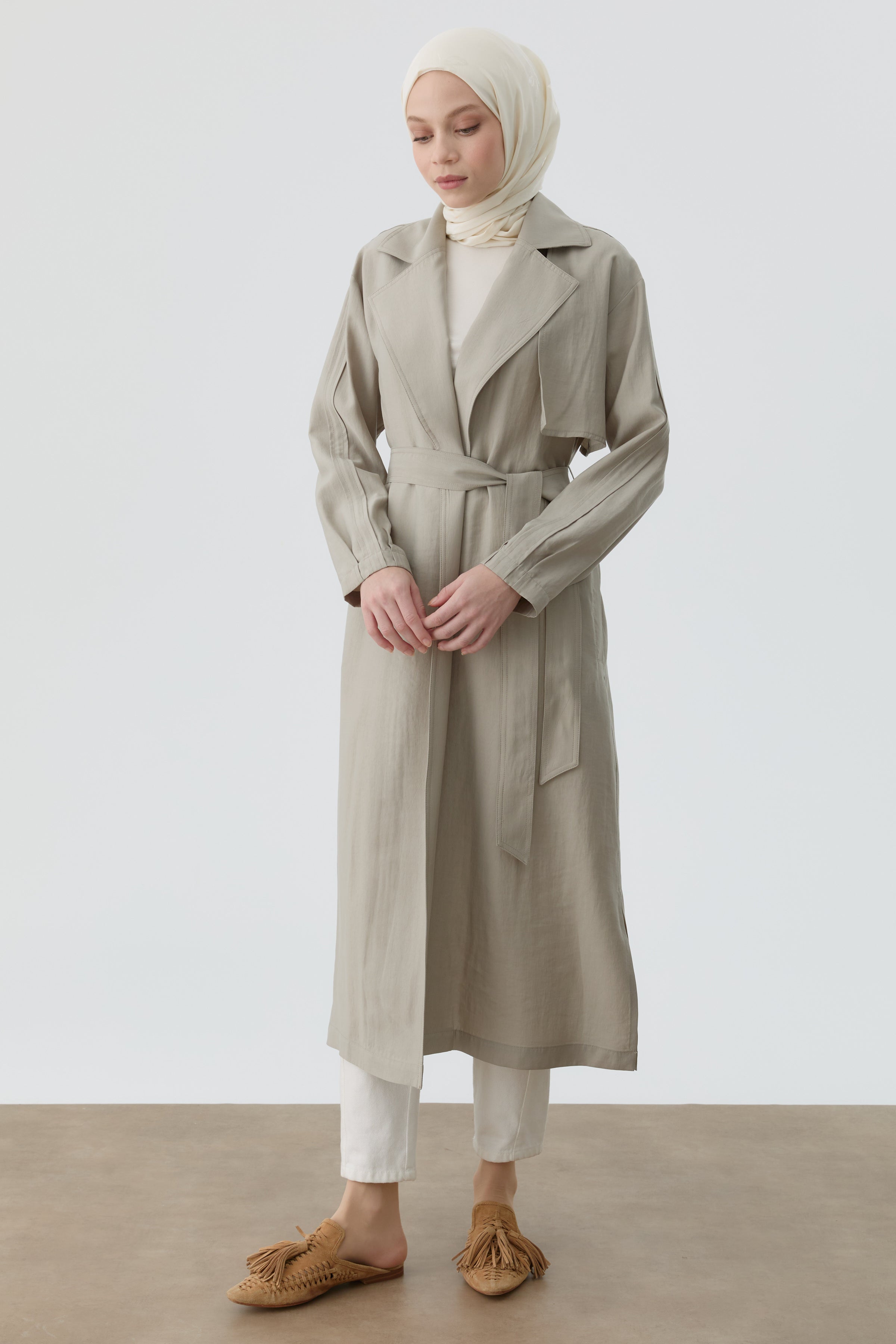 Trench Coat with Pleated Sleeves - Stone
