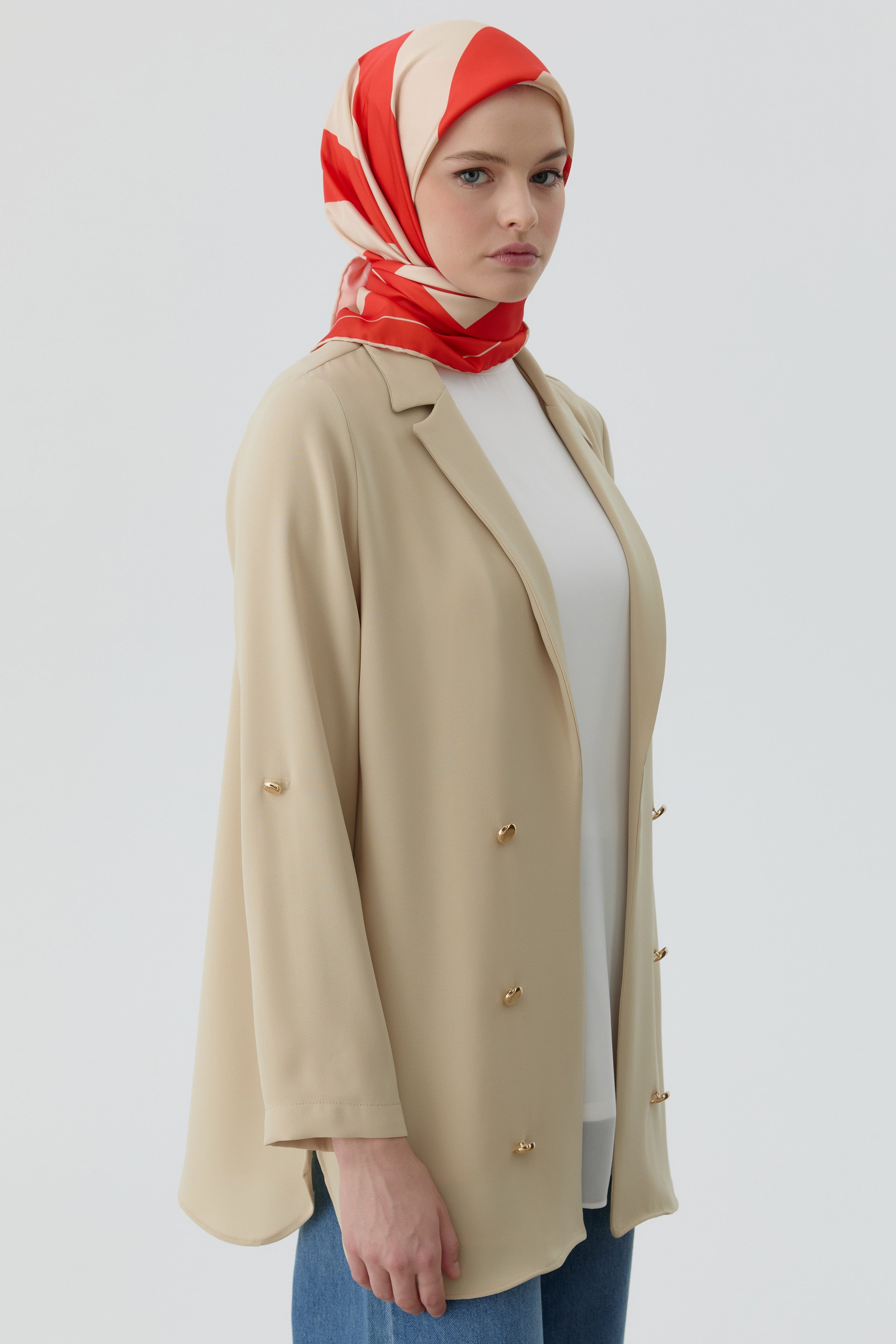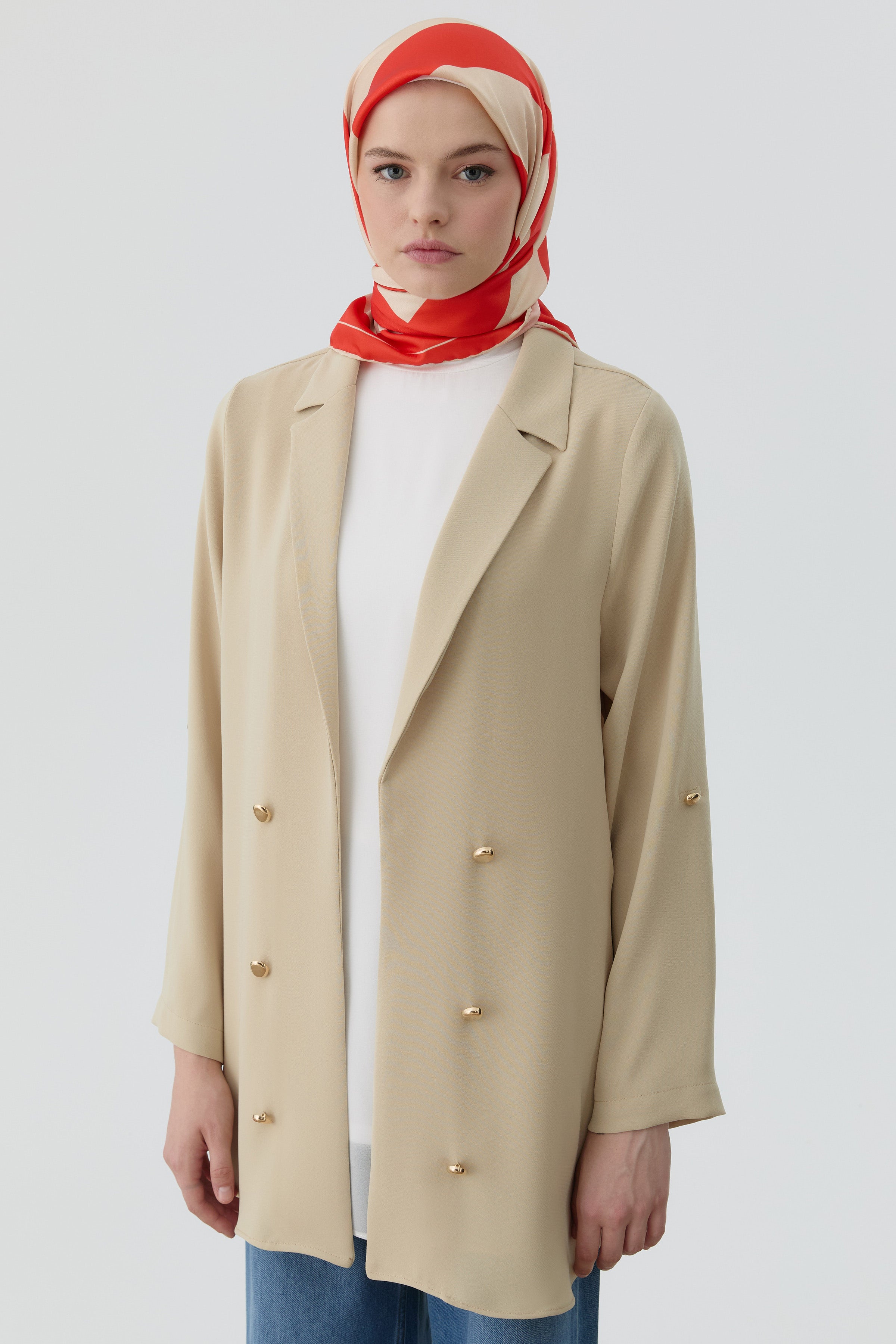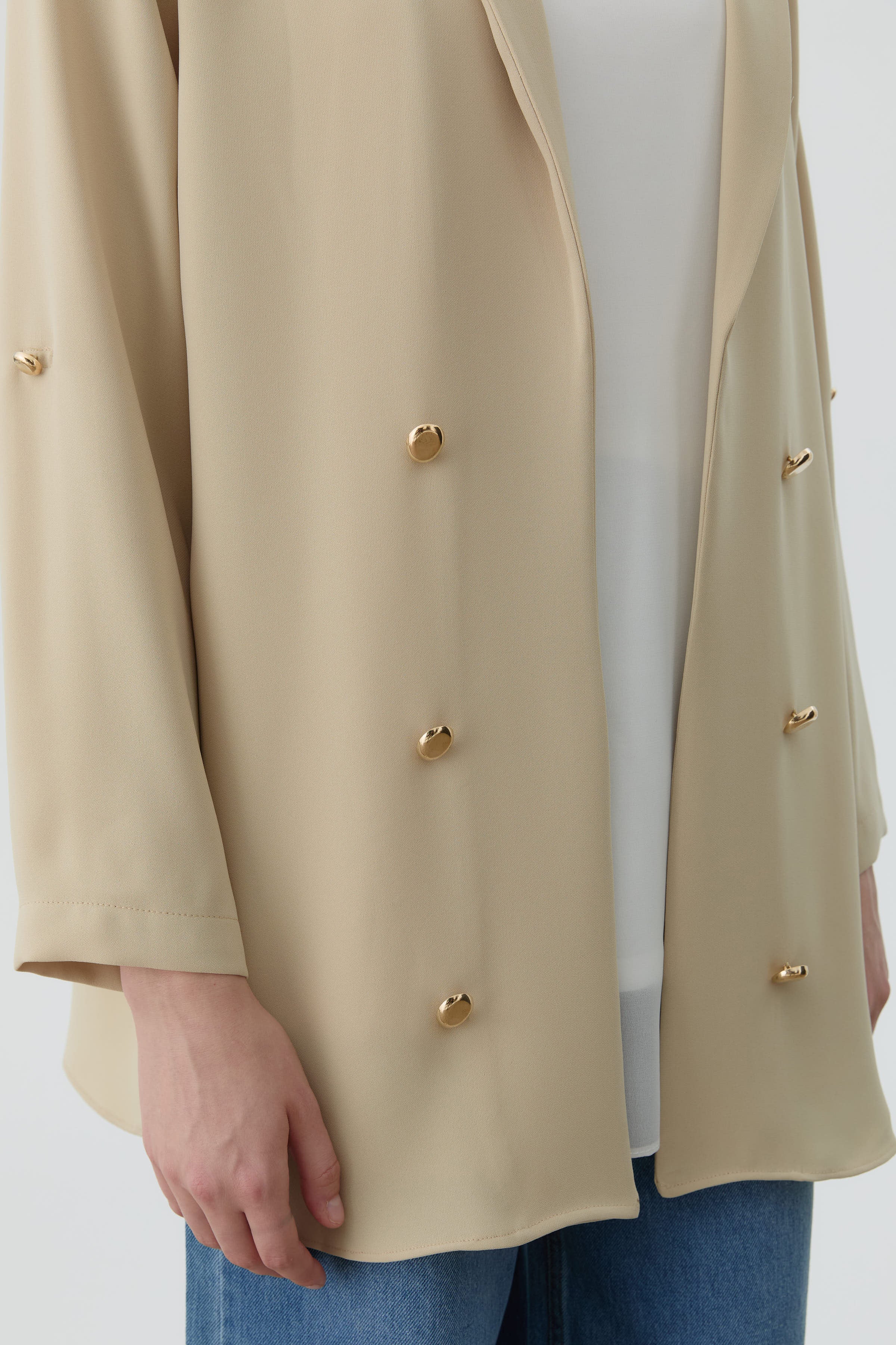 Its minimal design is enriched with ornamental buttons and gains a modern silhouette with armband details.