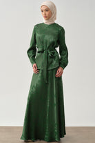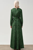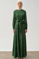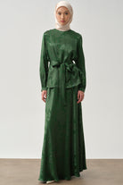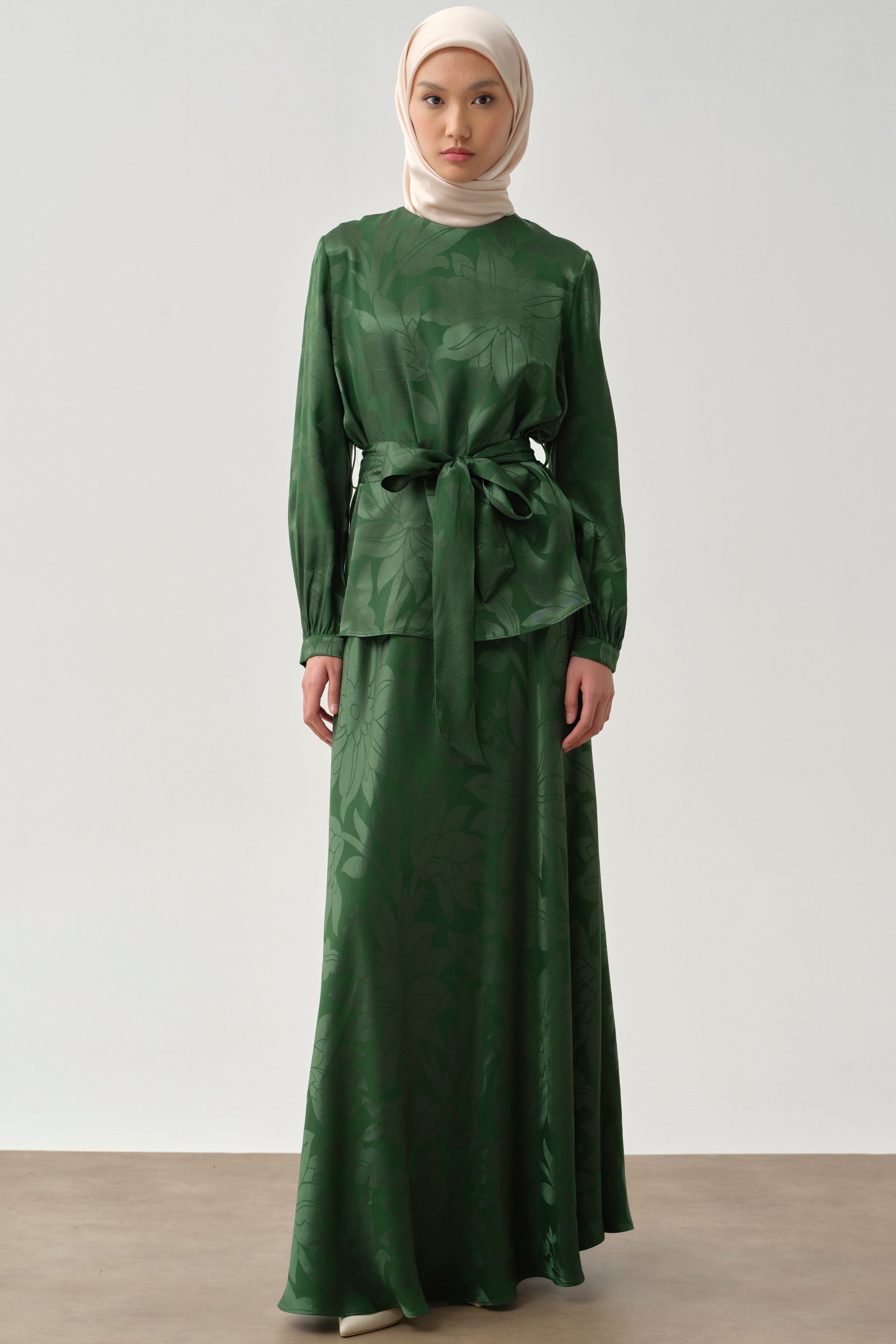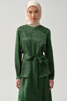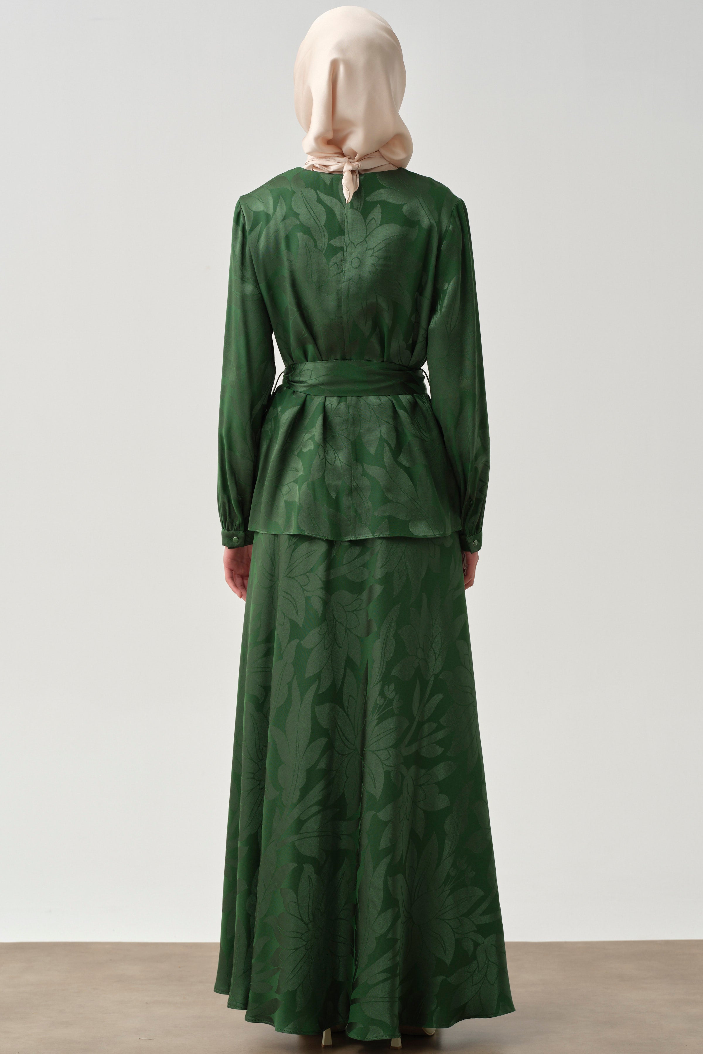 This set, consisting of a belted blouse and a matching skirt, offers an elegant and stylish look with its patterned texture. The flowing cut and belt detail gracefully accentuate figure curves while providing comfortable wear.