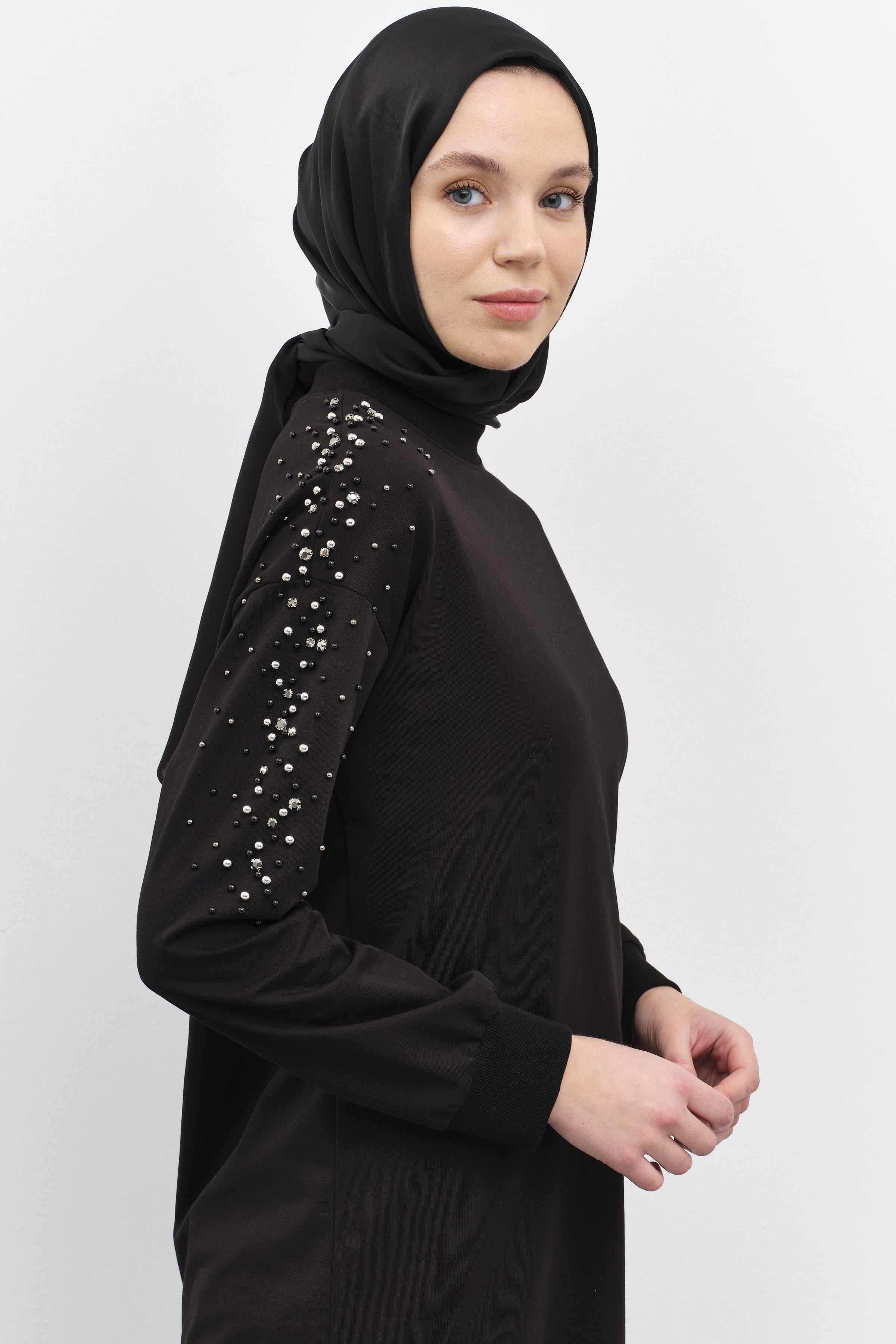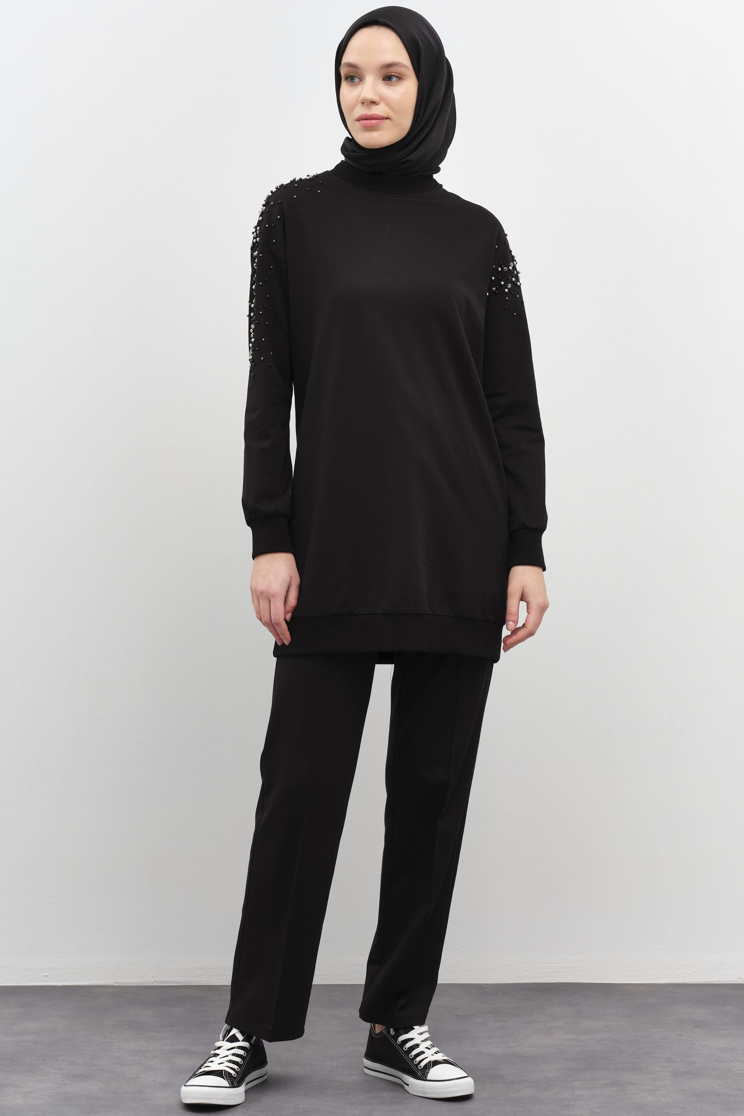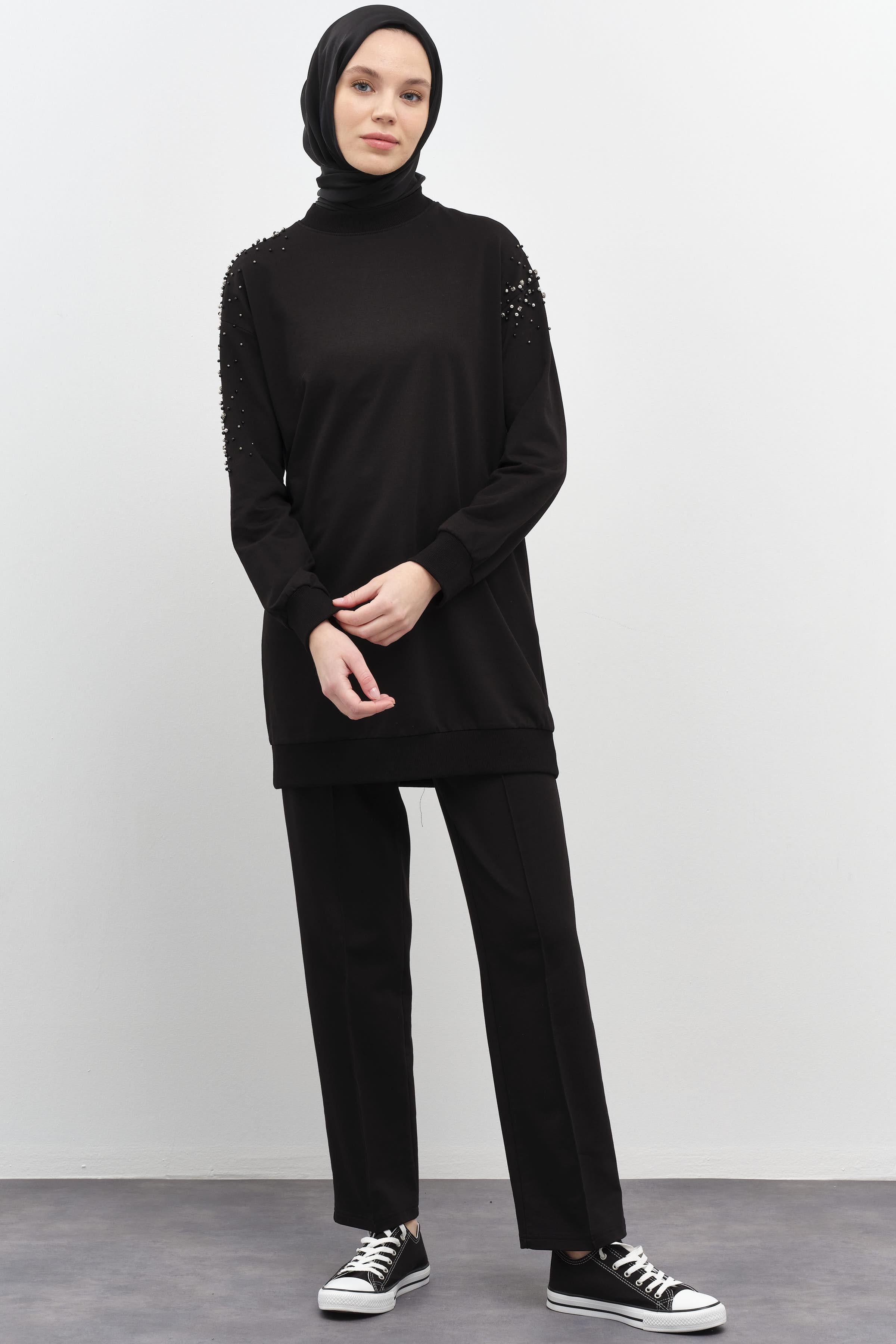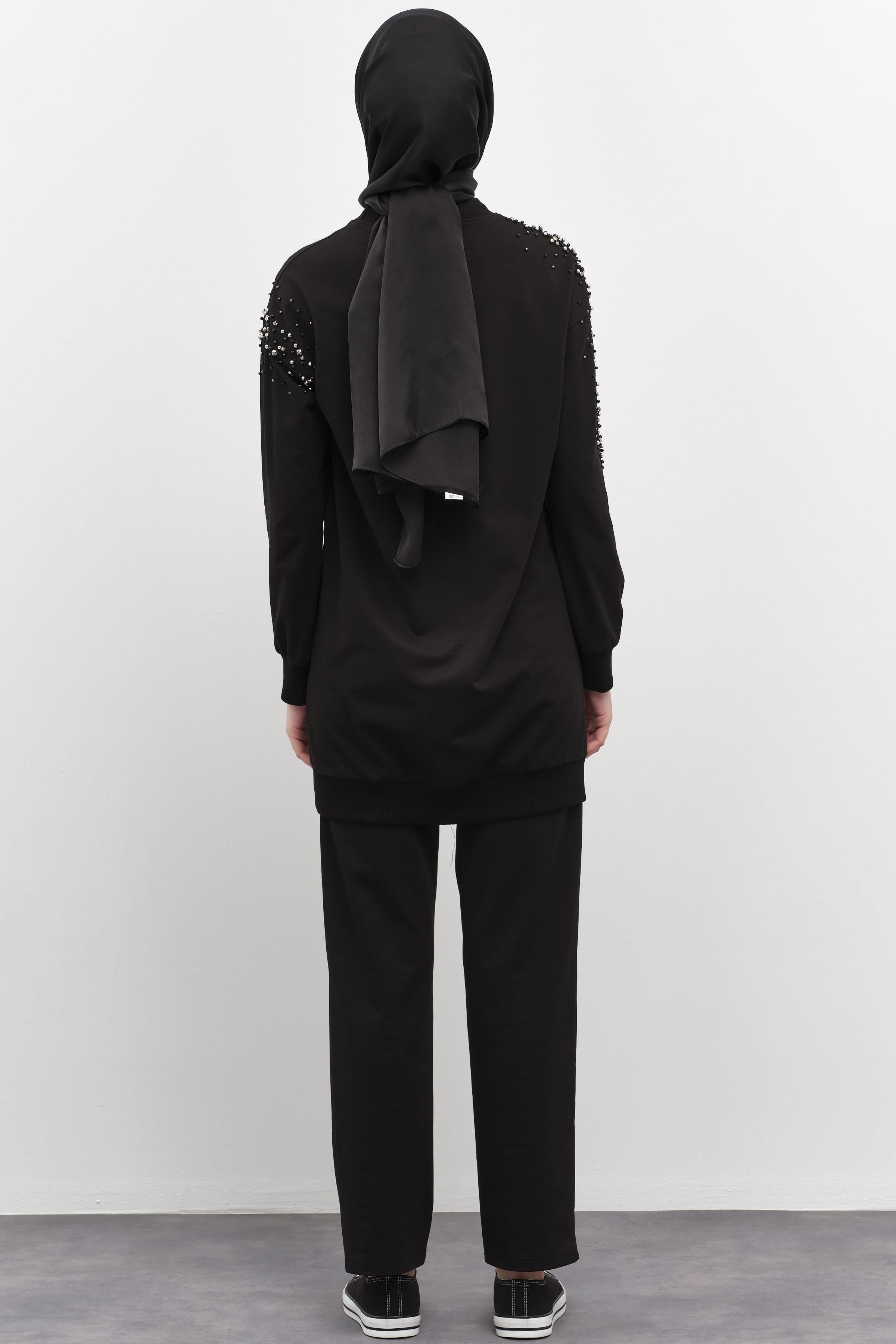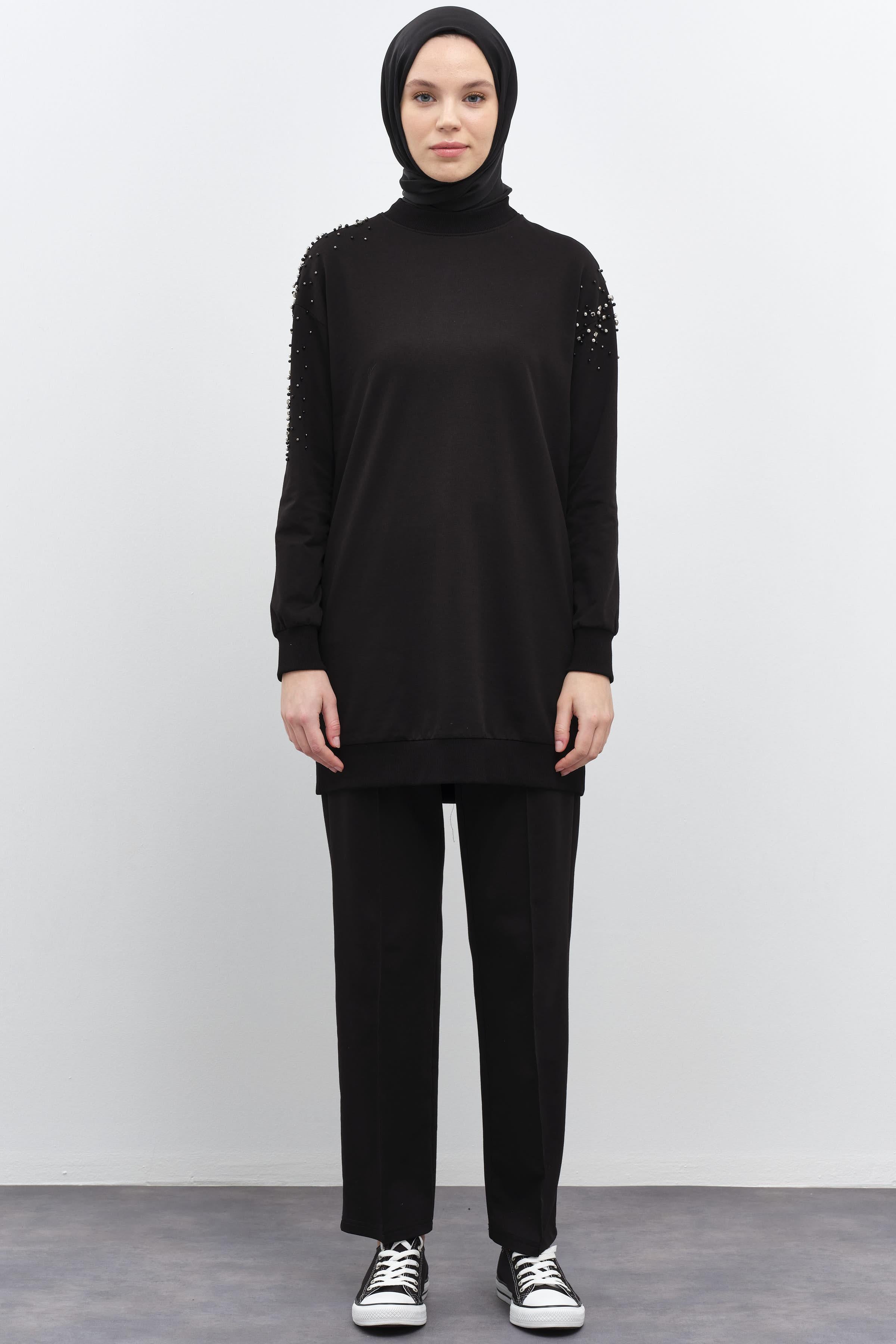 Stone Detailed Sleeve Tunic Trouser Set - Black