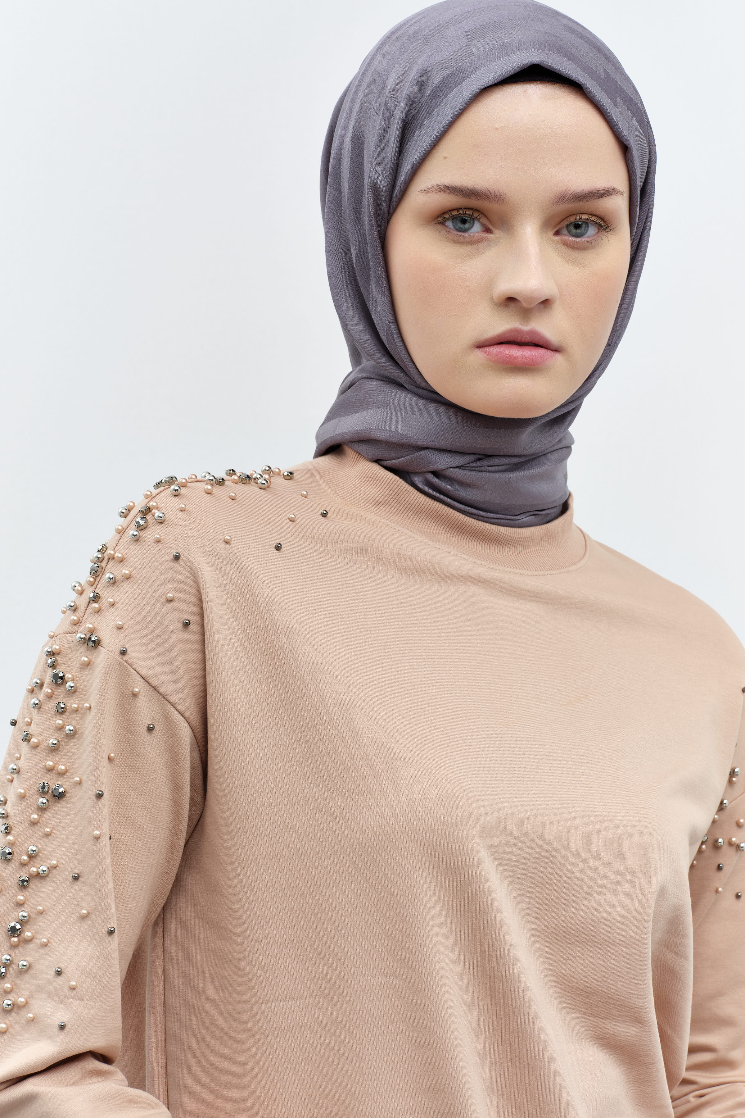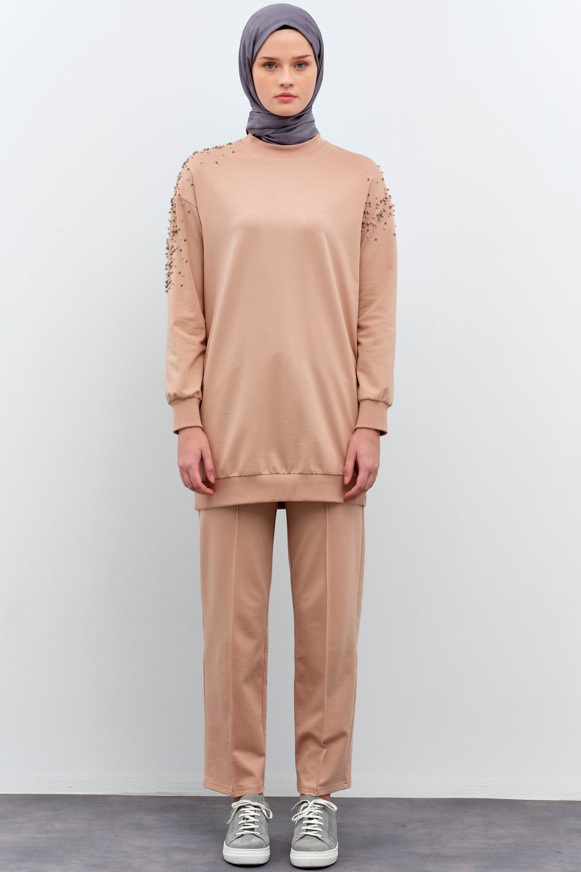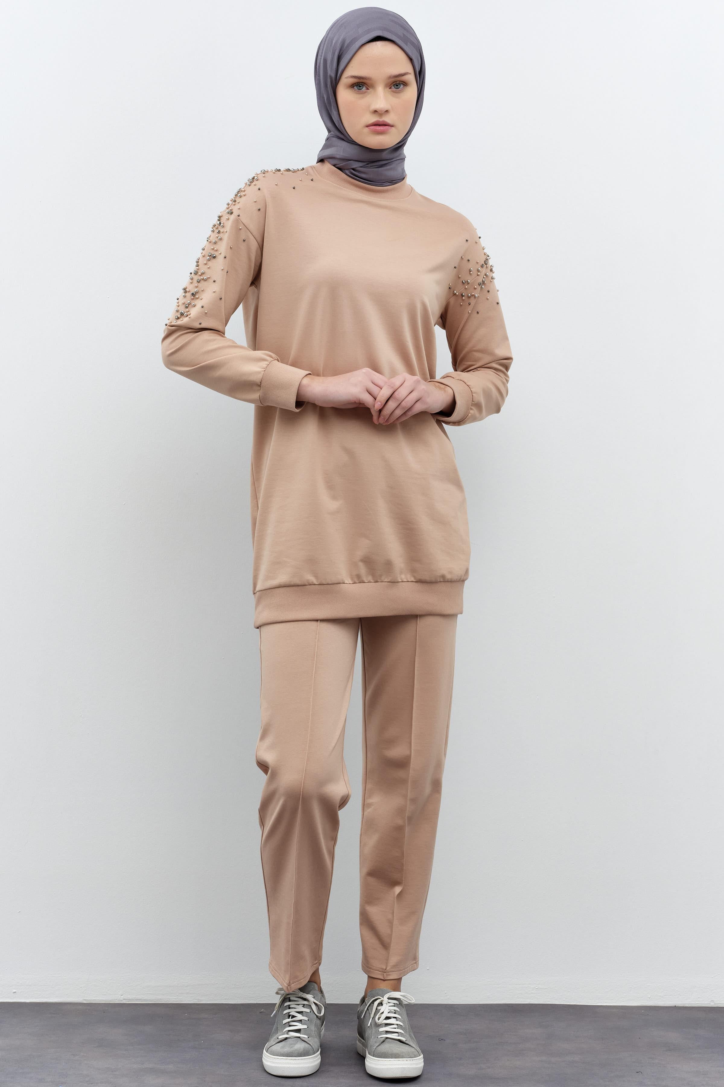The elegant stone details on the tunic part of the set add sparkle to the simple design, while the long cut provides comfort. The trousers, with their loose and comfortable fit, offer freedom of movement throughout the day.