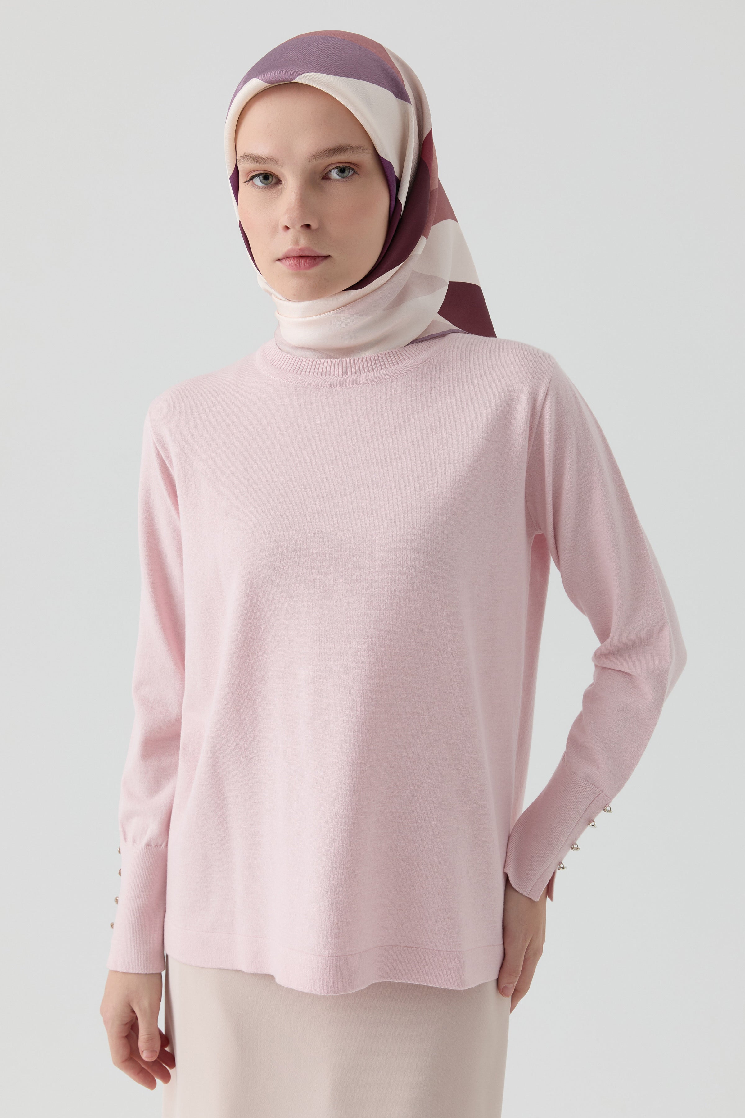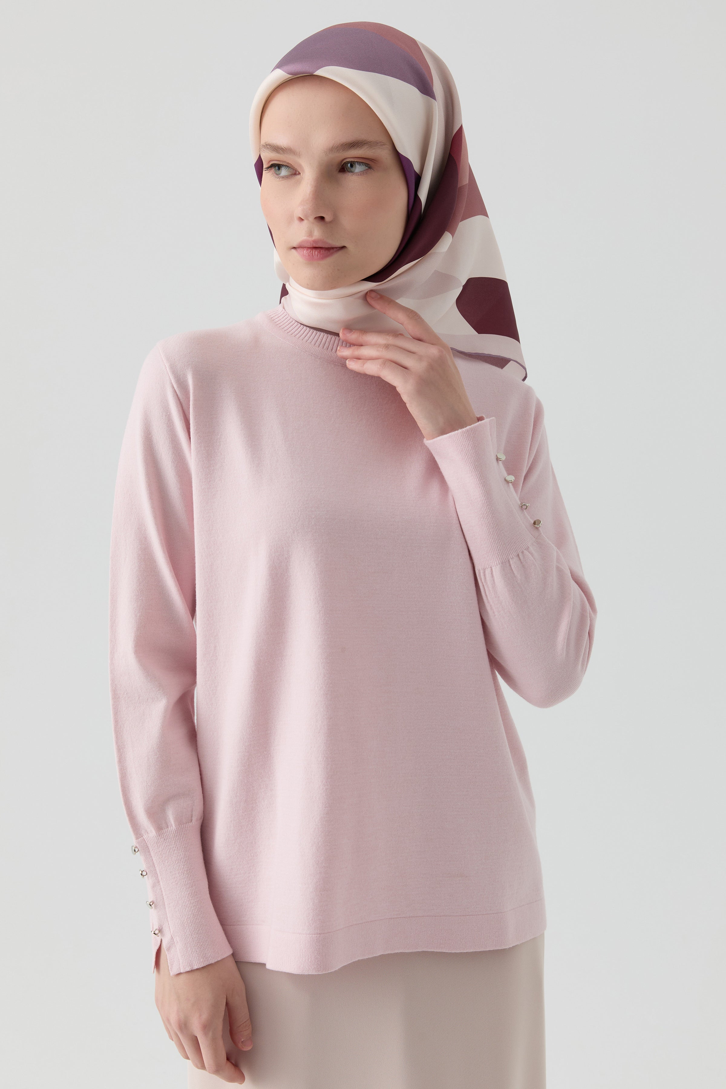 Offering a modern silhouette with its crew neck design, this sweater enhances its elegance with button details on the sleeves. Its soft and flexible texture ensures all-day comfort, while its simple design easily complements any outfit.