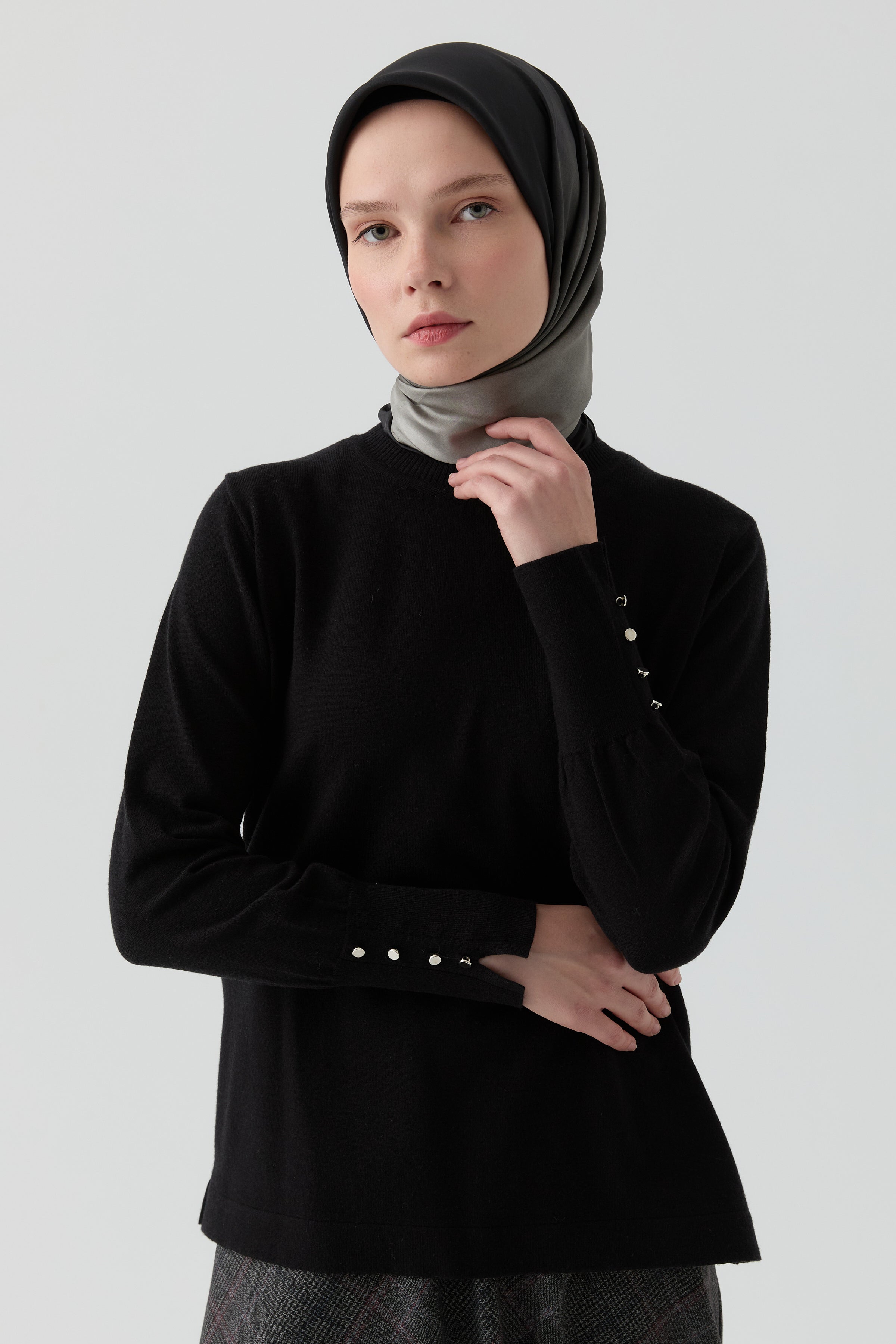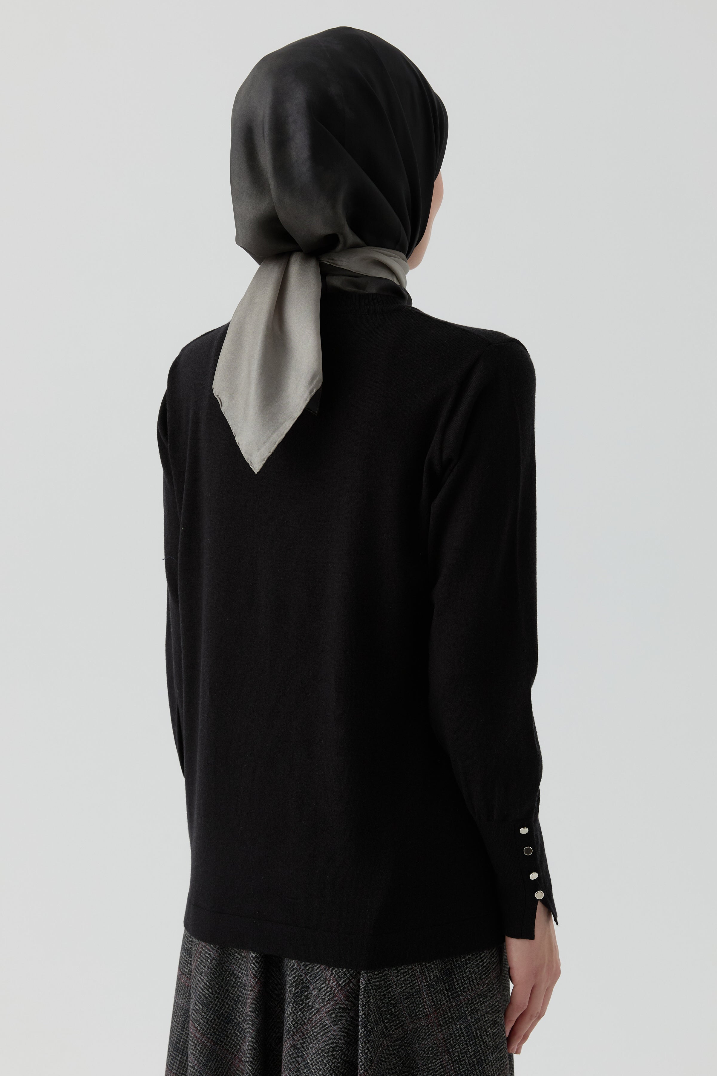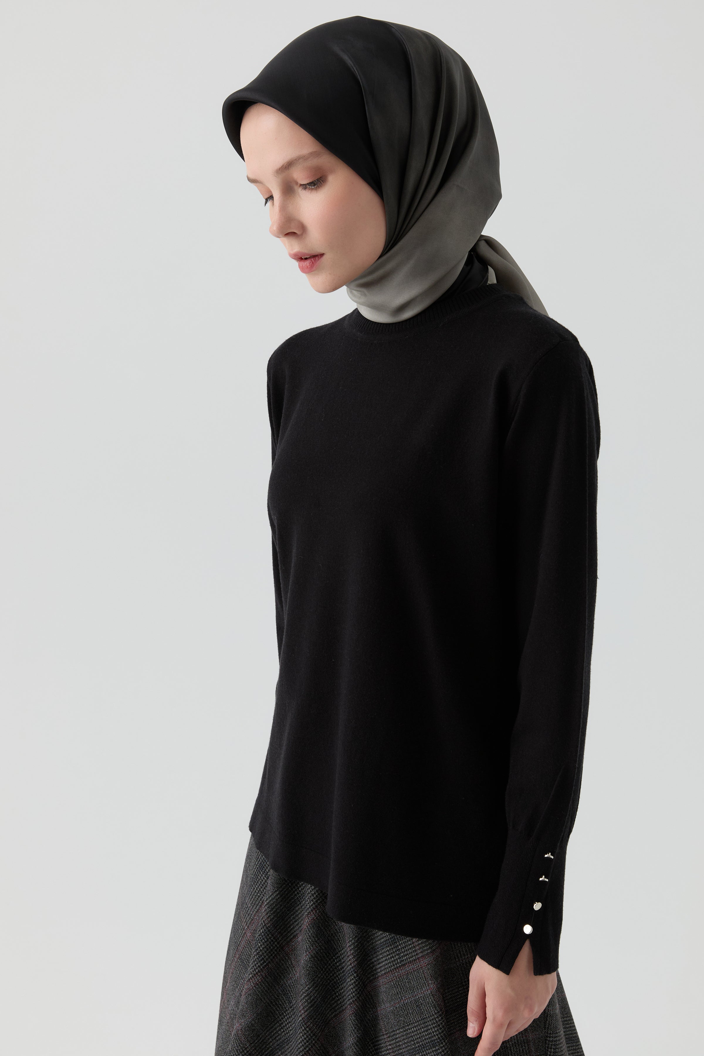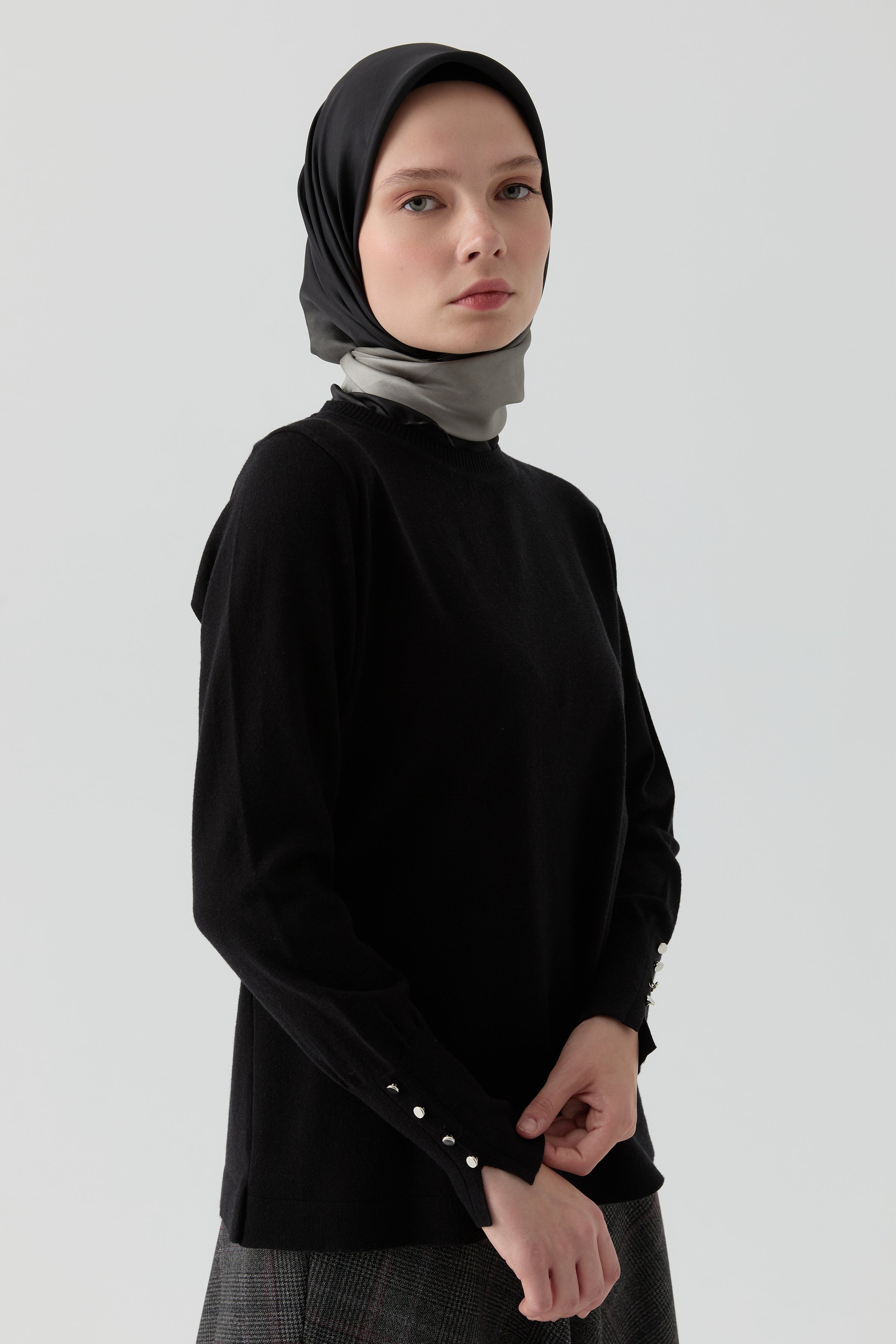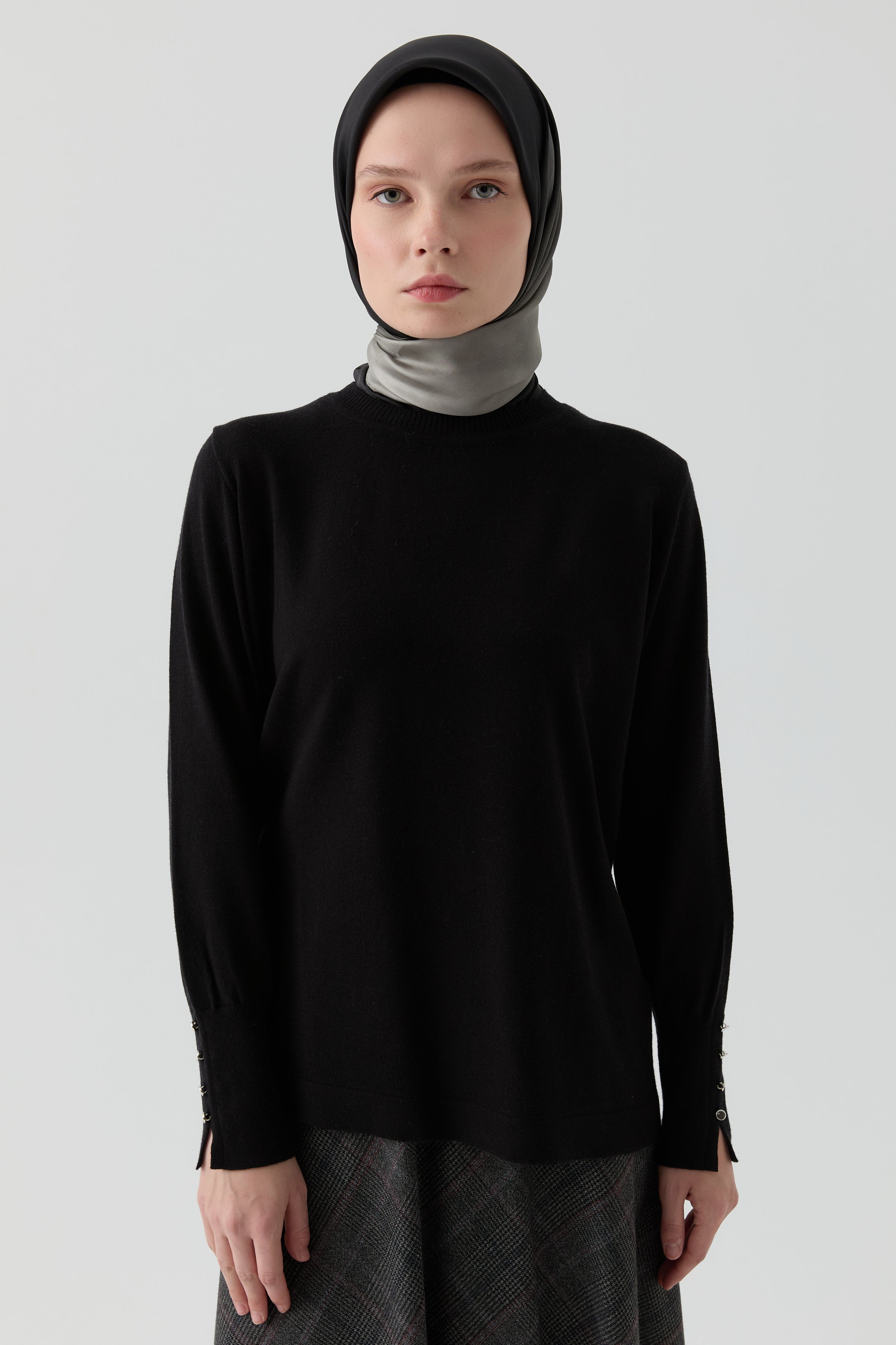 Sleeve Button Detailed Crew Neck Sweater - Black