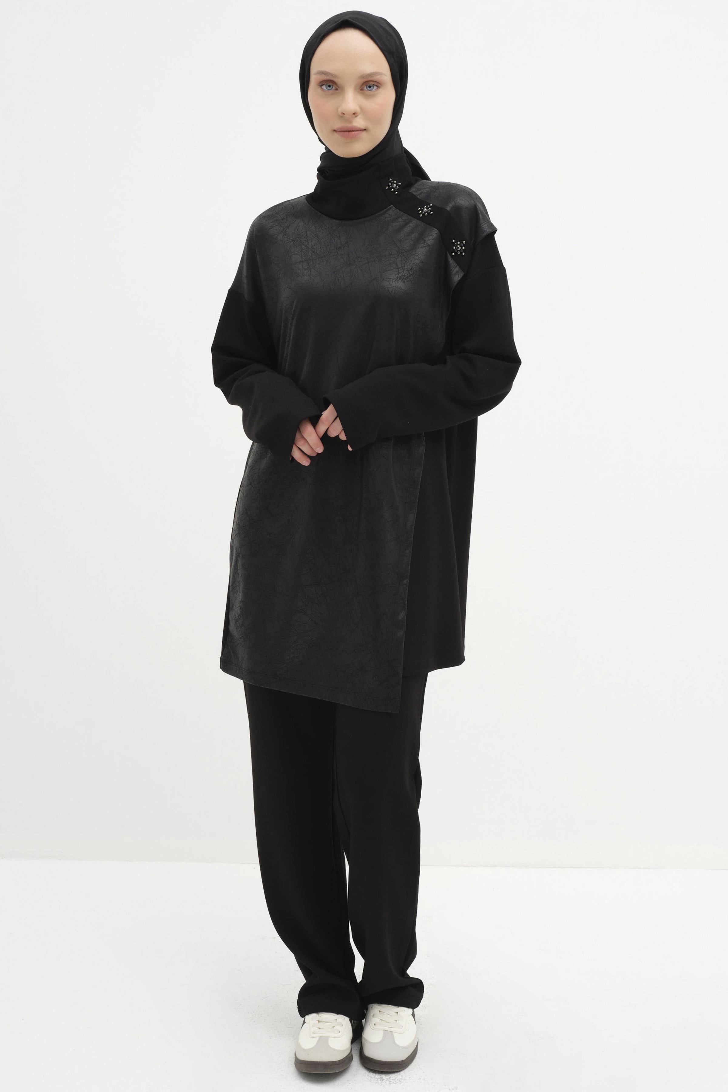The stone details on the shoulders strikingly highlight the minimalist design of the tunic, while the embellishments offer a relaxed style. The soft knit fabric ensures all-day comfort.