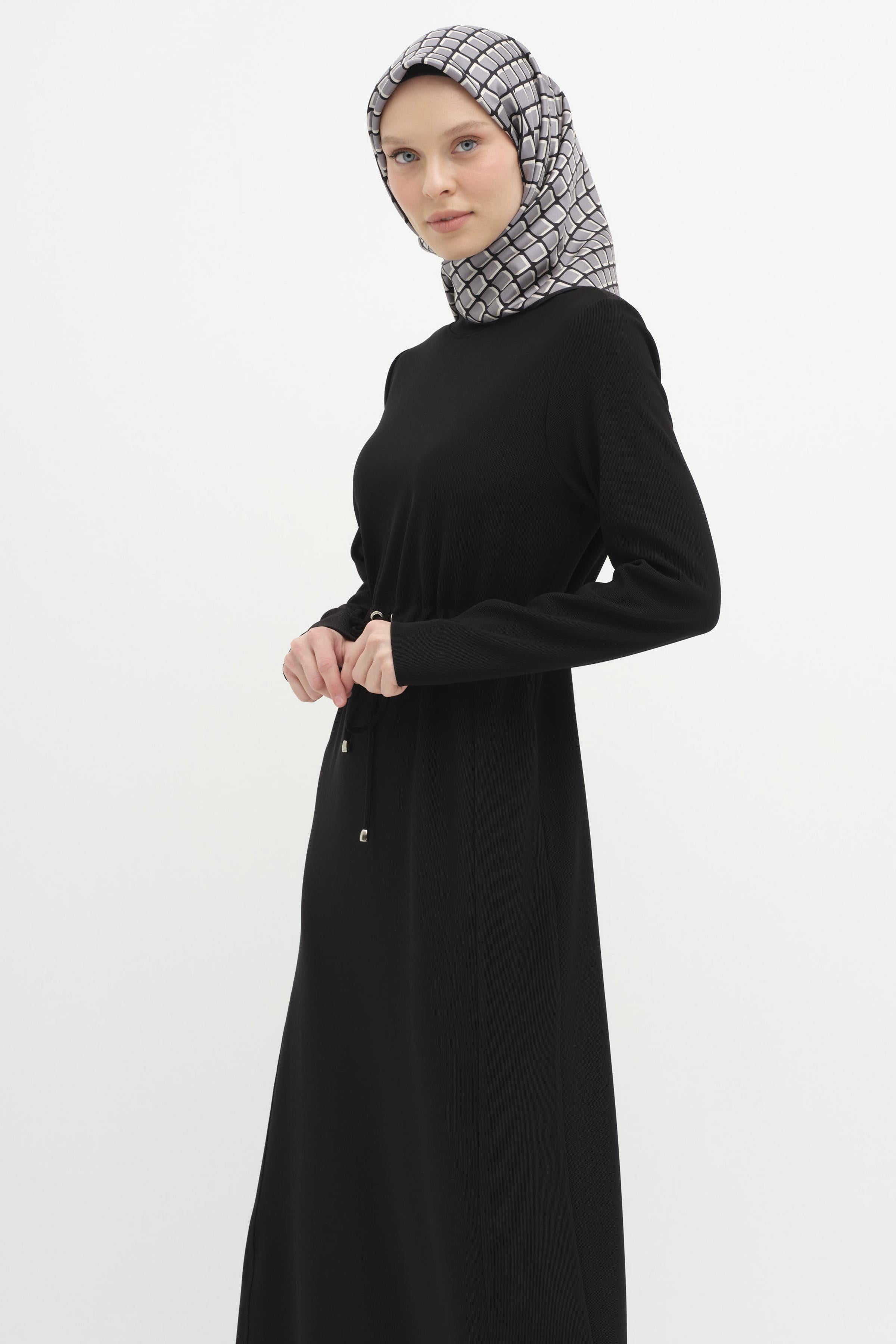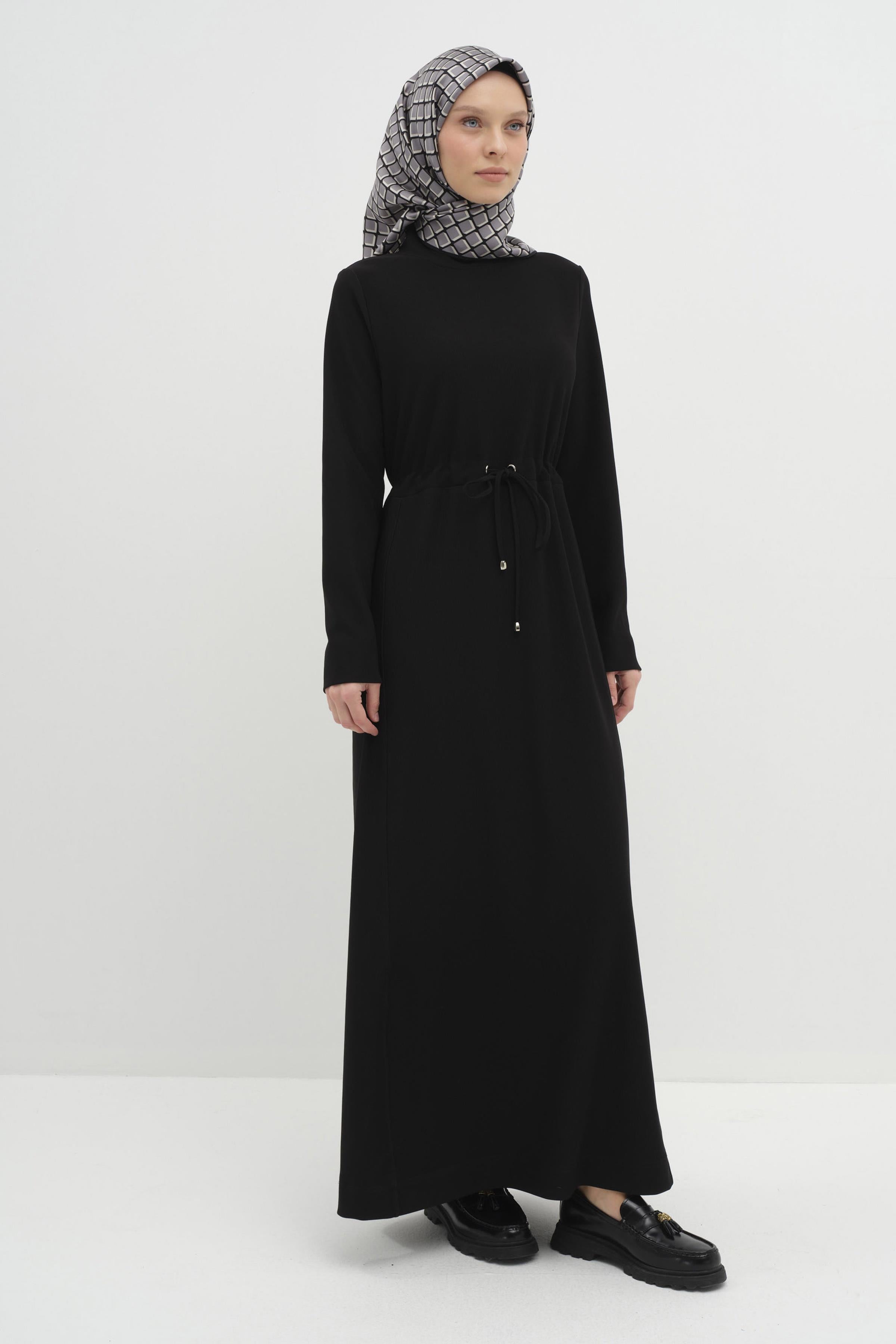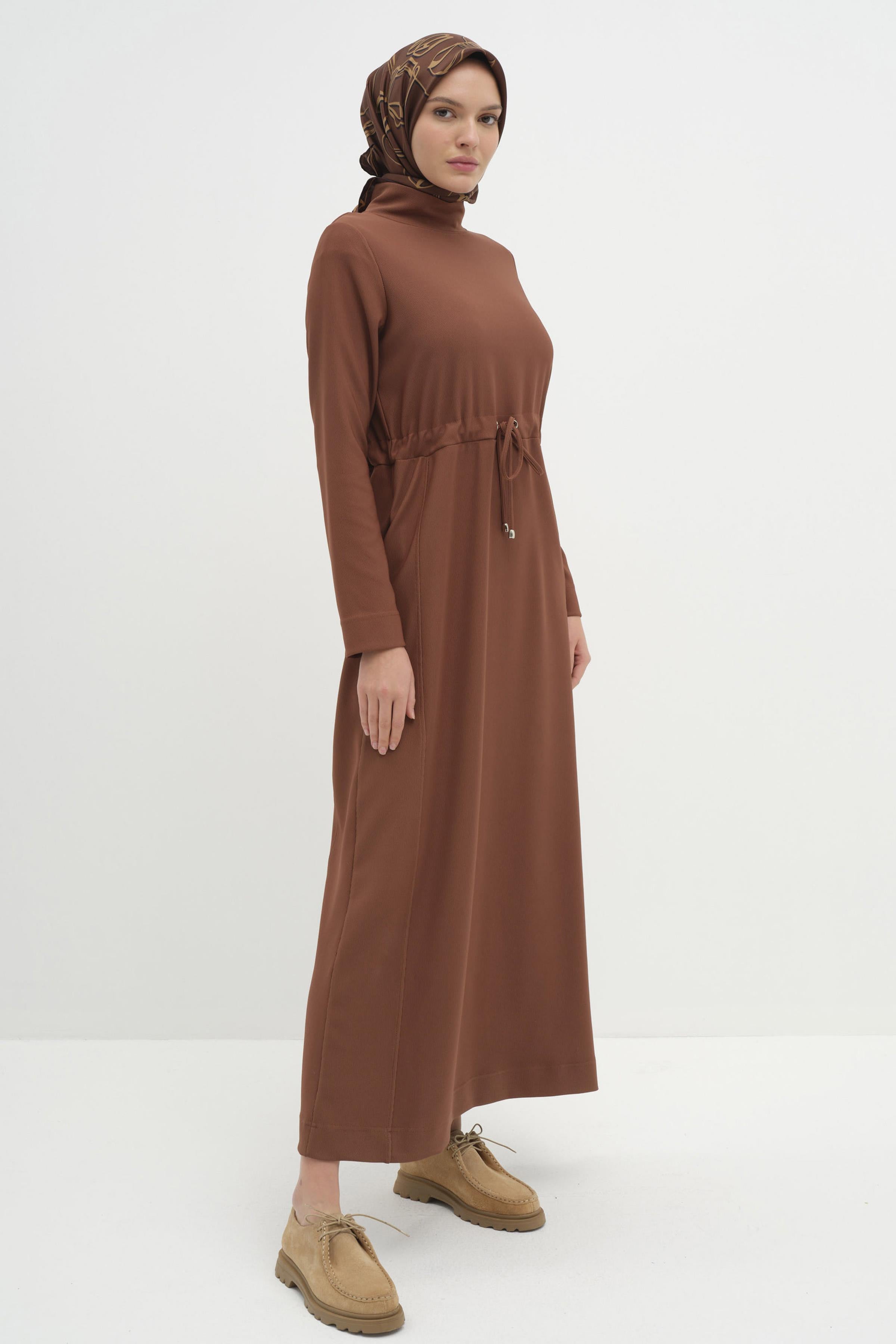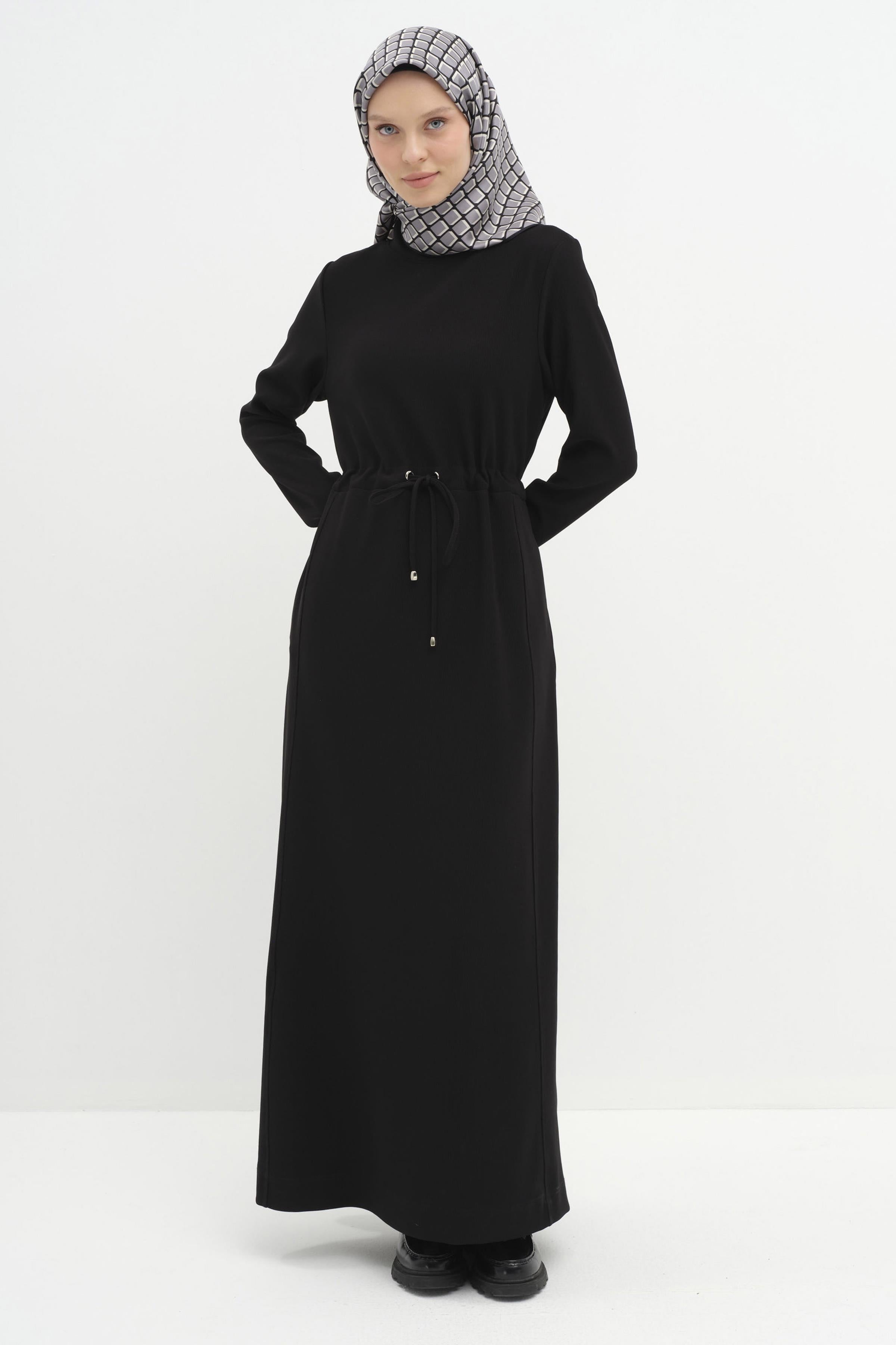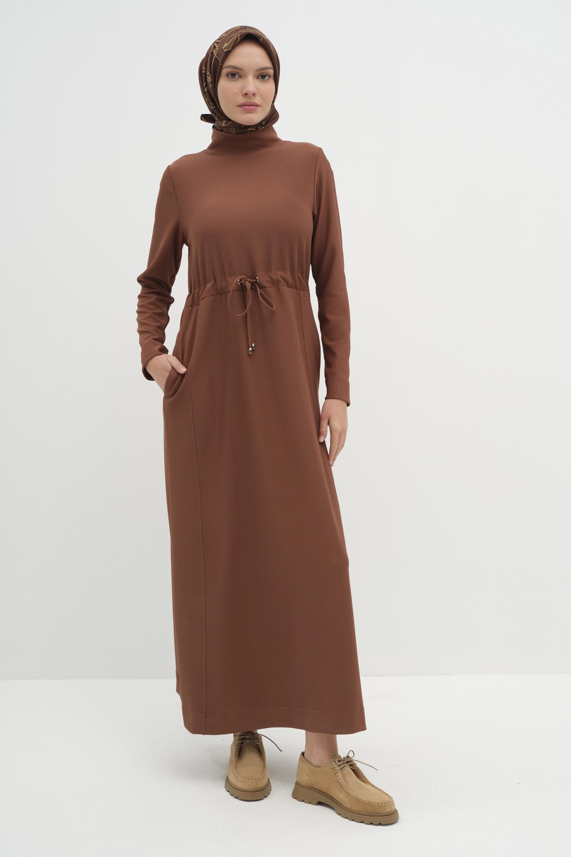 The drawstring detail at the waist gives the dress an elegant silhouette while ensuring comfortable wear. The knitted fabric hugs the body, creating a modern look and offering freedom of movement.