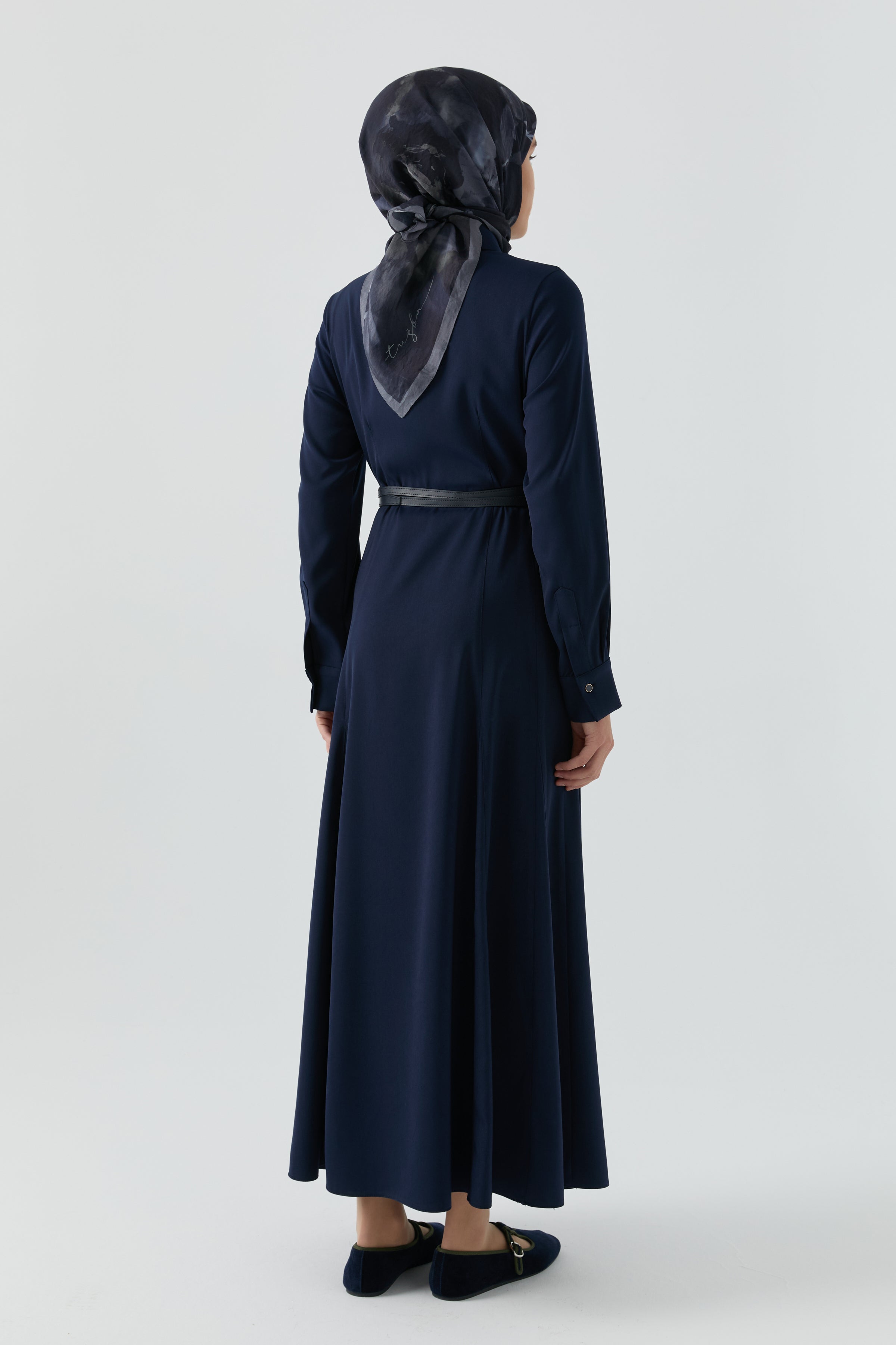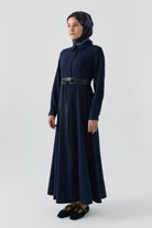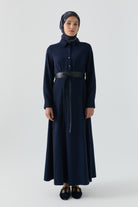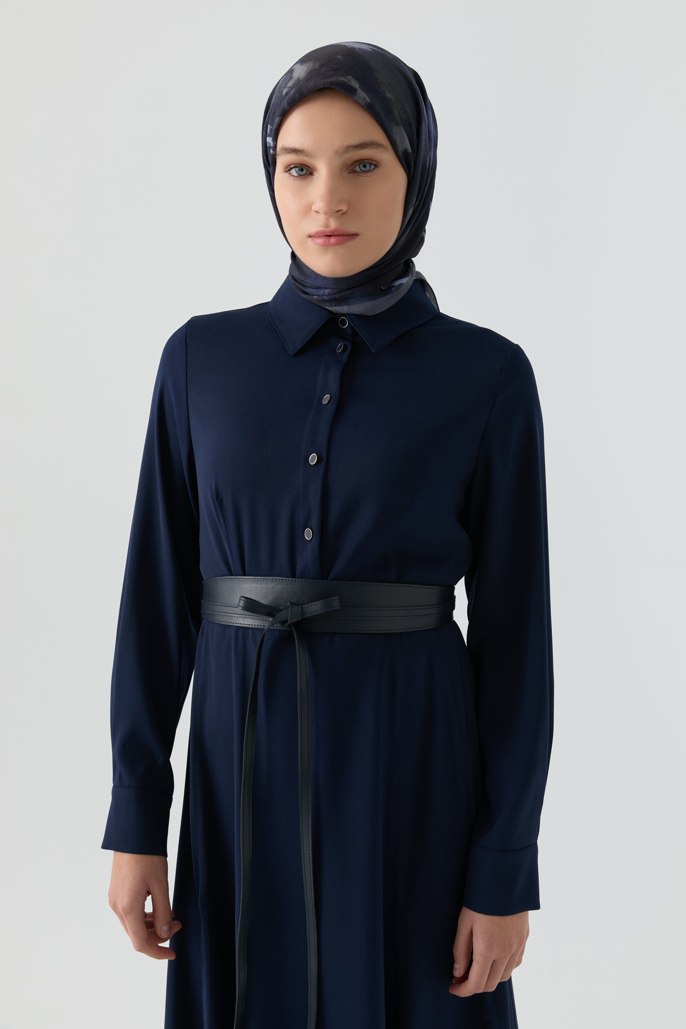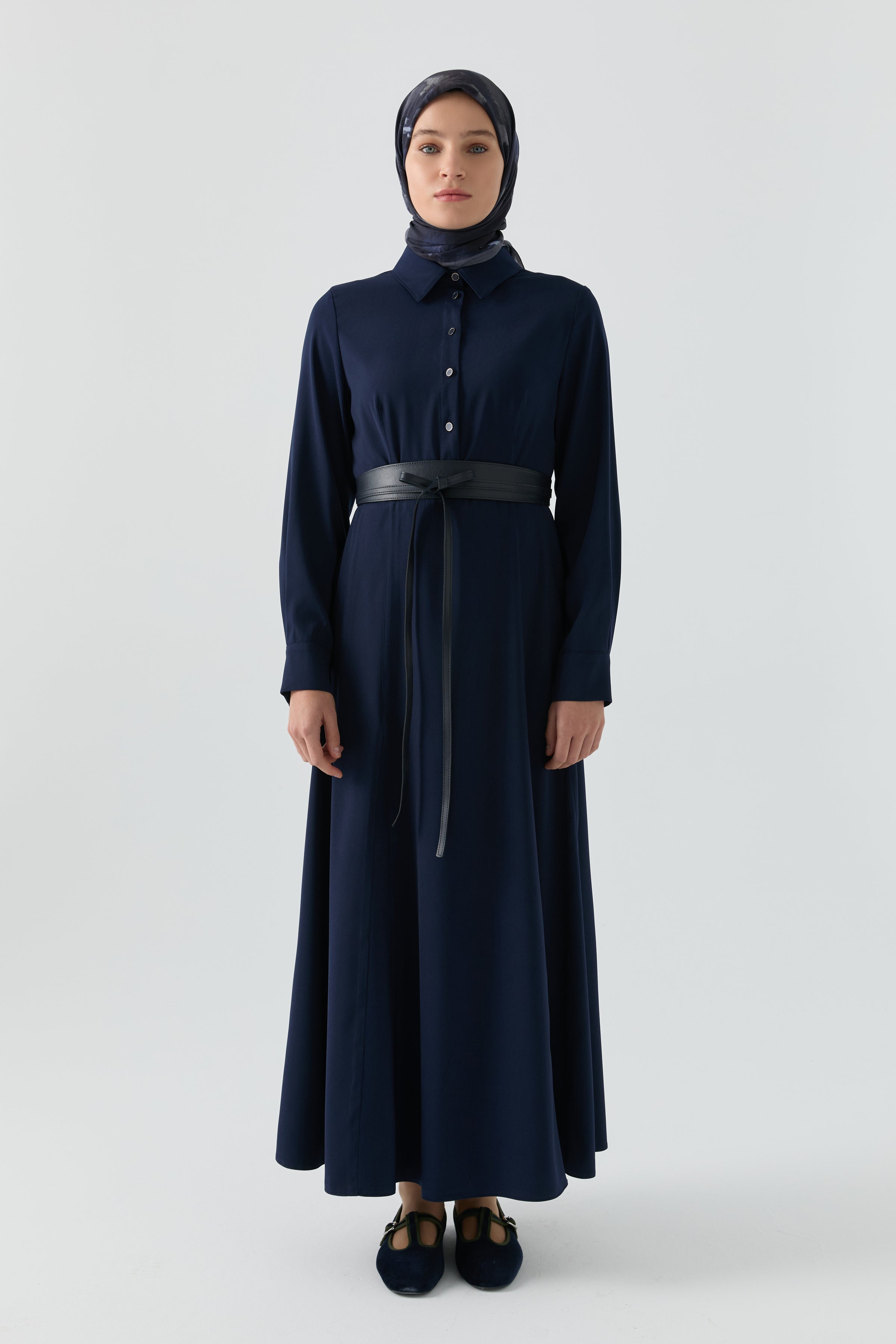 Offering a modern and strong stance, this dress emphasizes elegance by highlighting the silhouette with its leather belt detail.