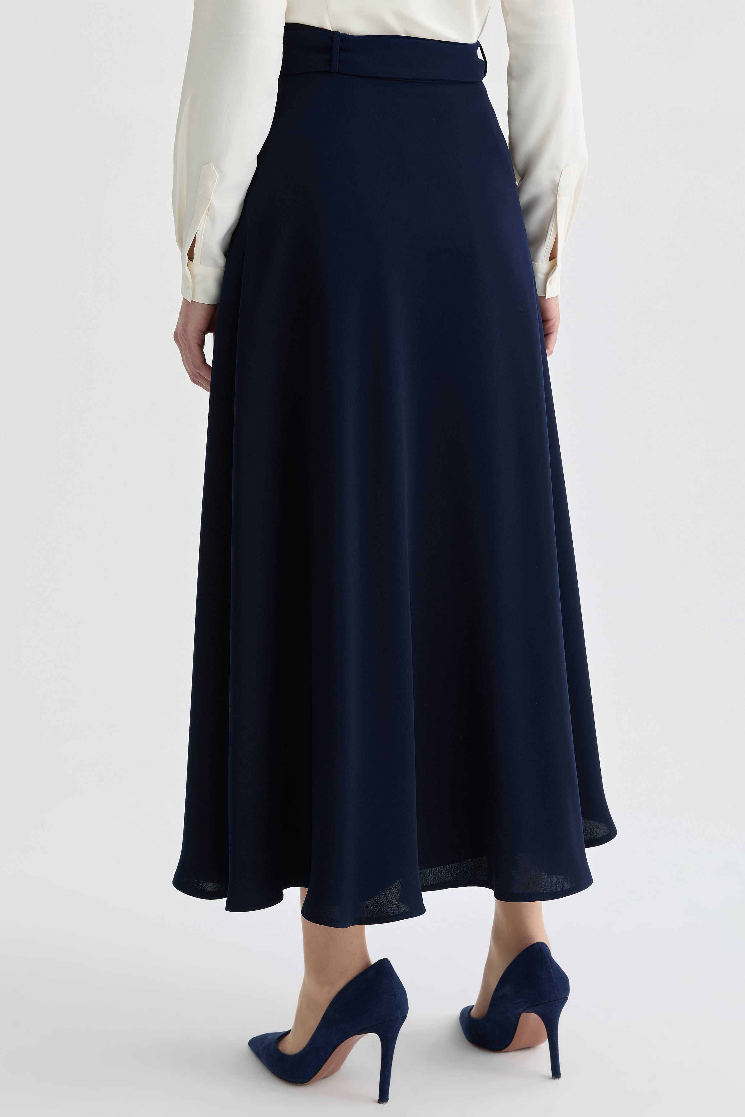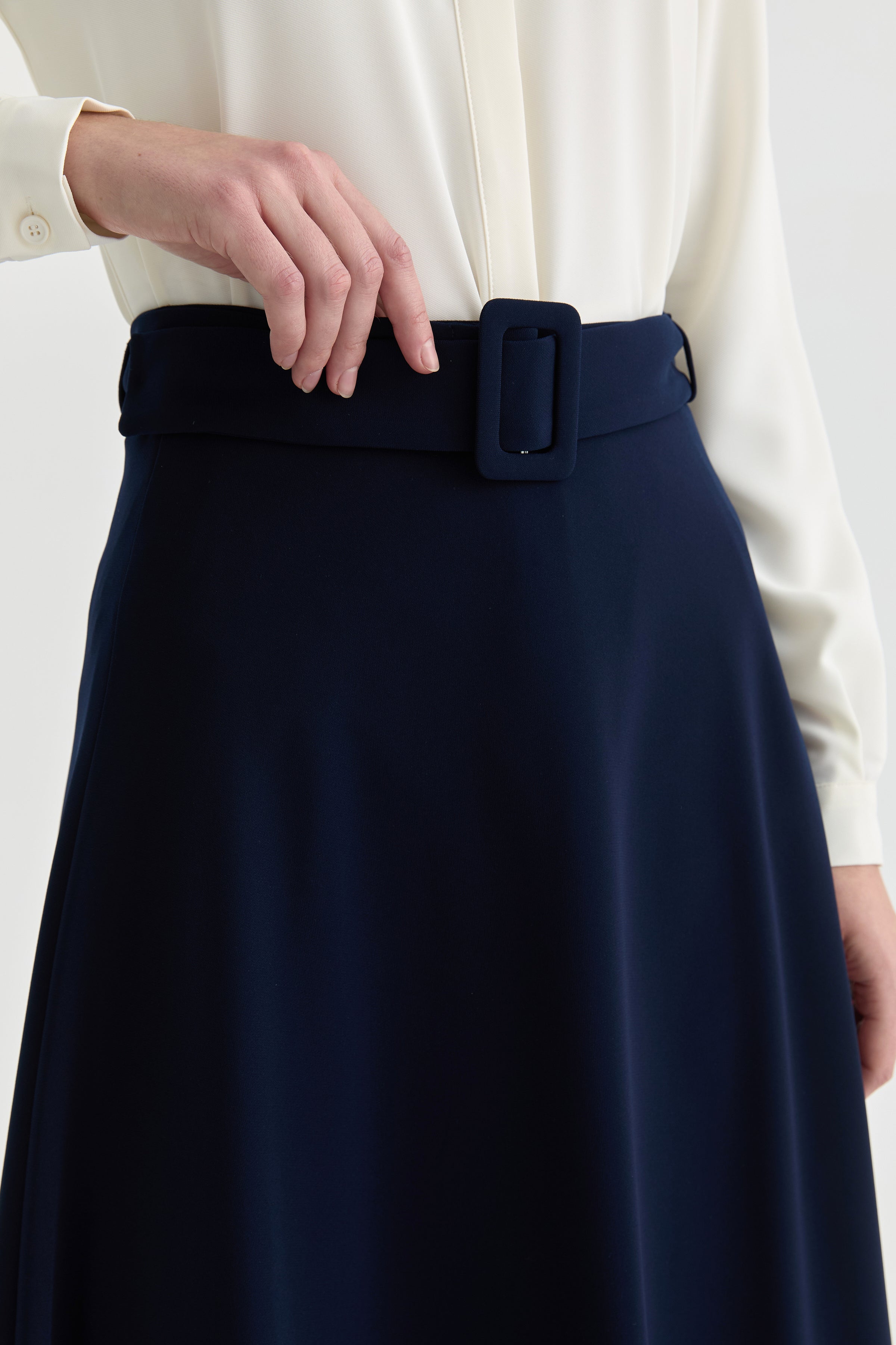 The skirt, which increases the dose of femininity with its flared form, gains movement with the belt detail.