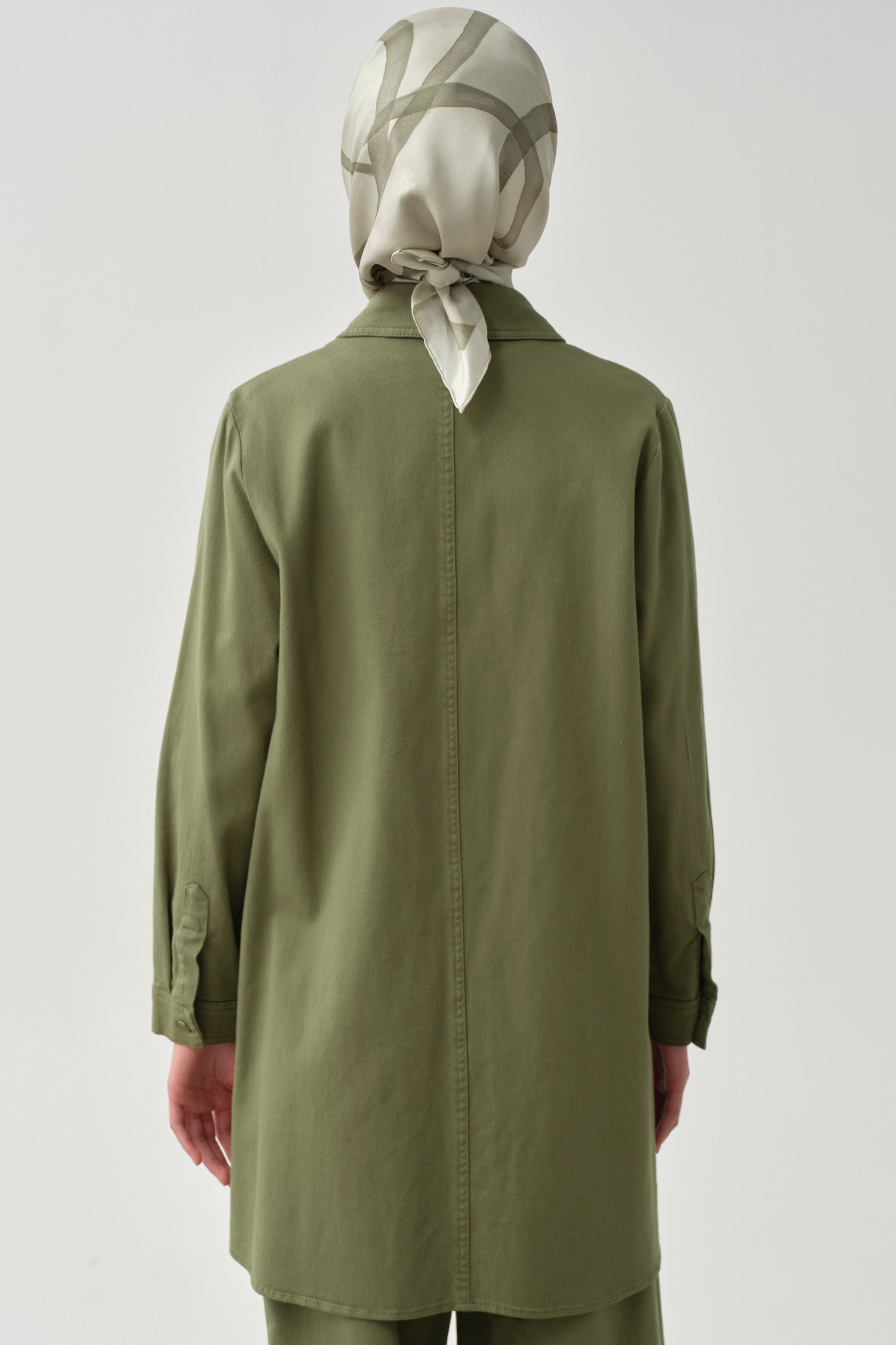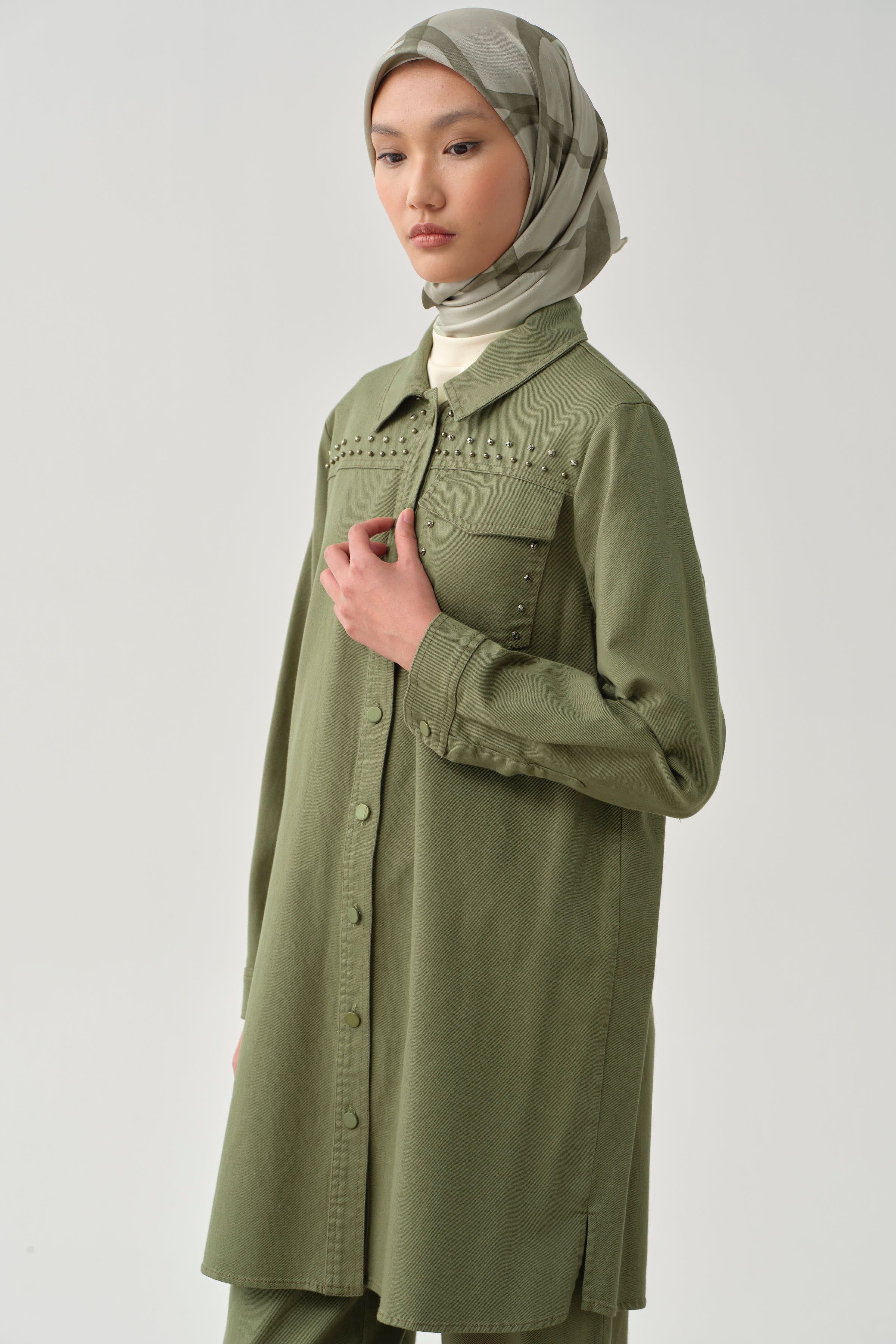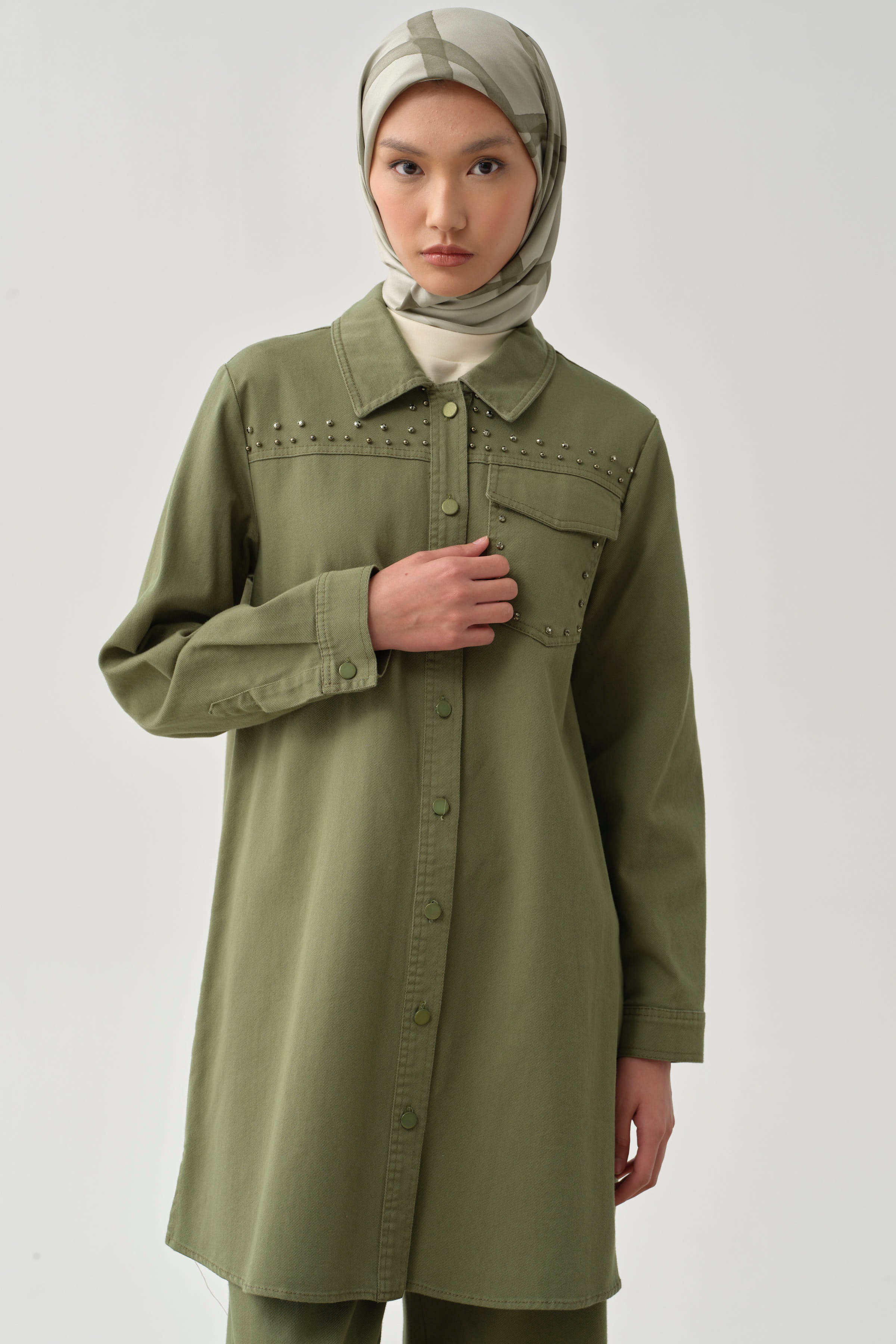This canvas shirt, enhanced with sparkling stone-set details, offers a chic and modern style. The slit detail provides freedom of movement while drawing attention with its strong and sophisticated look.