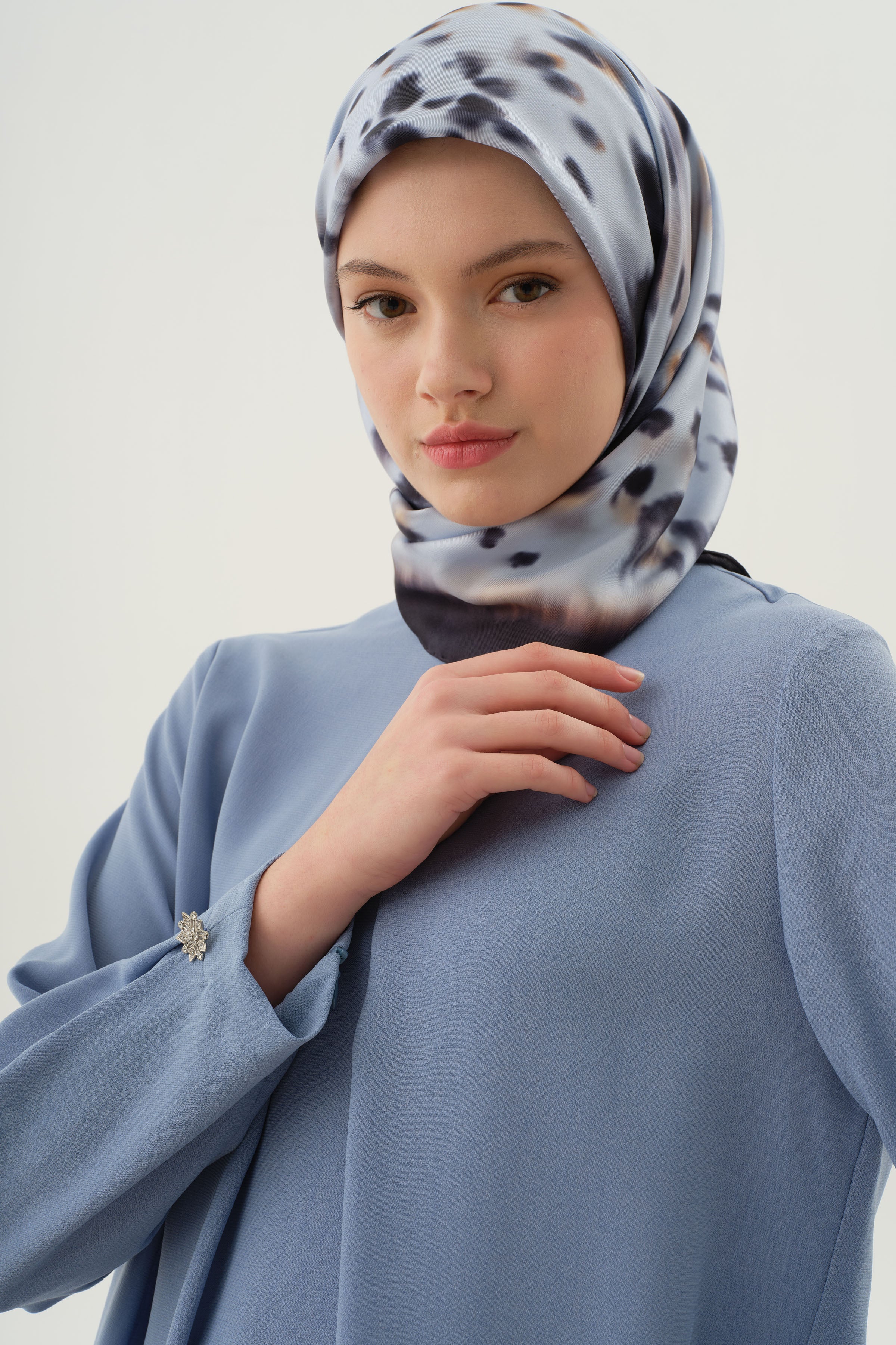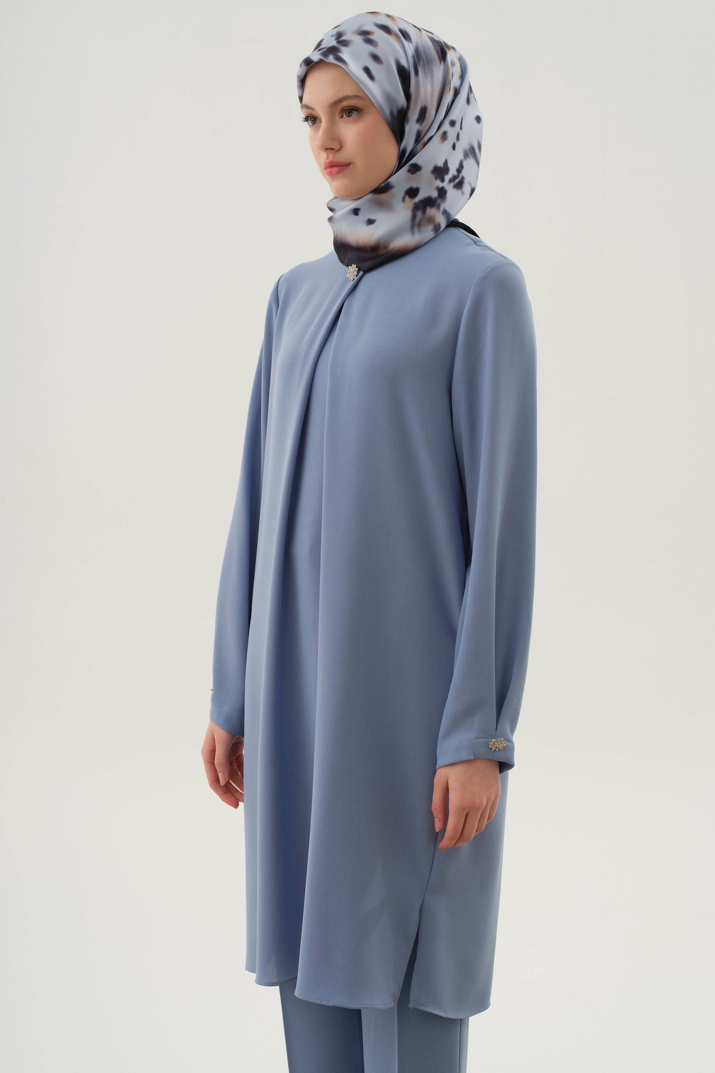 This tunic, which gains a feminine stance with its elegant pleat details and sparkling brooch touches, combines classic elegance with modern design. The meticulous workmanship in the collar and arm area adds elegance to your look. An ideal piece for those who want to make a difference on special days and invitations.