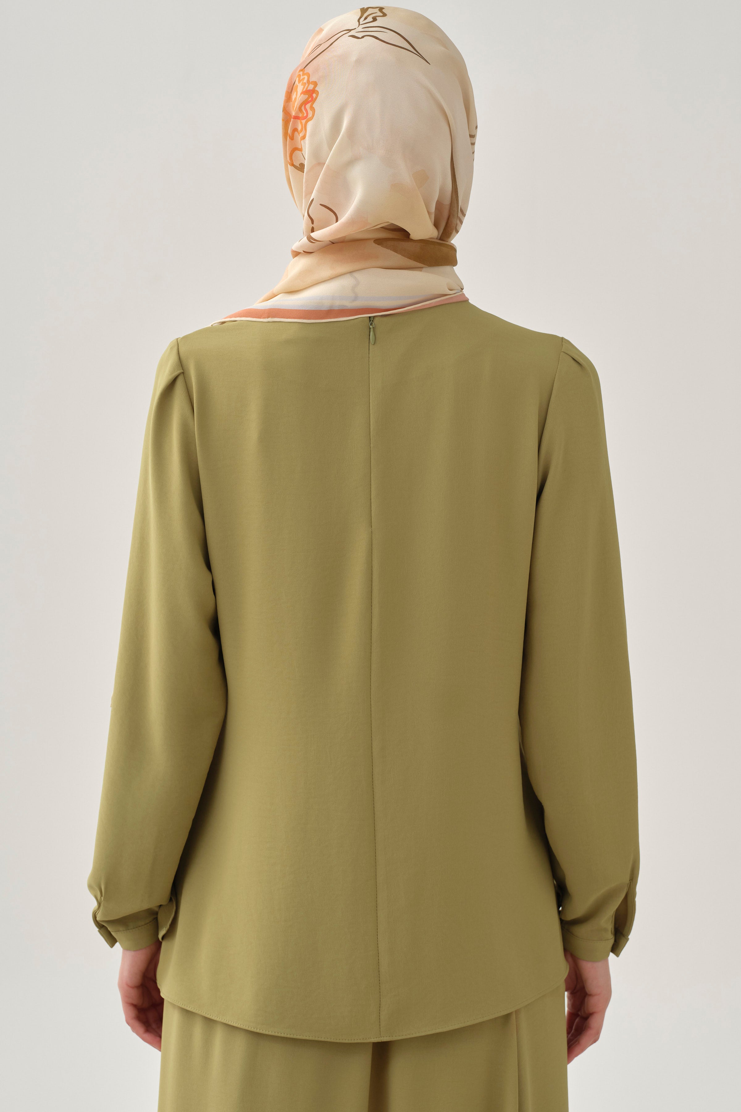 A modern interpretation of timeless elegance: Wrap Detail Blouse highlights elegance with its body-adapting cut and cross-closure detail. Thanks to its wrap design, it emphasizes the waistline and creates a feminine and elegant silhouette.