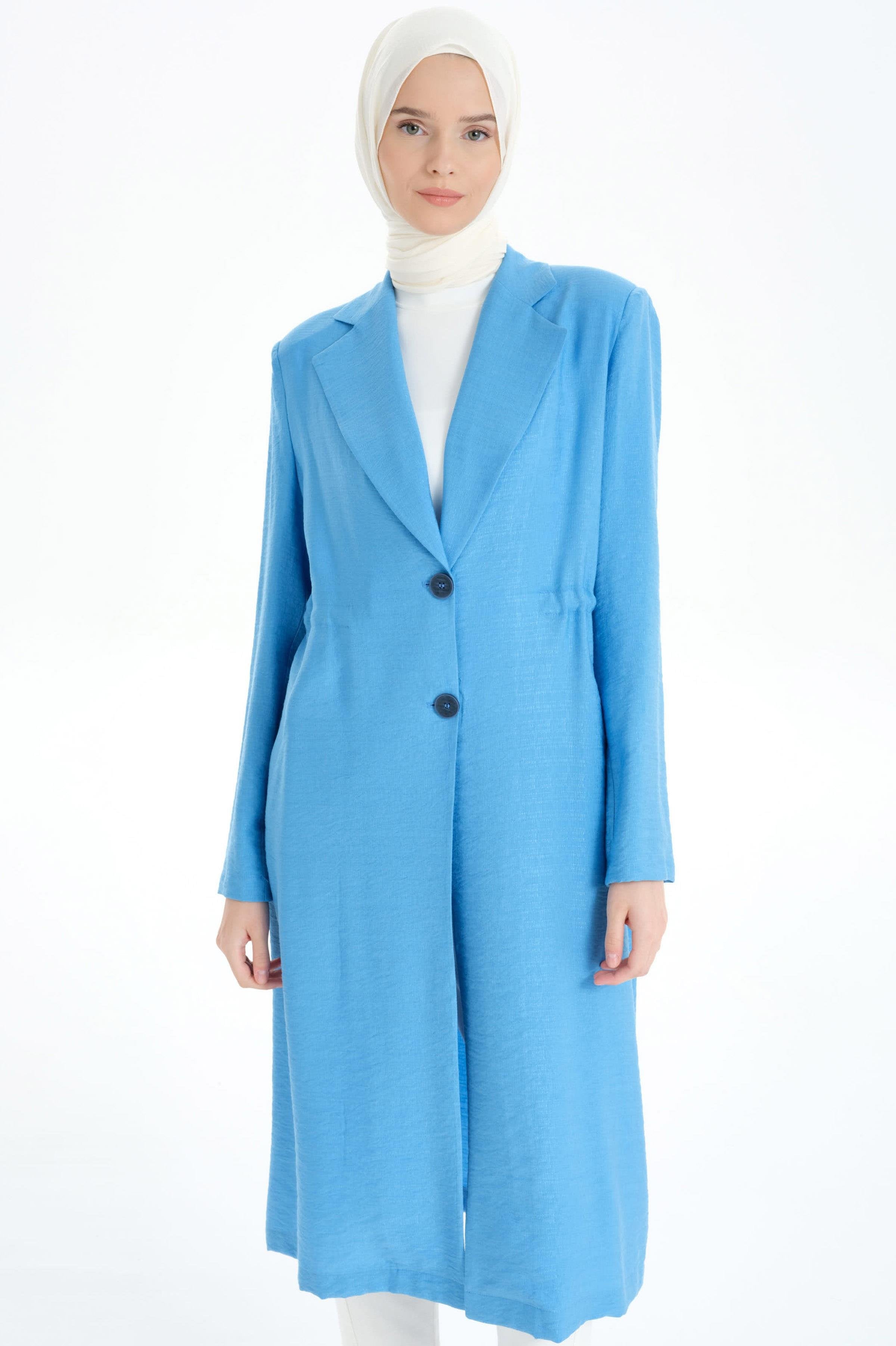 This long jacket, which stands out with its classic and stylish design, adapts to every style and every occasion. While it offers a modern look with its two-button structure, it also creates an elegant silhouette with its long cut.