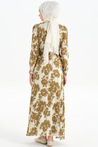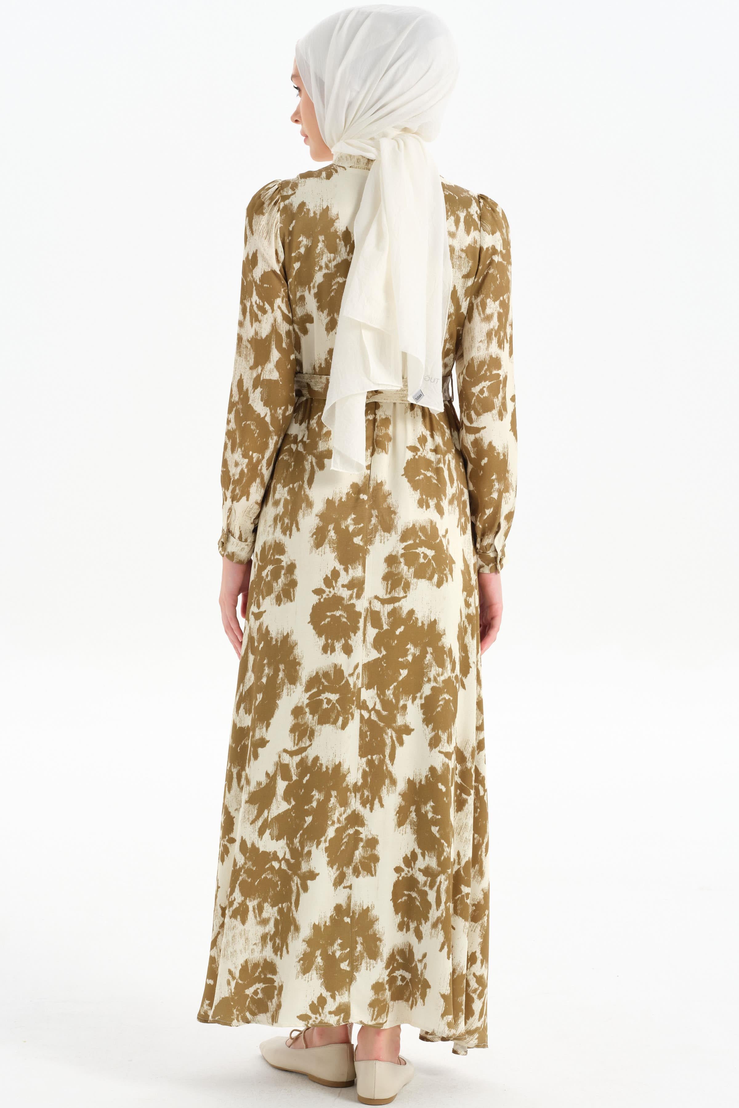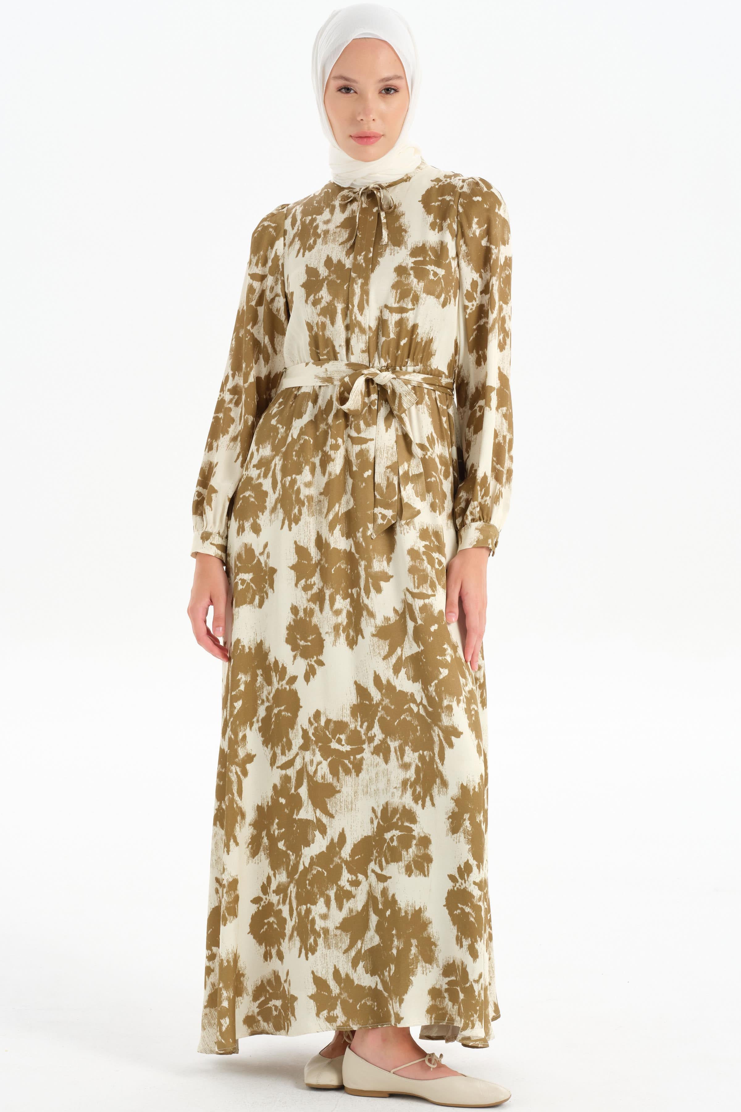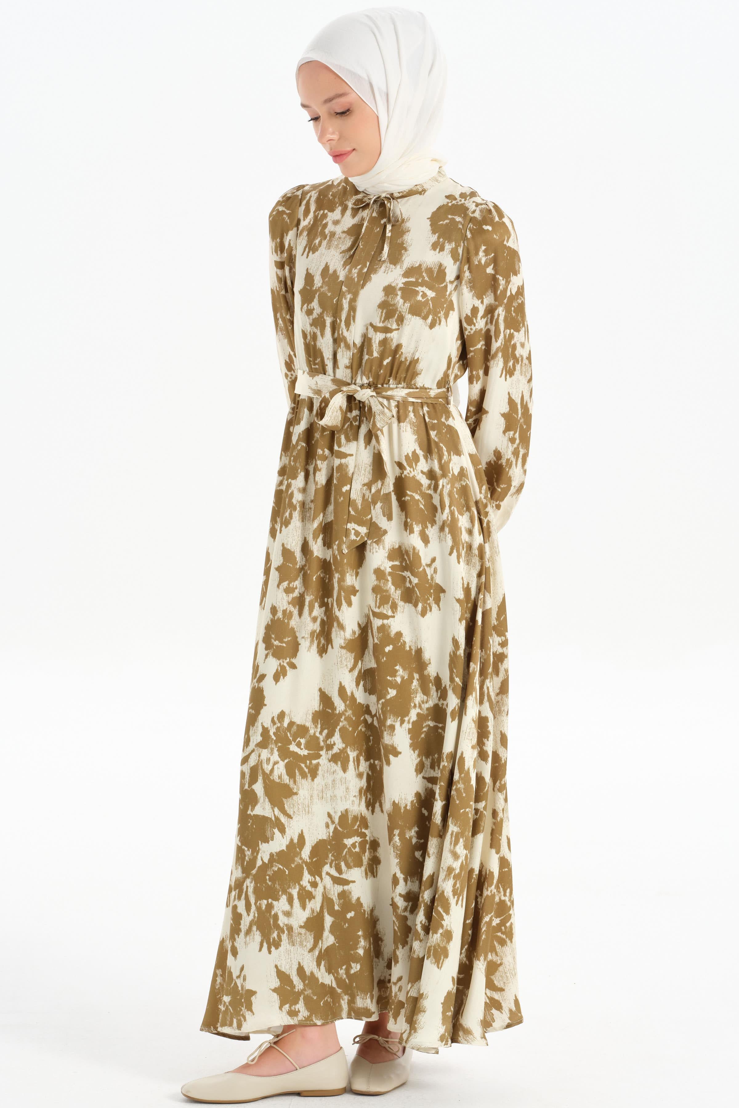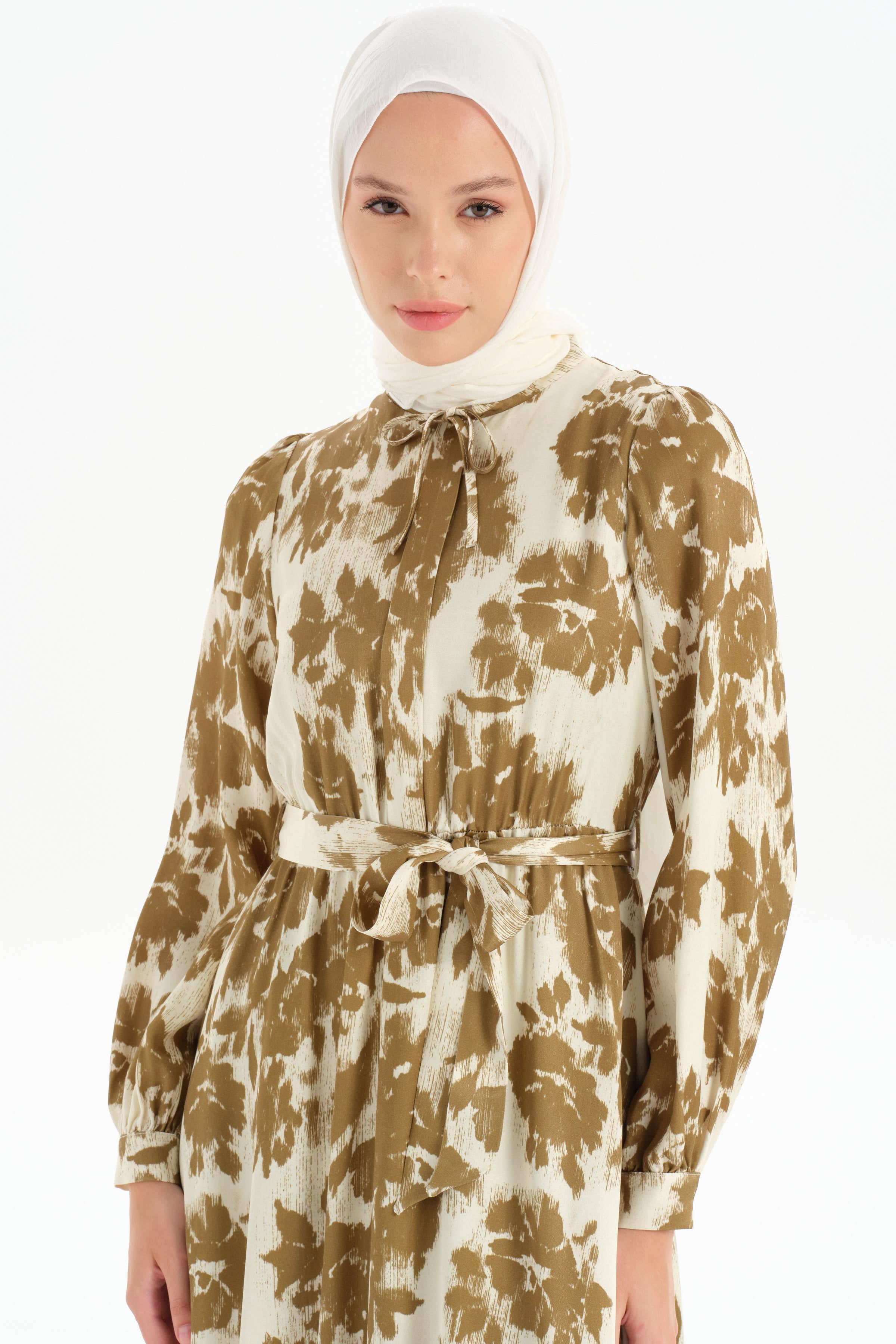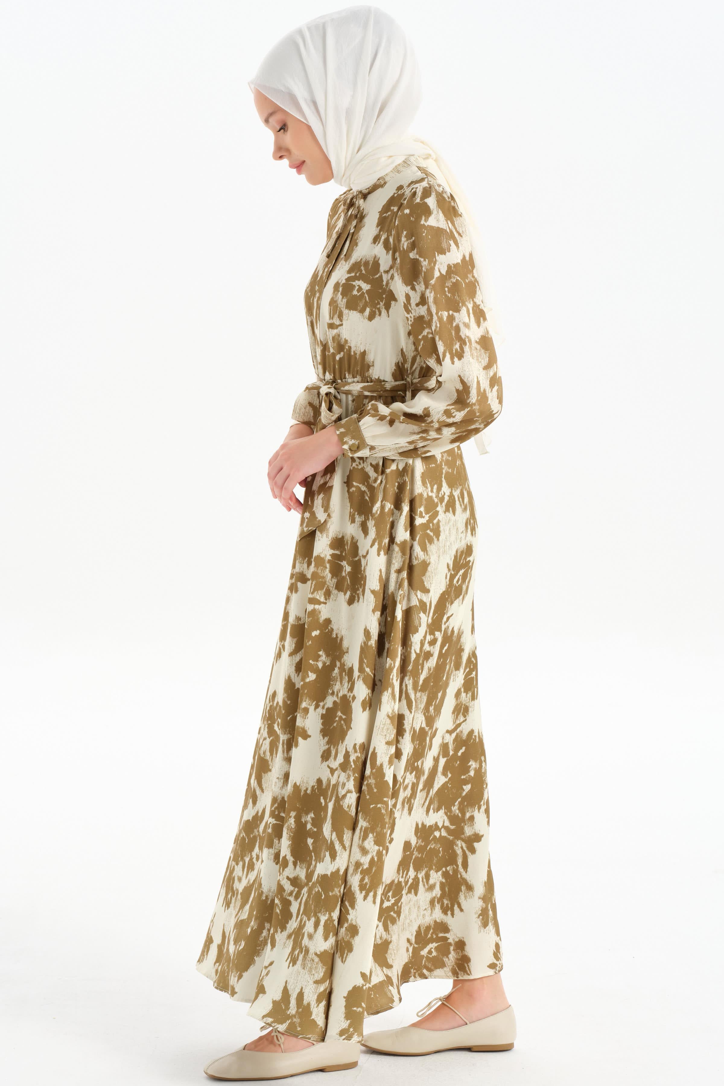 The elasticated waist design adds both aesthetic and functional features to the dress, while the patterned fabric provides a modern and dynamic look.