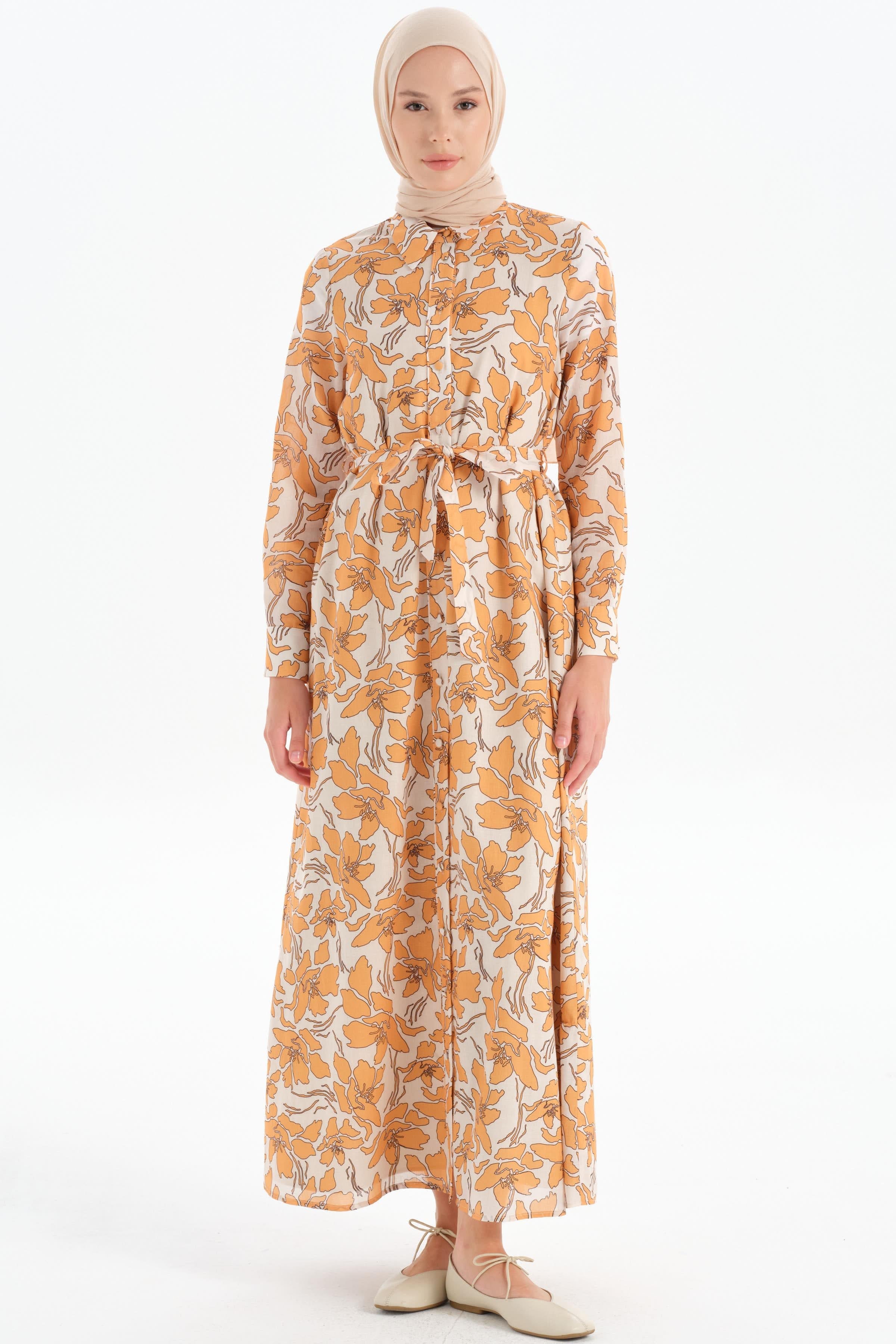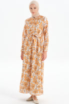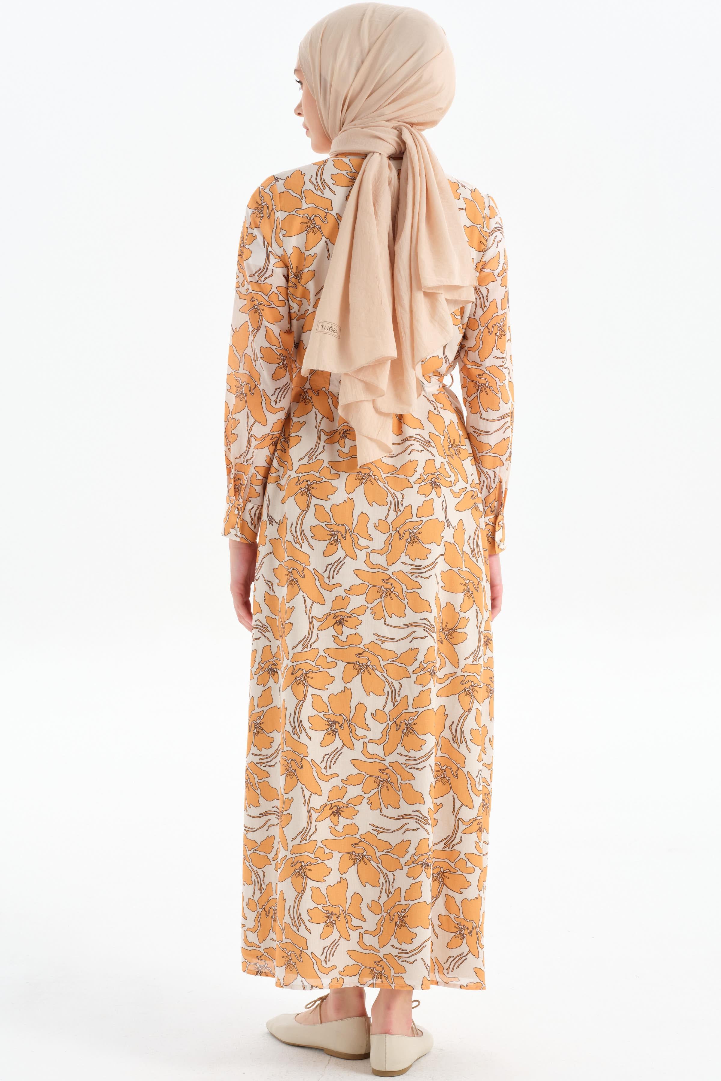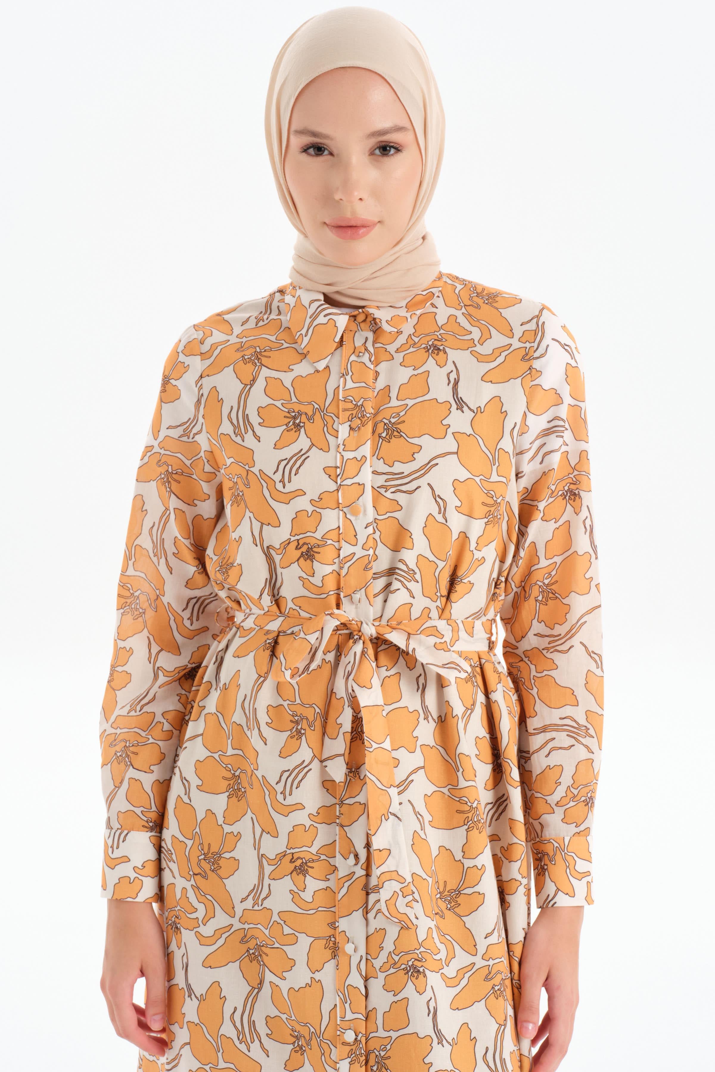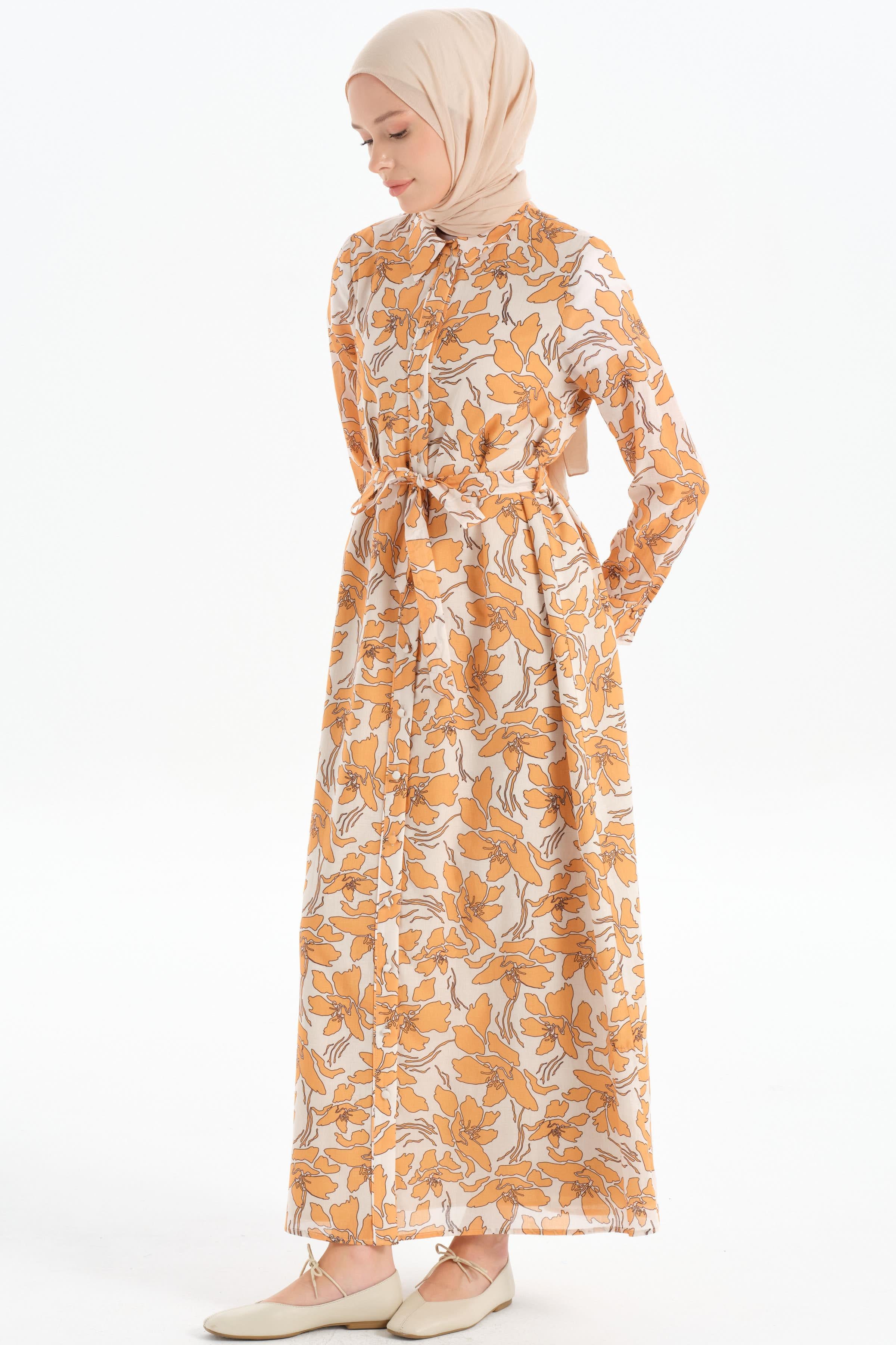 The belted design adds an elegant and feminine touch to the dress, while the patterned fabric provides a modern and dynamic look.