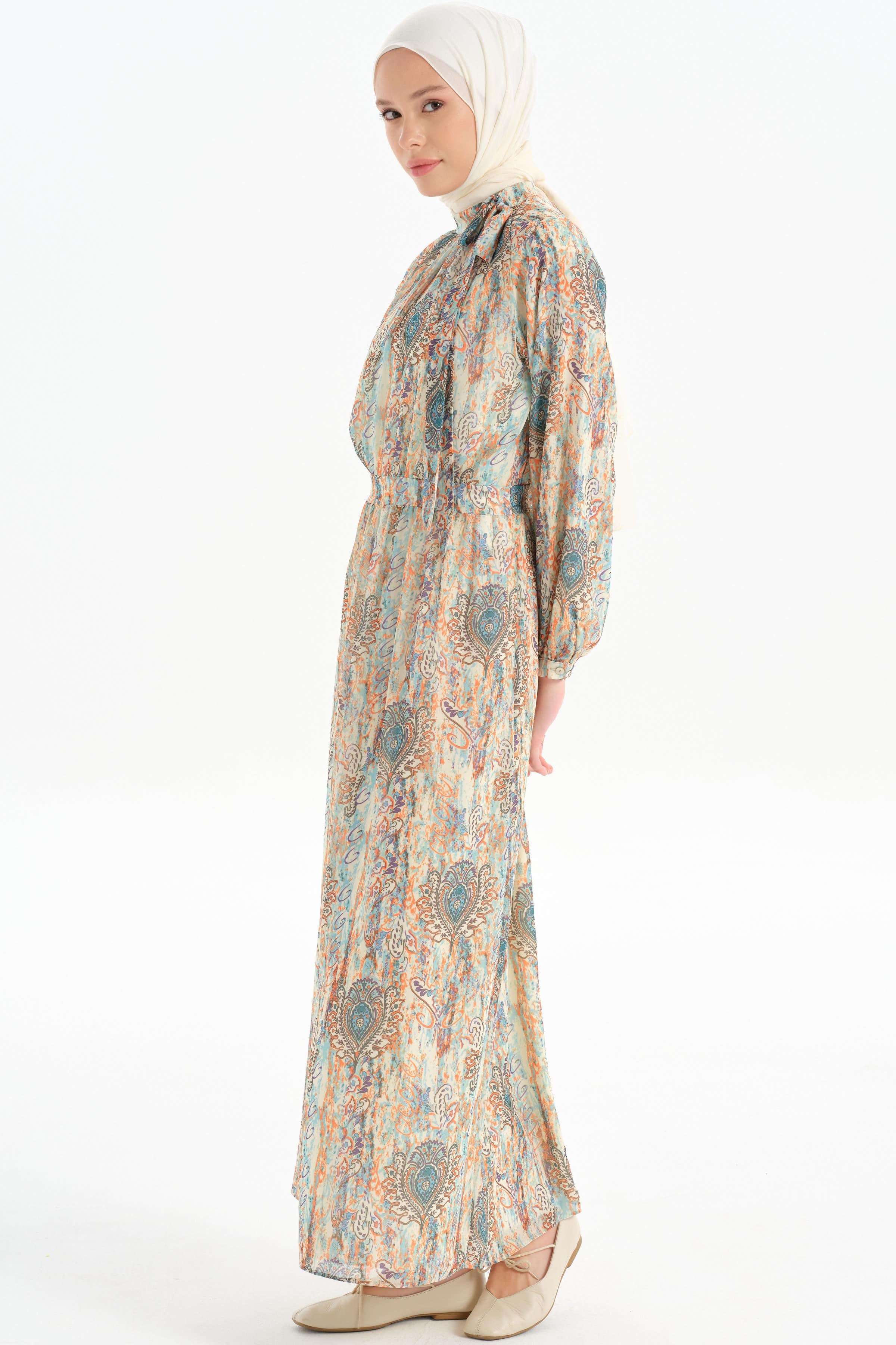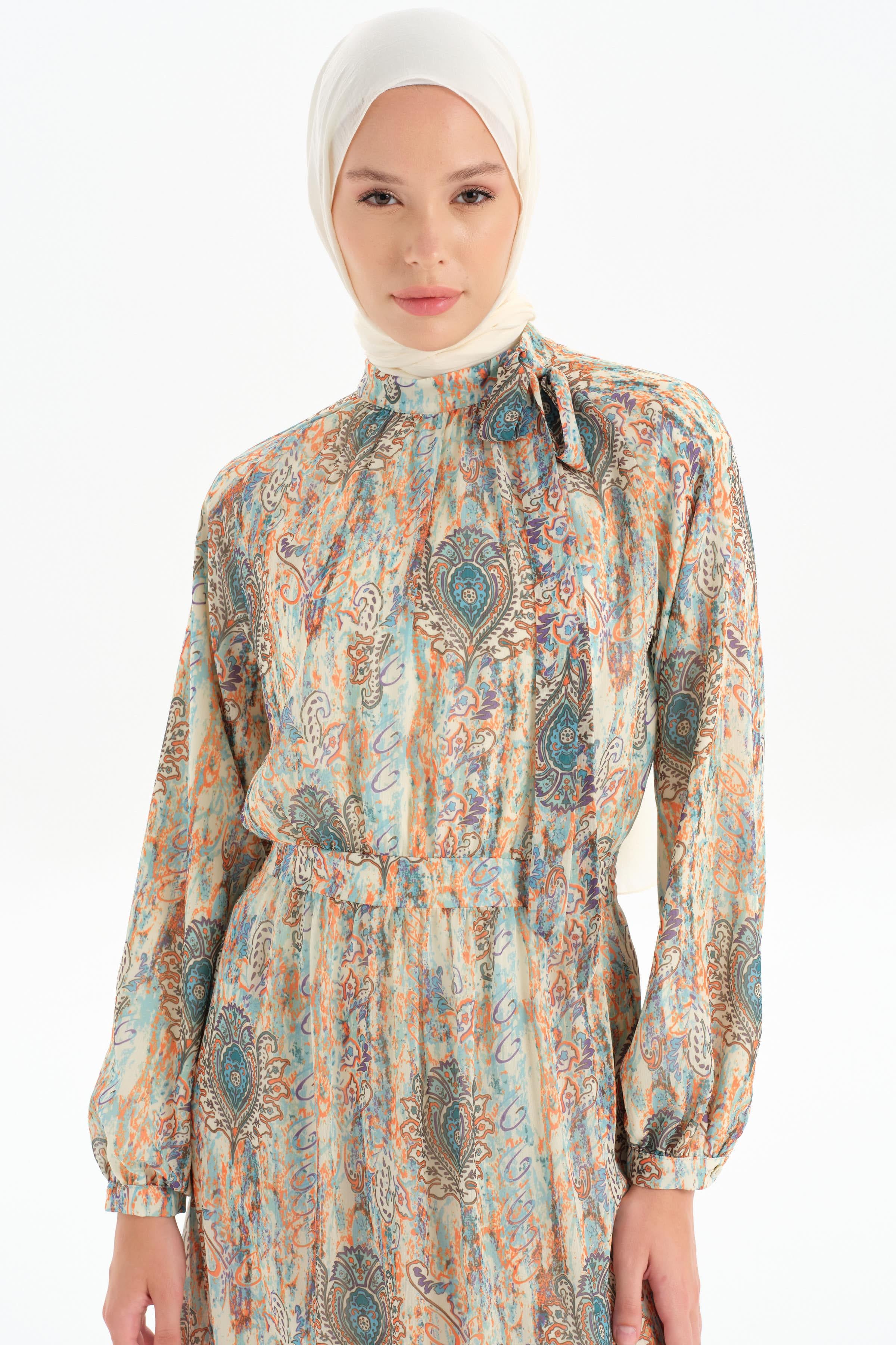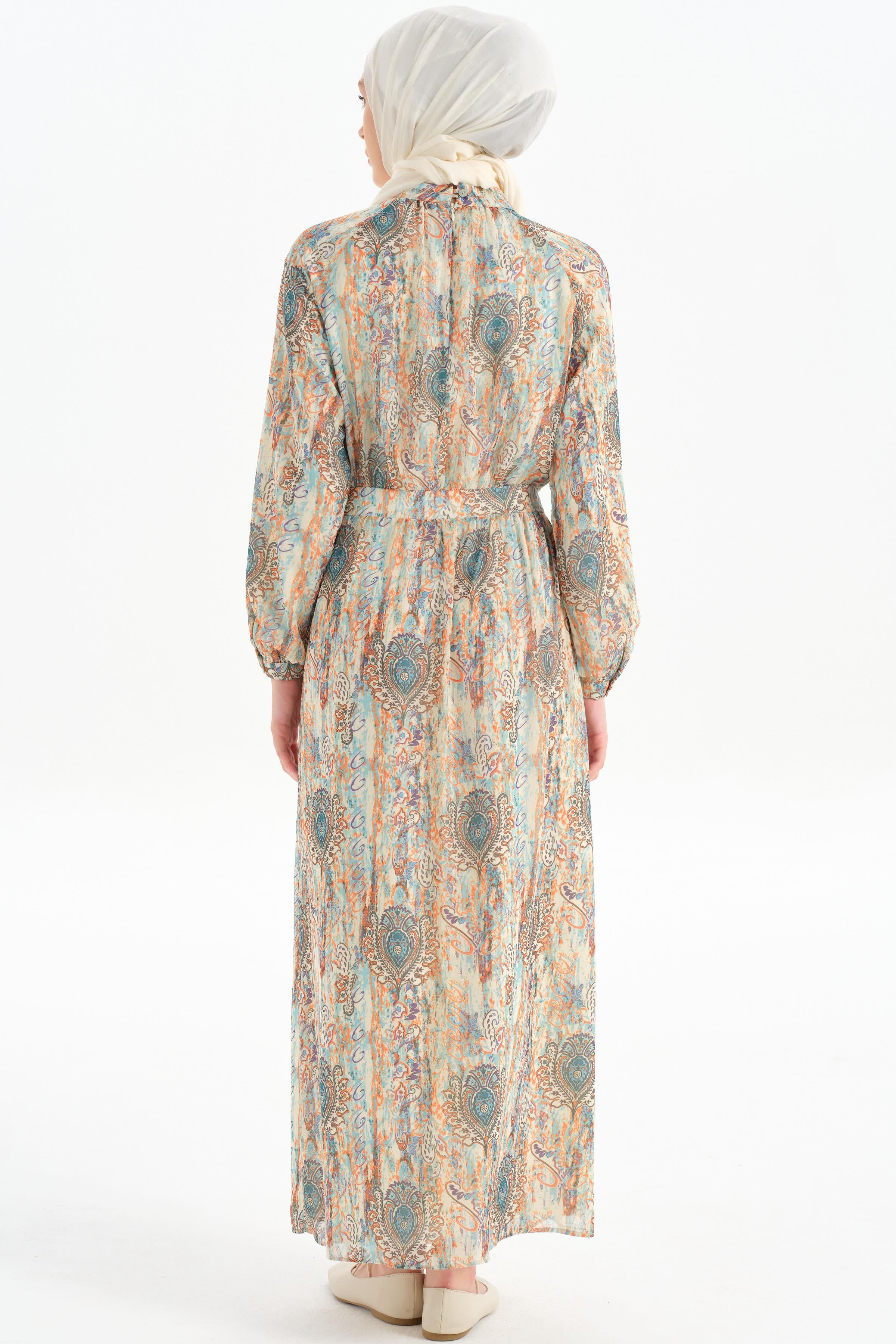 The patterned chiffon fabric gives the dress a modern and feminine look, while its lightness and elegance offer a comfortable wearing experience.