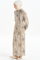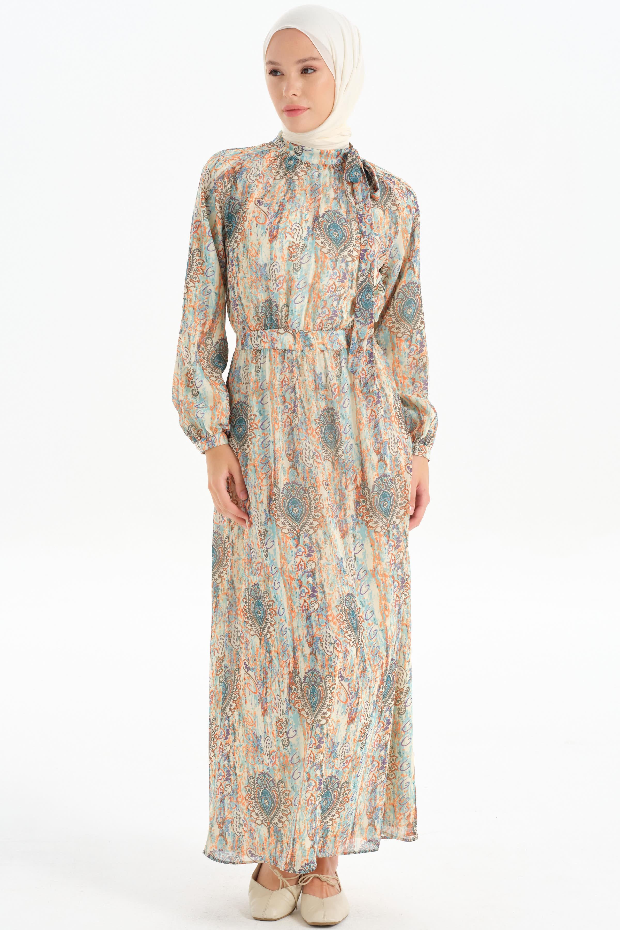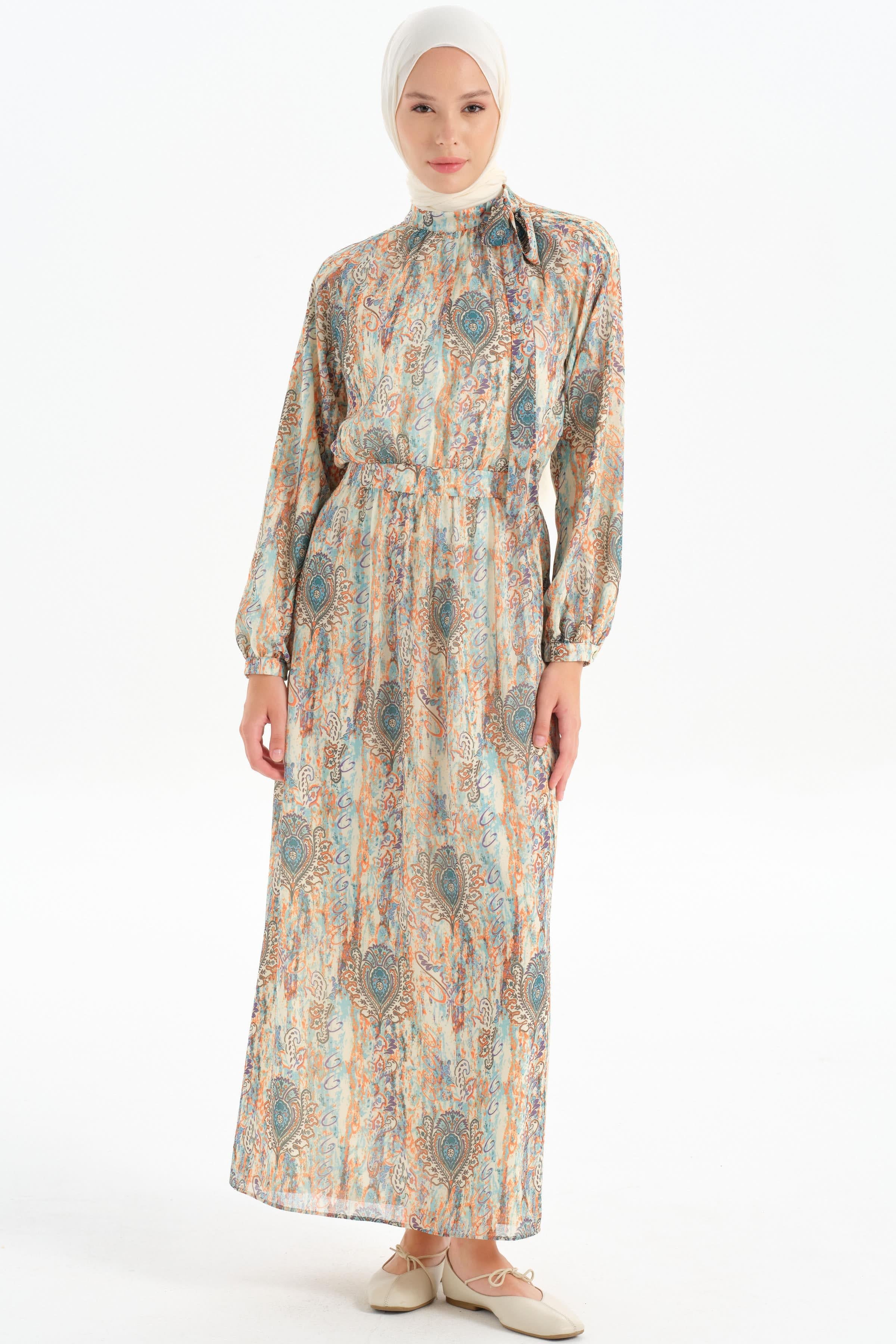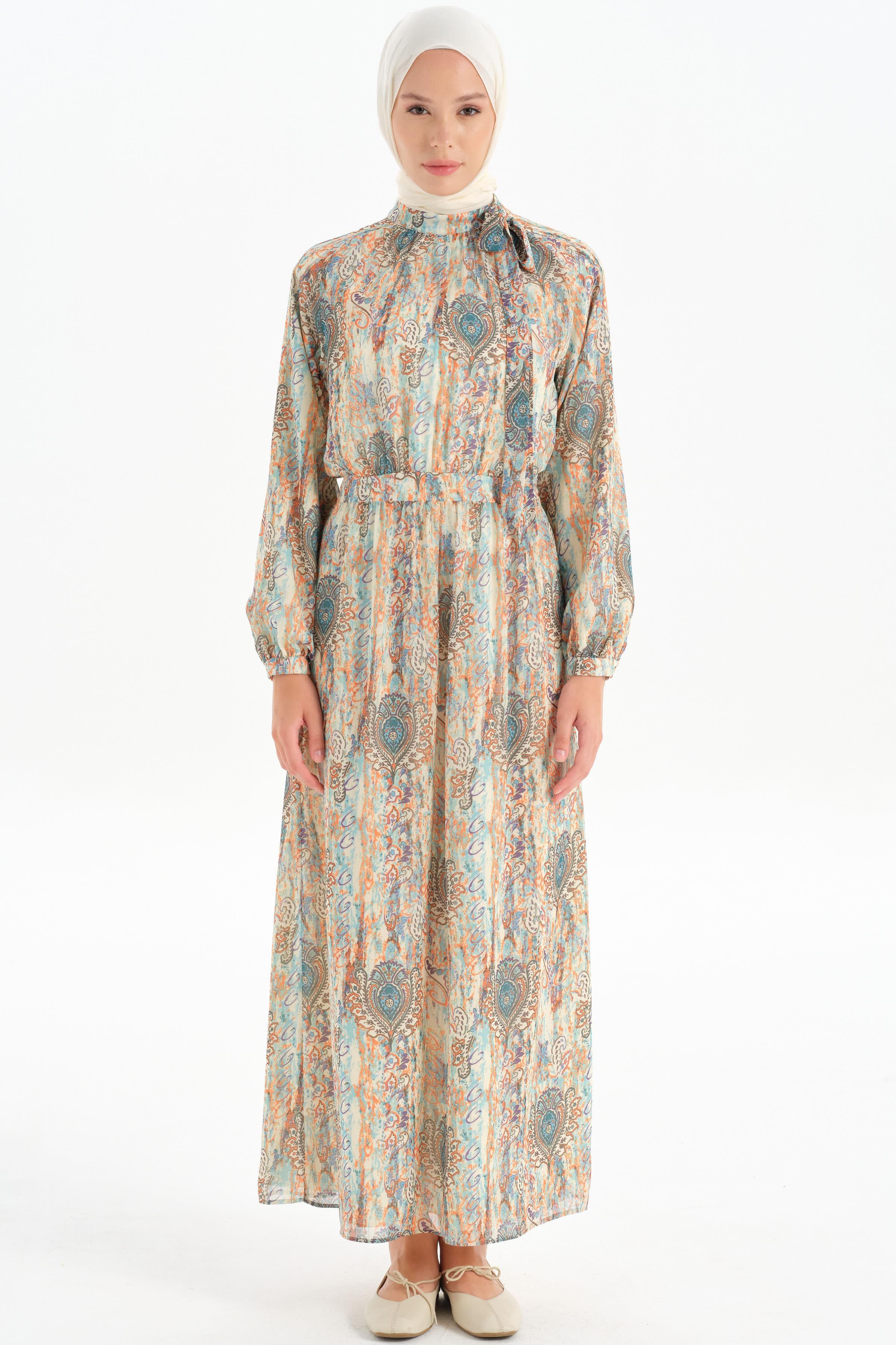 The patterned chiffon fabric gives the dress a modern and feminine look, while its lightness and elegance offer a comfortable wearing experience.