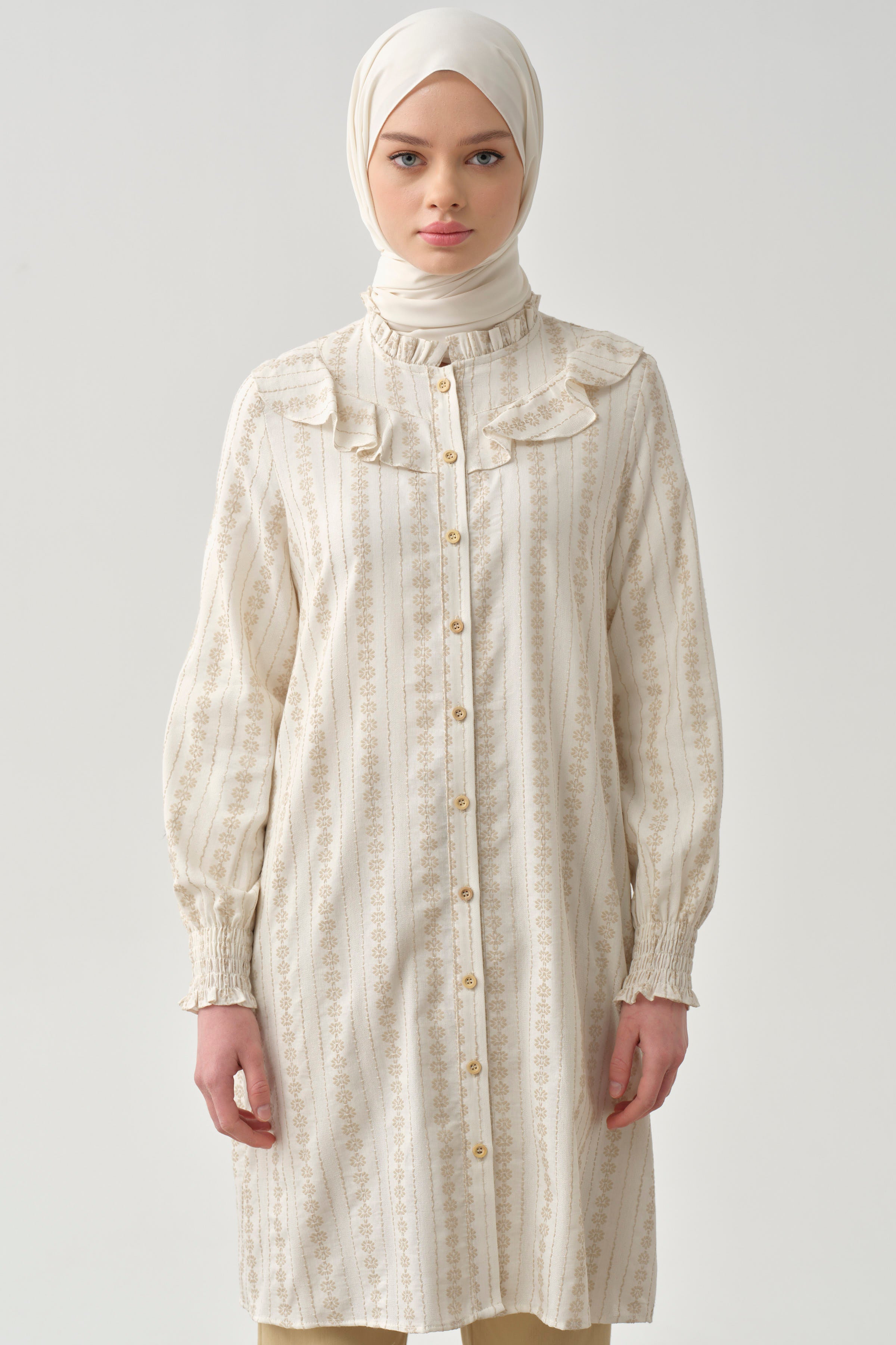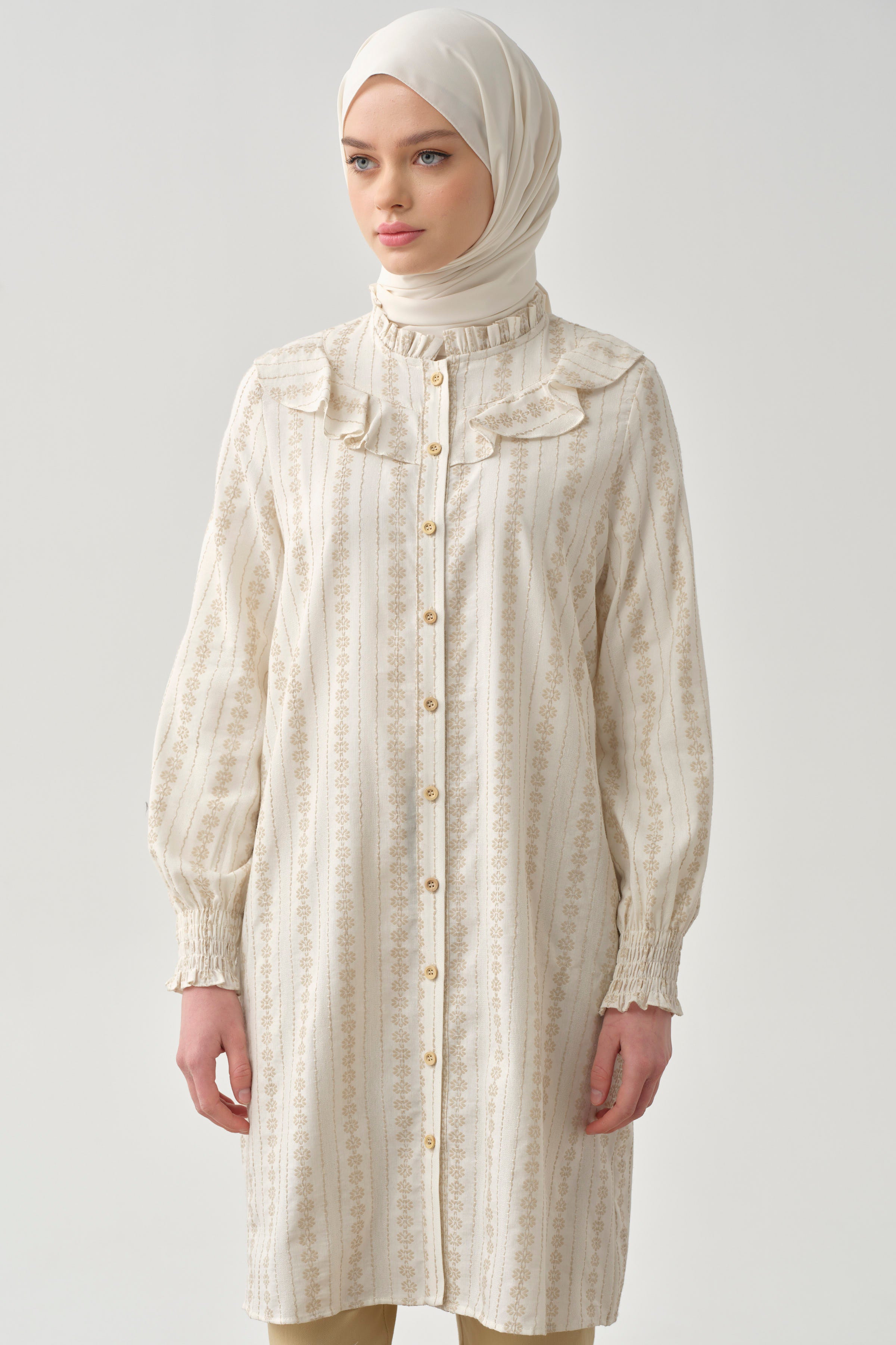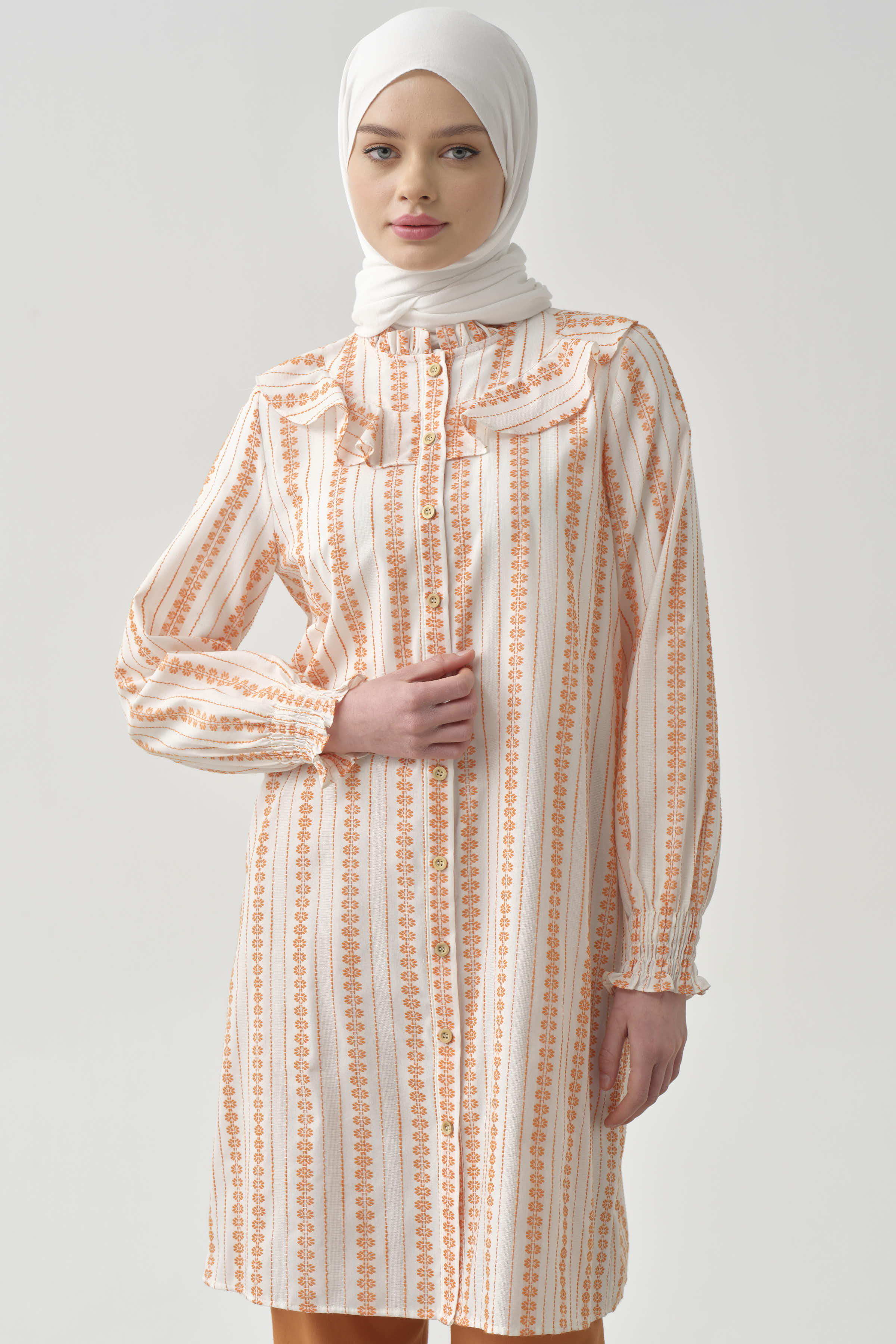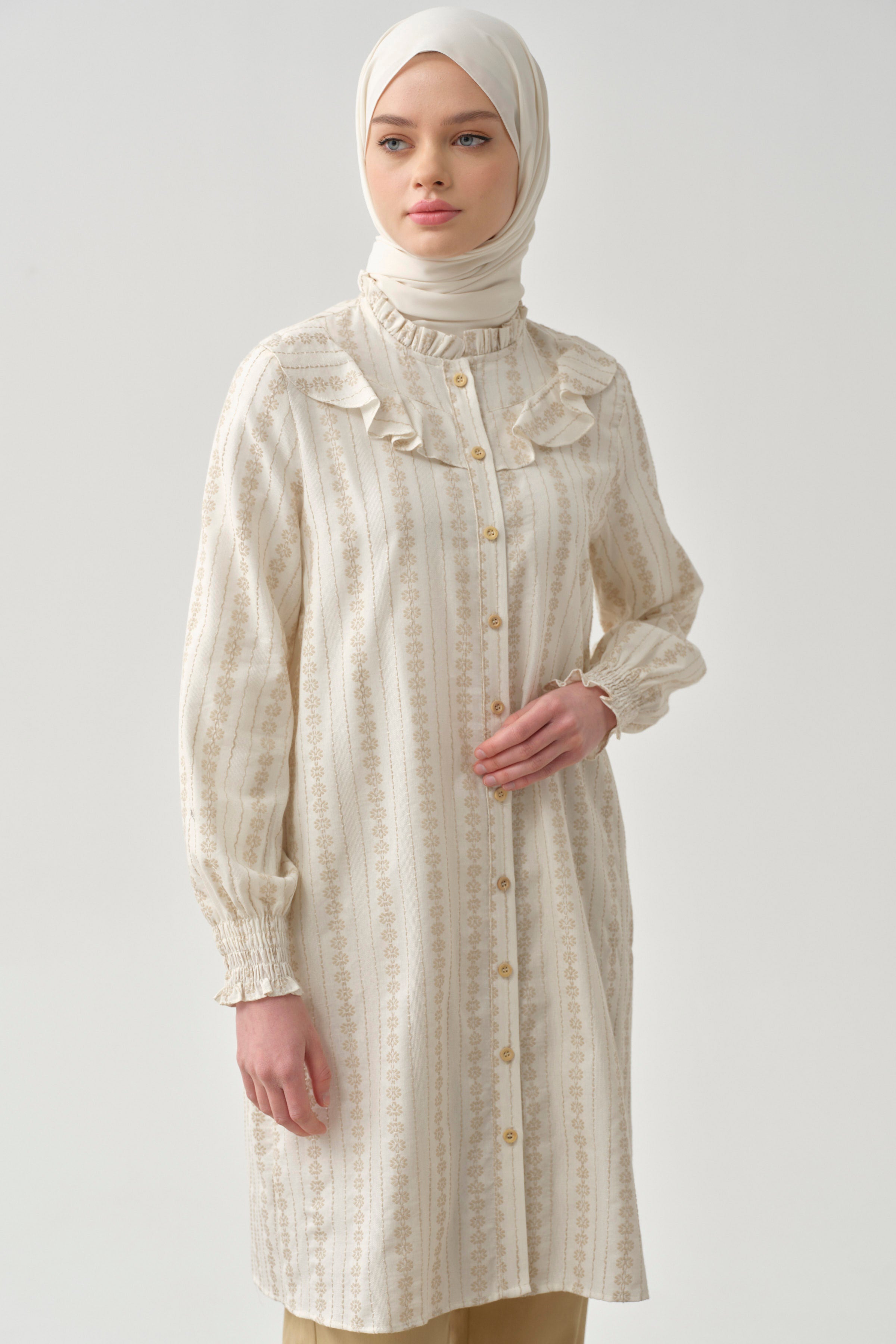 Adorned with ethnic patterns and delicate ruffle details, this dress offers a unique look. Thanks to its comfortable cut and light fabric, it provides freshness even on summer days. While the harmony of ethnic patterns and ruffle details adds an ethnic touch to your style, it also attracts attention with its modern cut.