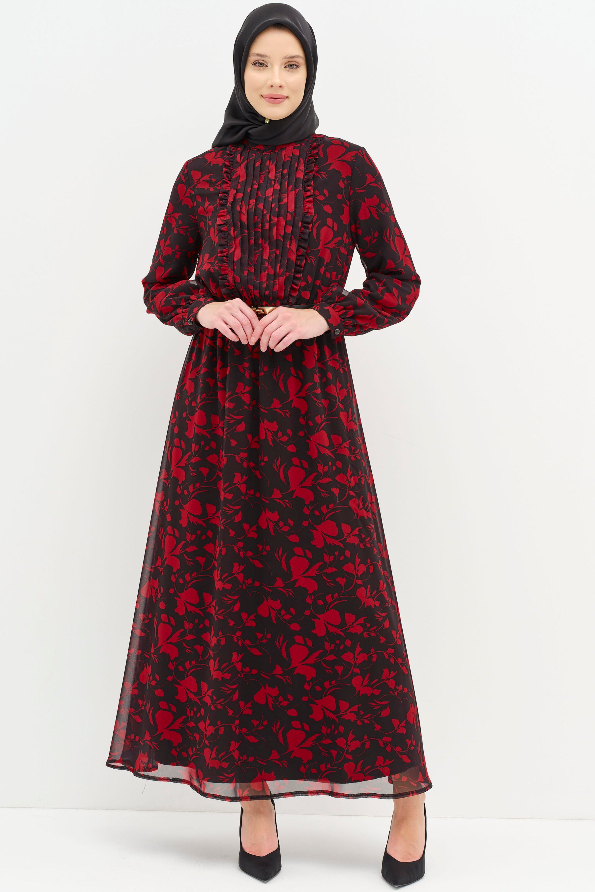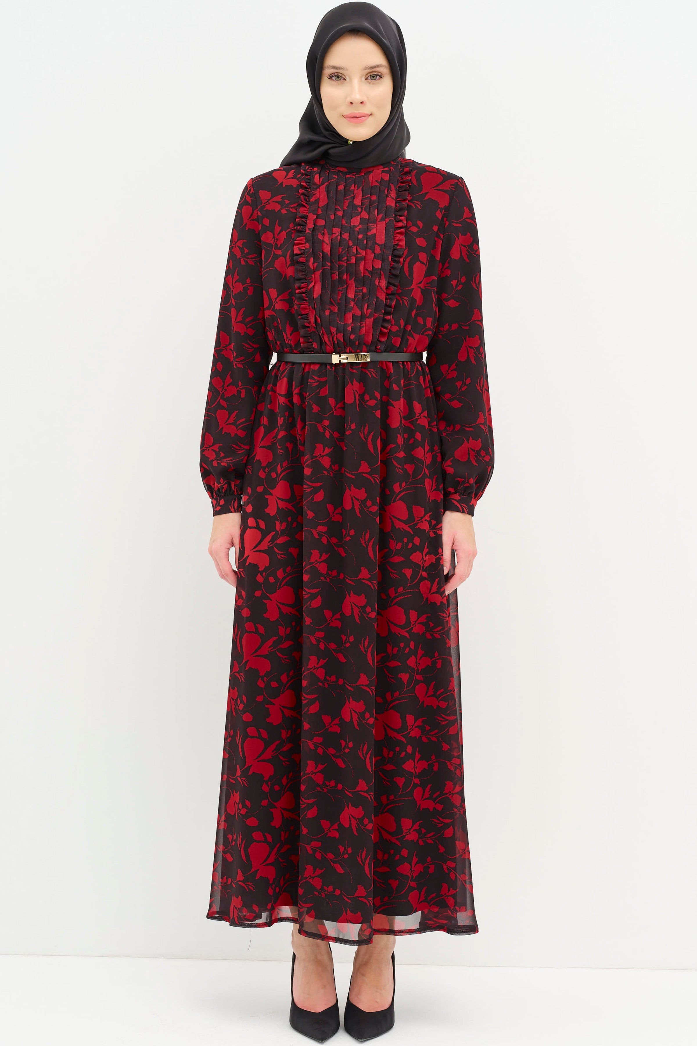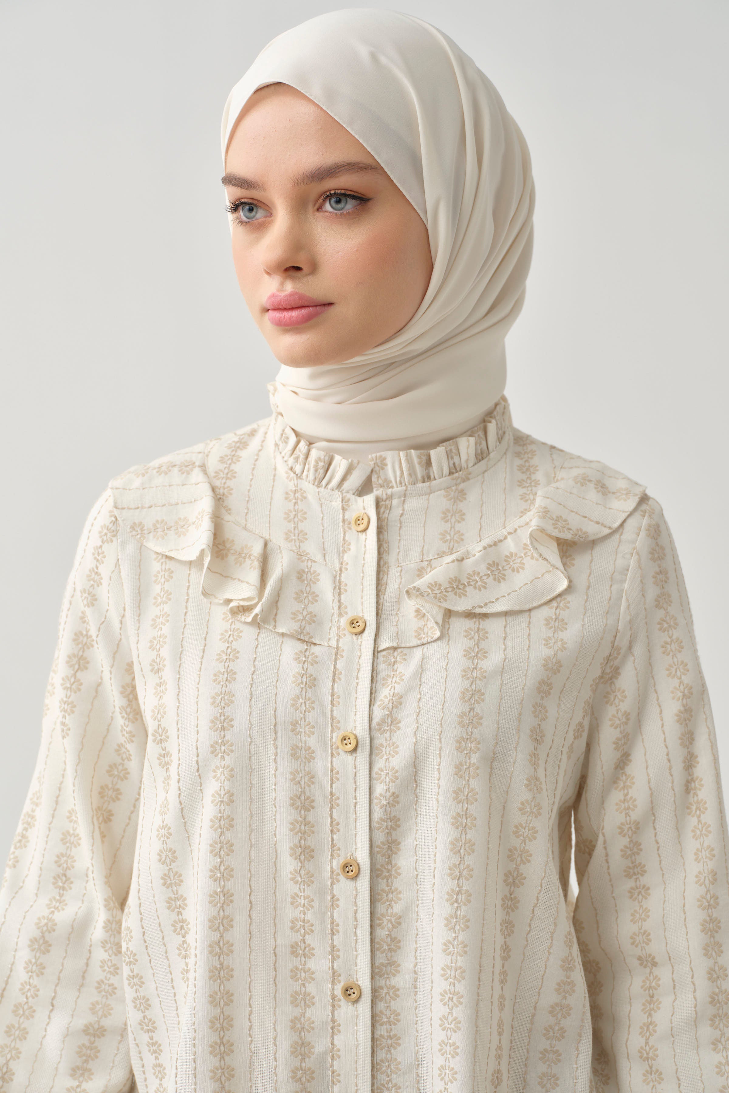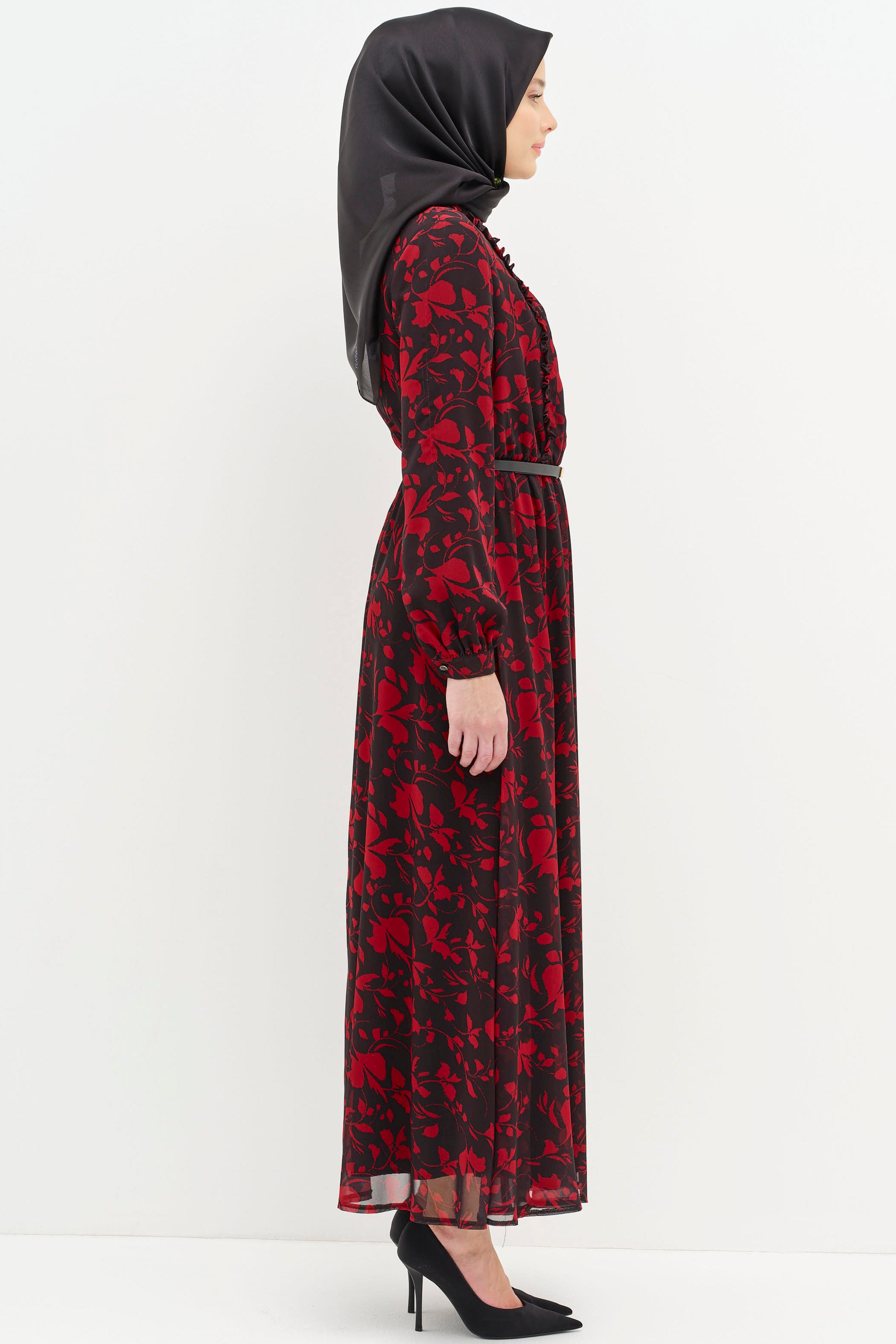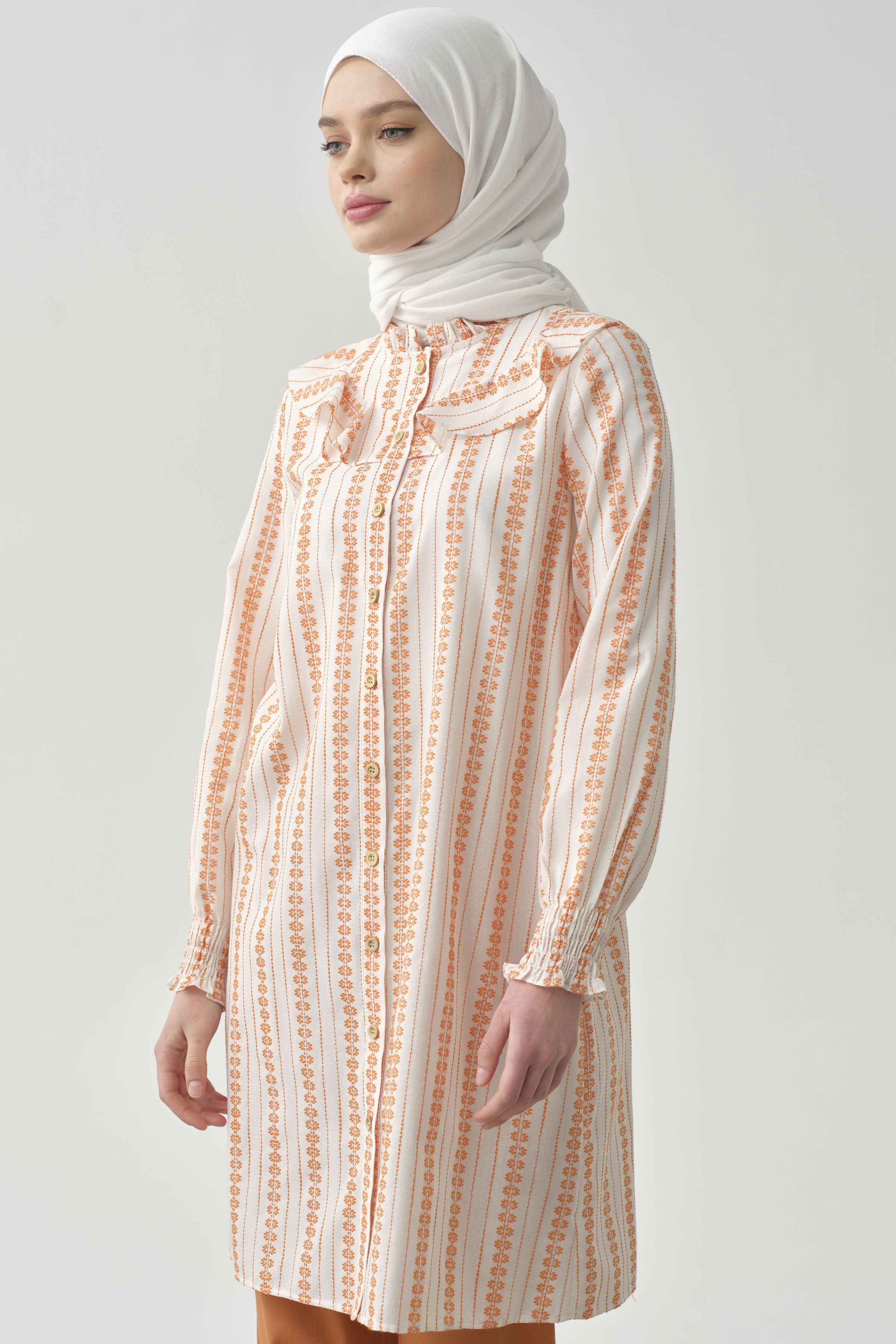 Adorned with ethnic patterns and delicate ruffle details, this dress offers a unique look. Thanks to its comfortable cut and light fabric, it provides freshness even on summer days. While the harmony of ethnic patterns and ruffle details adds an ethnic touch to your style, it also attracts attention with its modern cut.