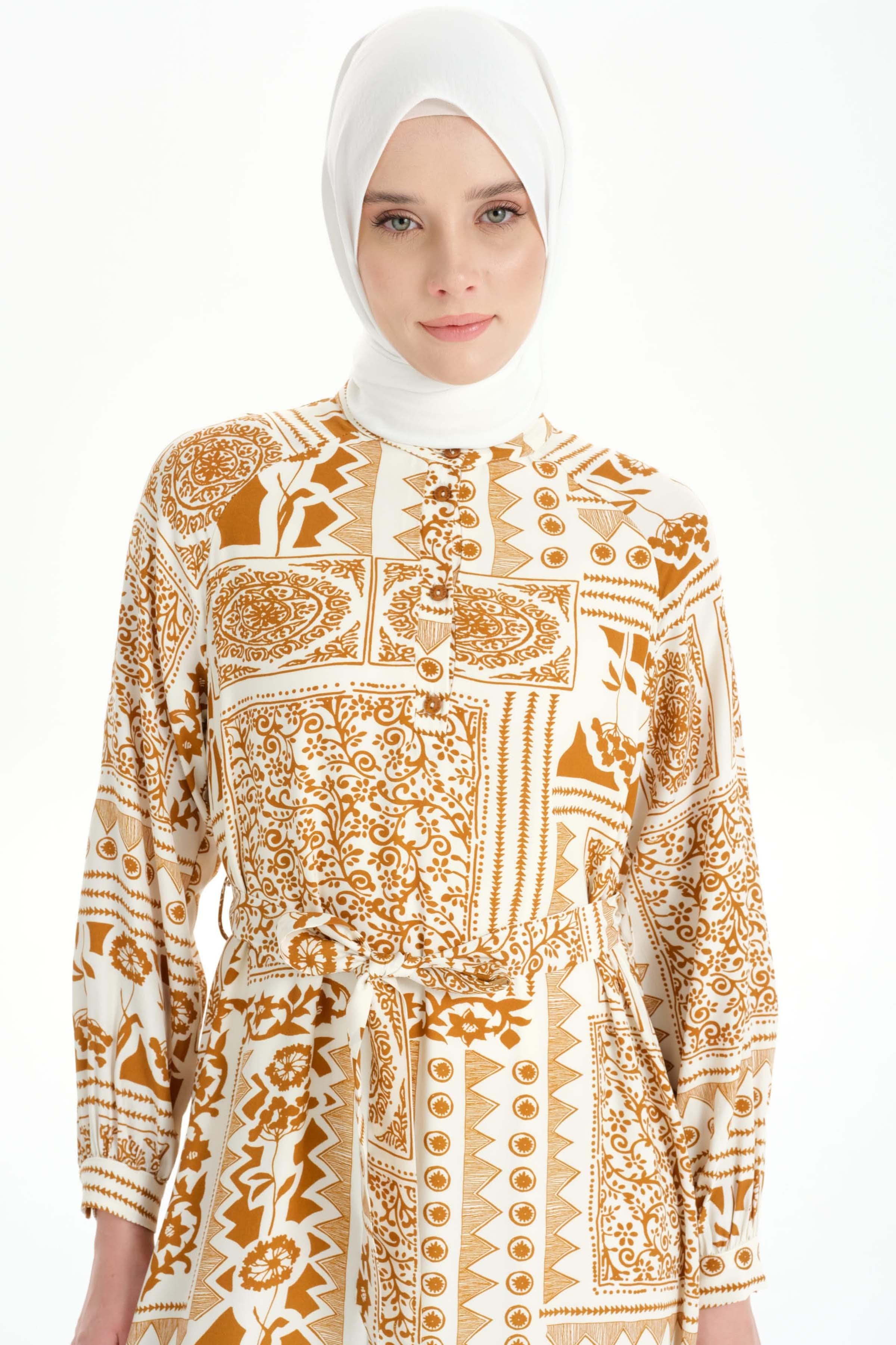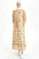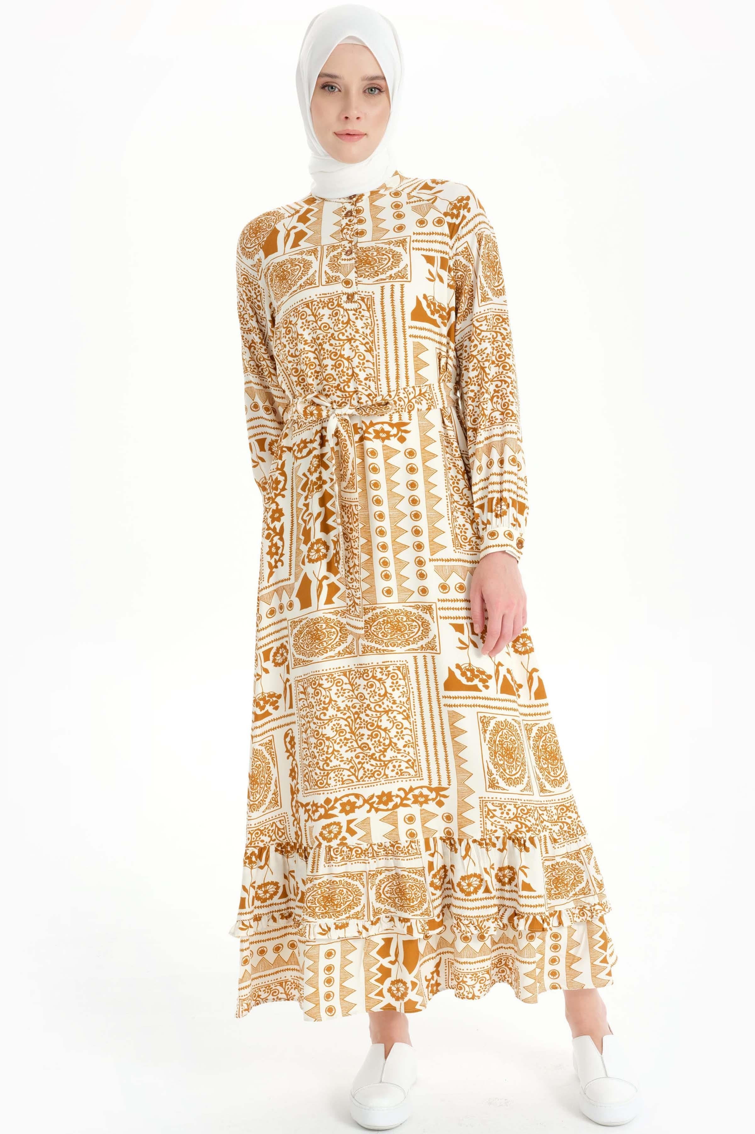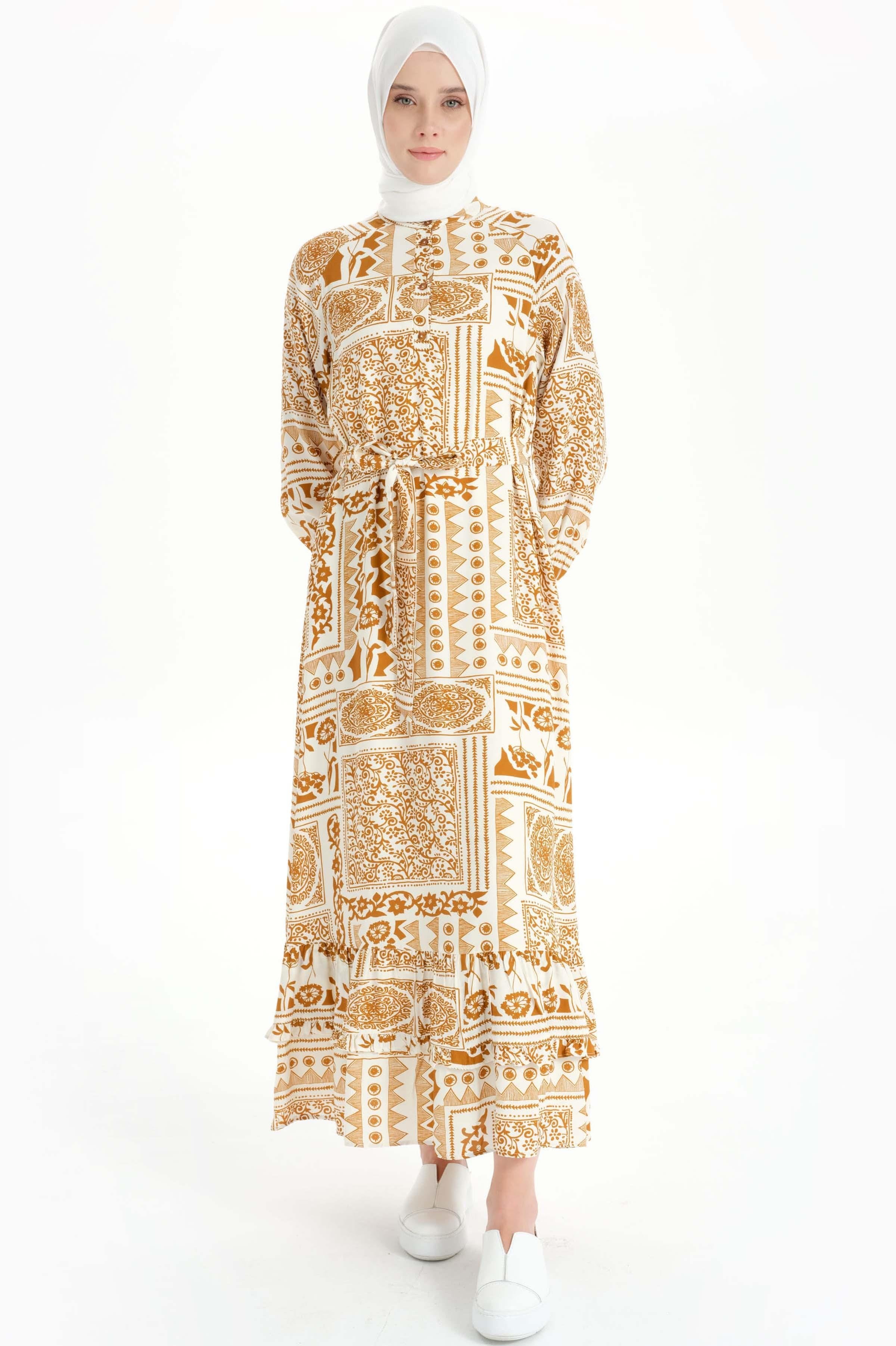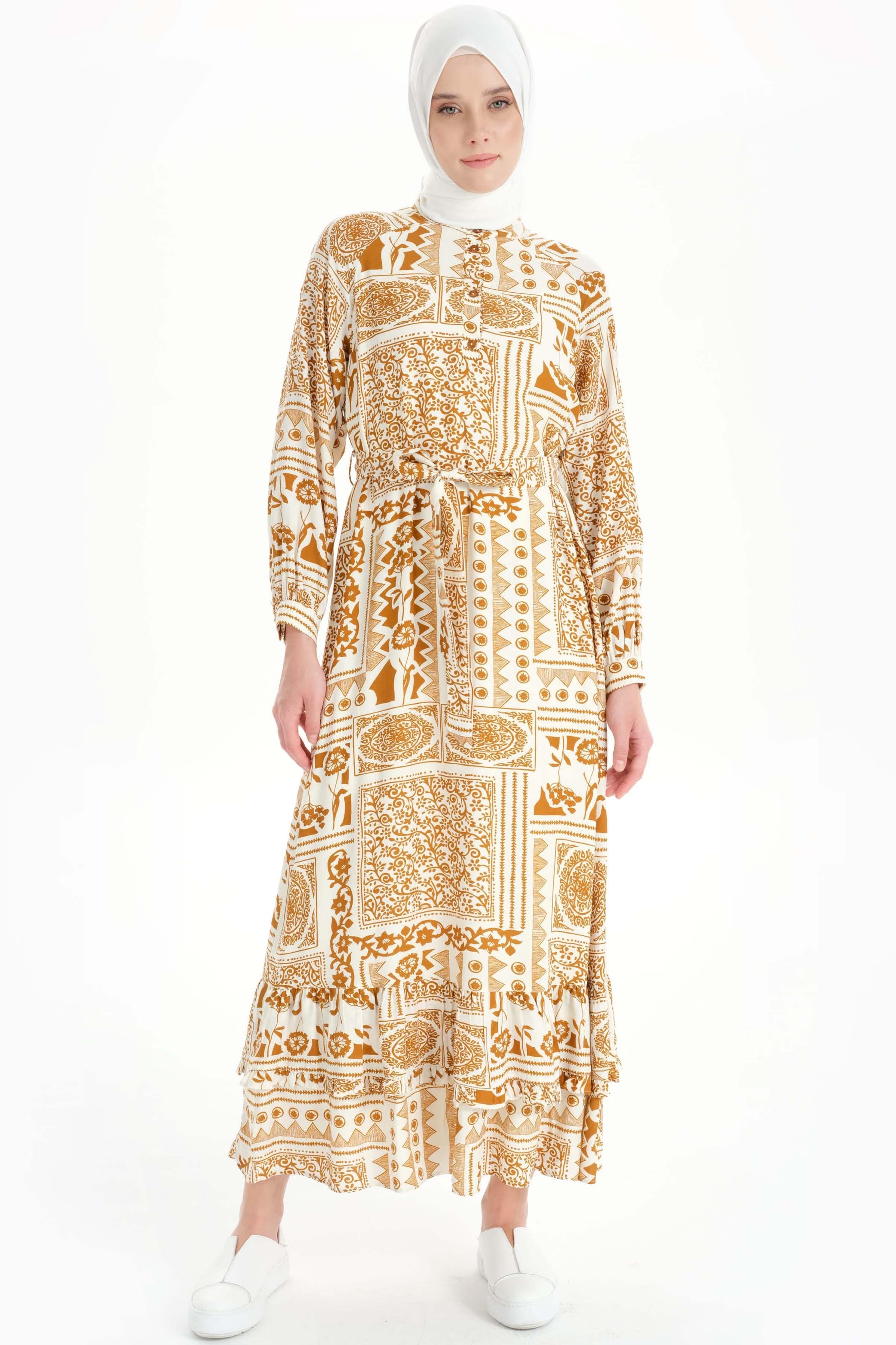Ruffle Detailed Ethnic Patterned Dress - Cinnamon
